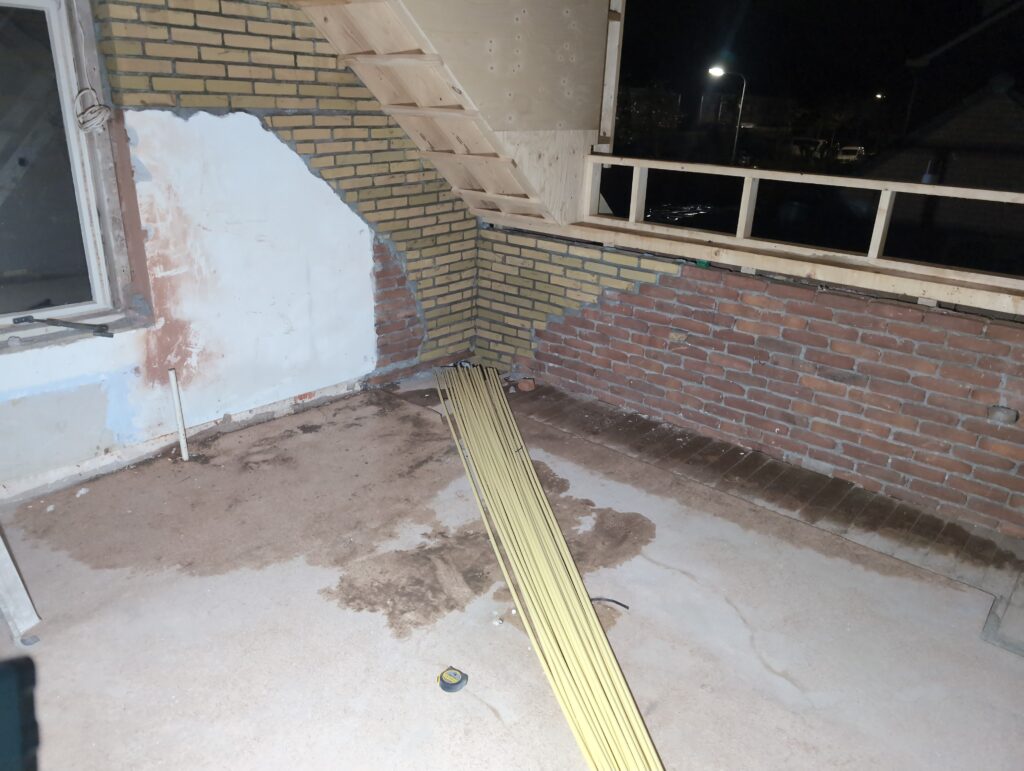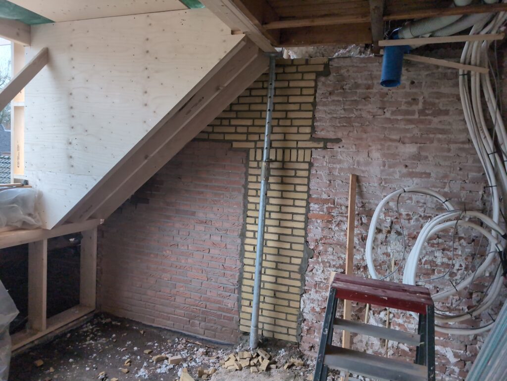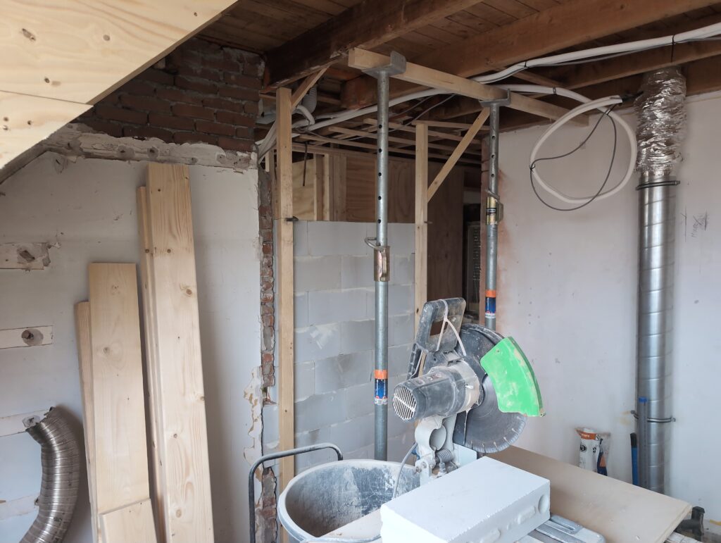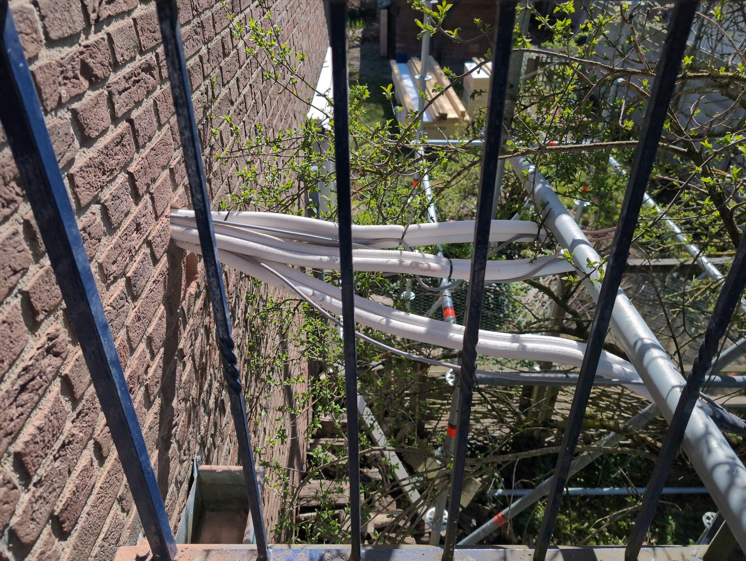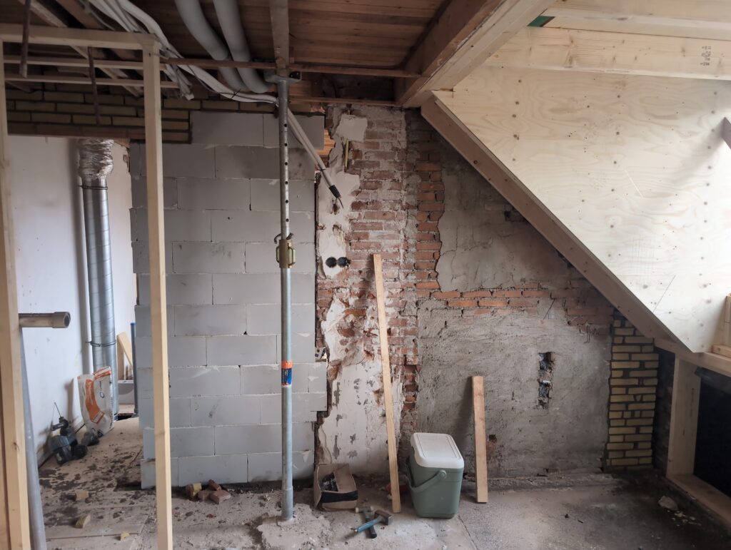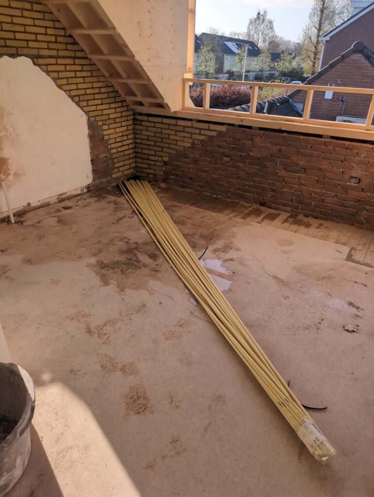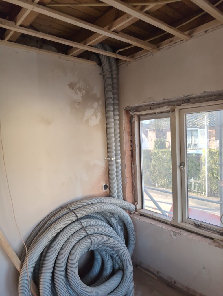 Ook is de WTW/ventilatie afgerond, voor wat het leggen van de buizen betreft. Dat is inclusief het trekken van (90mm) buizen van zolder naar de voorkant van de woonkamer. Maar ook op zolder zijn er nog enkele bij gekomen. Ook zijn de eerste drie (van de vijf) airco-buizen naar buiten toe geluid naast het balkon. Fun fact: Die worden dan dus aangelegd, maar liggen vervolgens weer in de weg, dus worden de netjes afgewerkte buizen toch nog even losgeschroeft om er bij te kunnen voor het metselen. Als dat geen samenwerking is… 🙂