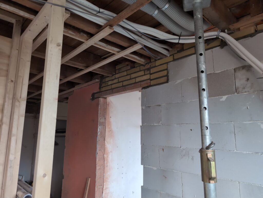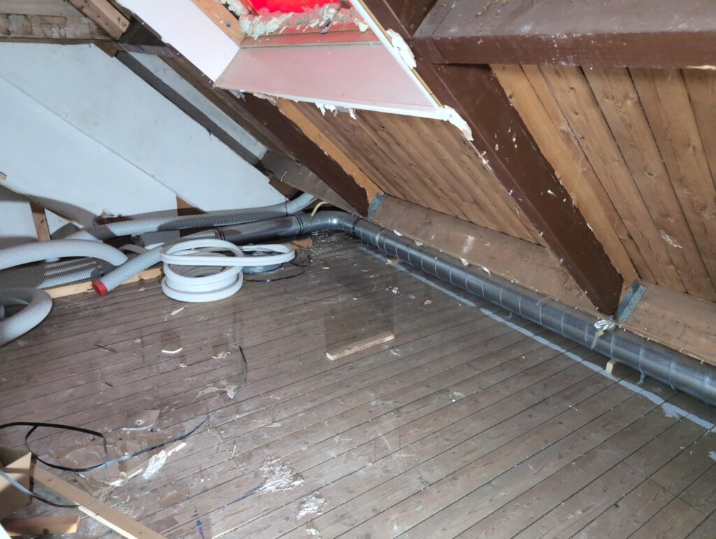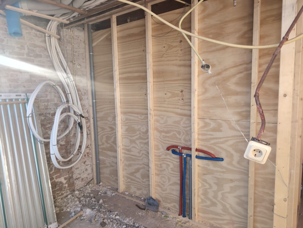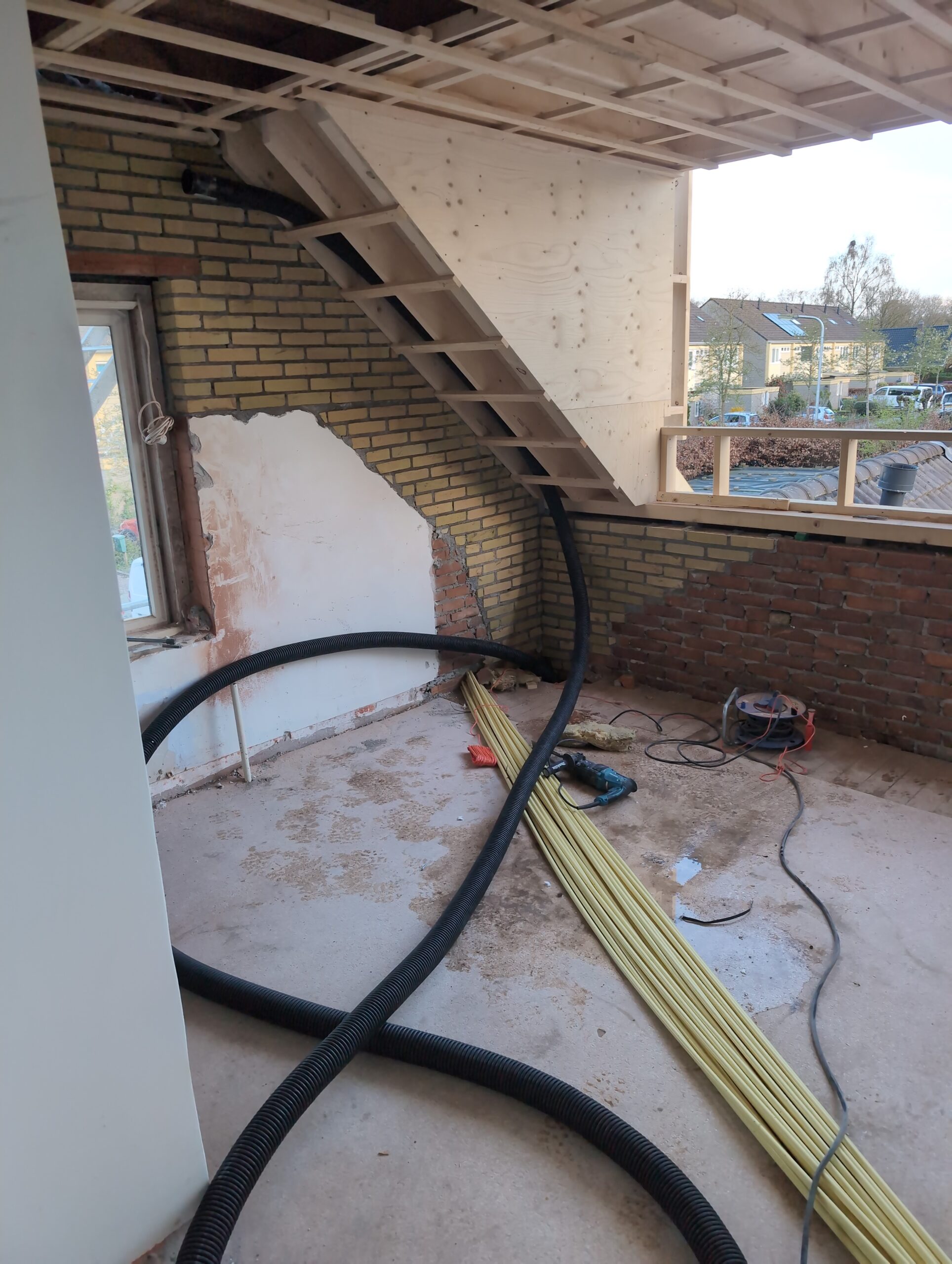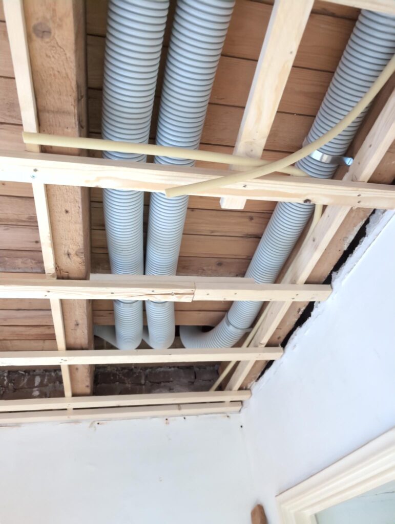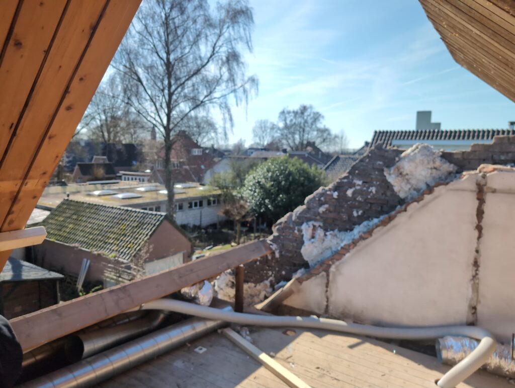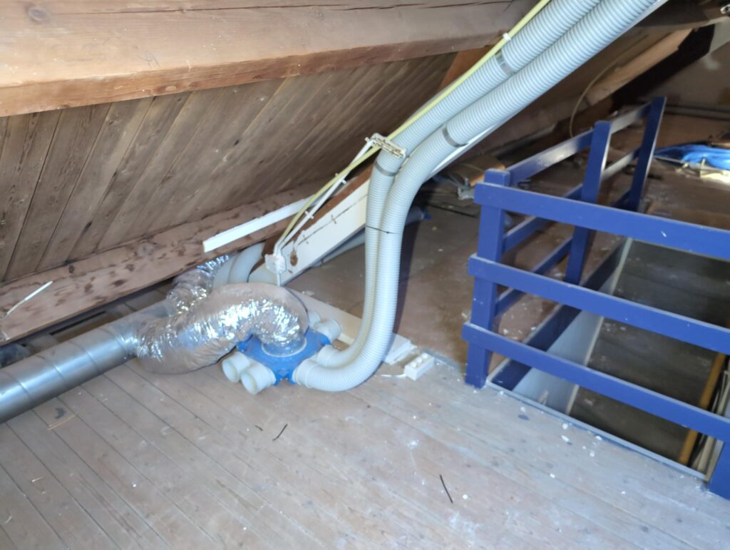 Ook is de WTW/ventilatie afgerond, voor wat het leggen van de buizen betreft. Dat is inclusief het trekken van (90mm) buizen van zolder naar de voorkant van de woonkamer. Maar ook op zolder zijn er nog enkele bij gekomen. Ook zijn de eerste drie (van de vijf) airco-buizen naar buiten toe geluid naast het balkon. Fun fact: Die worden dan dus aangelegd, maar liggen vervolgens weer in de weg, dus worden de netjes afgewerkte buizen toch nog even losgeschroeft om er bij te kunnen voor het metselen. Als dat geen samenwerking is… 🙂