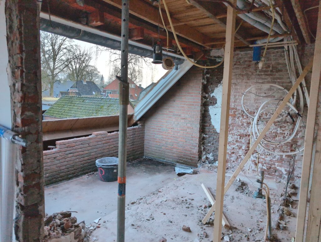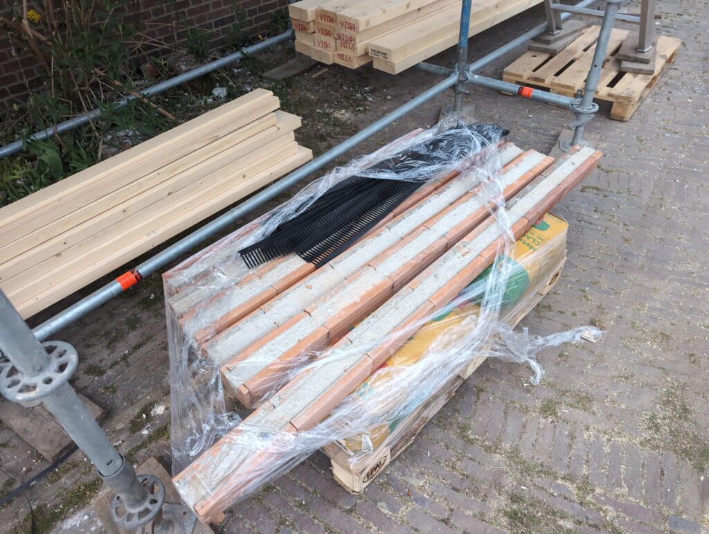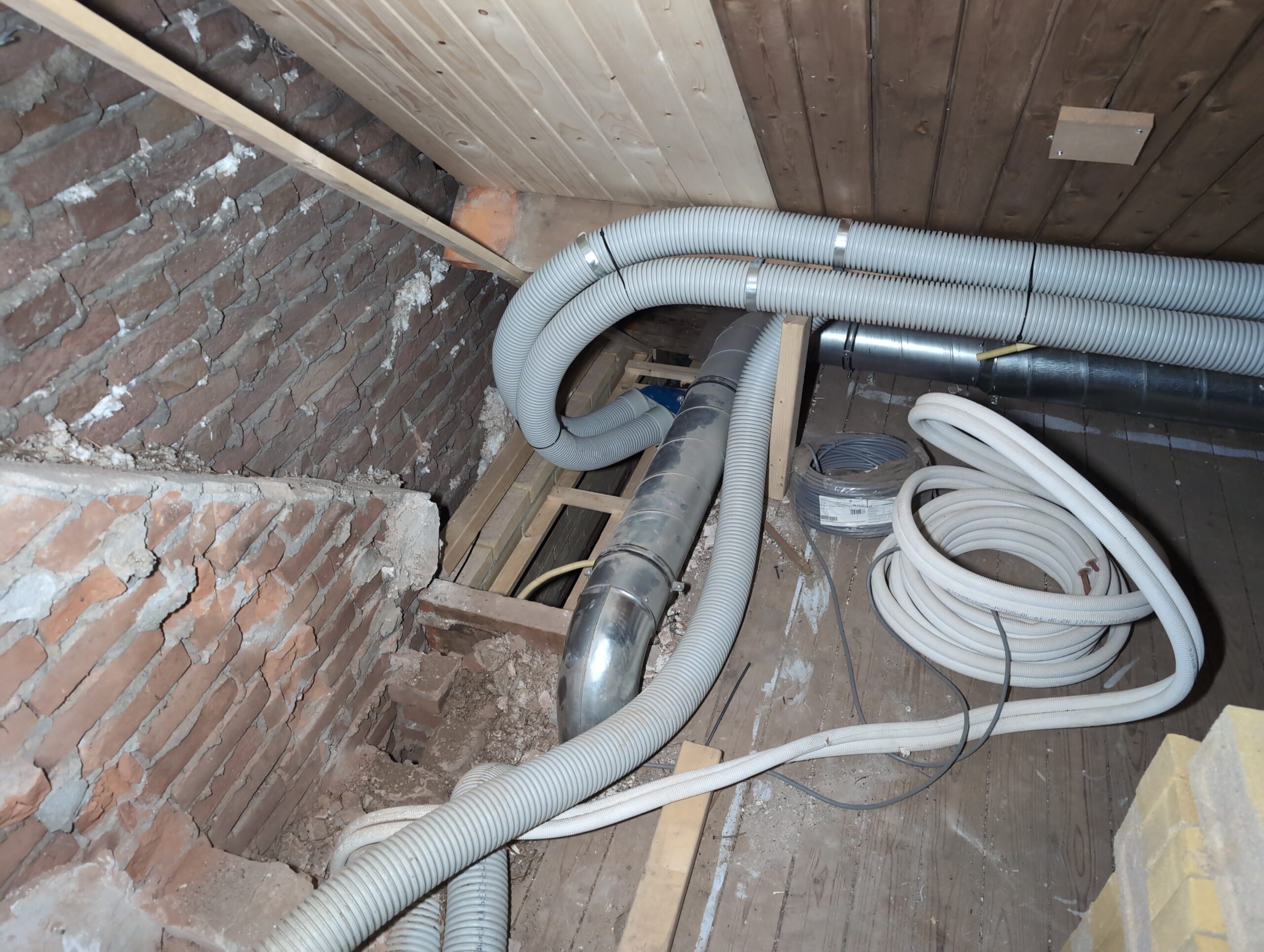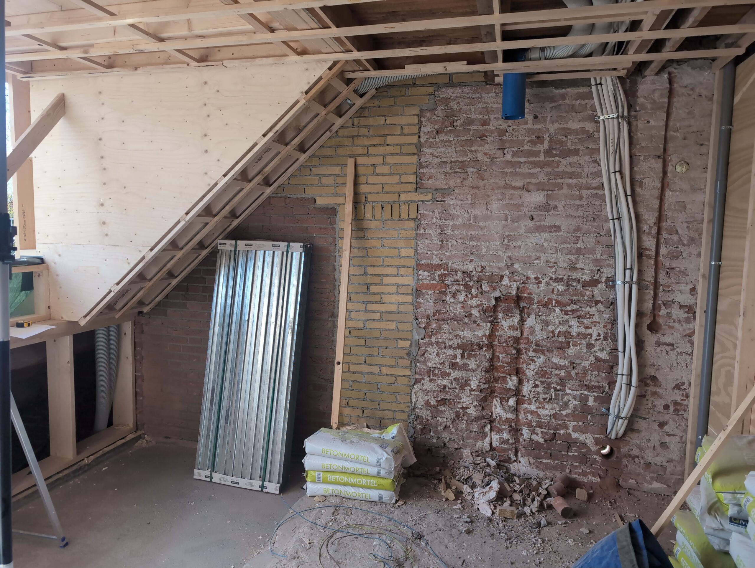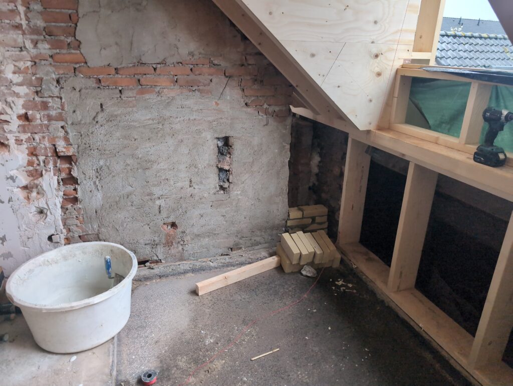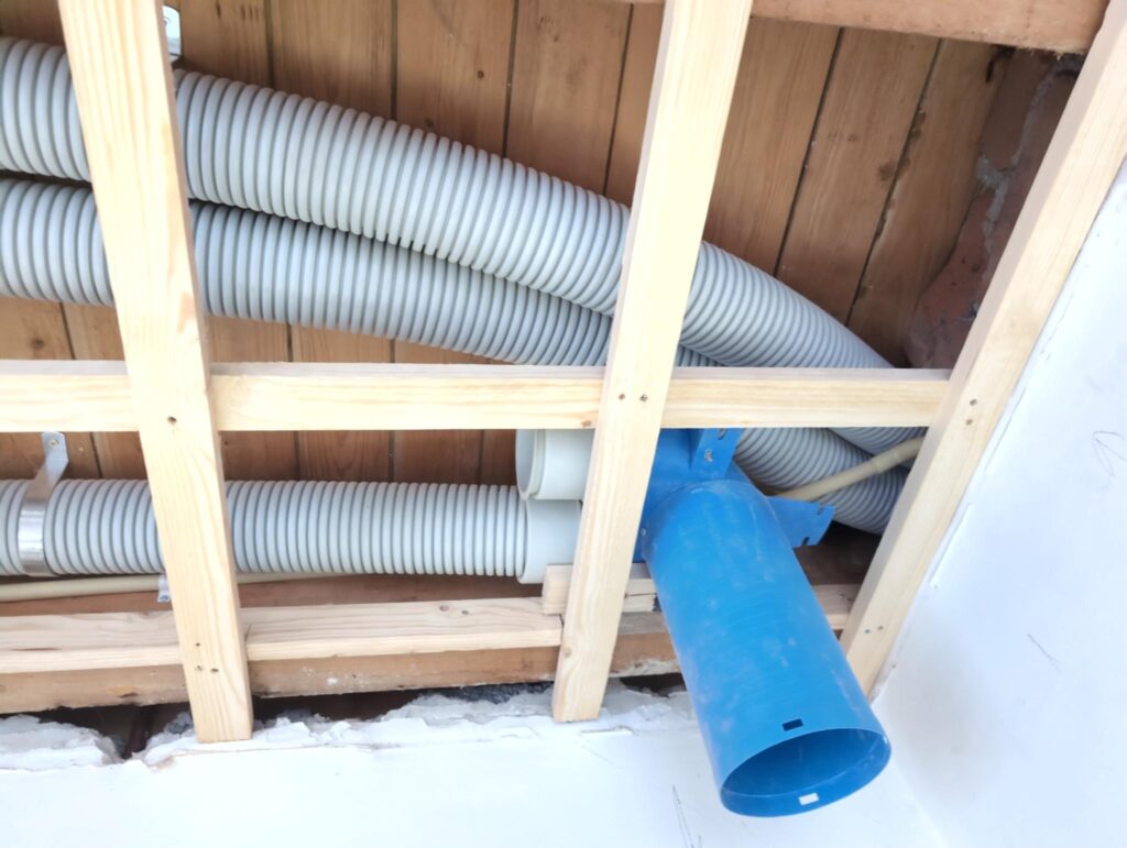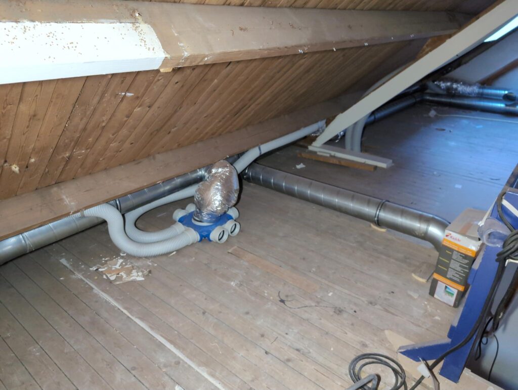 Ook is de WTW/ventilatie afgerond, voor wat het leggen van de buizen betreft. Dat is inclusief het trekken van (90mm) buizen van zolder naar de voorkant van de woonkamer. Maar ook op zolder zijn er nog enkele bij gekomen. Ook zijn de eerste drie (van de vijf) airco-buizen naar buiten toe geluid naast het balkon. Fun fact: Die worden dan dus aangelegd, maar liggen vervolgens weer in de weg, dus worden de netjes afgewerkte buizen toch nog even losgeschroeft om er bij te kunnen voor het metselen. Als dat geen samenwerking is… 🙂