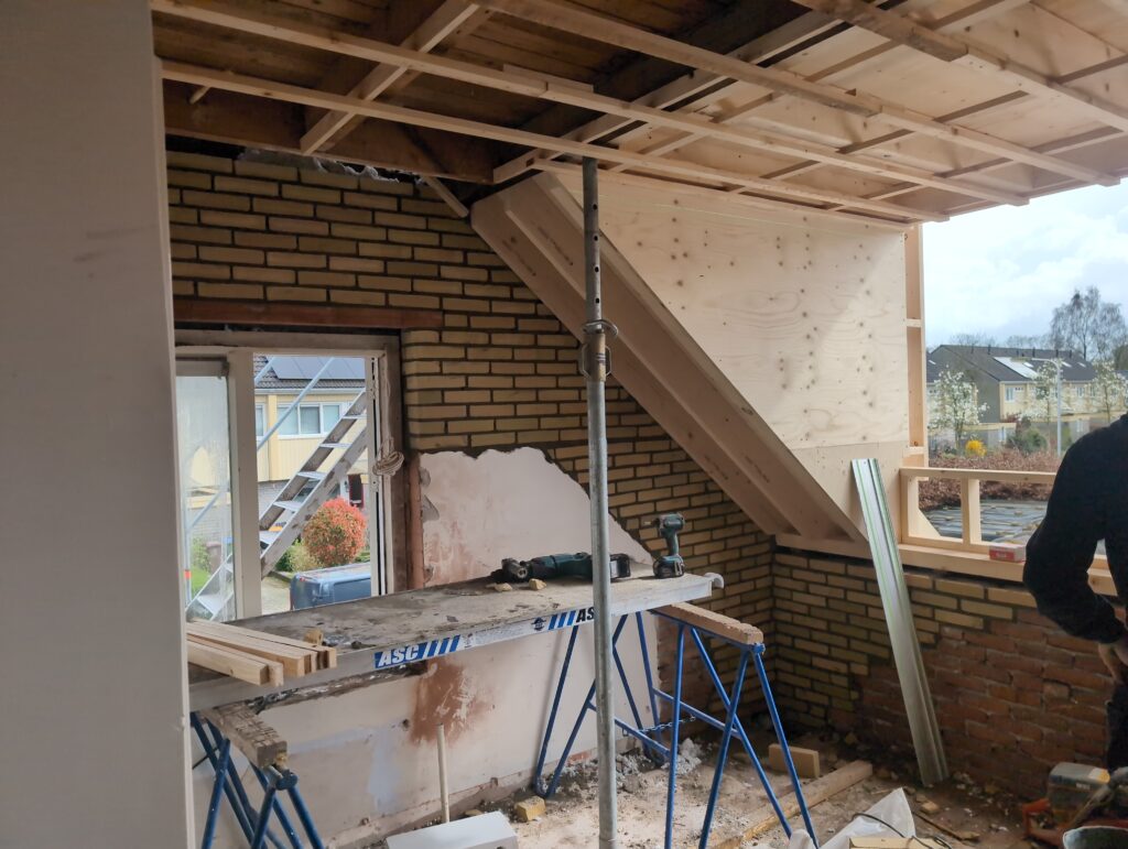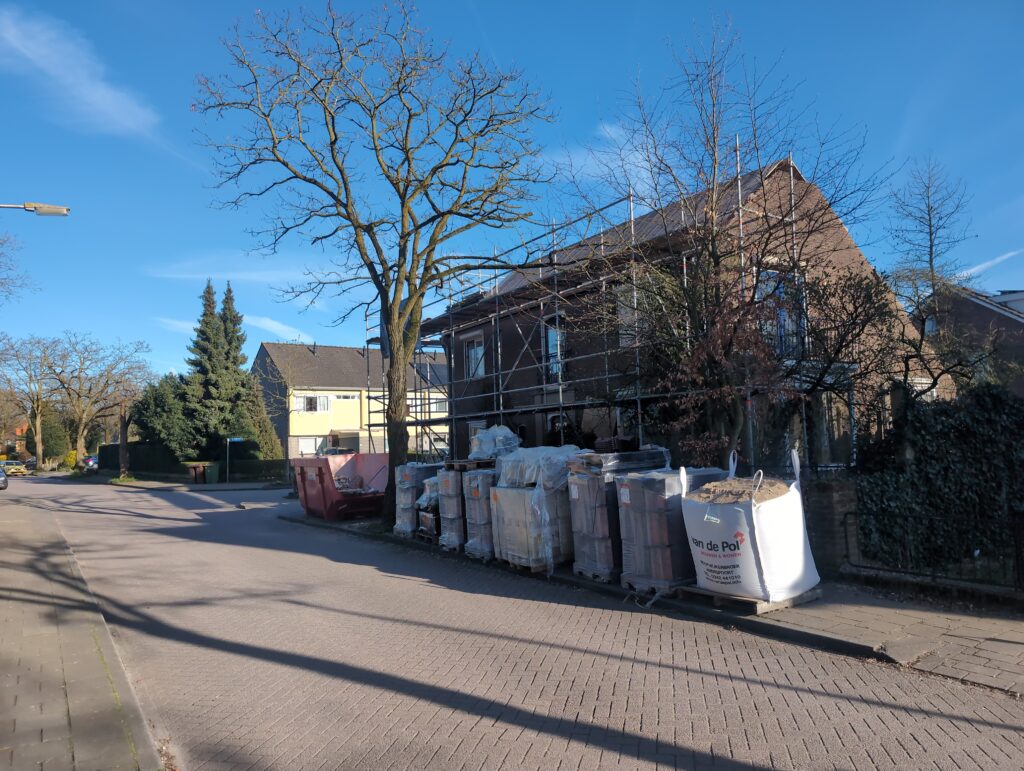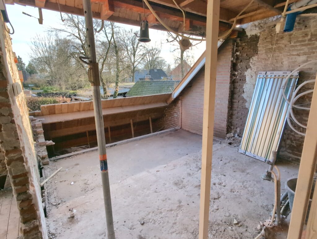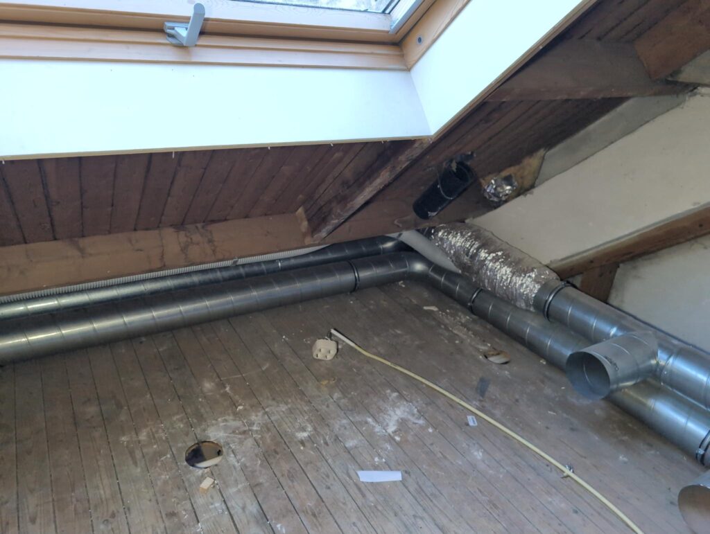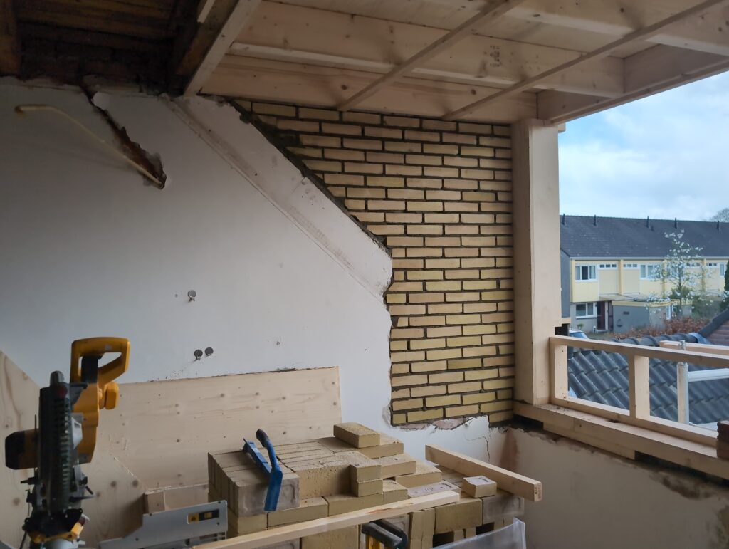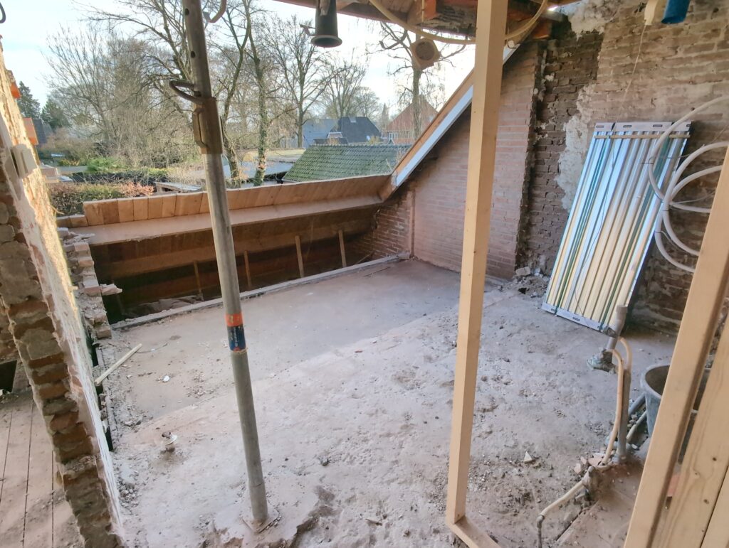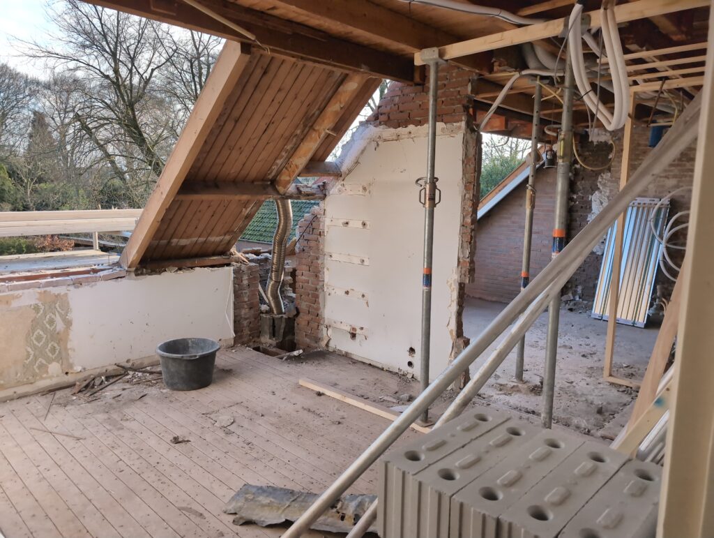 Ook is de WTW/ventilatie afgerond, voor wat het leggen van de buizen betreft. Dat is inclusief het trekken van (90mm) buizen van zolder naar de voorkant van de woonkamer. Maar ook op zolder zijn er nog enkele bij gekomen. Ook zijn de eerste drie (van de vijf) airco-buizen naar buiten toe geluid naast het balkon. Fun fact: Die worden dan dus aangelegd, maar liggen vervolgens weer in de weg, dus worden de netjes afgewerkte buizen toch nog even losgeschroeft om er bij te kunnen voor het metselen. Als dat geen samenwerking is… 🙂