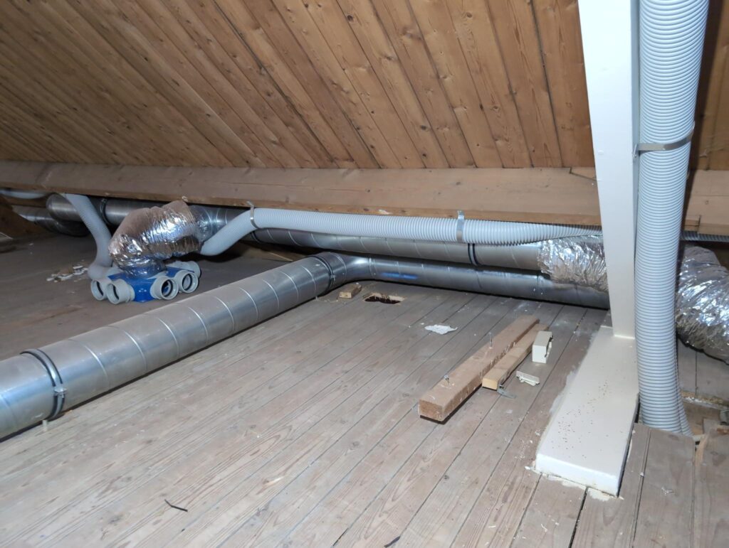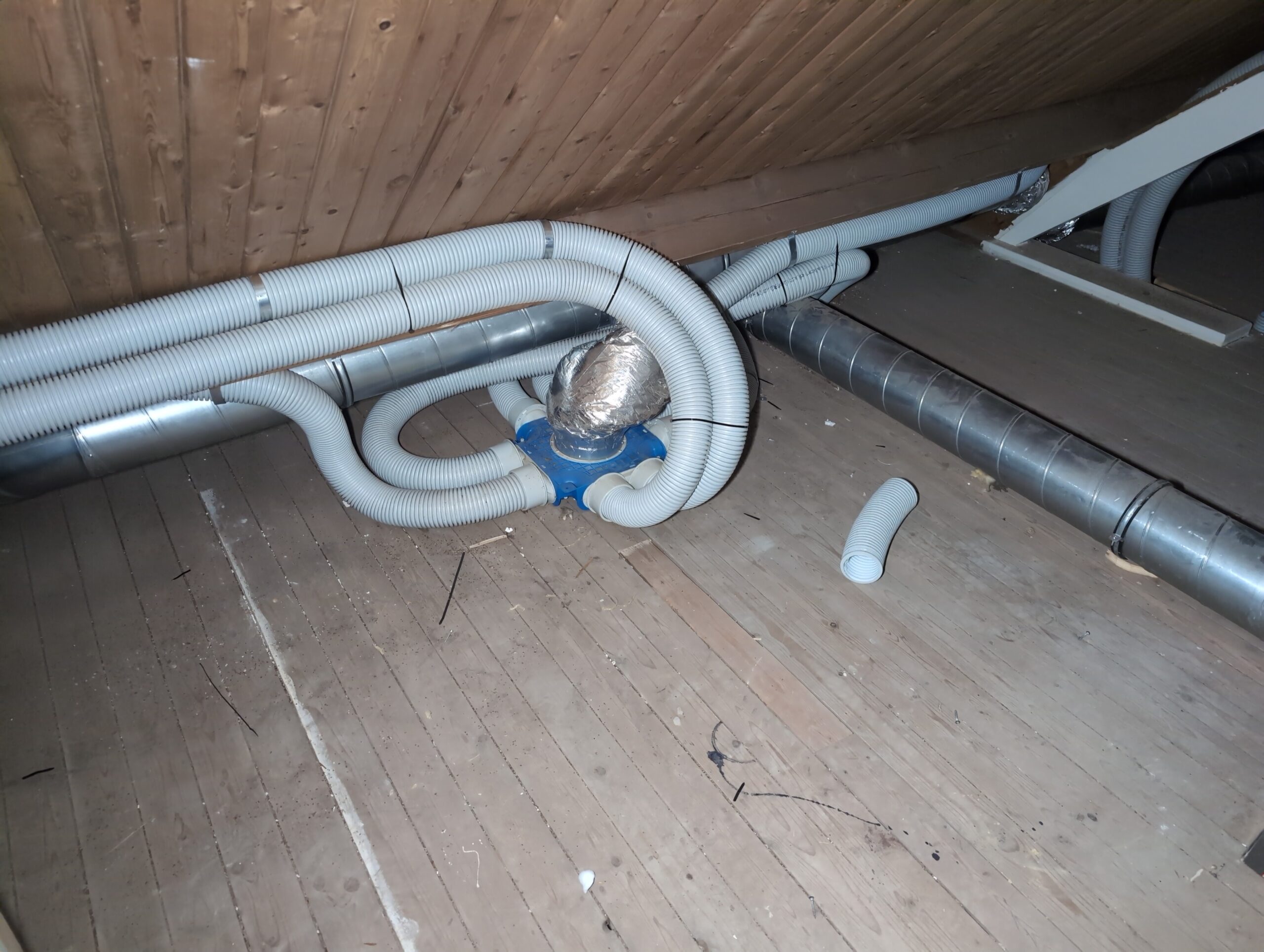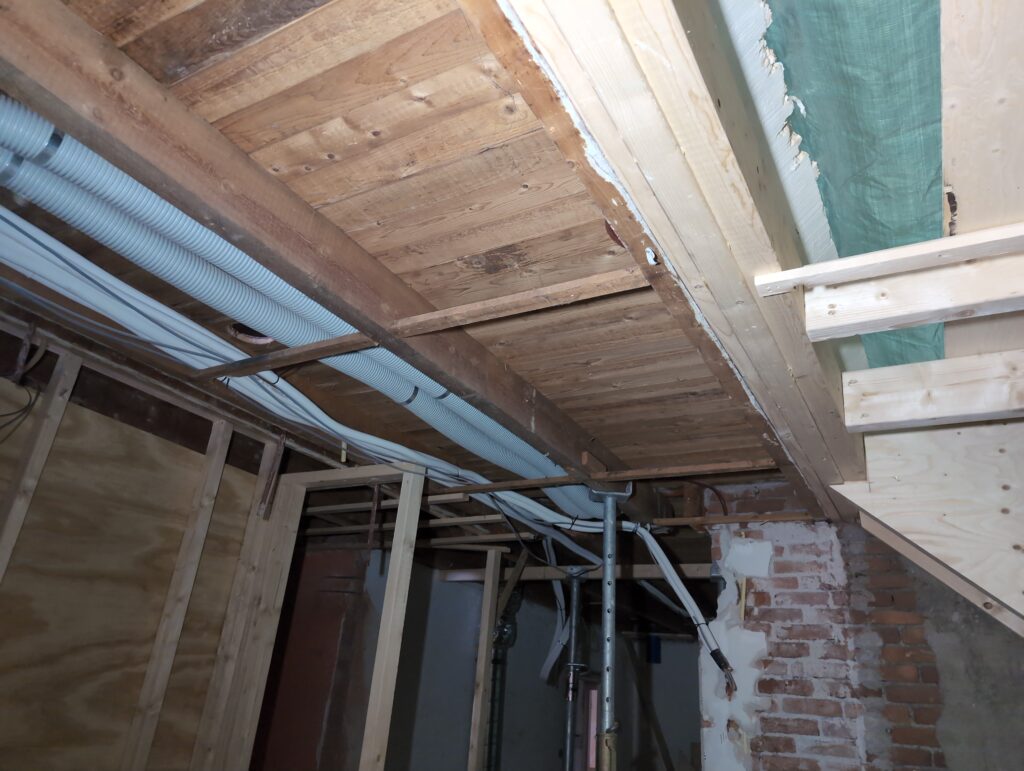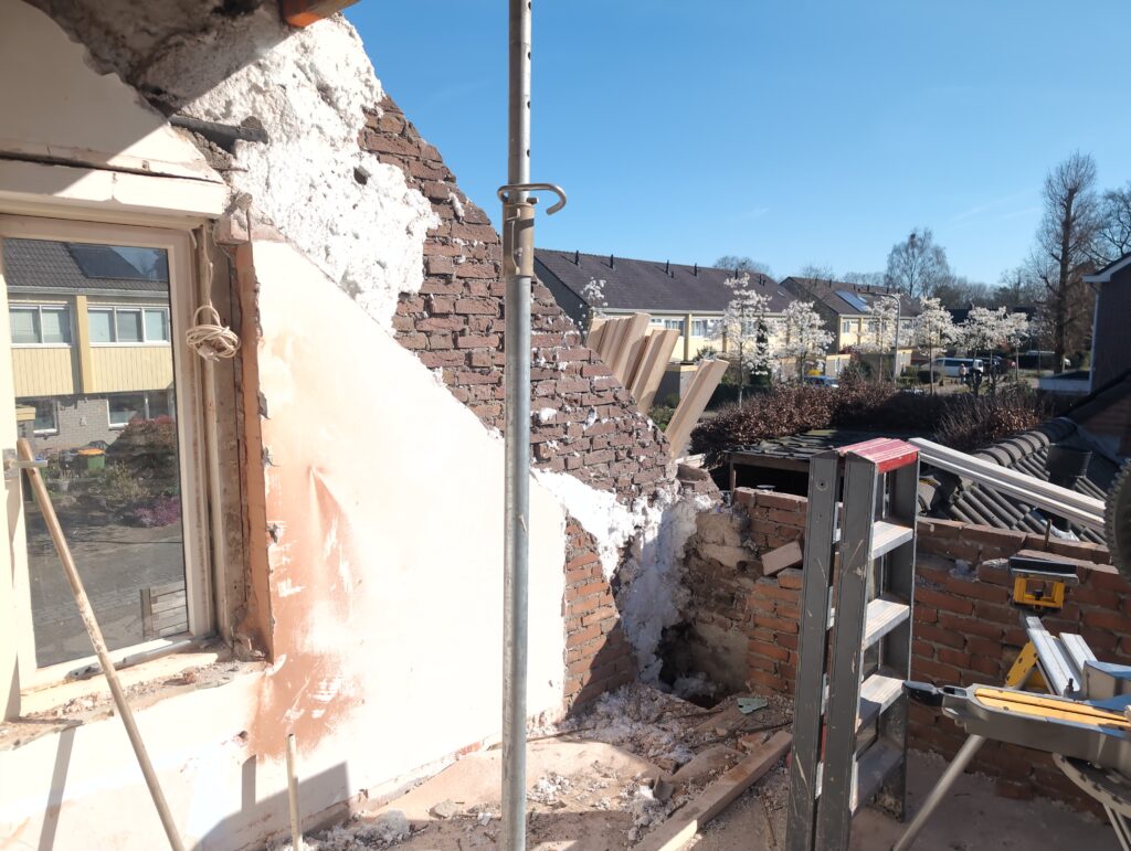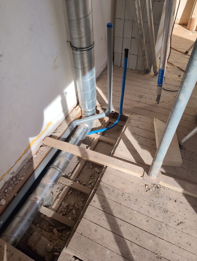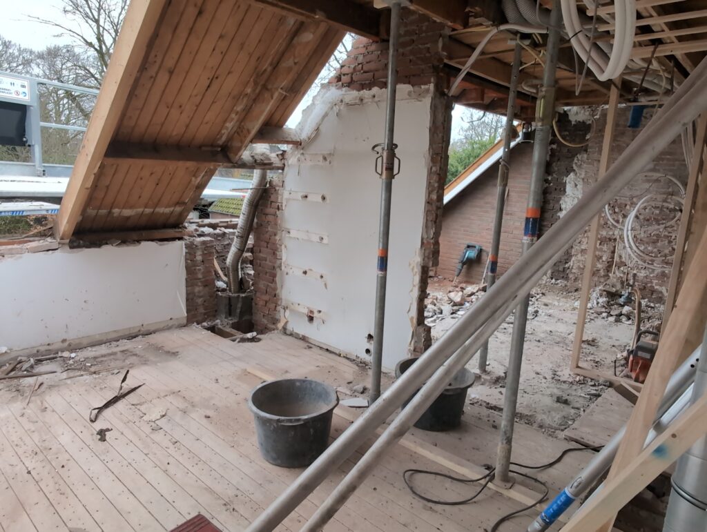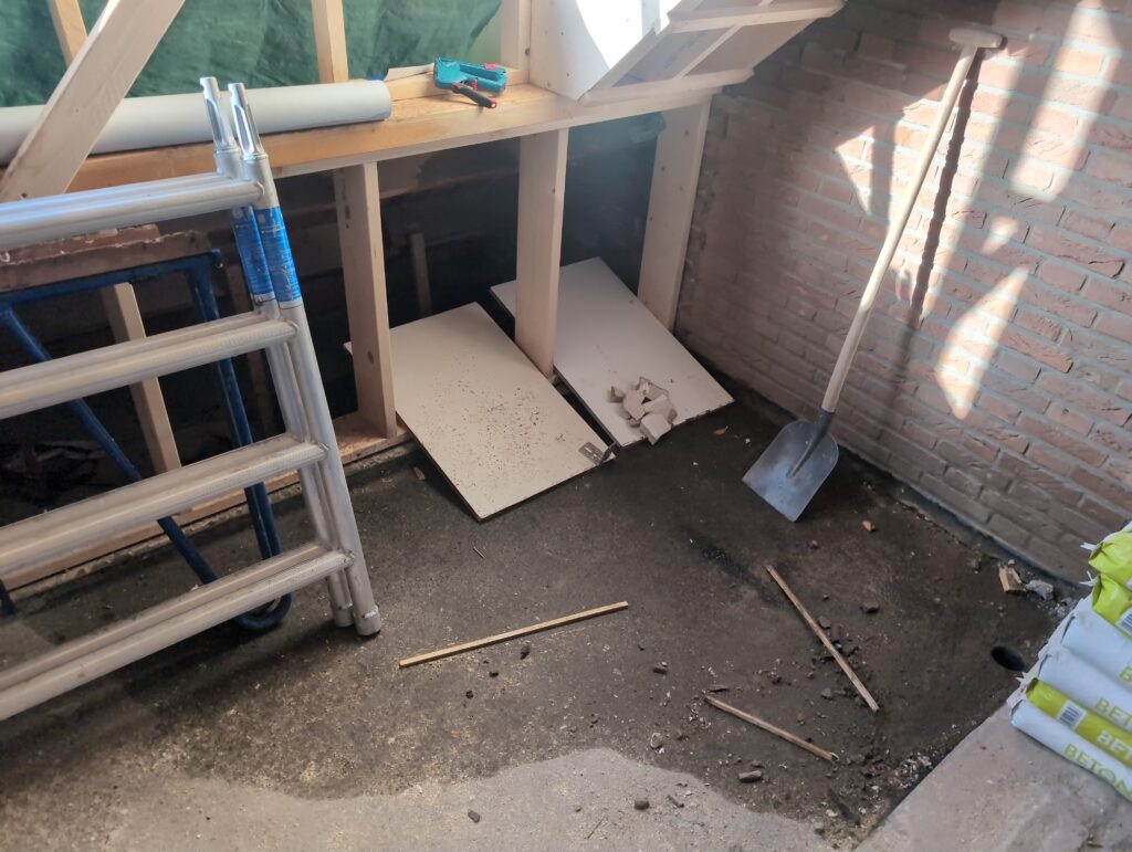 Ook is de WTW/ventilatie afgerond, voor wat het leggen van de buizen betreft. Dat is inclusief het trekken van (90mm) buizen van zolder naar de voorkant van de woonkamer. Maar ook op zolder zijn er nog enkele bij gekomen. Ook zijn de eerste drie (van de vijf) airco-buizen naar buiten toe geluid naast het balkon. Fun fact: Die worden dan dus aangelegd, maar liggen vervolgens weer in de weg, dus worden de netjes afgewerkte buizen toch nog even losgeschroeft om er bij te kunnen voor het metselen. Als dat geen samenwerking is… 🙂