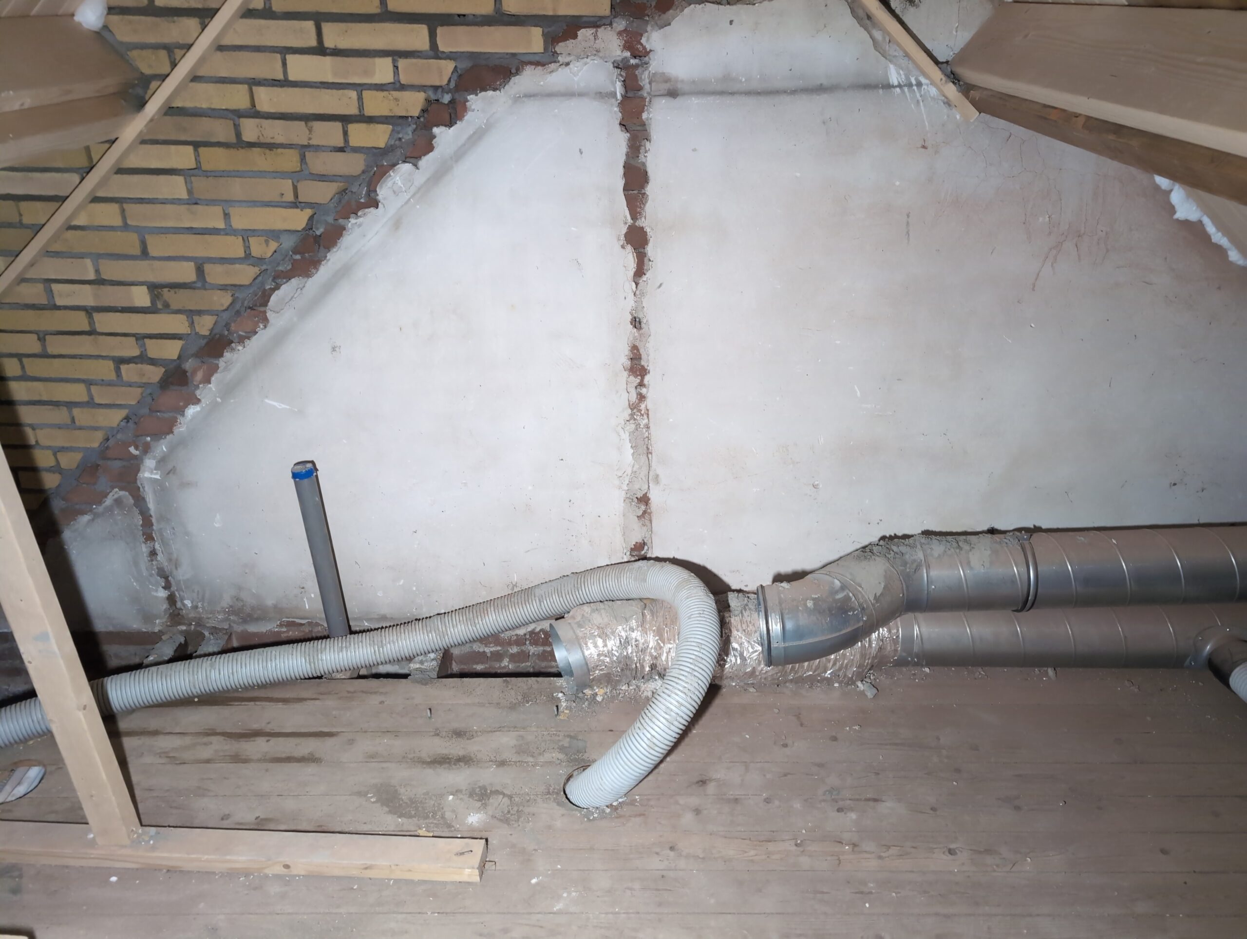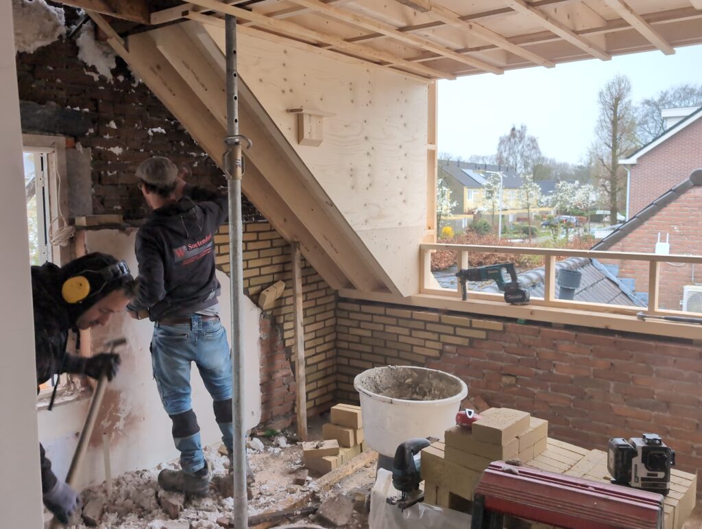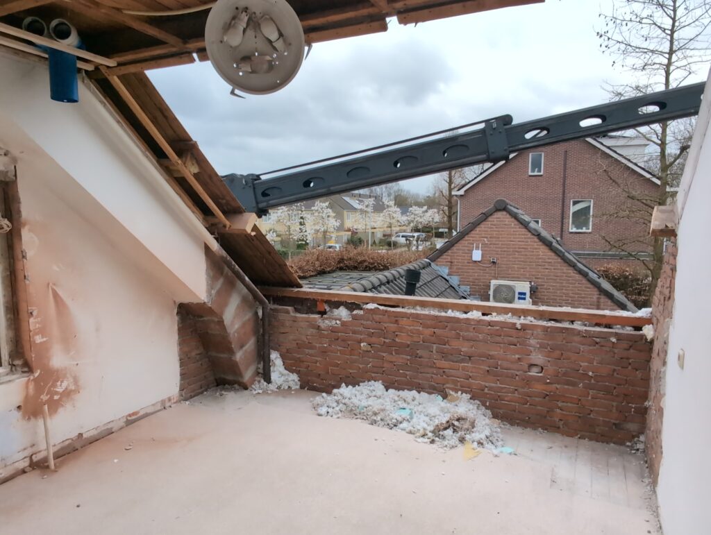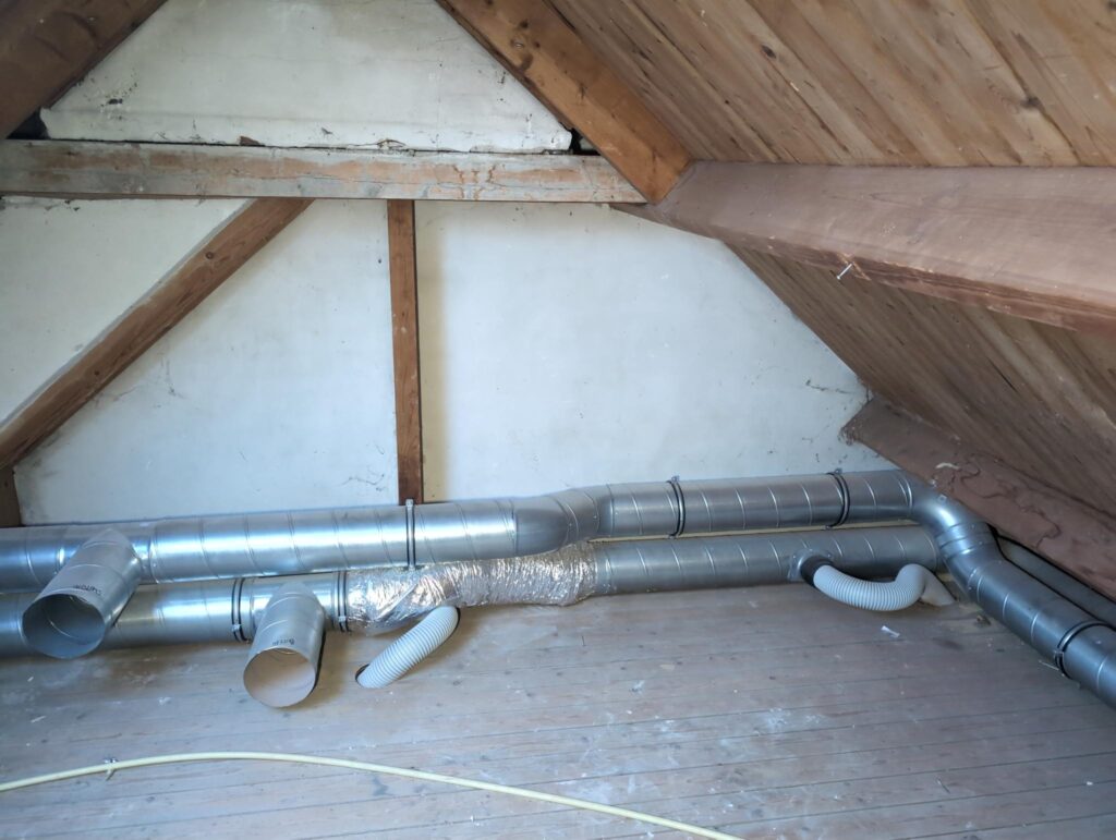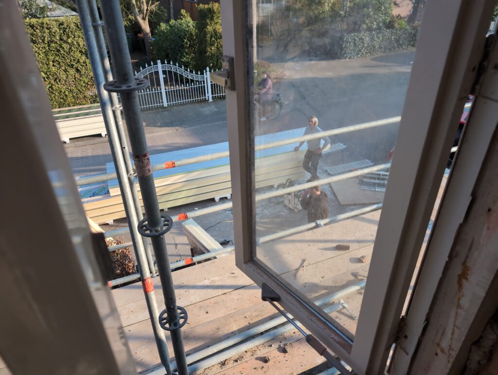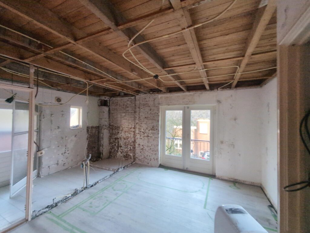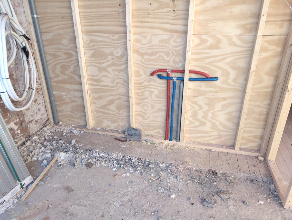 Ook is de WTW/ventilatie afgerond, voor wat het leggen van de buizen betreft. Dat is inclusief het trekken van (90mm) buizen van zolder naar de voorkant van de woonkamer. Maar ook op zolder zijn er nog enkele bij gekomen. Ook zijn de eerste drie (van de vijf) airco-buizen naar buiten toe geluid naast het balkon. Fun fact: Die worden dan dus aangelegd, maar liggen vervolgens weer in de weg, dus worden de netjes afgewerkte buizen toch nog even losgeschroeft om er bij te kunnen voor het metselen. Als dat geen samenwerking is… 🙂