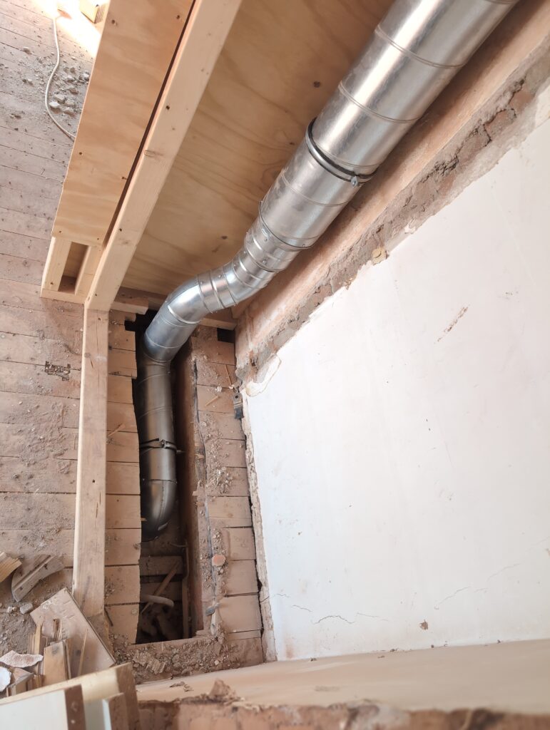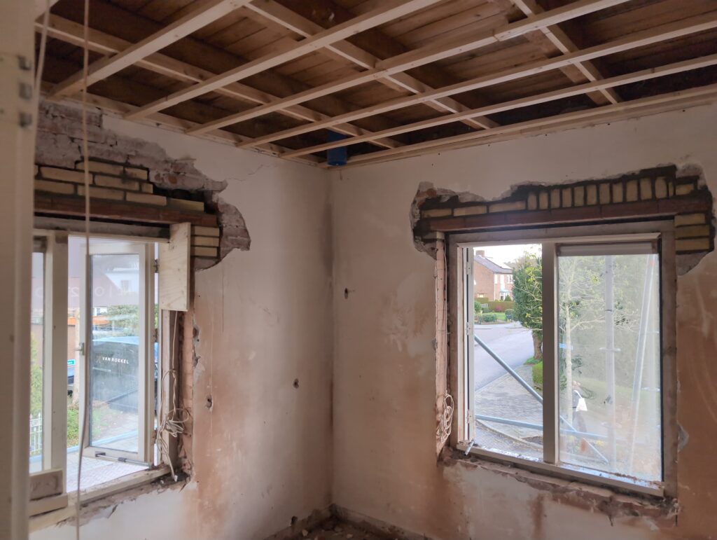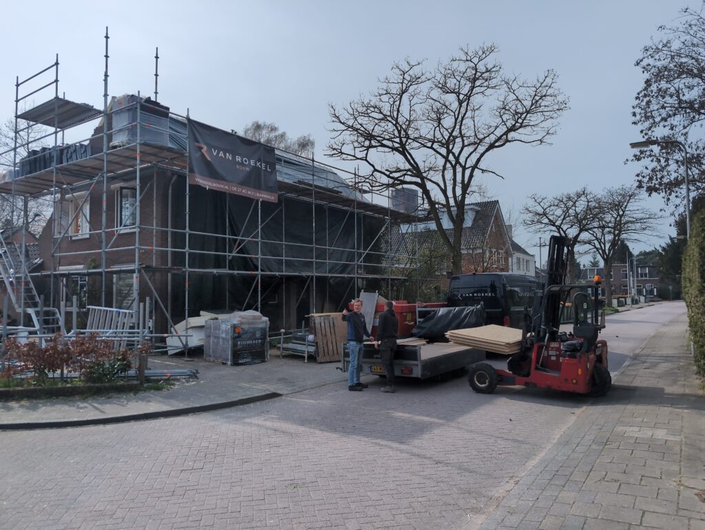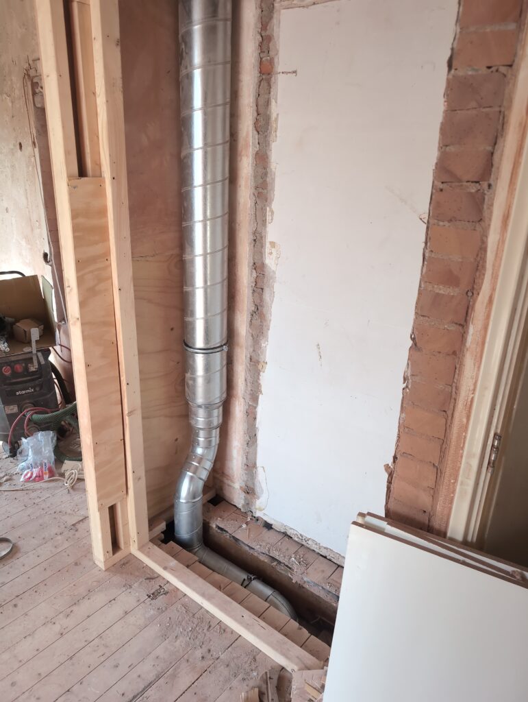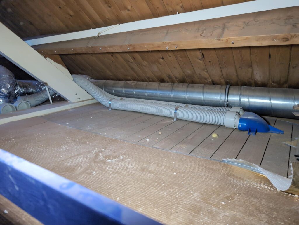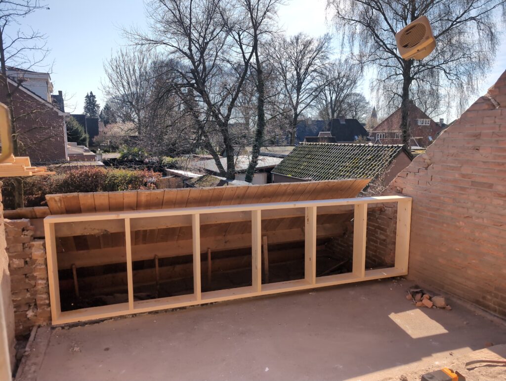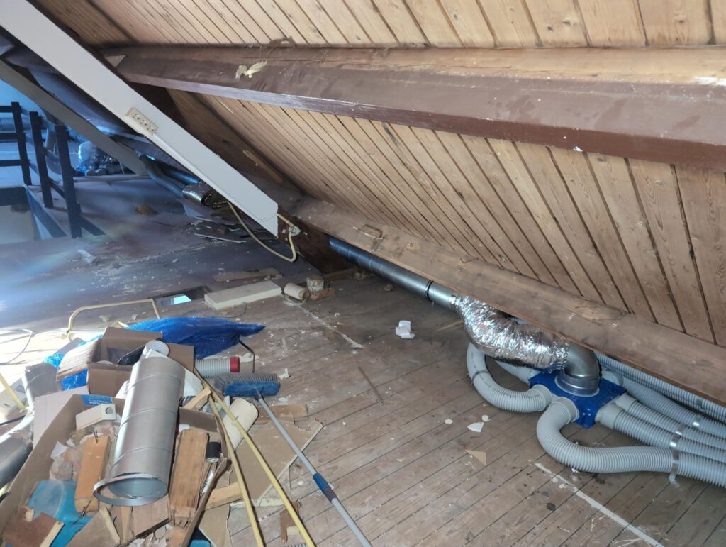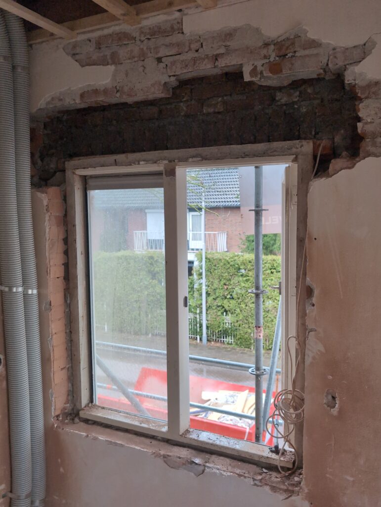 Ook is de WTW/ventilatie afgerond, voor wat het leggen van de buizen betreft. Dat is inclusief het trekken van (90mm) buizen van zolder naar de voorkant van de woonkamer. Maar ook op zolder zijn er nog enkele bij gekomen. Ook zijn de eerste drie (van de vijf) airco-buizen naar buiten toe geluid naast het balkon. Fun fact: Die worden dan dus aangelegd, maar liggen vervolgens weer in de weg, dus worden de netjes afgewerkte buizen toch nog even losgeschroeft om er bij te kunnen voor het metselen. Als dat geen samenwerking is… 🙂