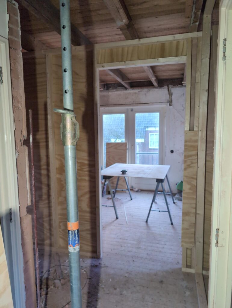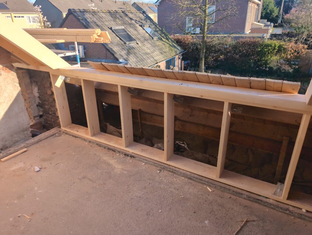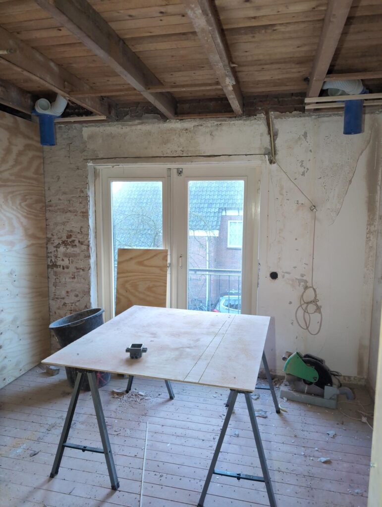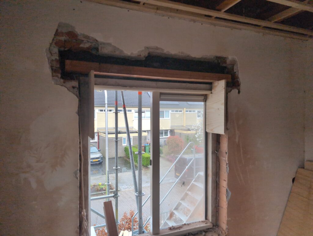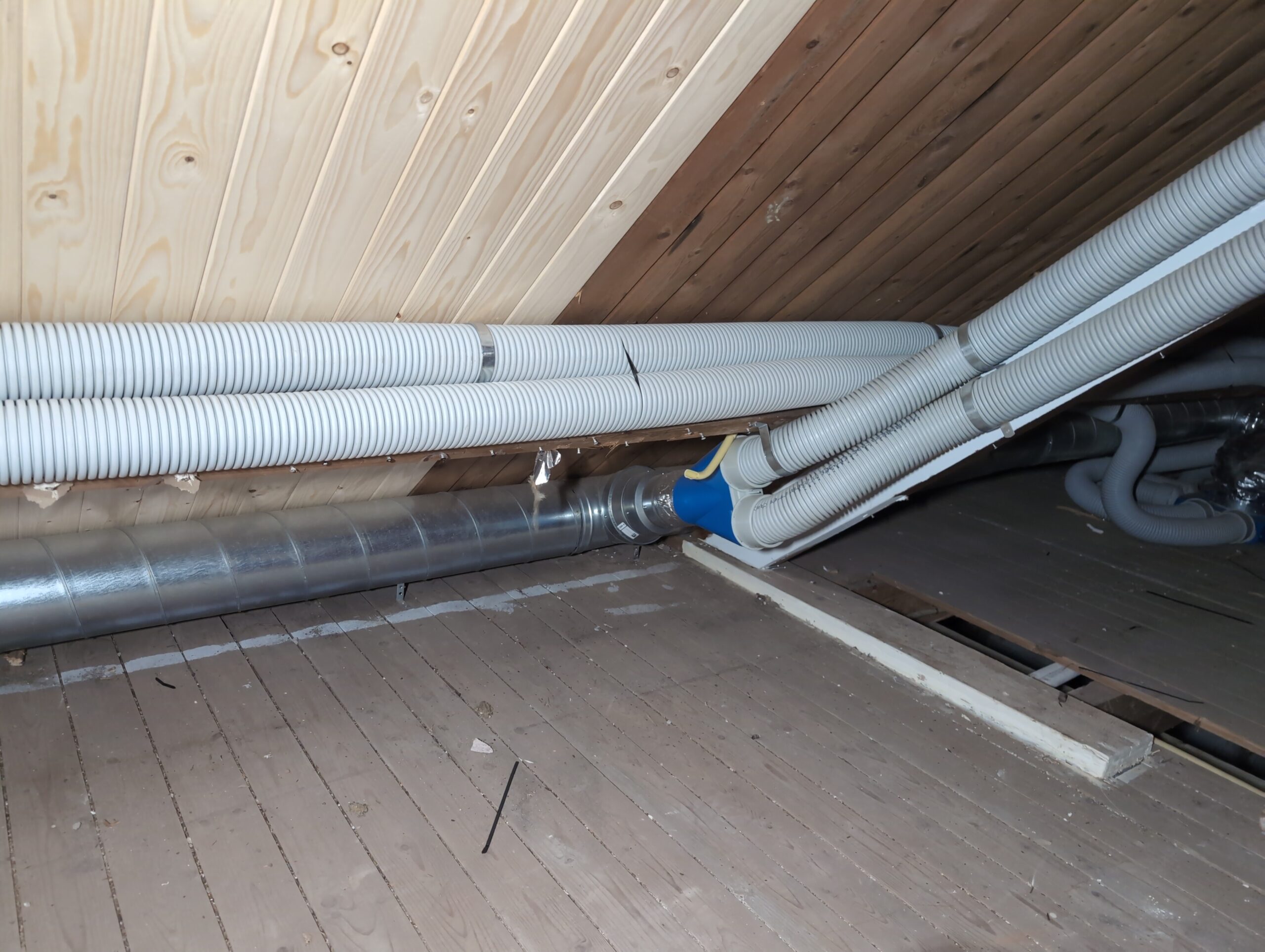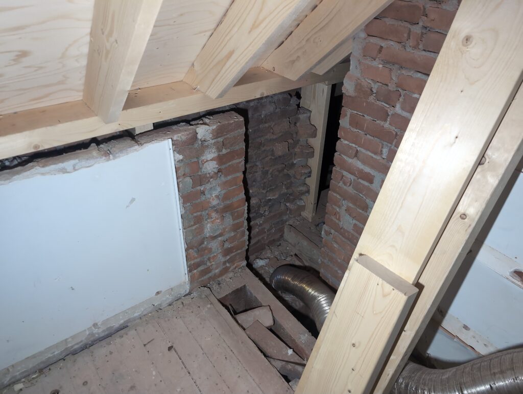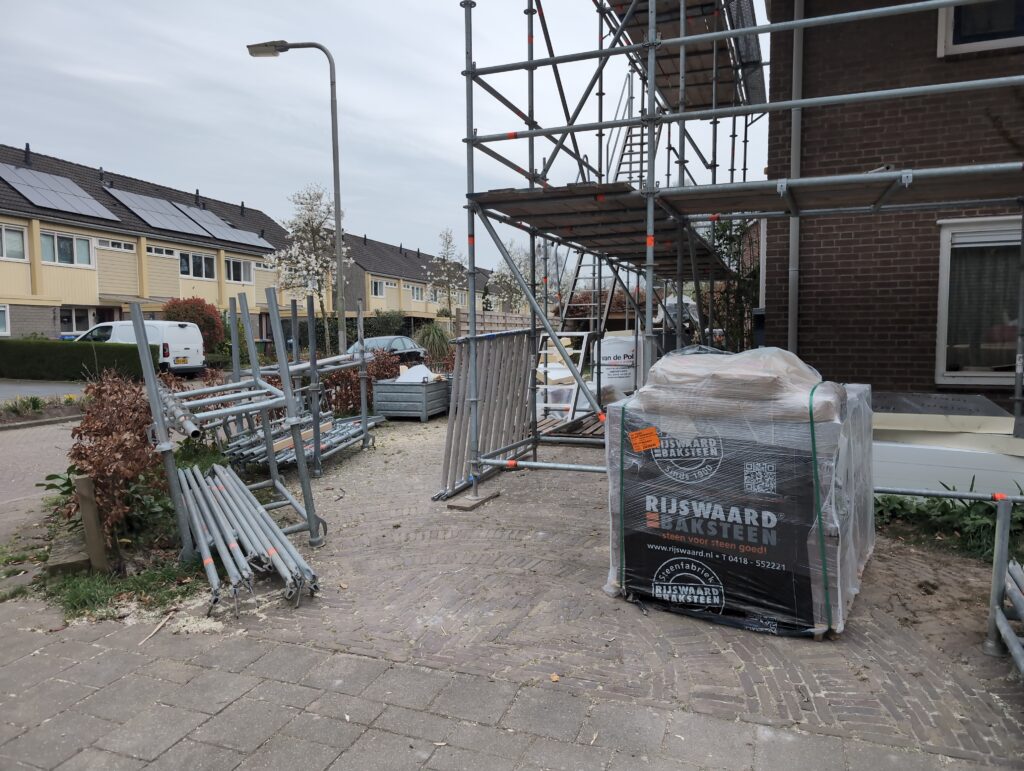 Ook is de WTW/ventilatie afgerond, voor wat het leggen van de buizen betreft. Dat is inclusief het trekken van (90mm) buizen van zolder naar de voorkant van de woonkamer. Maar ook op zolder zijn er nog enkele bij gekomen. Ook zijn de eerste drie (van de vijf) airco-buizen naar buiten toe geluid naast het balkon. Fun fact: Die worden dan dus aangelegd, maar liggen vervolgens weer in de weg, dus worden de netjes afgewerkte buizen toch nog even losgeschroeft om er bij te kunnen voor het metselen. Als dat geen samenwerking is… 🙂