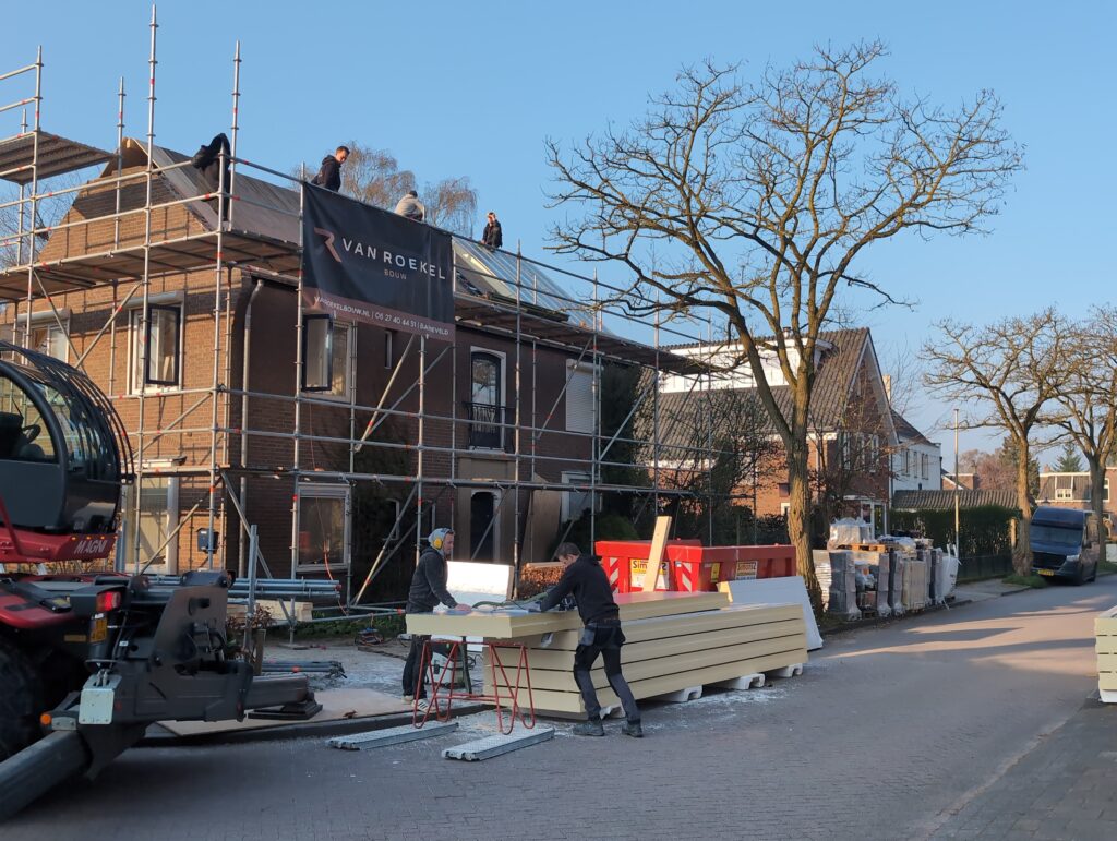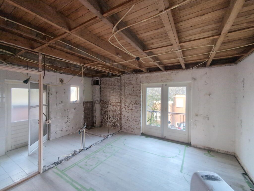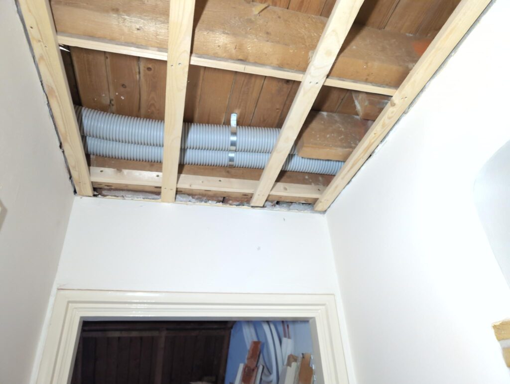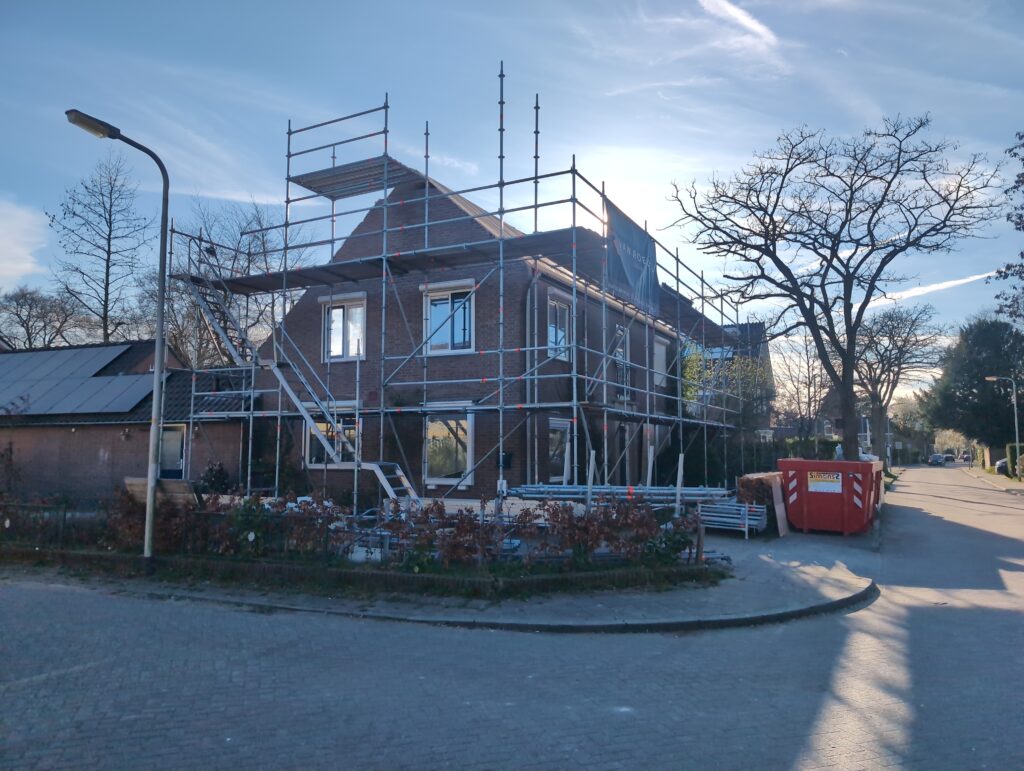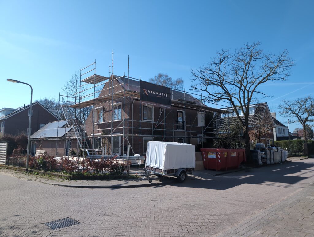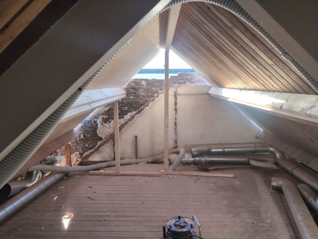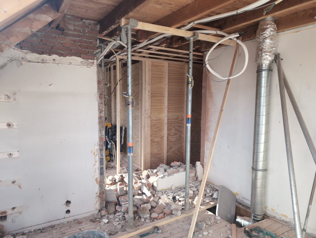 Ook is de WTW/ventilatie afgerond, voor wat het leggen van de buizen betreft. Dat is inclusief het trekken van (90mm) buizen van zolder naar de voorkant van de woonkamer. Maar ook op zolder zijn er nog enkele bij gekomen. Ook zijn de eerste drie (van de vijf) airco-buizen naar buiten toe geluid naast het balkon. Fun fact: Die worden dan dus aangelegd, maar liggen vervolgens weer in de weg, dus worden de netjes afgewerkte buizen toch nog even losgeschroeft om er bij te kunnen voor het metselen. Als dat geen samenwerking is… 🙂