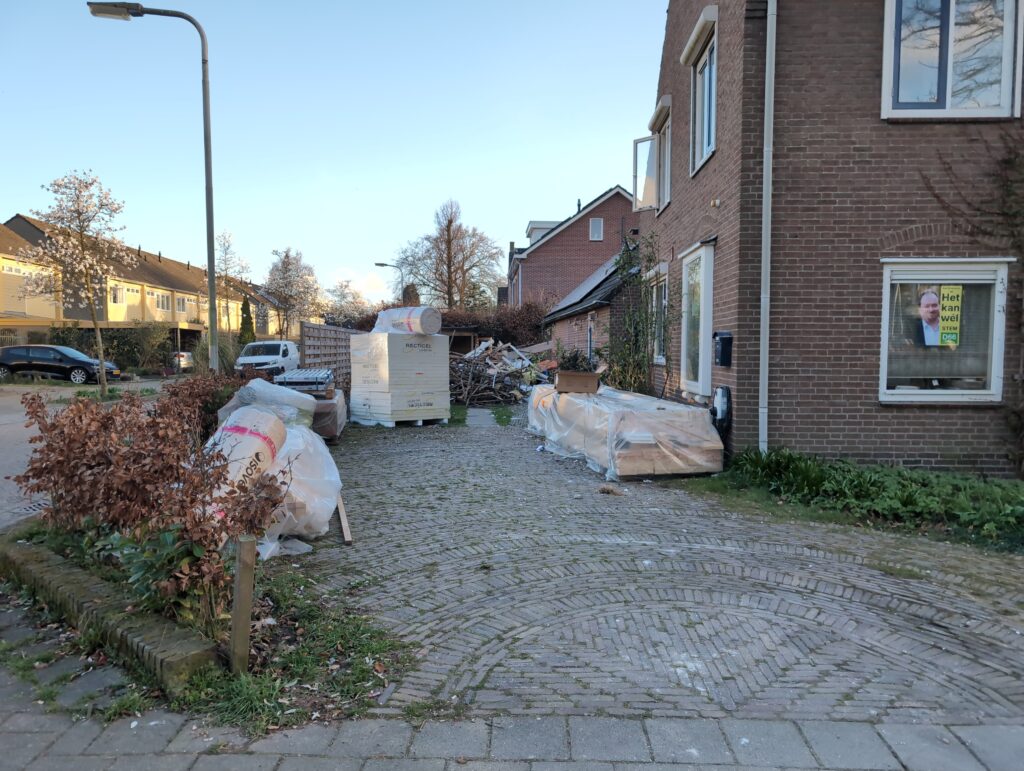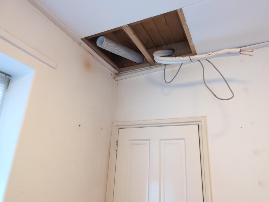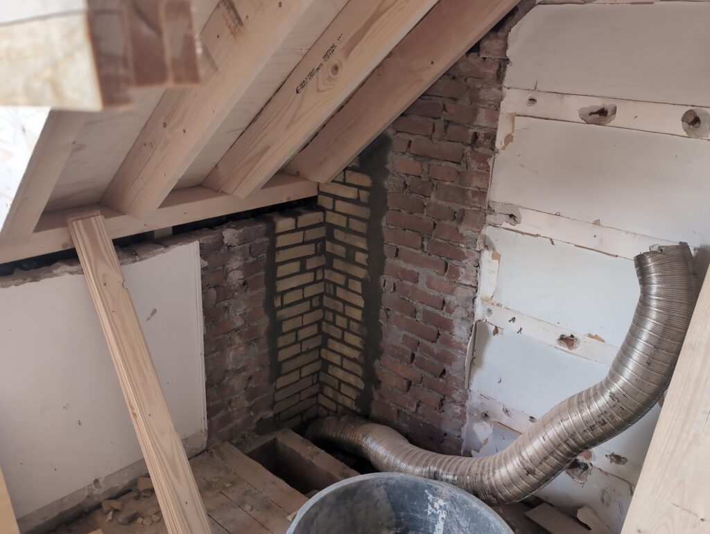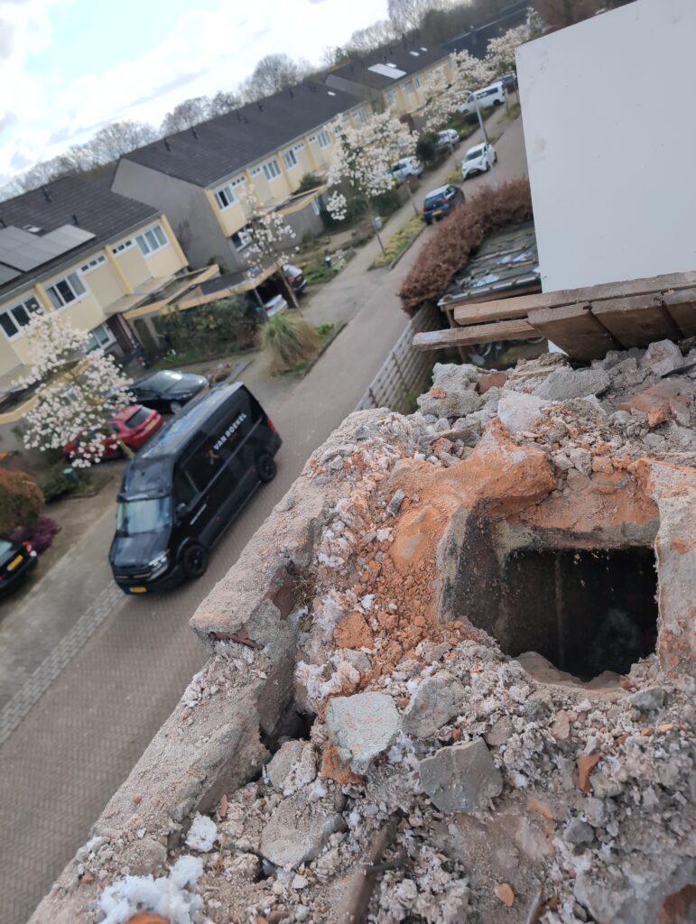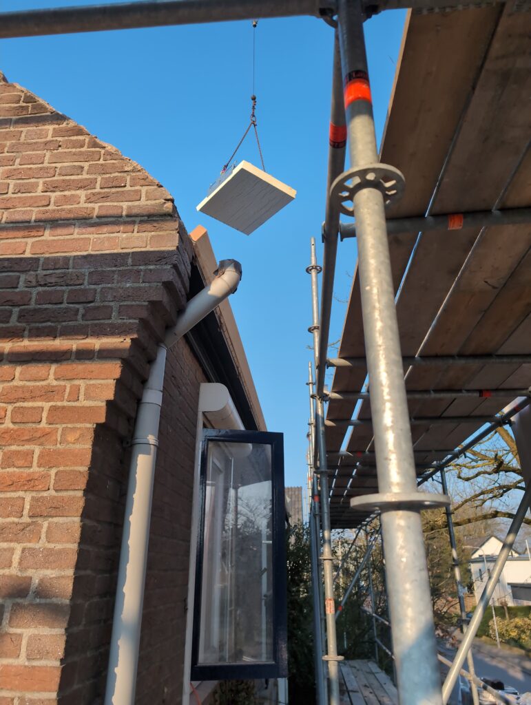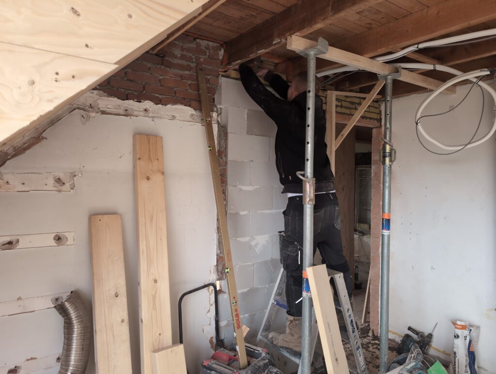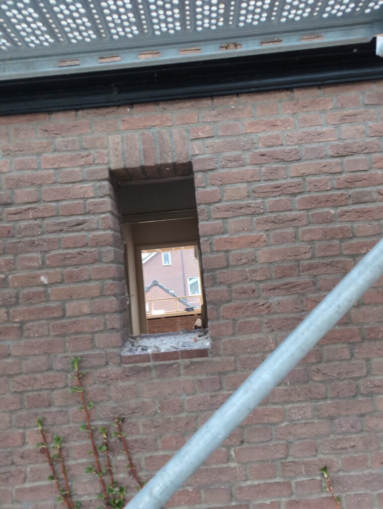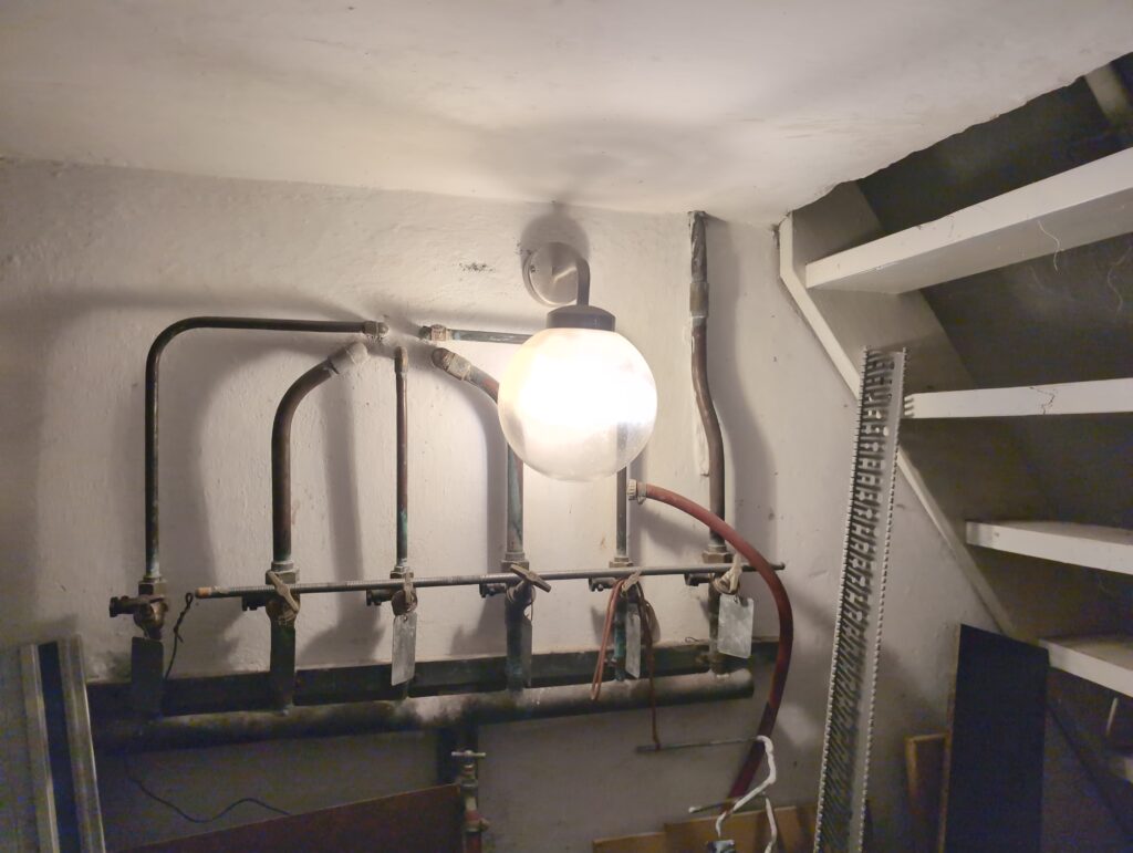 Ook is de WTW/ventilatie afgerond, voor wat het leggen van de buizen betreft. Dat is inclusief het trekken van (90mm) buizen van zolder naar de voorkant van de woonkamer. Maar ook op zolder zijn er nog enkele bij gekomen. Ook zijn de eerste drie (van de vijf) airco-buizen naar buiten toe geluid naast het balkon. Fun fact: Die worden dan dus aangelegd, maar liggen vervolgens weer in de weg, dus worden de netjes afgewerkte buizen toch nog even losgeschroeft om er bij te kunnen voor het metselen. Als dat geen samenwerking is… 🙂