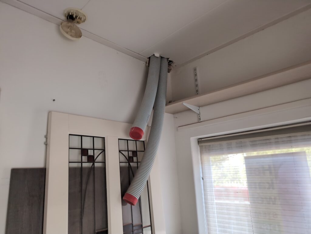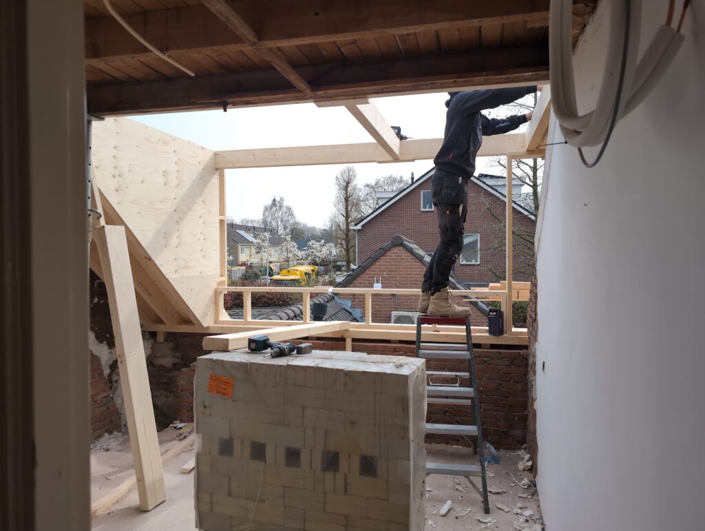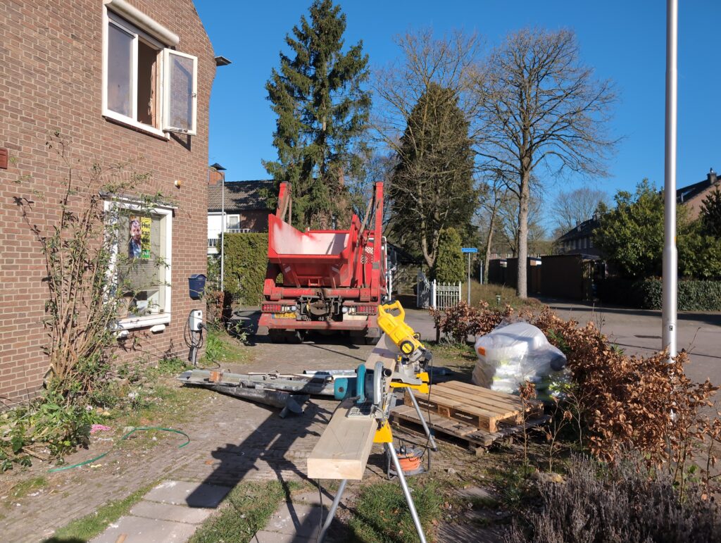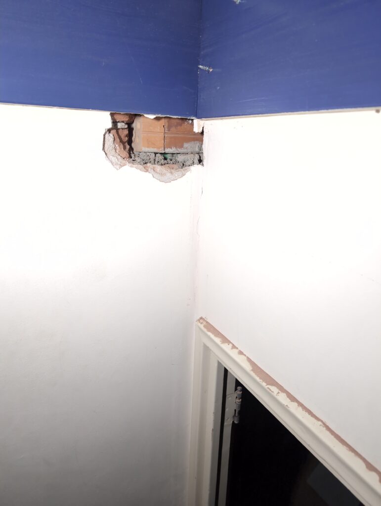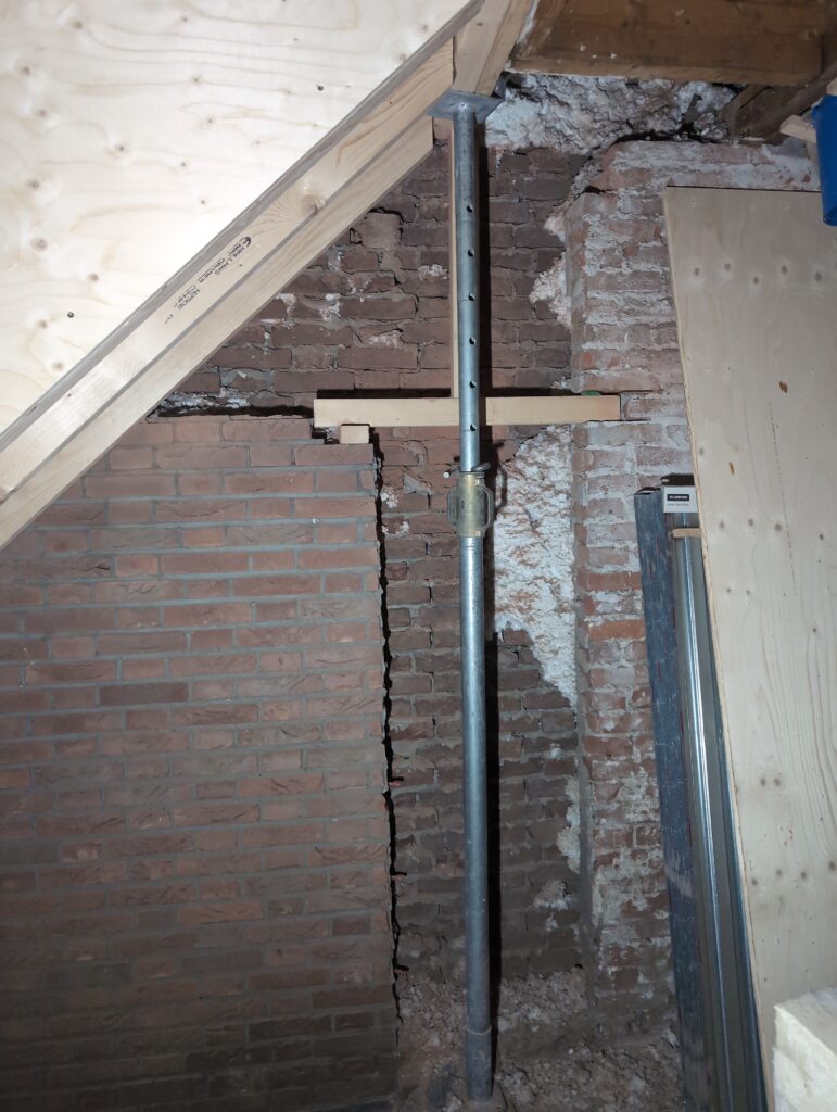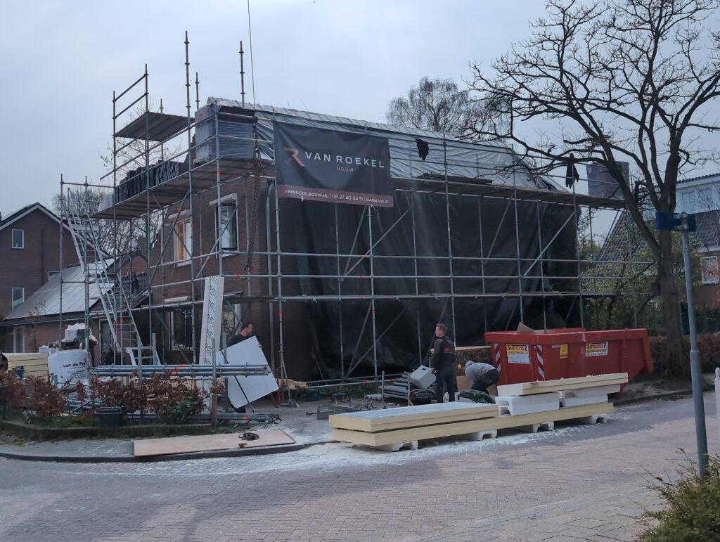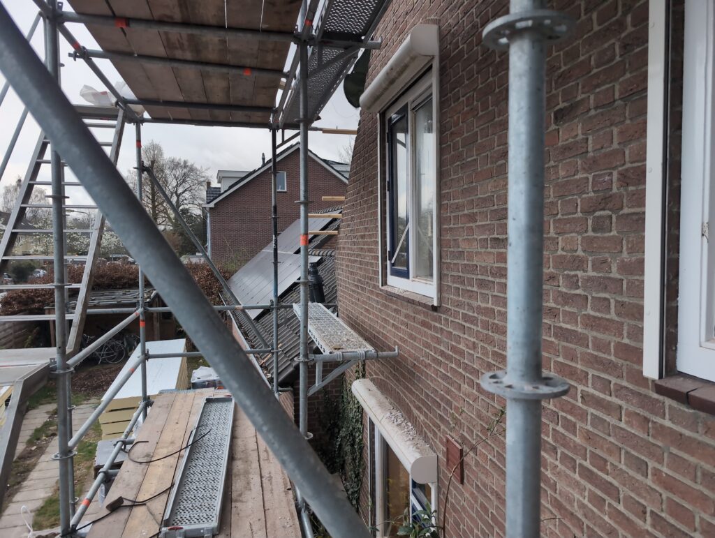 Ook is de WTW/ventilatie afgerond, voor wat het leggen van de buizen betreft. Dat is inclusief het trekken van (90mm) buizen van zolder naar de voorkant van de woonkamer. Maar ook op zolder zijn er nog enkele bij gekomen. Ook zijn de eerste drie (van de vijf) airco-buizen naar buiten toe geluid naast het balkon. Fun fact: Die worden dan dus aangelegd, maar liggen vervolgens weer in de weg, dus worden de netjes afgewerkte buizen toch nog even losgeschroeft om er bij te kunnen voor het metselen. Als dat geen samenwerking is… 🙂