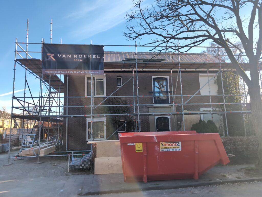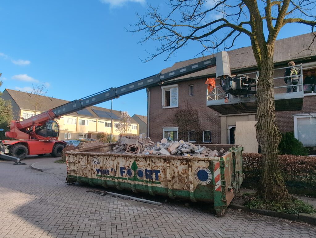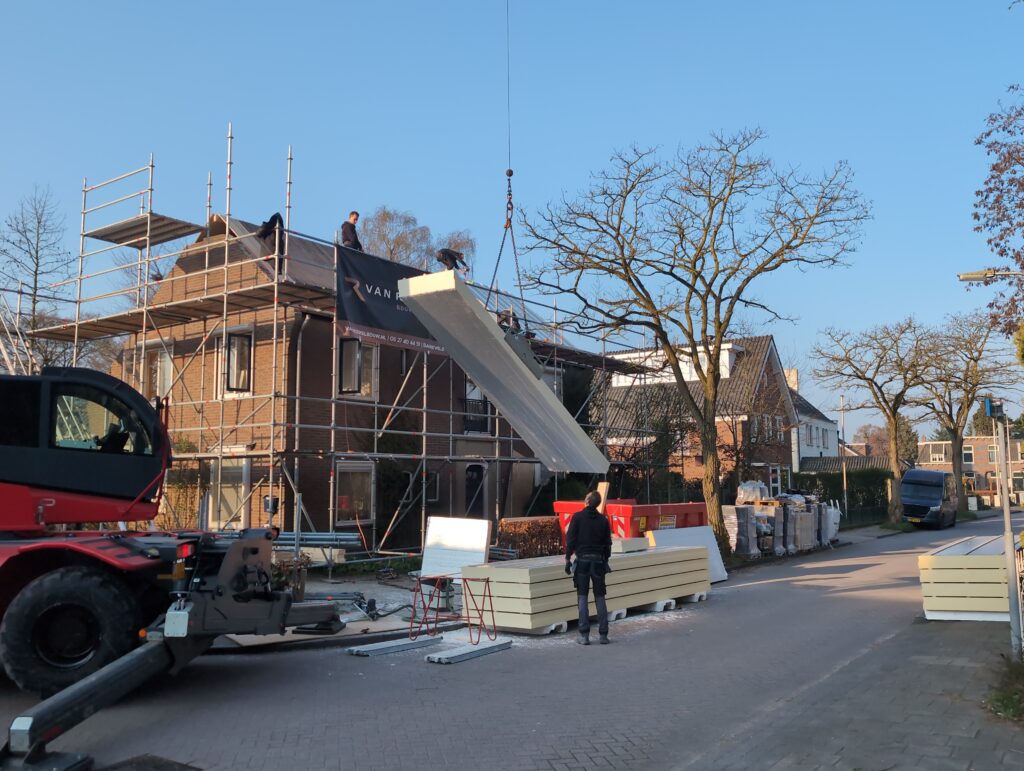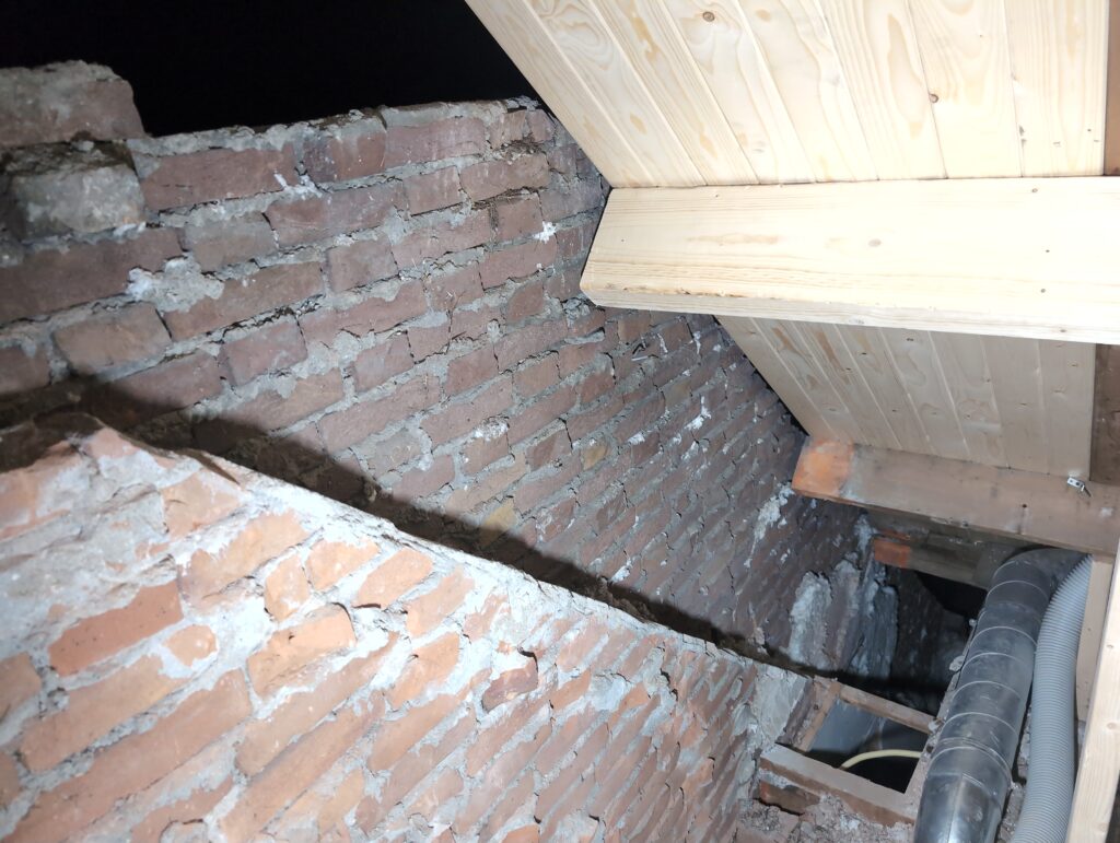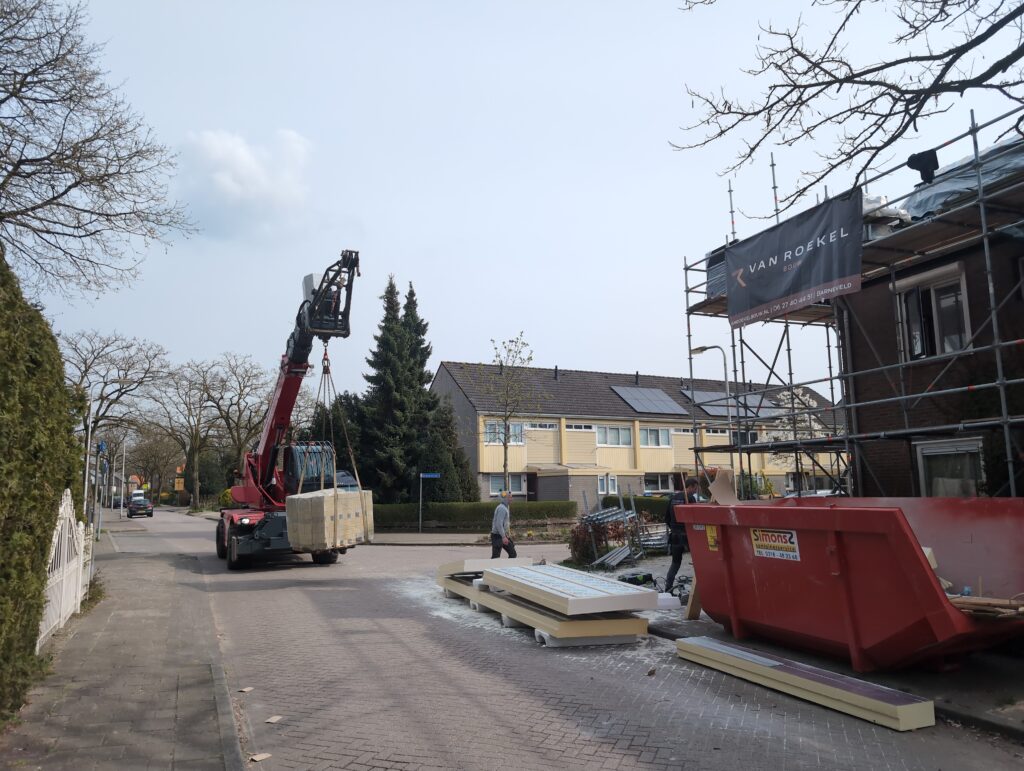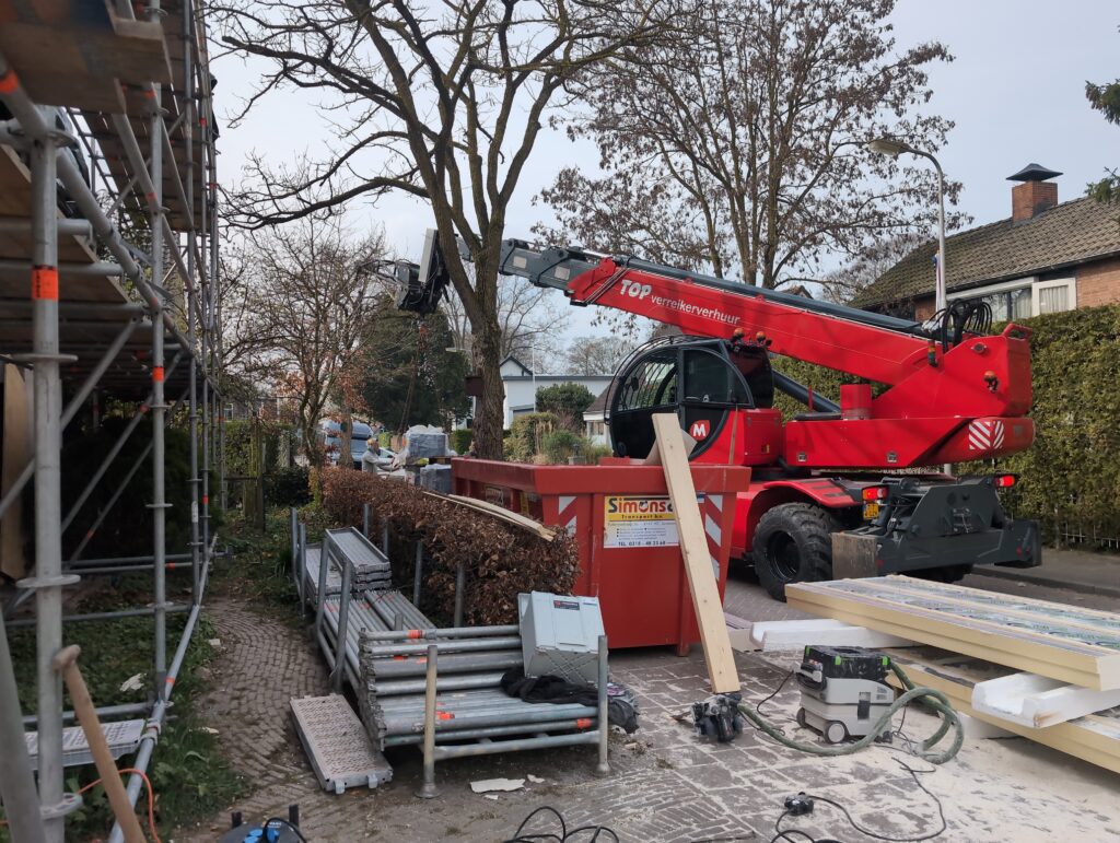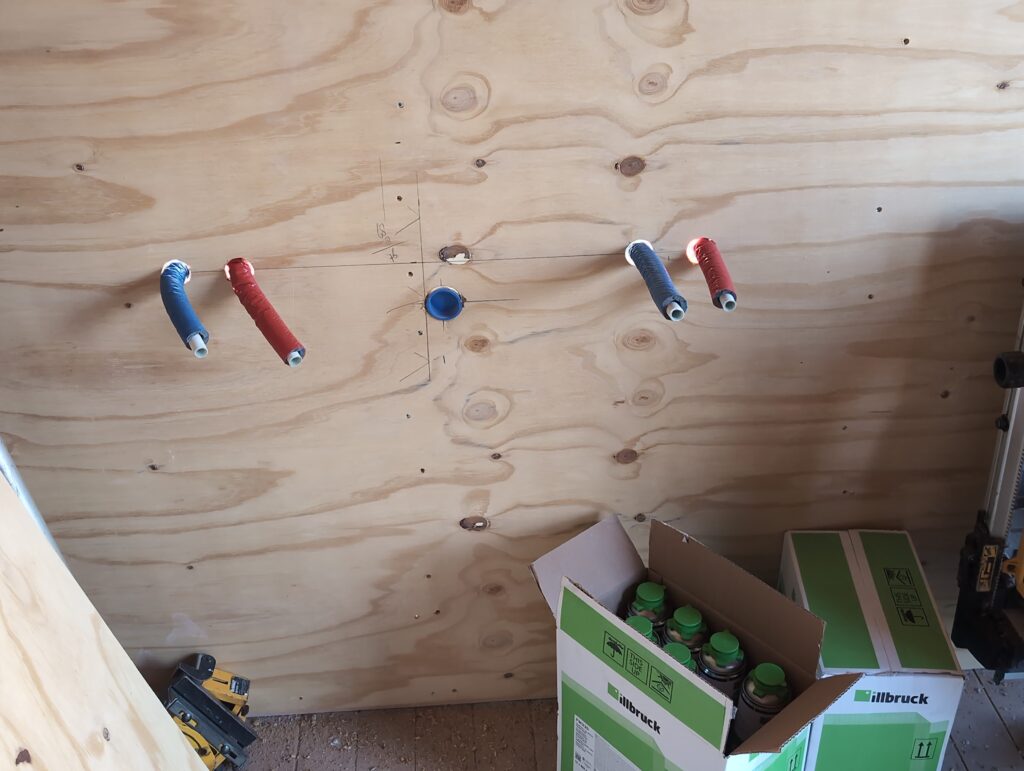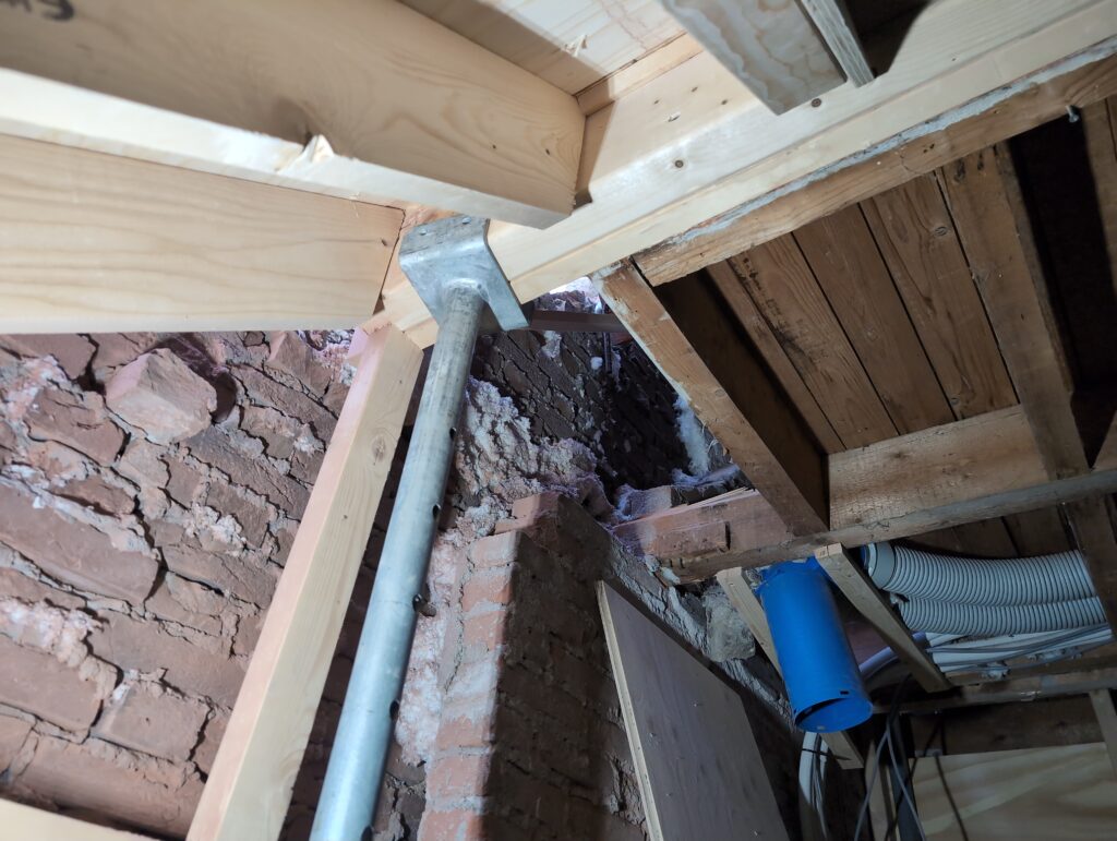 Ook is de WTW/ventilatie afgerond, voor wat het leggen van de buizen betreft. Dat is inclusief het trekken van (90mm) buizen van zolder naar de voorkant van de woonkamer. Maar ook op zolder zijn er nog enkele bij gekomen. Ook zijn de eerste drie (van de vijf) airco-buizen naar buiten toe geluid naast het balkon. Fun fact: Die worden dan dus aangelegd, maar liggen vervolgens weer in de weg, dus worden de netjes afgewerkte buizen toch nog even losgeschroeft om er bij te kunnen voor het metselen. Als dat geen samenwerking is… 🙂