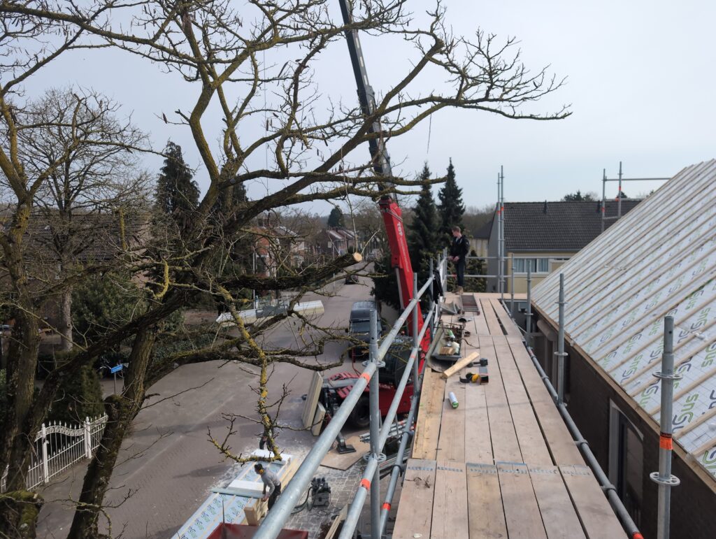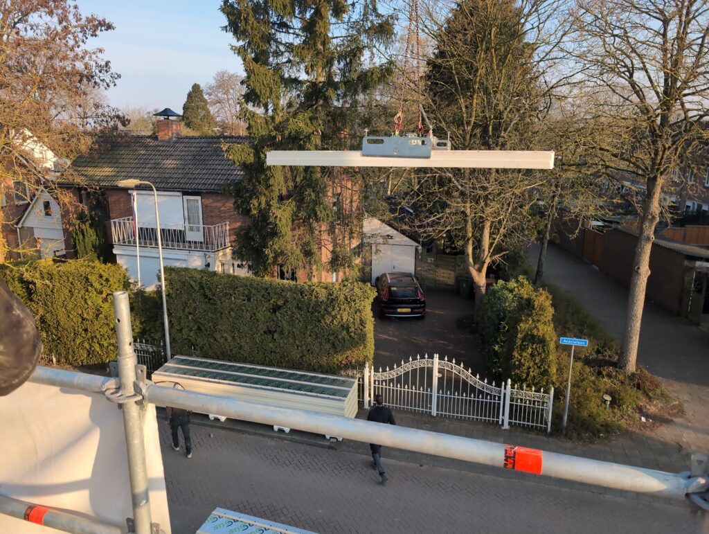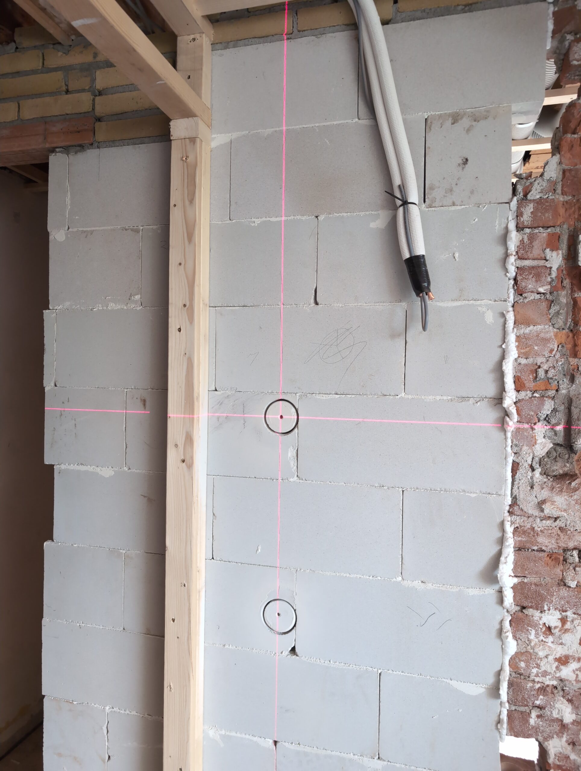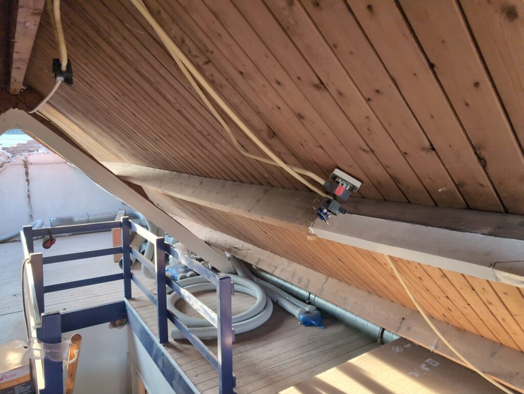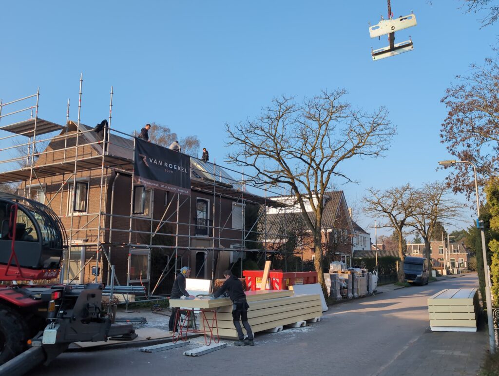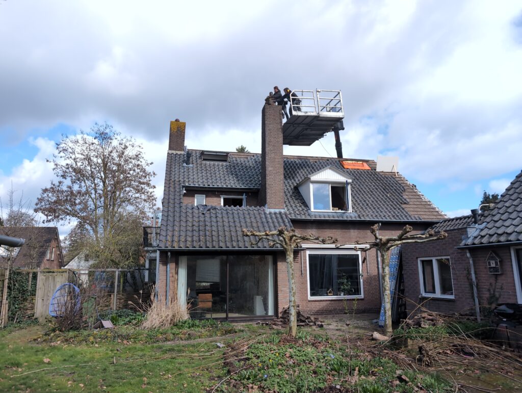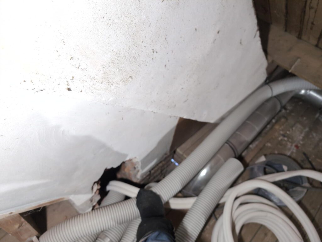 Ook is de WTW/ventilatie afgerond, voor wat het leggen van de buizen betreft. Dat is inclusief het trekken van (90mm) buizen van zolder naar de voorkant van de woonkamer. Maar ook op zolder zijn er nog enkele bij gekomen. Ook zijn de eerste drie (van de vijf) airco-buizen naar buiten toe geluid naast het balkon. Fun fact: Die worden dan dus aangelegd, maar liggen vervolgens weer in de weg, dus worden de netjes afgewerkte buizen toch nog even losgeschroeft om er bij te kunnen voor het metselen. Als dat geen samenwerking is… 🙂