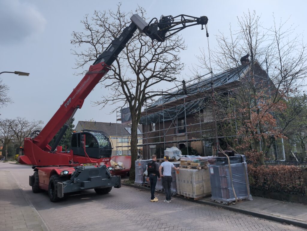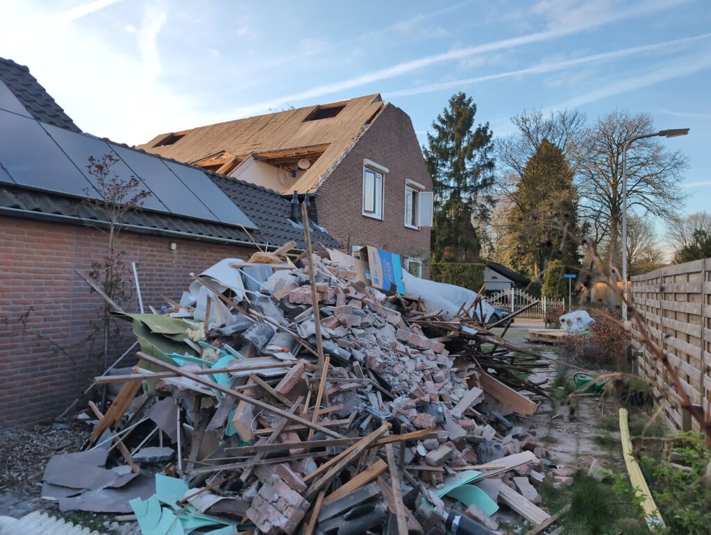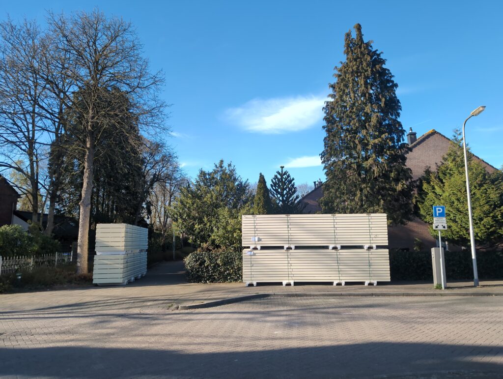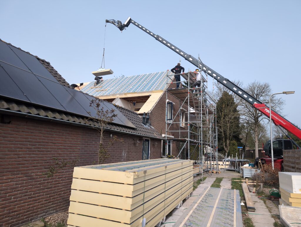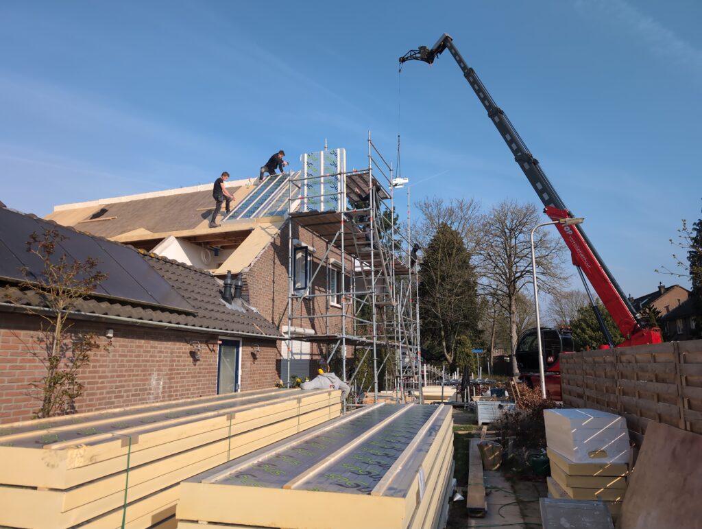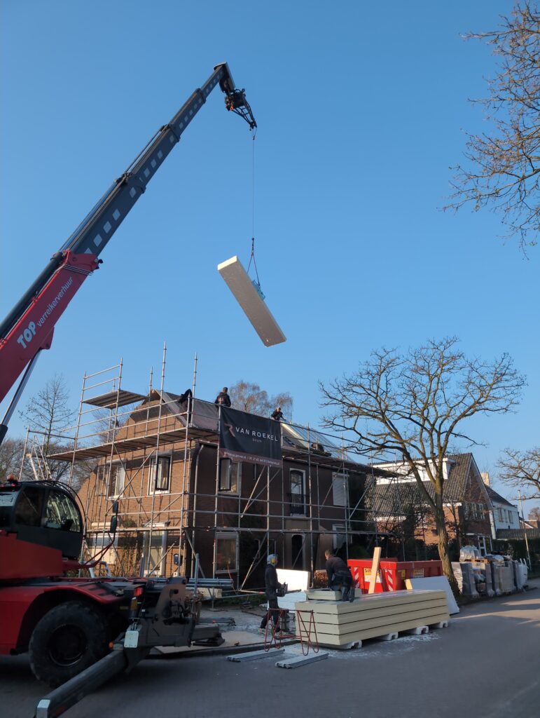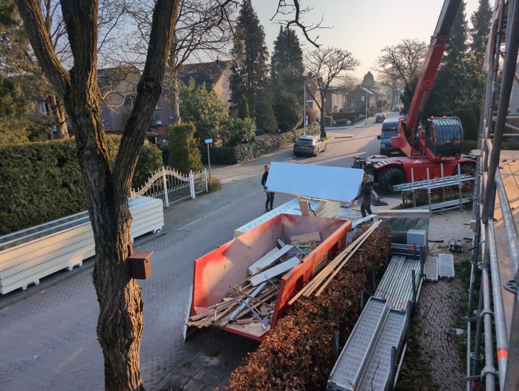 Ook is de WTW/ventilatie afgerond, voor wat het leggen van de buizen betreft. Dat is inclusief het trekken van (90mm) buizen van zolder naar de voorkant van de woonkamer. Maar ook op zolder zijn er nog enkele bij gekomen. Ook zijn de eerste drie (van de vijf) airco-buizen naar buiten toe geluid naast het balkon. Fun fact: Die worden dan dus aangelegd, maar liggen vervolgens weer in de weg, dus worden de netjes afgewerkte buizen toch nog even losgeschroeft om er bij te kunnen voor het metselen. Als dat geen samenwerking is… 🙂