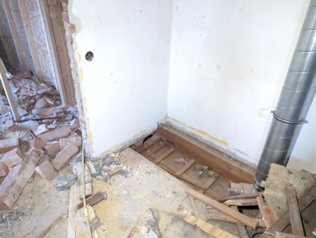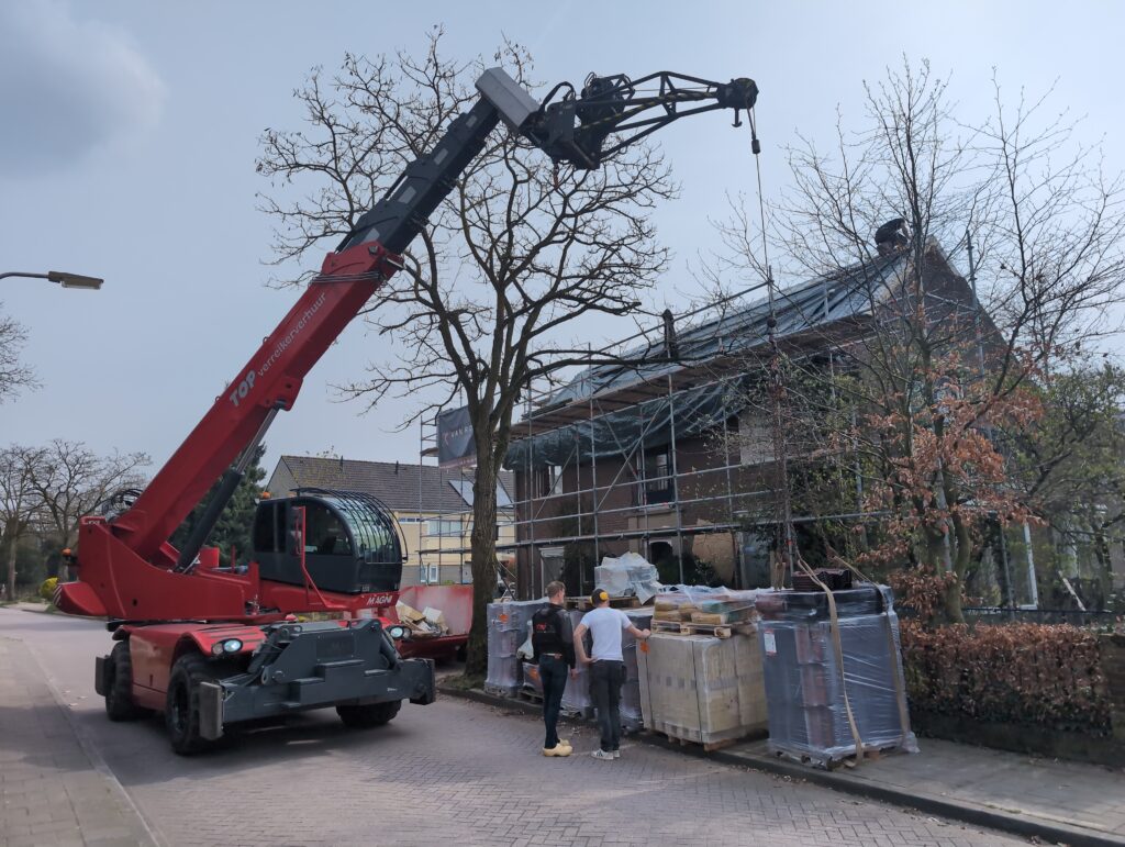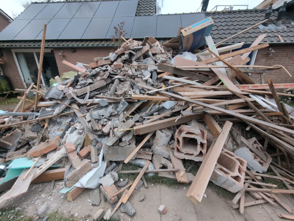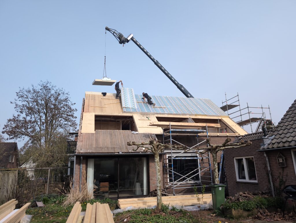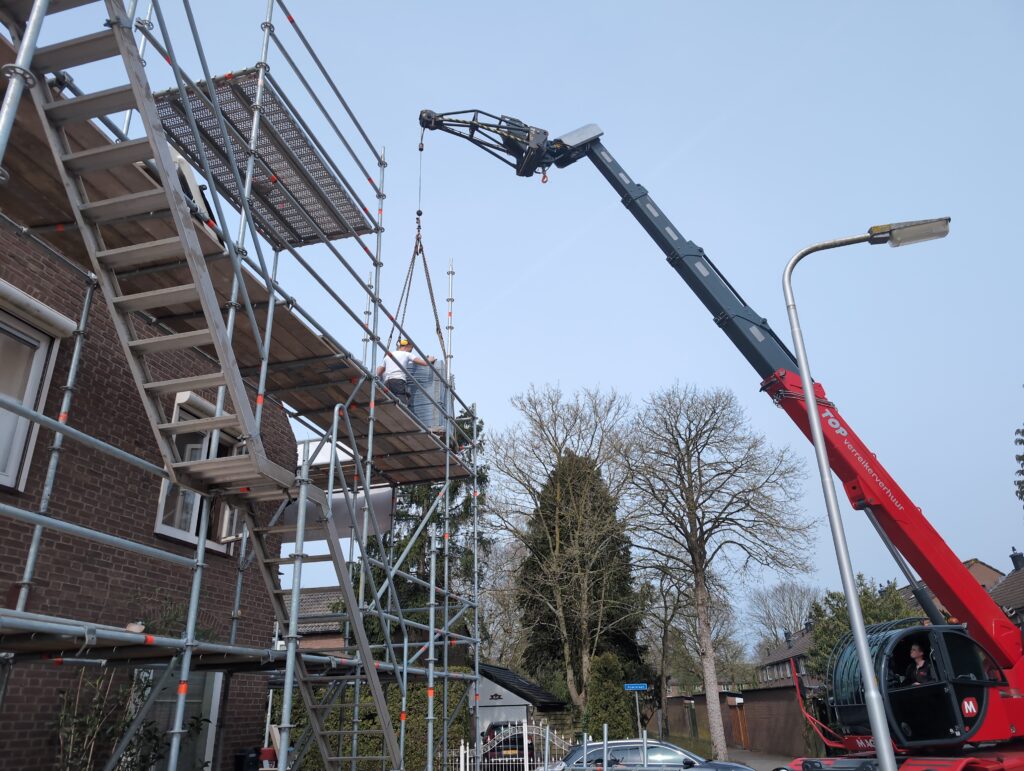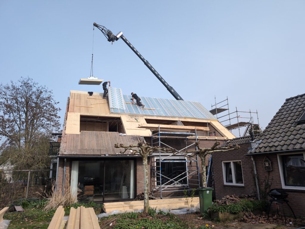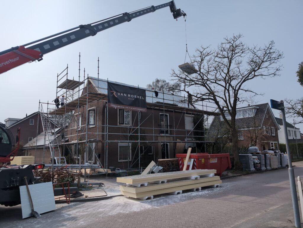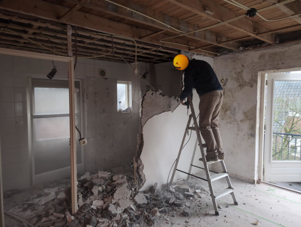 Ook is de WTW/ventilatie afgerond, voor wat het leggen van de buizen betreft. Dat is inclusief het trekken van (90mm) buizen van zolder naar de voorkant van de woonkamer. Maar ook op zolder zijn er nog enkele bij gekomen. Ook zijn de eerste drie (van de vijf) airco-buizen naar buiten toe geluid naast het balkon. Fun fact: Die worden dan dus aangelegd, maar liggen vervolgens weer in de weg, dus worden de netjes afgewerkte buizen toch nog even losgeschroeft om er bij te kunnen voor het metselen. Als dat geen samenwerking is… 🙂