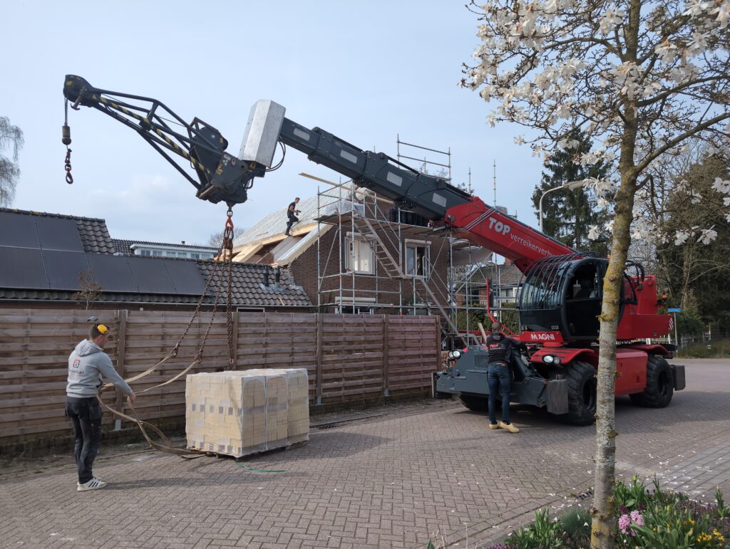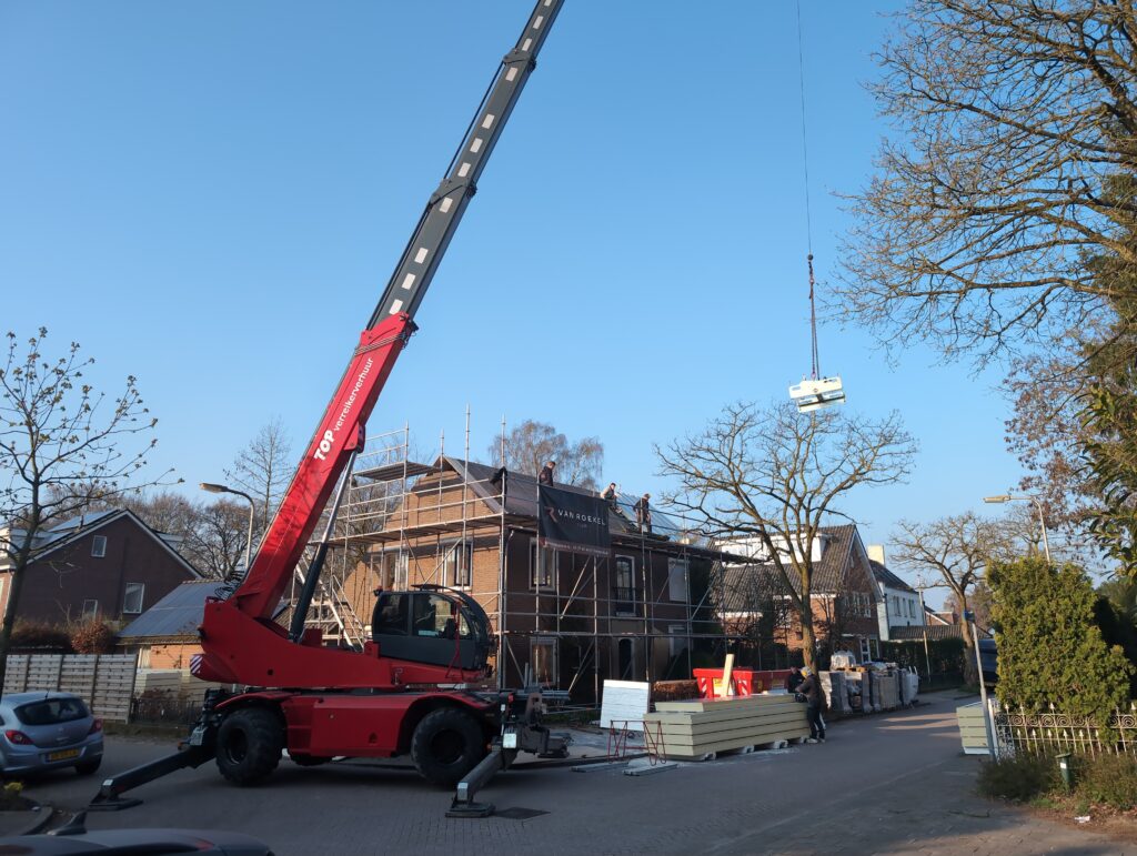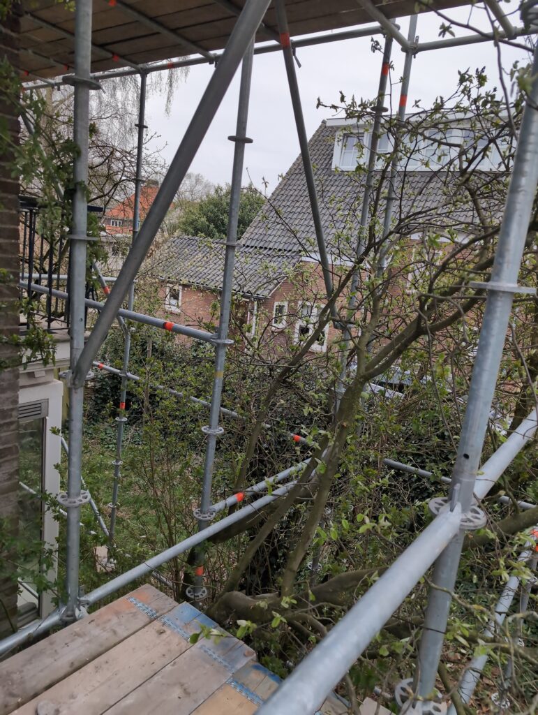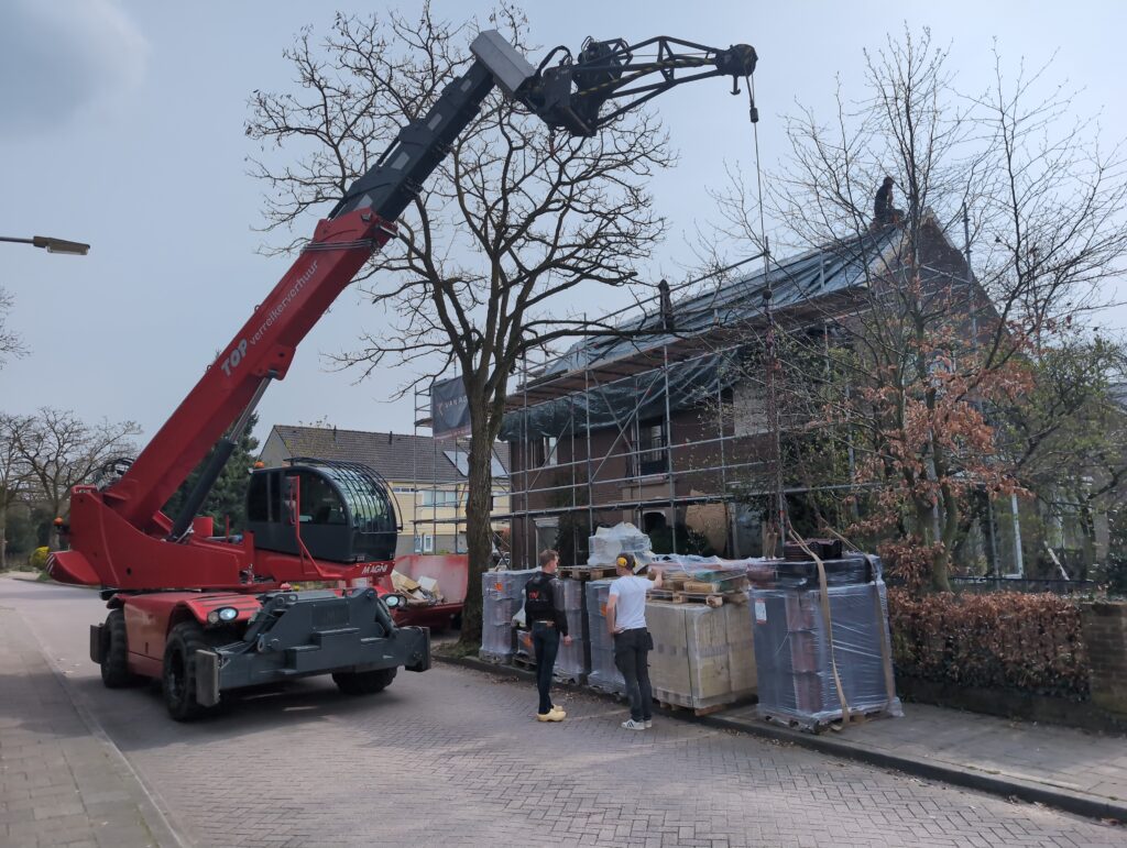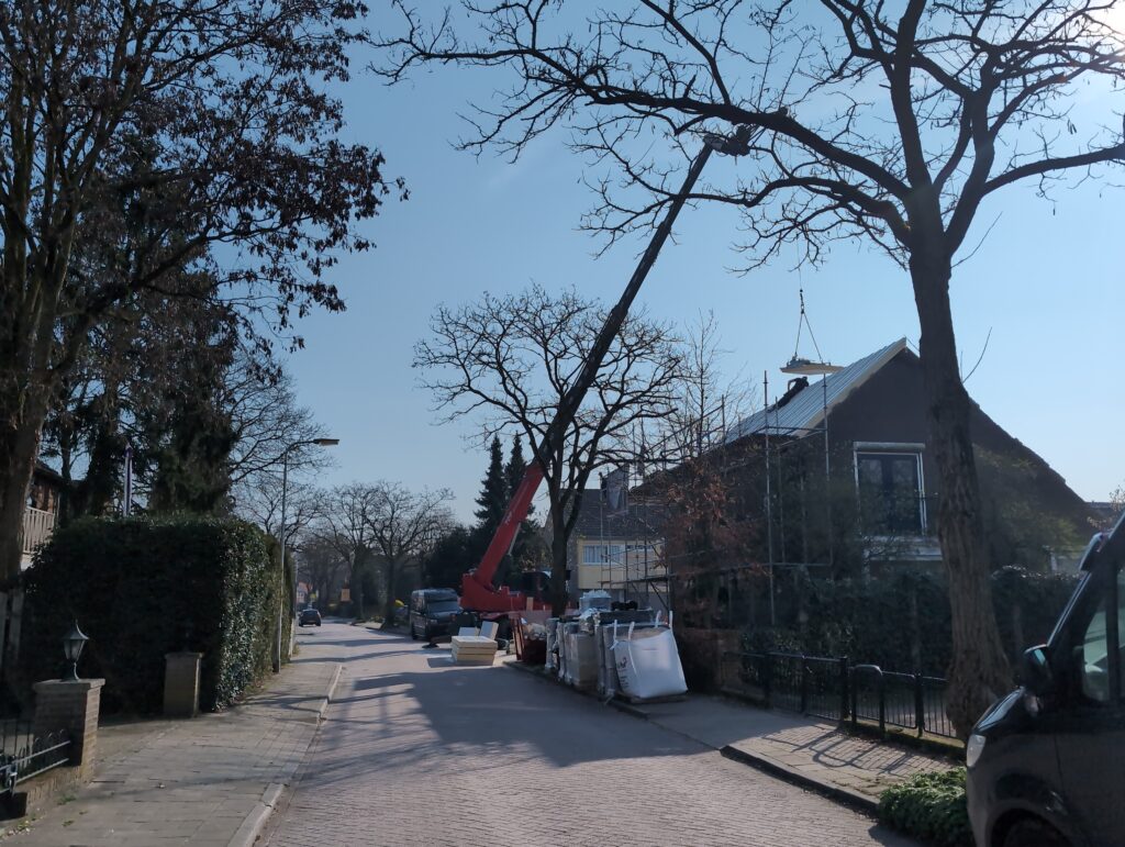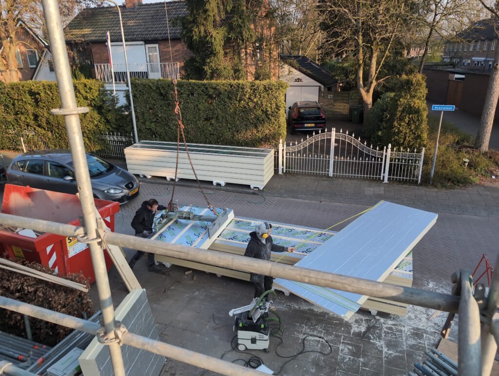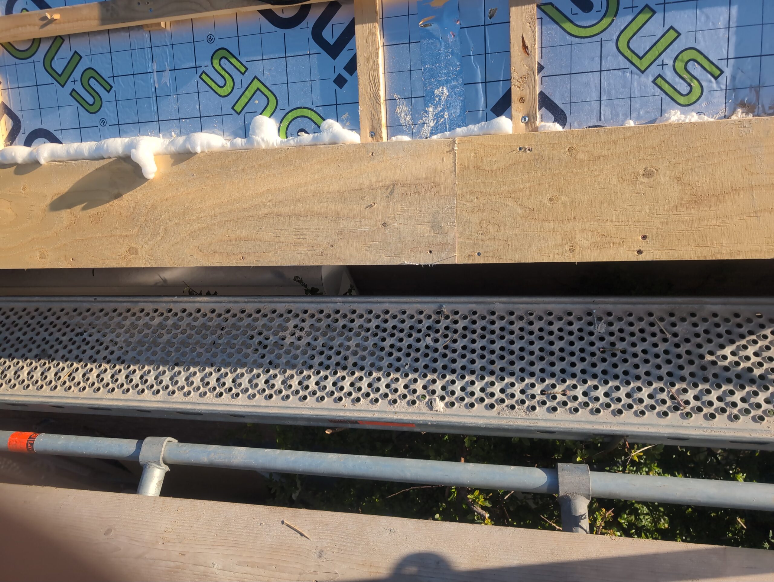 Ook is de WTW/ventilatie afgerond, voor wat het leggen van de buizen betreft. Dat is inclusief het trekken van (90mm) buizen van zolder naar de voorkant van de woonkamer. Maar ook op zolder zijn er nog enkele bij gekomen. Ook zijn de eerste drie (van de vijf) airco-buizen naar buiten toe geluid naast het balkon. Fun fact: Die worden dan dus aangelegd, maar liggen vervolgens weer in de weg, dus worden de netjes afgewerkte buizen toch nog even losgeschroeft om er bij te kunnen voor het metselen. Als dat geen samenwerking is… 🙂