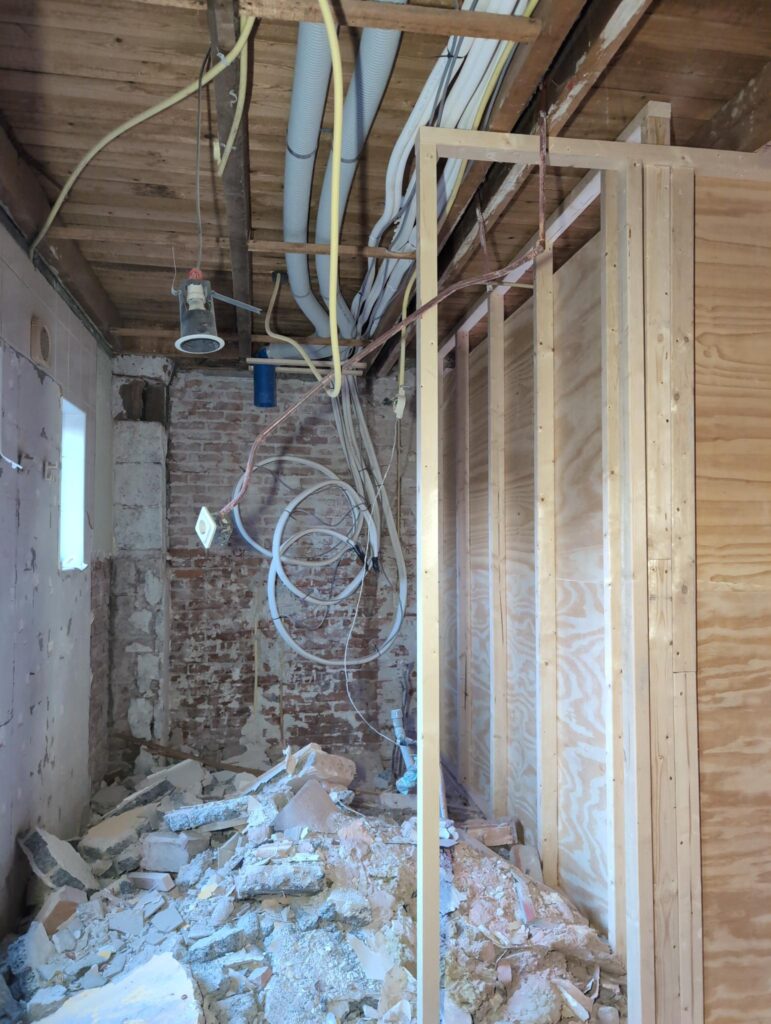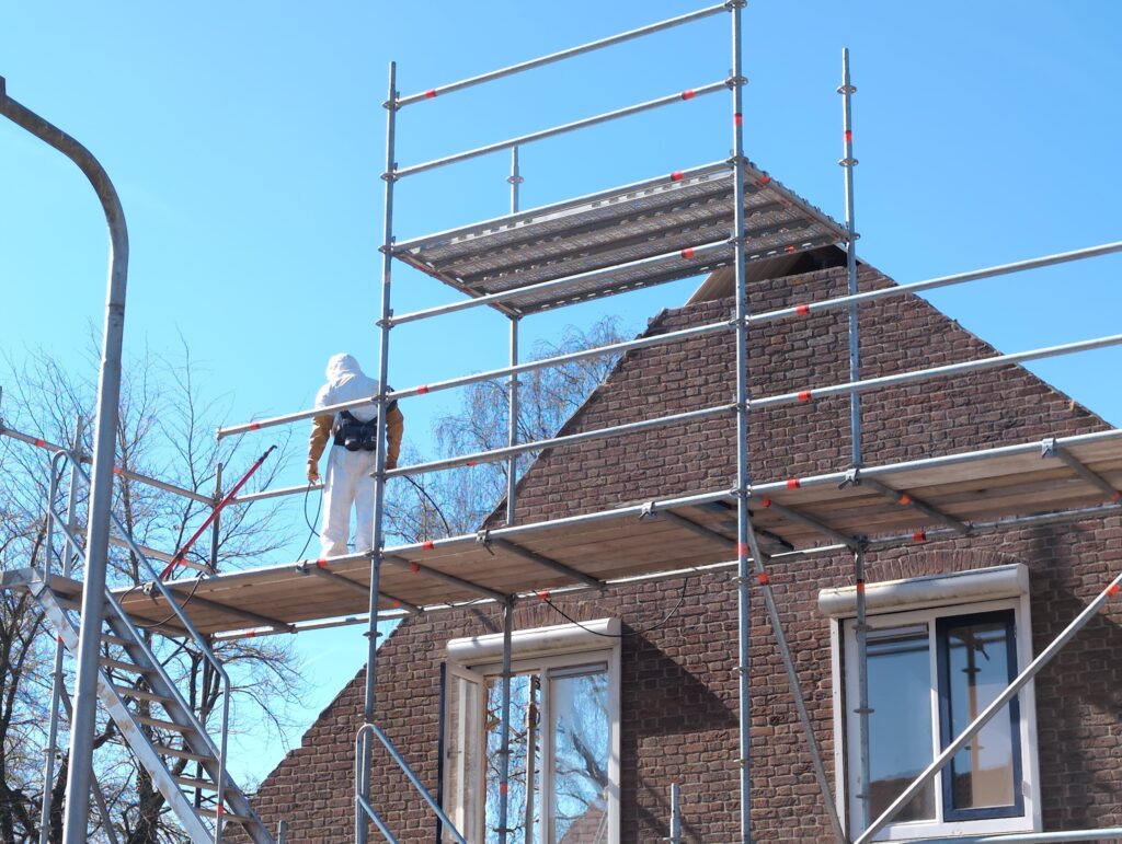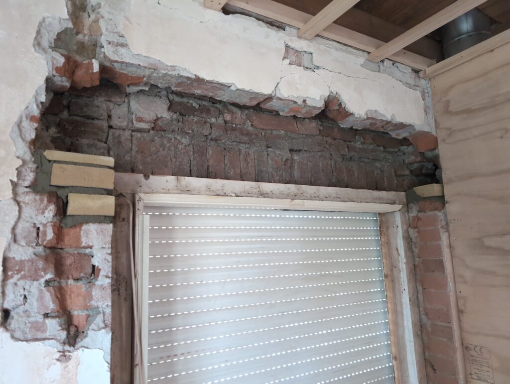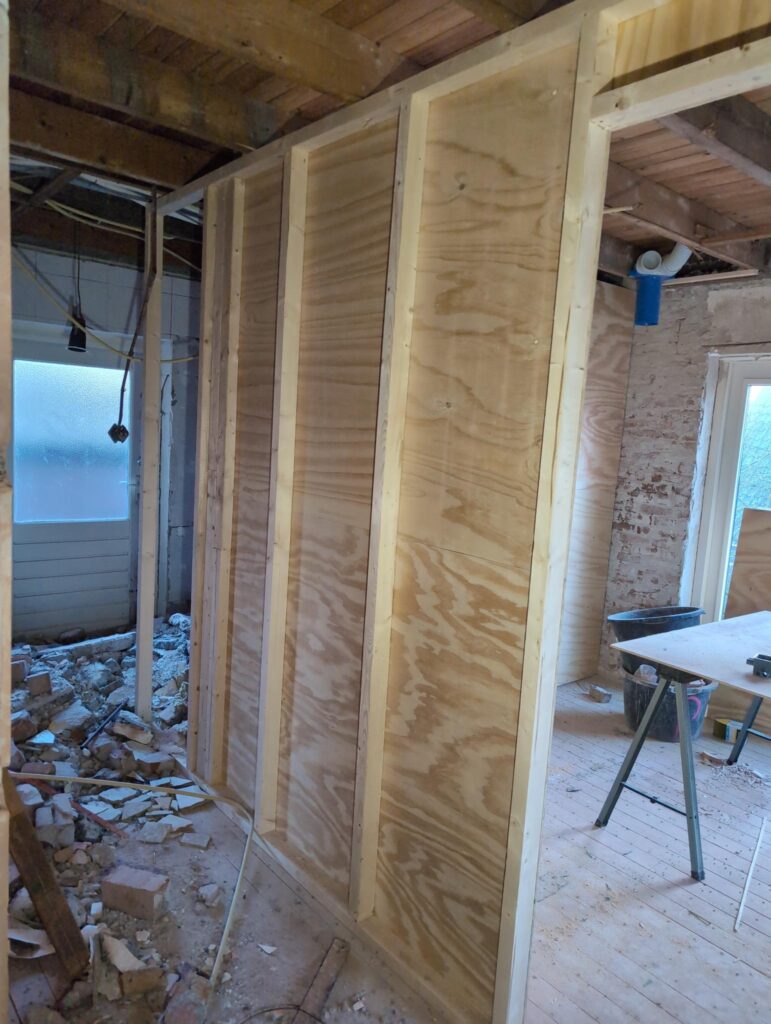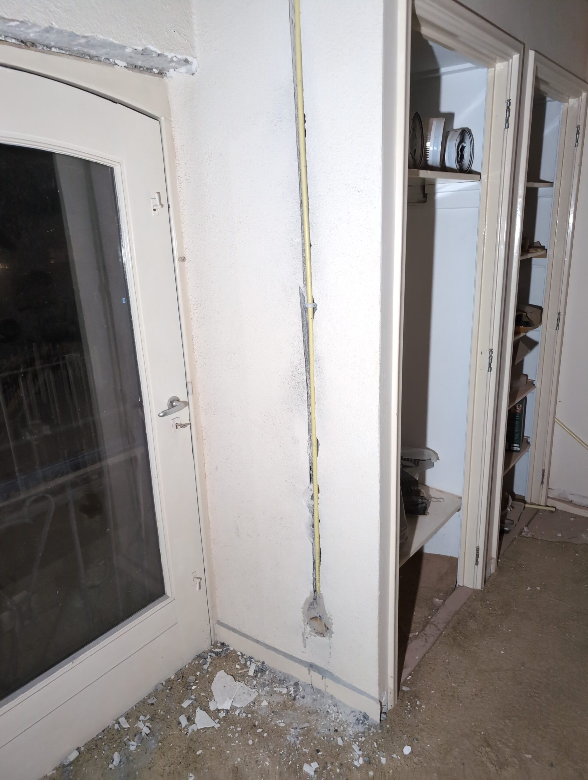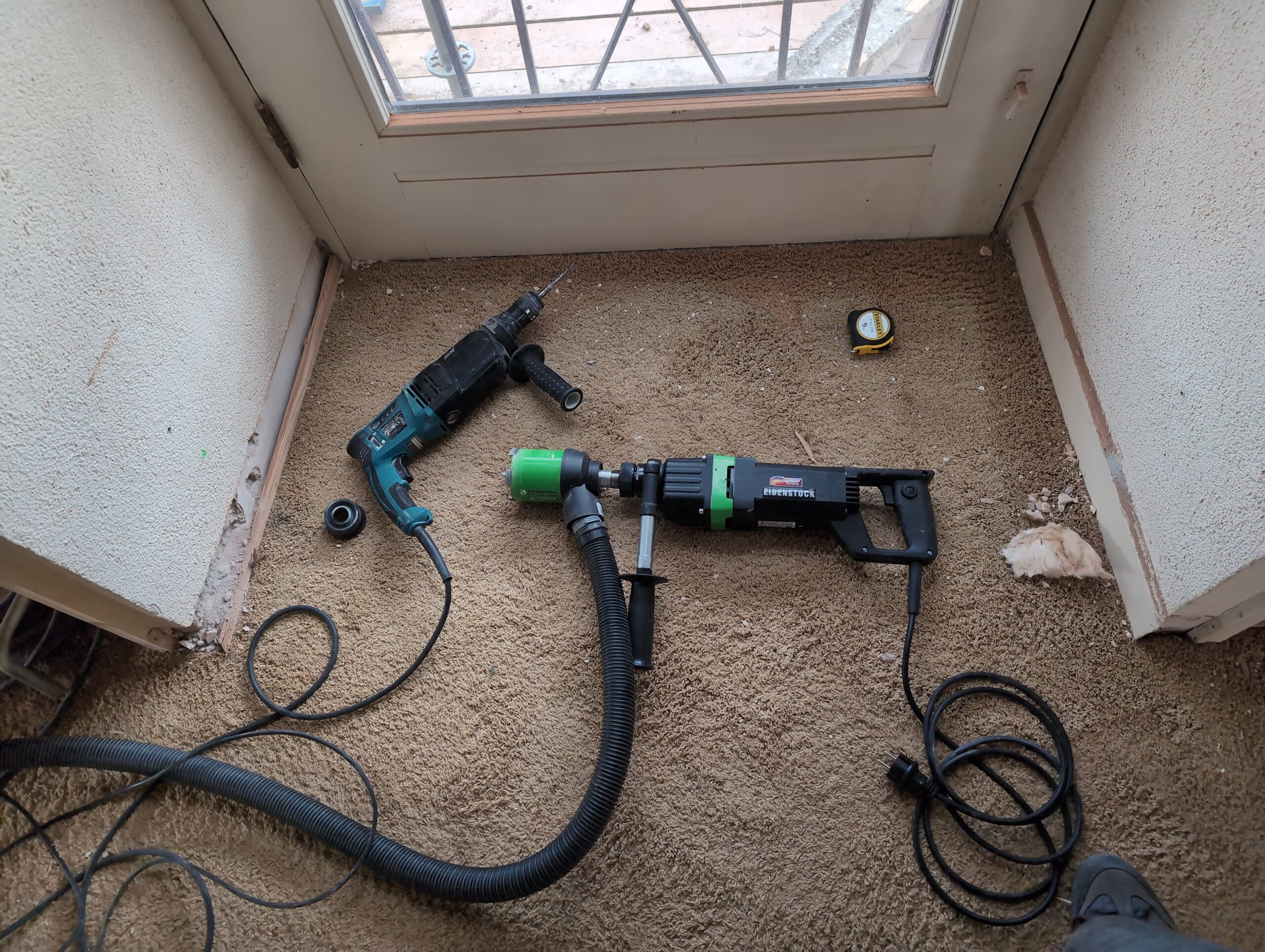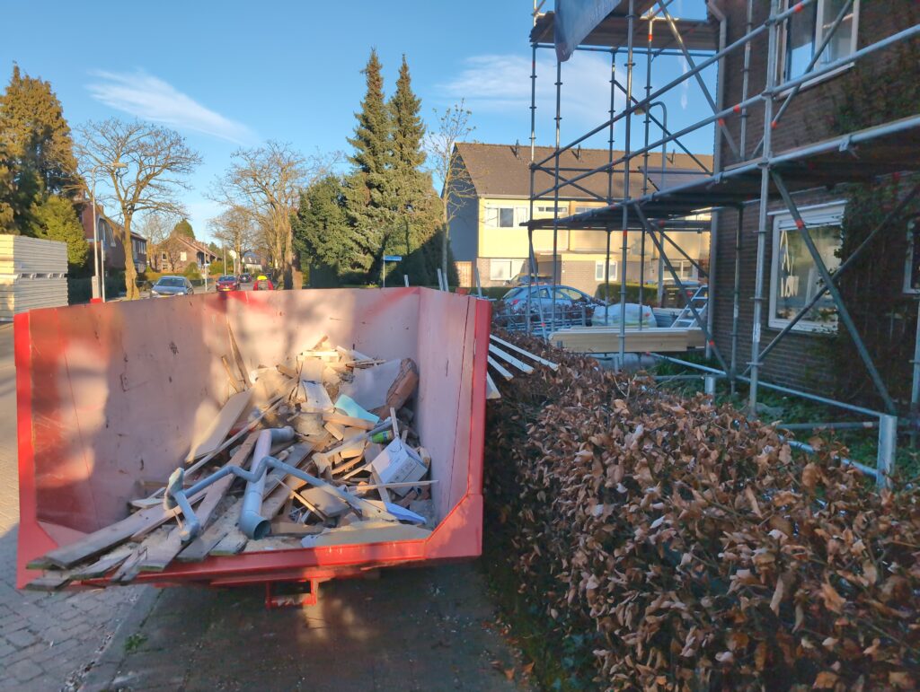 Ook is de WTW/ventilatie afgerond, voor wat het leggen van de buizen betreft. Dat is inclusief het trekken van (90mm) buizen van zolder naar de voorkant van de woonkamer. Maar ook op zolder zijn er nog enkele bij gekomen. Ook zijn de eerste drie (van de vijf) airco-buizen naar buiten toe geluid naast het balkon. Fun fact: Die worden dan dus aangelegd, maar liggen vervolgens weer in de weg, dus worden de netjes afgewerkte buizen toch nog even losgeschroeft om er bij te kunnen voor het metselen. Als dat geen samenwerking is… 🙂