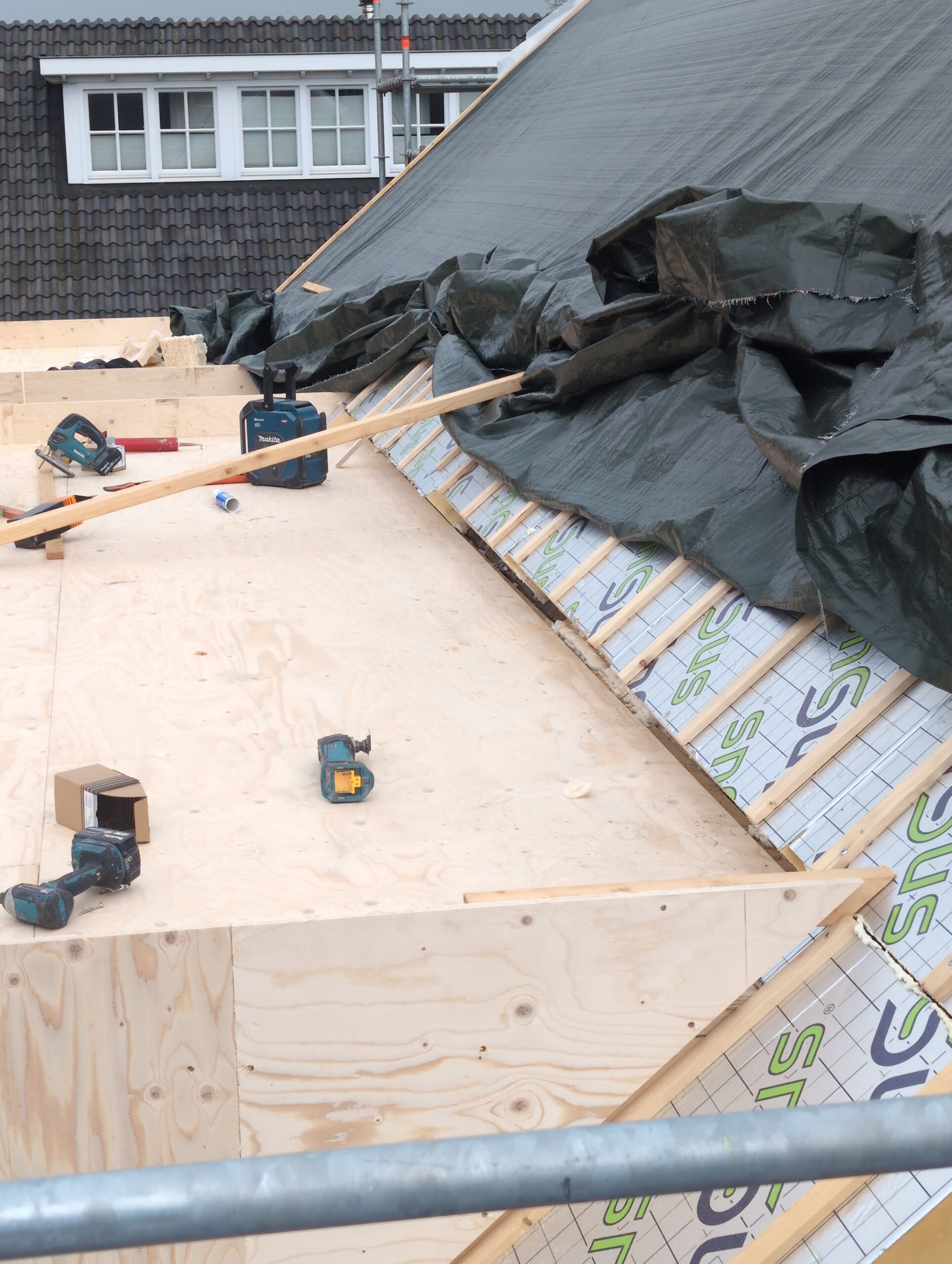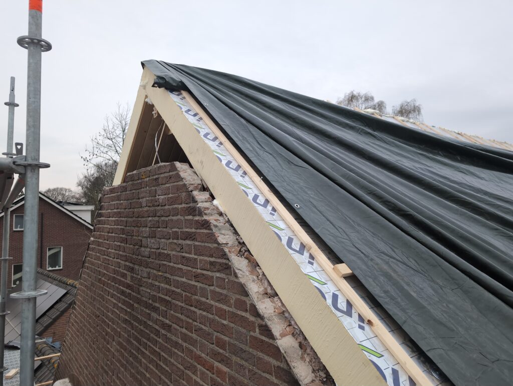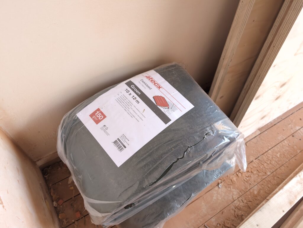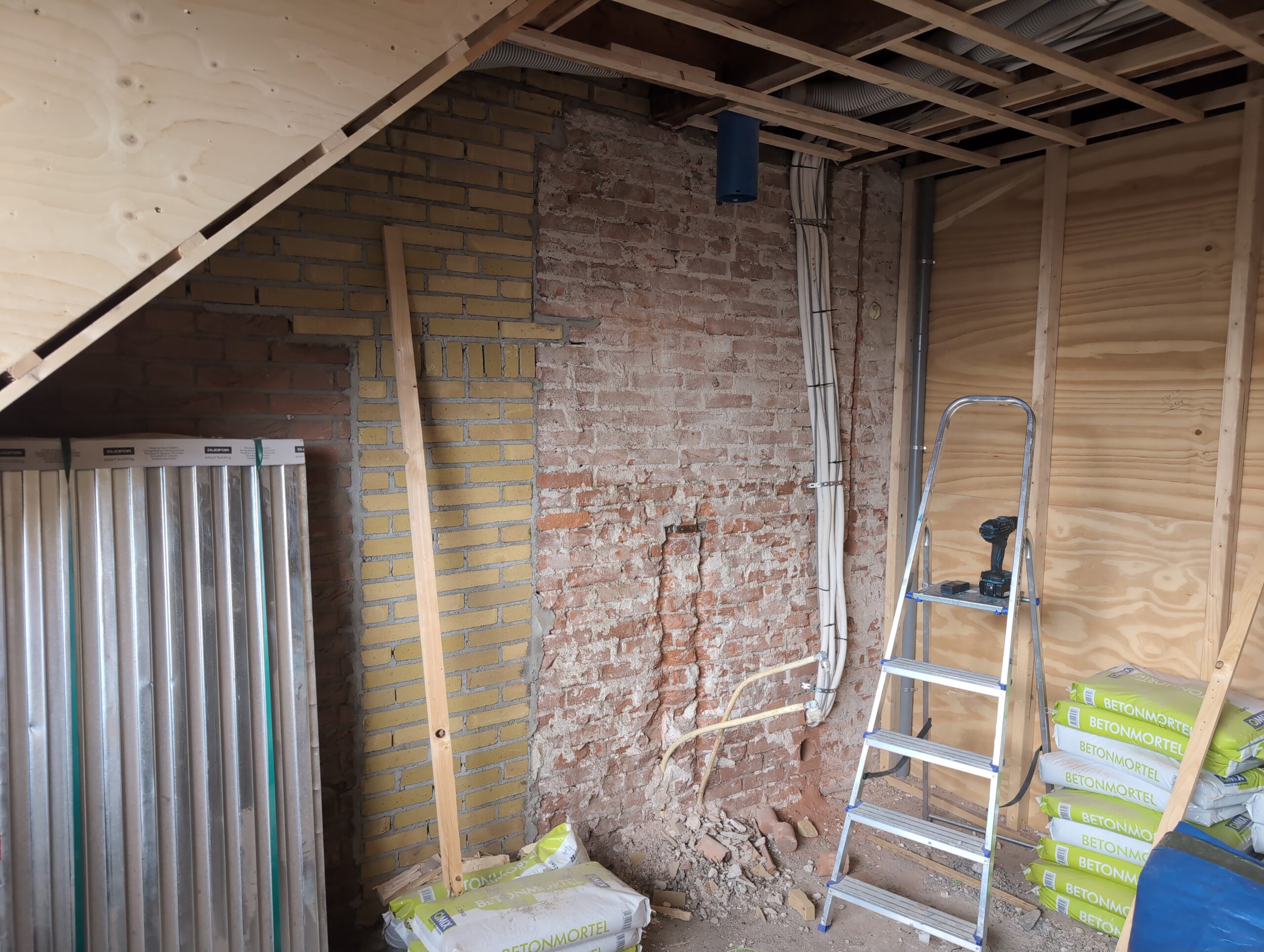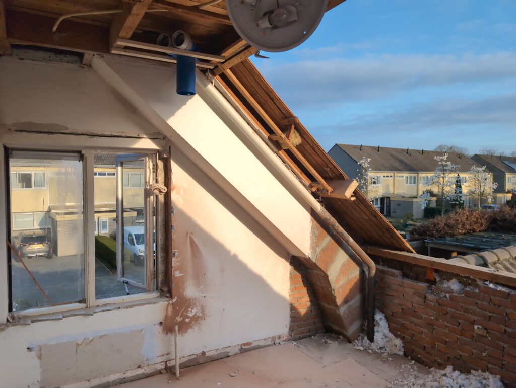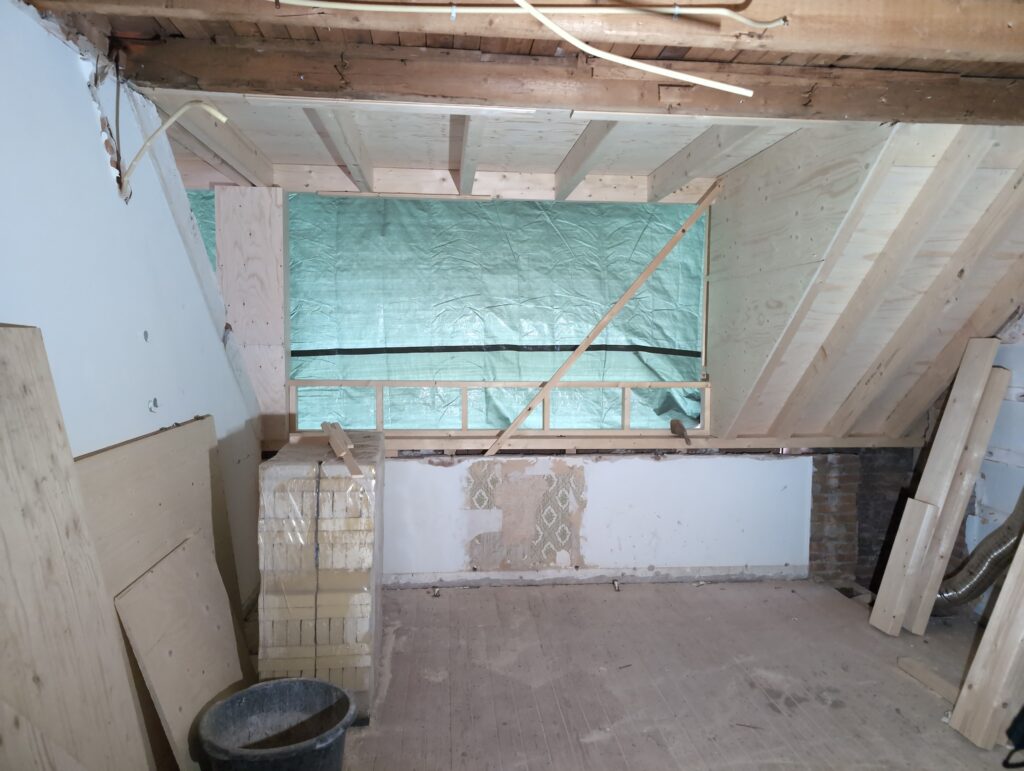 Gelukkig was er al vrij snel niets meer van het water te zien, ook beneden niet (anders dan wat lichte sporen in het plafond). Daarnaast is er van alles gebeurd: Er is een beter zeil gespannen over het dak, een kant van de zolder is dichtgemetseld, de eerste waterleidingen zijn aangelegd (wasmachine naar badkamer, rioolontluchting naar zolder). Maar ook het dak is verder afgewerkt waarbij er nog wat bussen PUR in alle kieren gespoten zijn, die daarna afgeplakt zijn met tape.