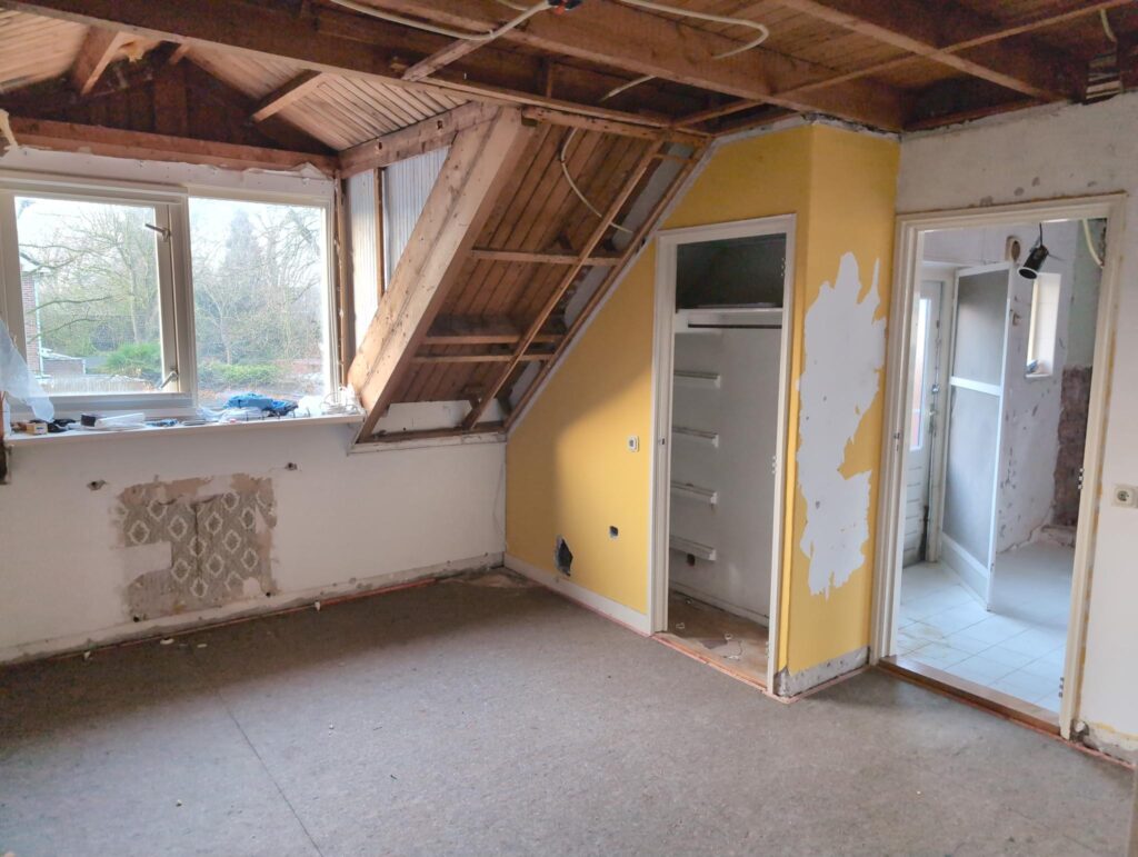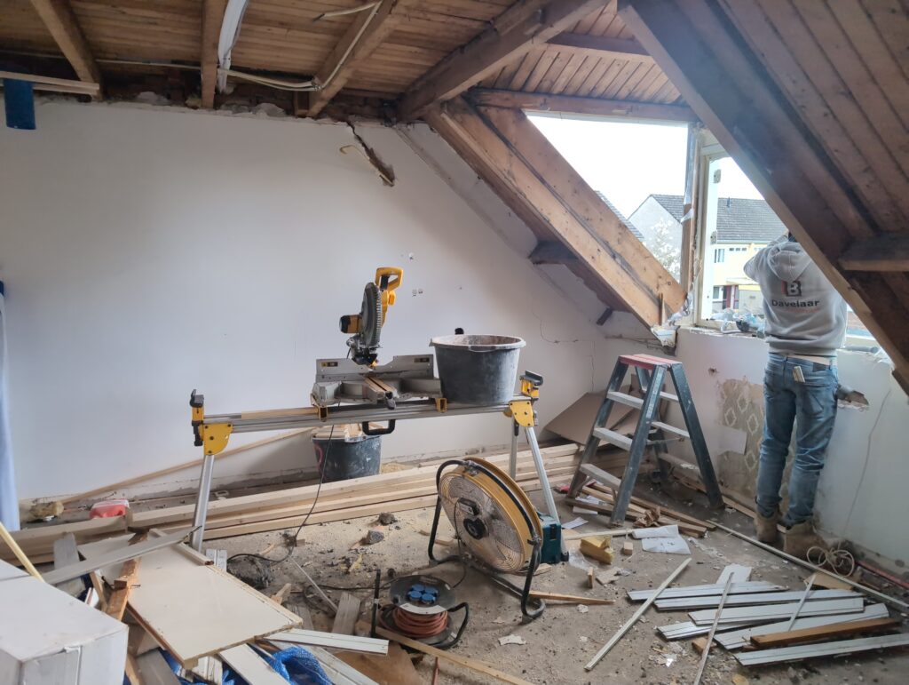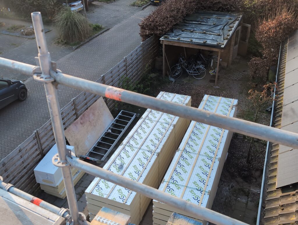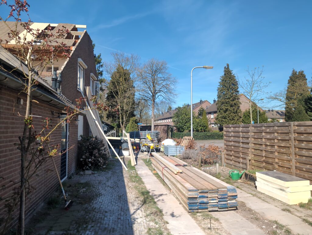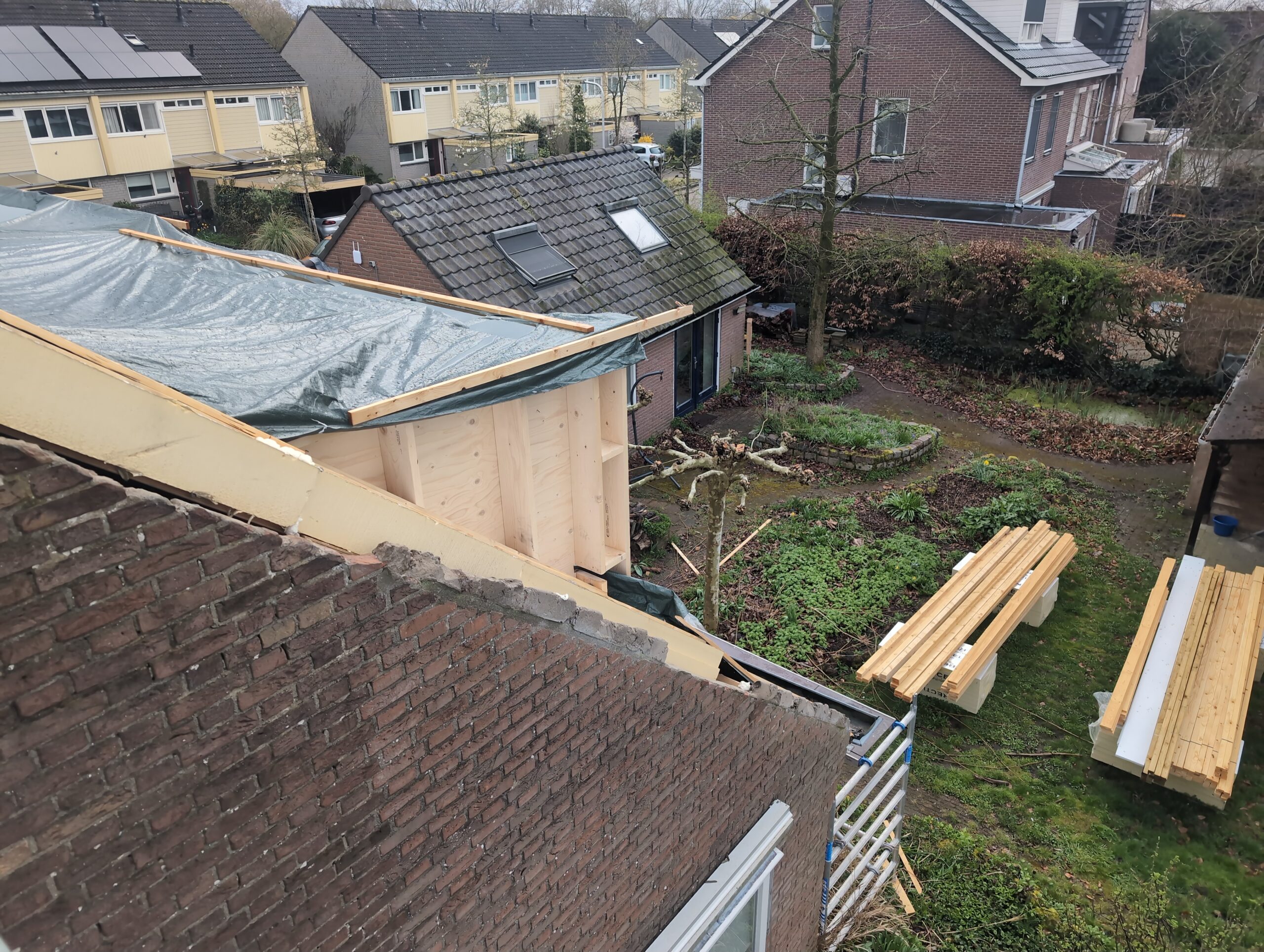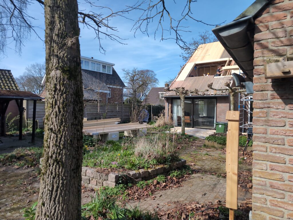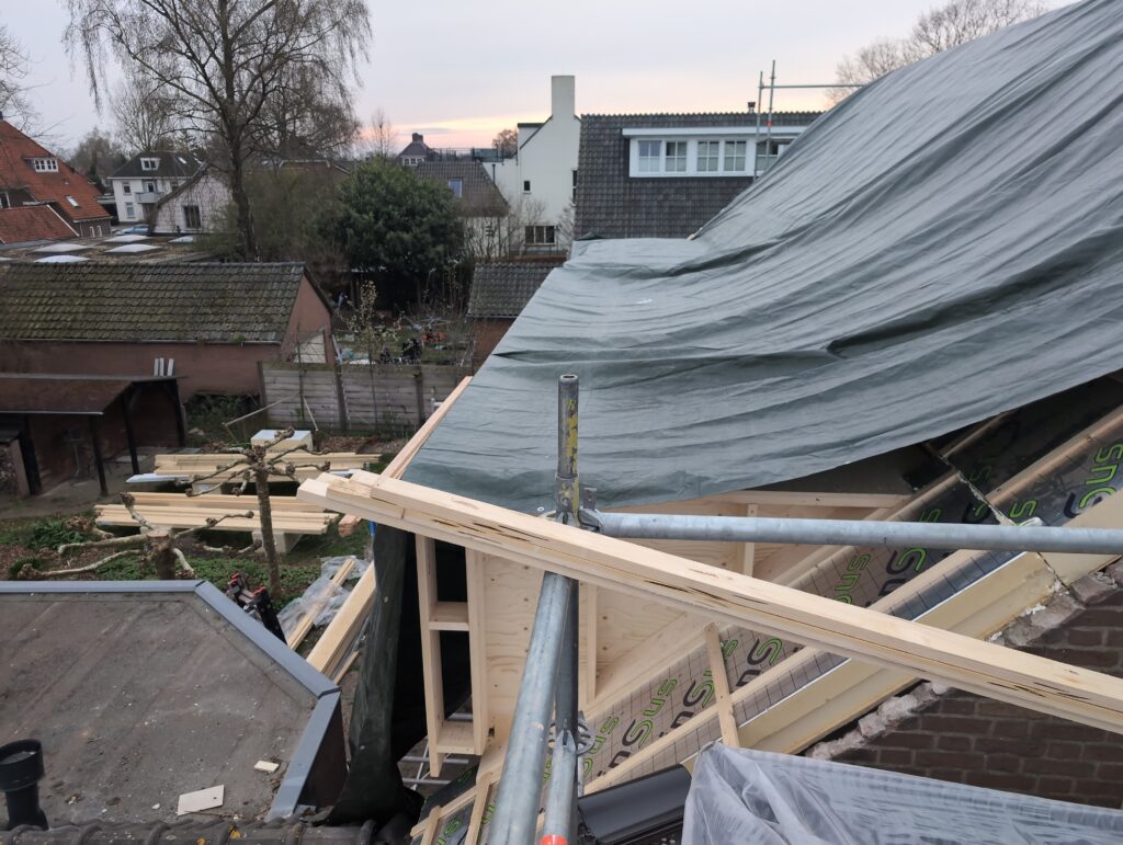 Gelukkig was er al vrij snel niets meer van het water te zien, ook beneden niet (anders dan wat lichte sporen in het plafond). Daarnaast is er van alles gebeurd: Er is een beter zeil gespannen over het dak, een kant van de zolder is dichtgemetseld, de eerste waterleidingen zijn aangelegd (wasmachine naar badkamer, rioolontluchting naar zolder). Maar ook het dak is verder afgewerkt waarbij er nog wat bussen PUR in alle kieren gespoten zijn, die daarna afgeplakt zijn met tape.