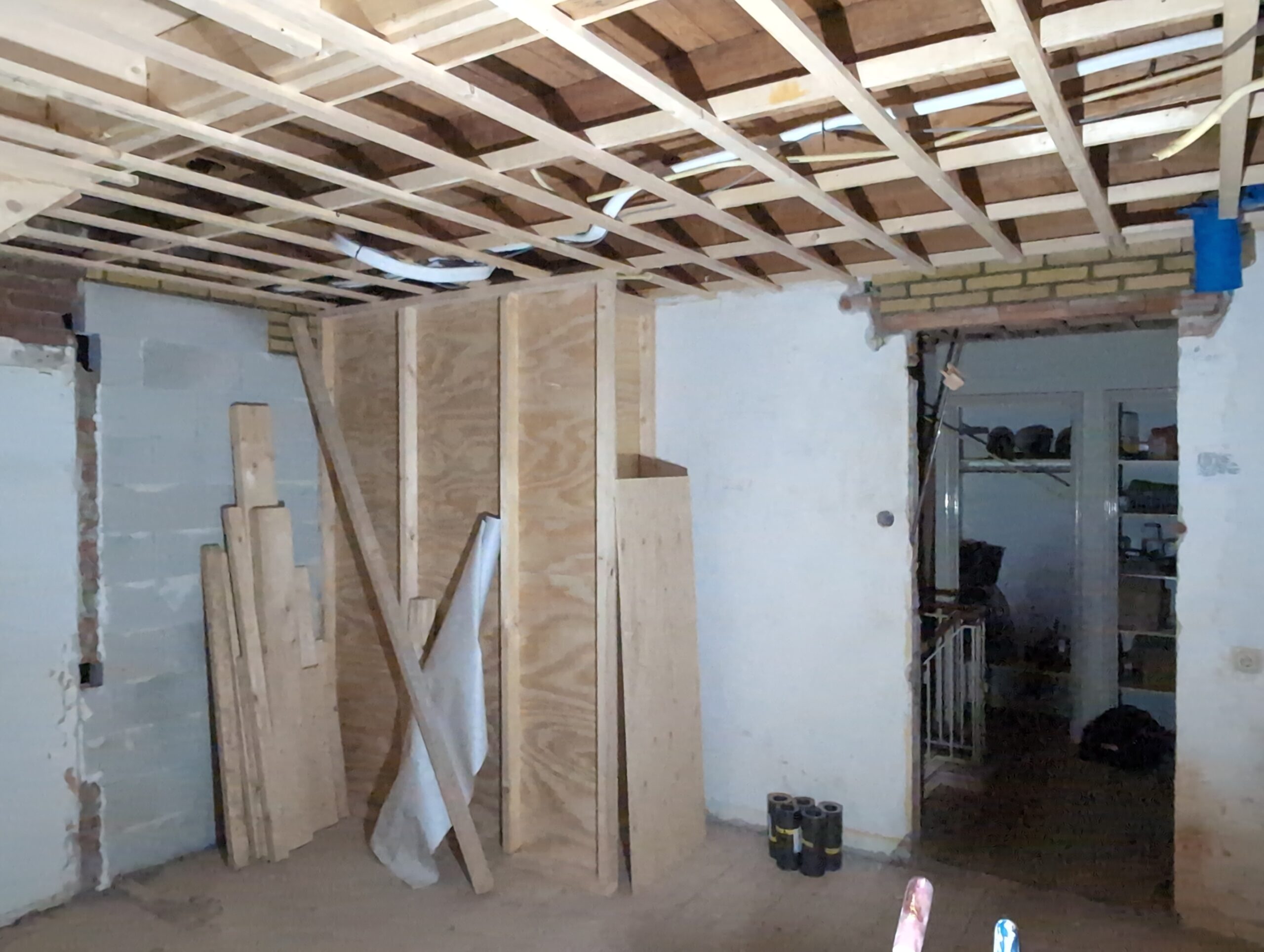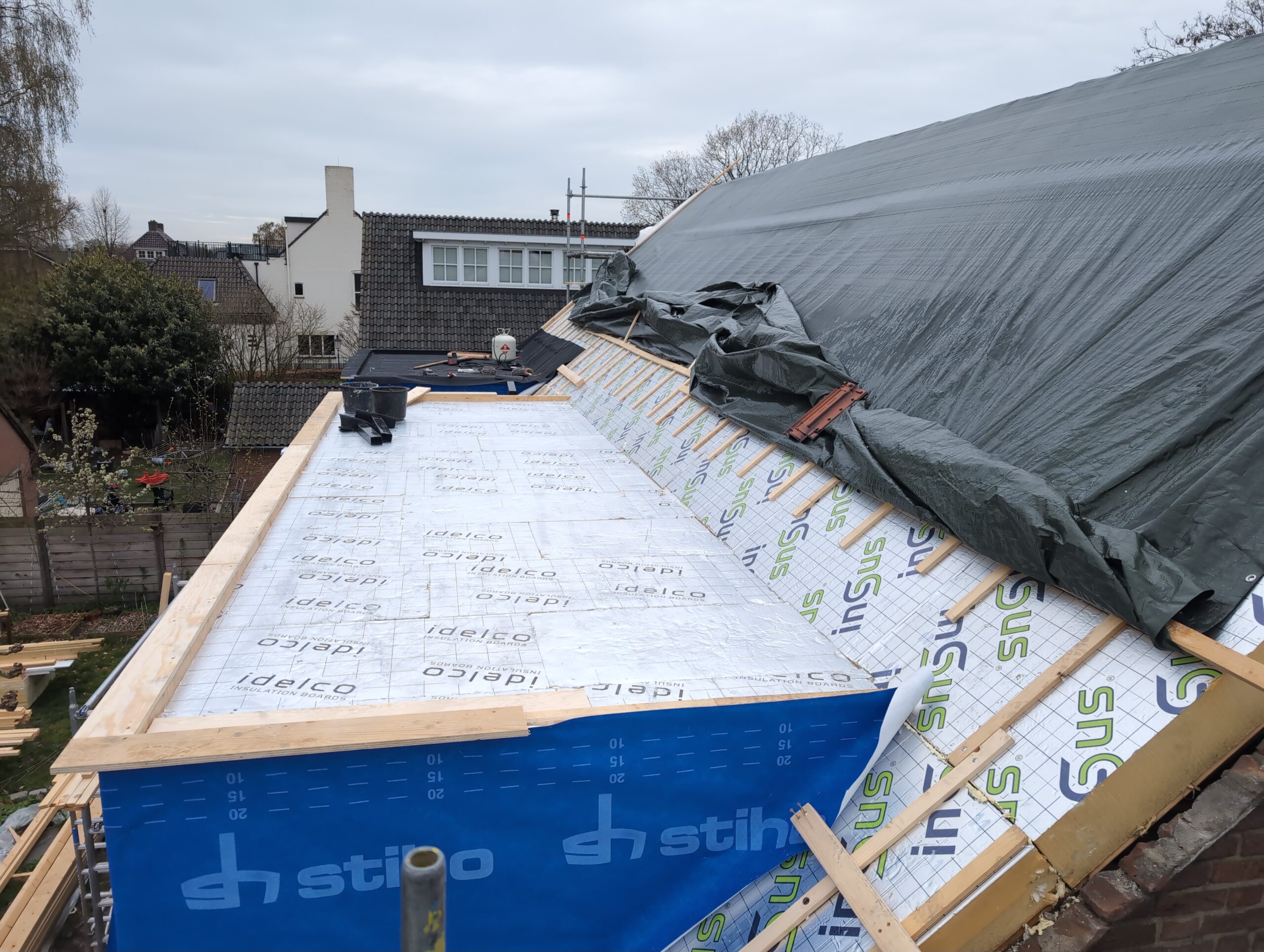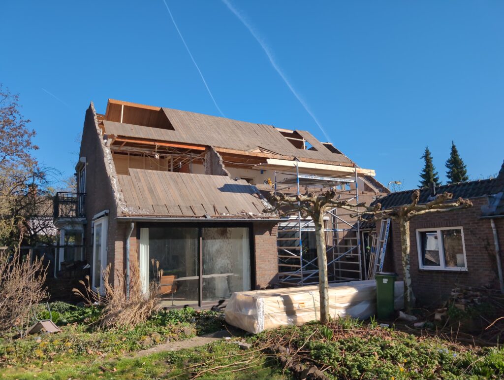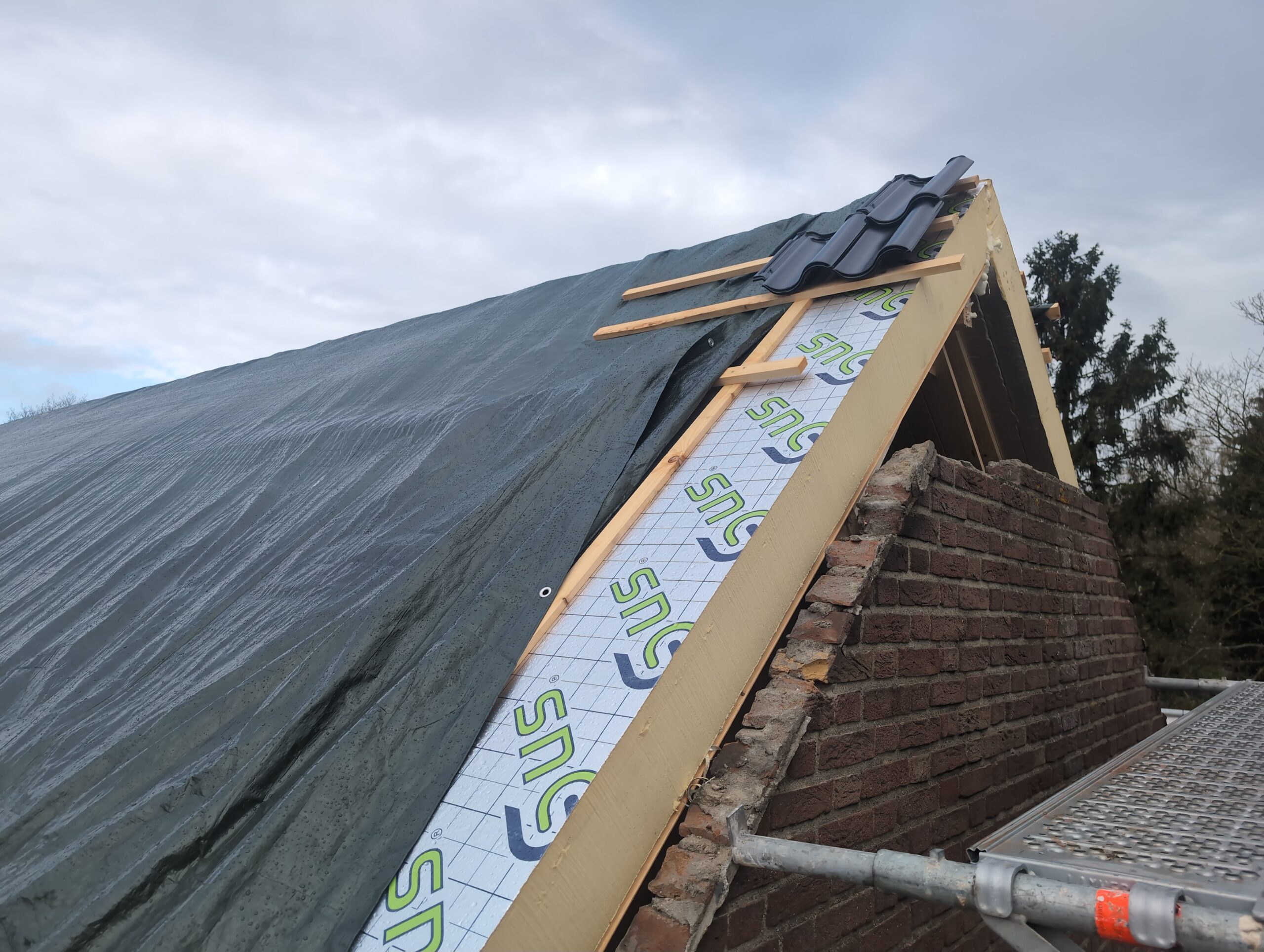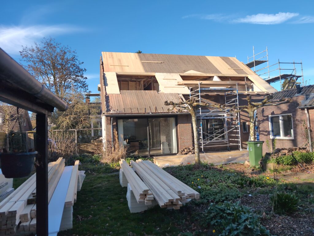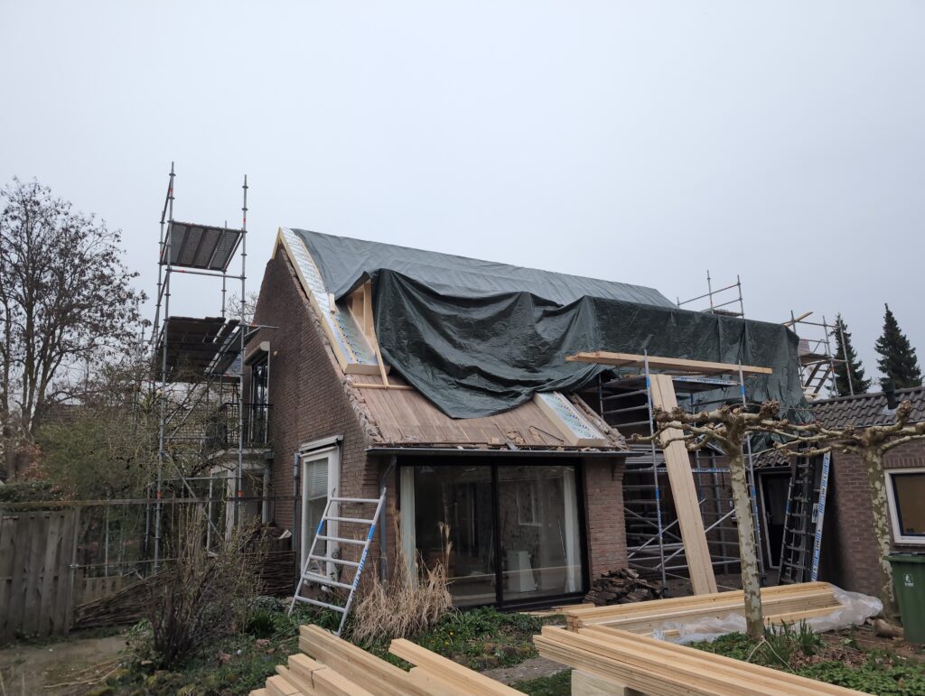 Gelukkig was er al vrij snel niets meer van het water te zien, ook beneden niet (anders dan wat lichte sporen in het plafond). Daarnaast is er van alles gebeurd: Er is een beter zeil gespannen over het dak, een kant van de zolder is dichtgemetseld, de eerste waterleidingen zijn aangelegd (wasmachine naar badkamer, rioolontluchting naar zolder). Maar ook het dak is verder afgewerkt waarbij er nog wat bussen PUR in alle kieren gespoten zijn, die daarna afgeplakt zijn met tape.