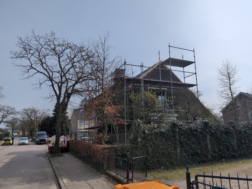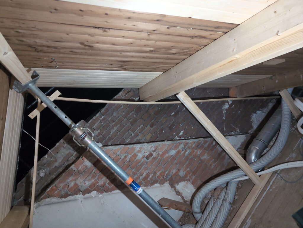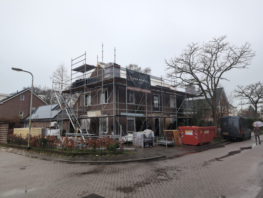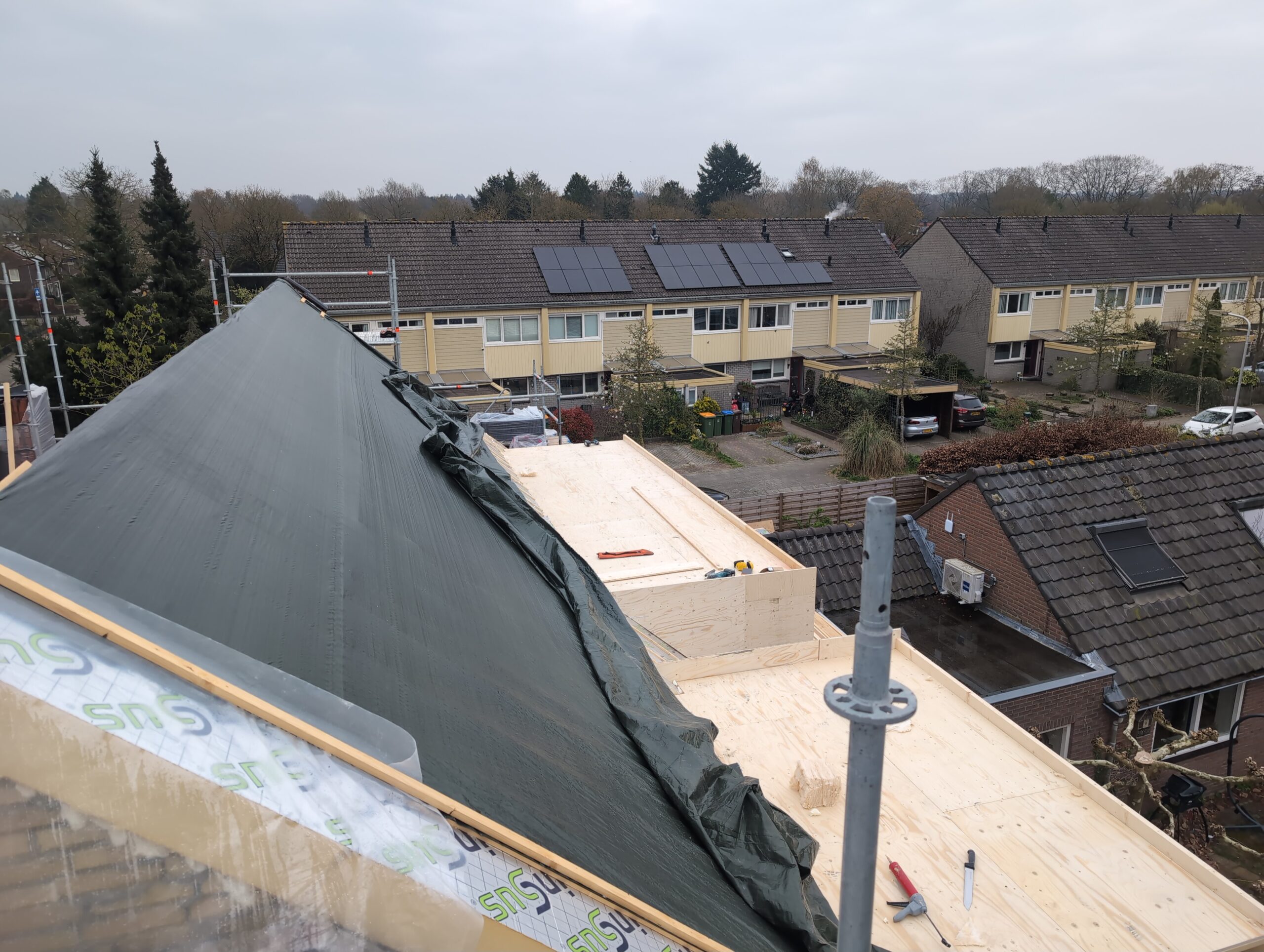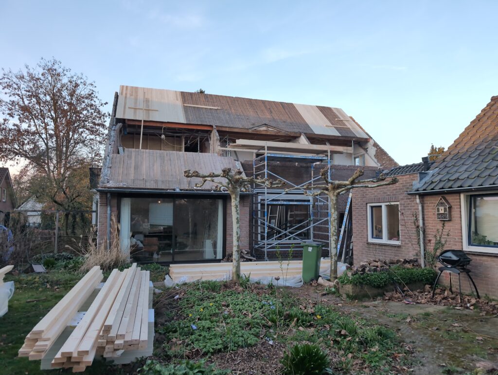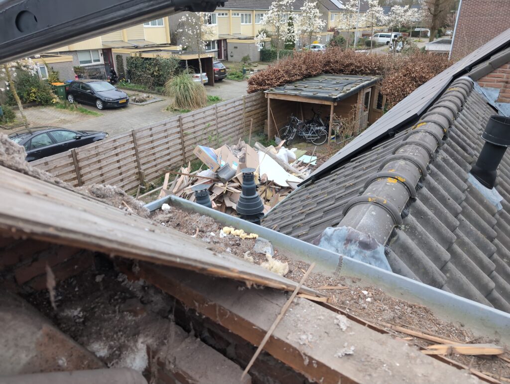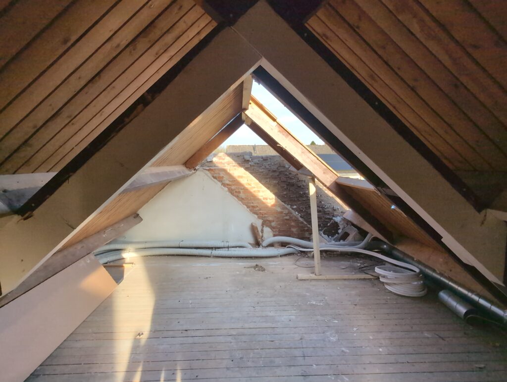 Gelukkig was er al vrij snel niets meer van het water te zien, ook beneden niet (anders dan wat lichte sporen in het plafond). Daarnaast is er van alles gebeurd: Er is een beter zeil gespannen over het dak, een kant van de zolder is dichtgemetseld, de eerste waterleidingen zijn aangelegd (wasmachine naar badkamer, rioolontluchting naar zolder). Maar ook het dak is verder afgewerkt waarbij er nog wat bussen PUR in alle kieren gespoten zijn, die daarna afgeplakt zijn met tape.