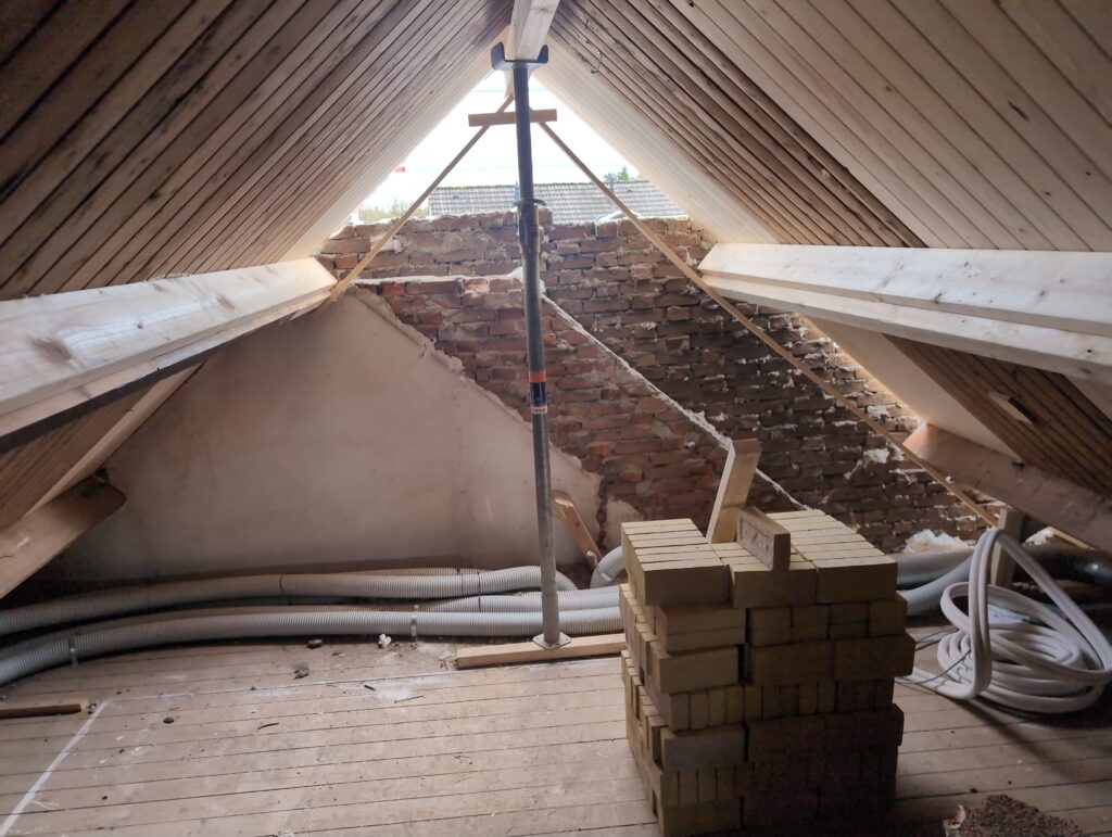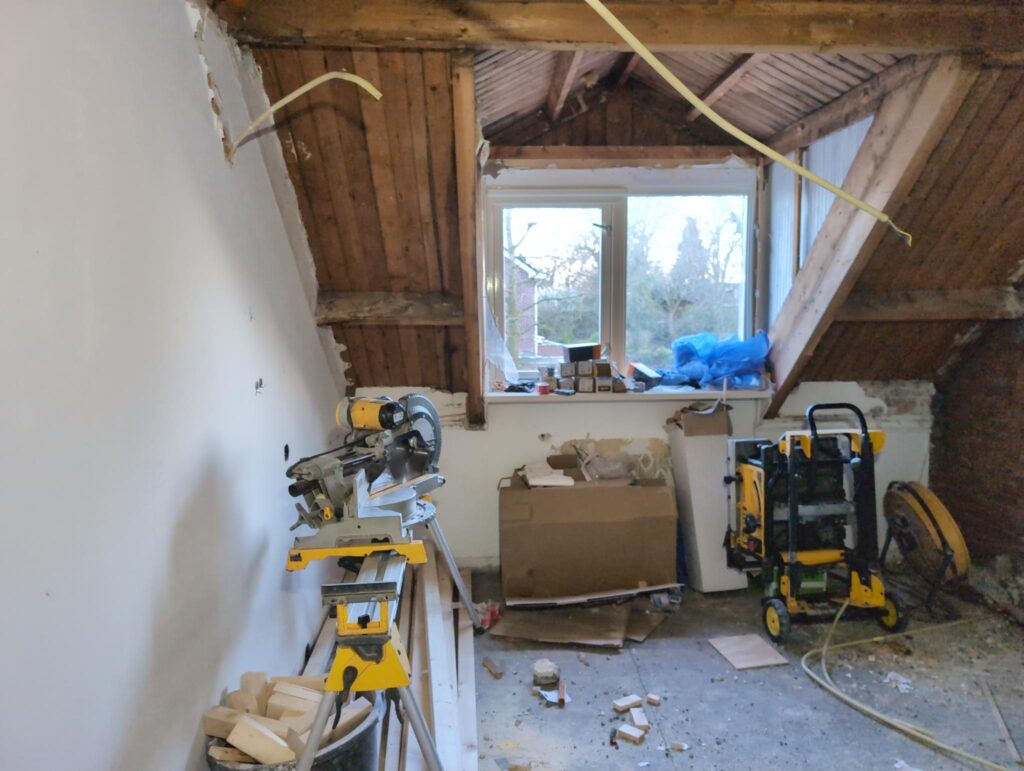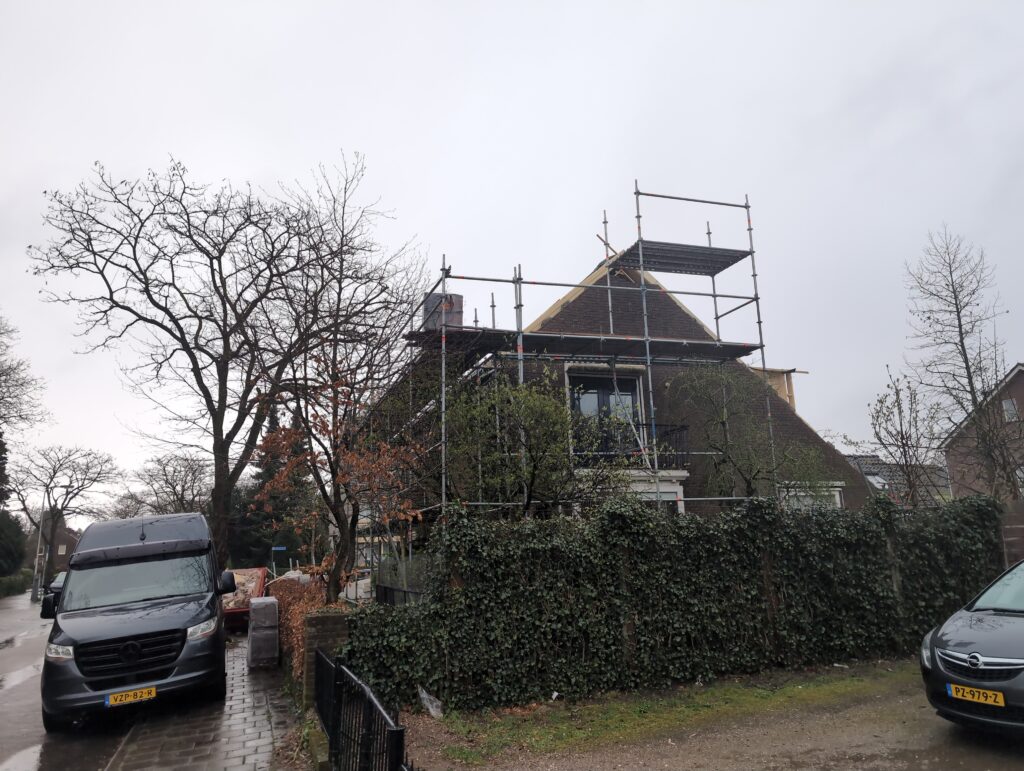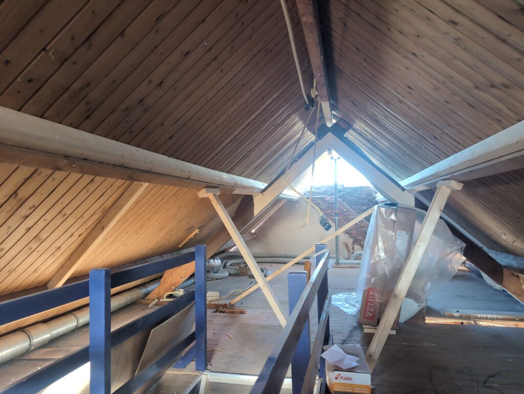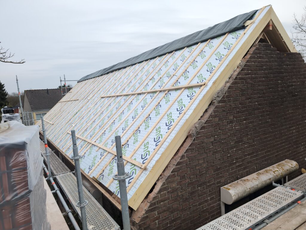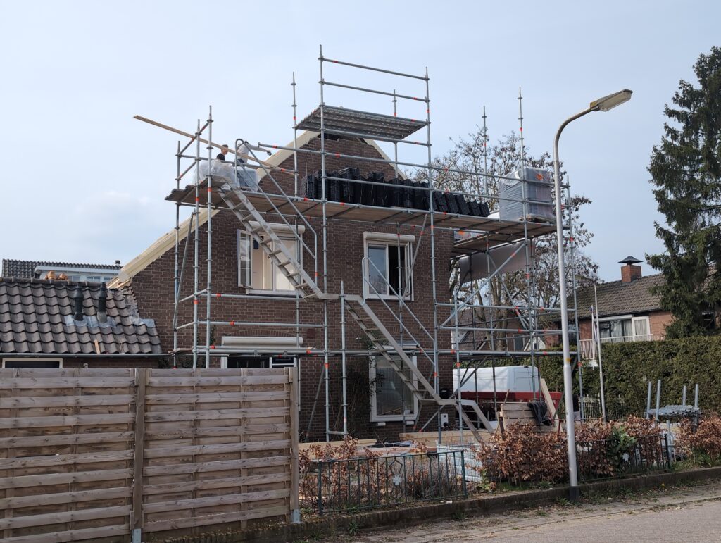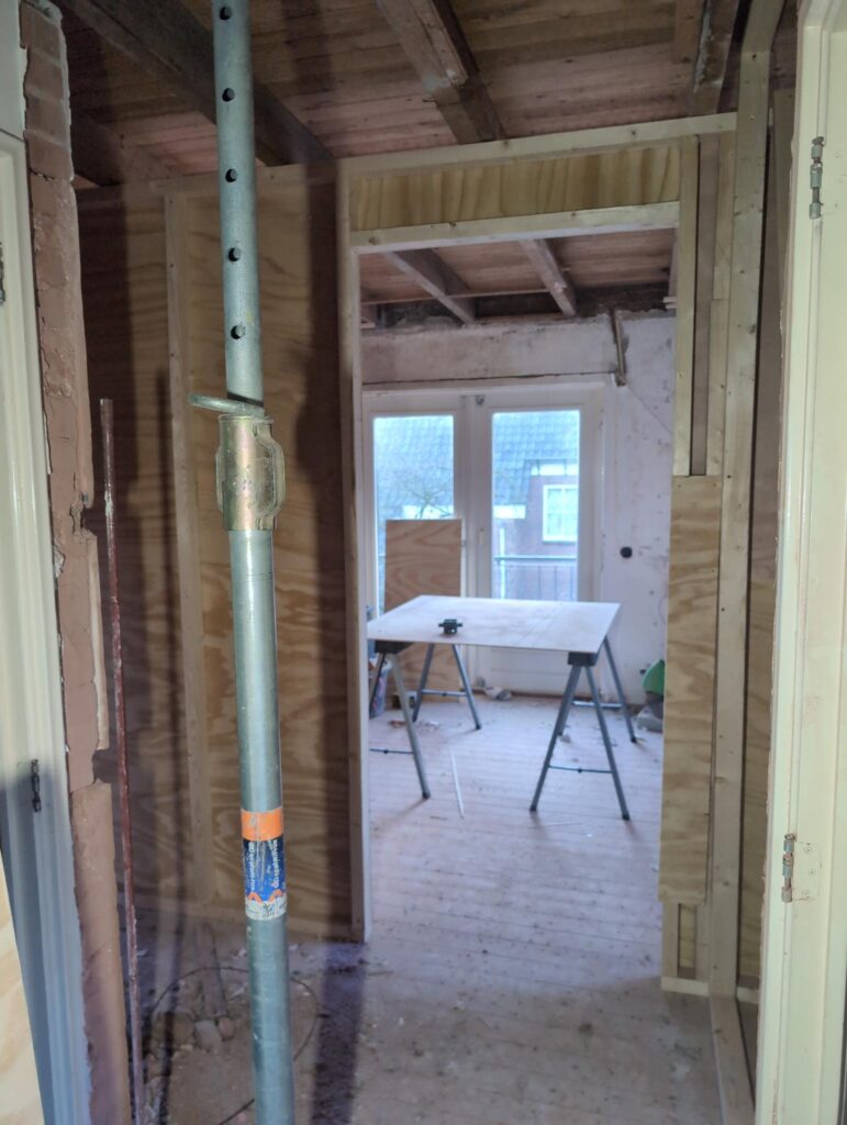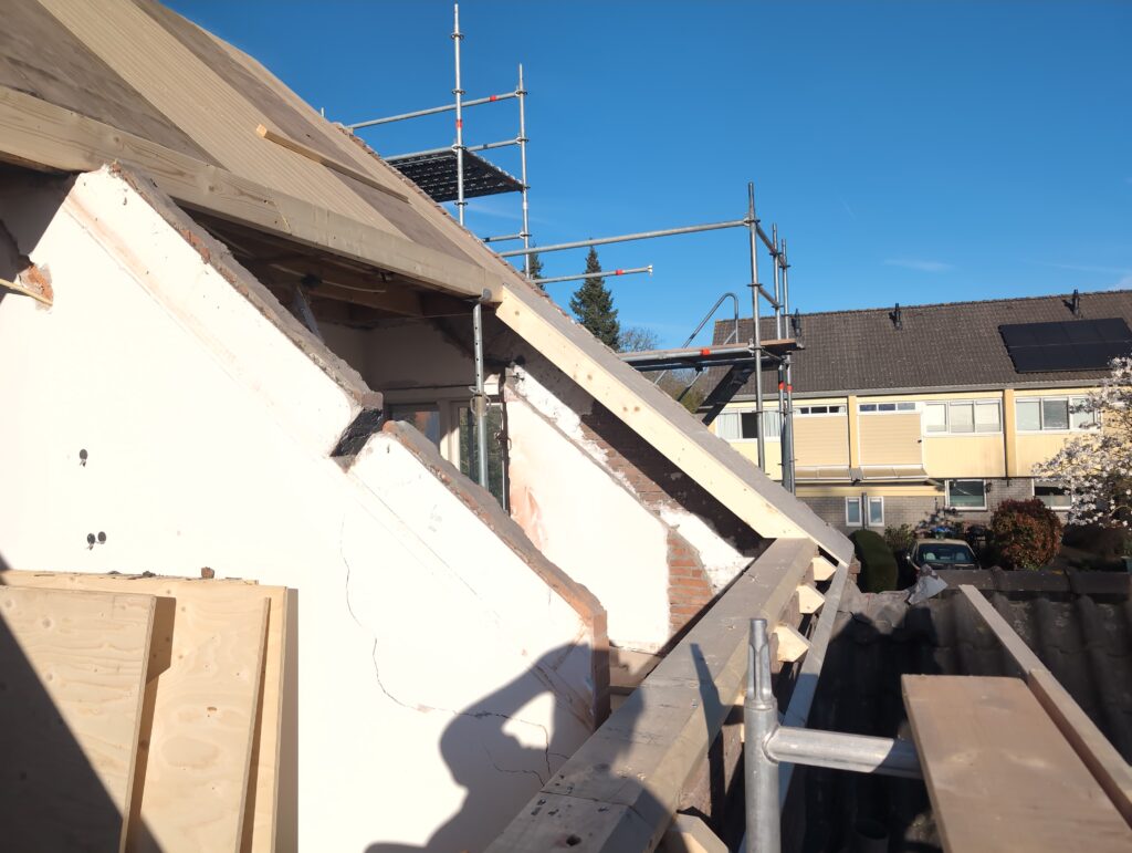 Gelukkig was er al vrij snel niets meer van het water te zien, ook beneden niet (anders dan wat lichte sporen in het plafond). Daarnaast is er van alles gebeurd: Er is een beter zeil gespannen over het dak, een kant van de zolder is dichtgemetseld, de eerste waterleidingen zijn aangelegd (wasmachine naar badkamer, rioolontluchting naar zolder). Maar ook het dak is verder afgewerkt waarbij er nog wat bussen PUR in alle kieren gespoten zijn, die daarna afgeplakt zijn met tape.