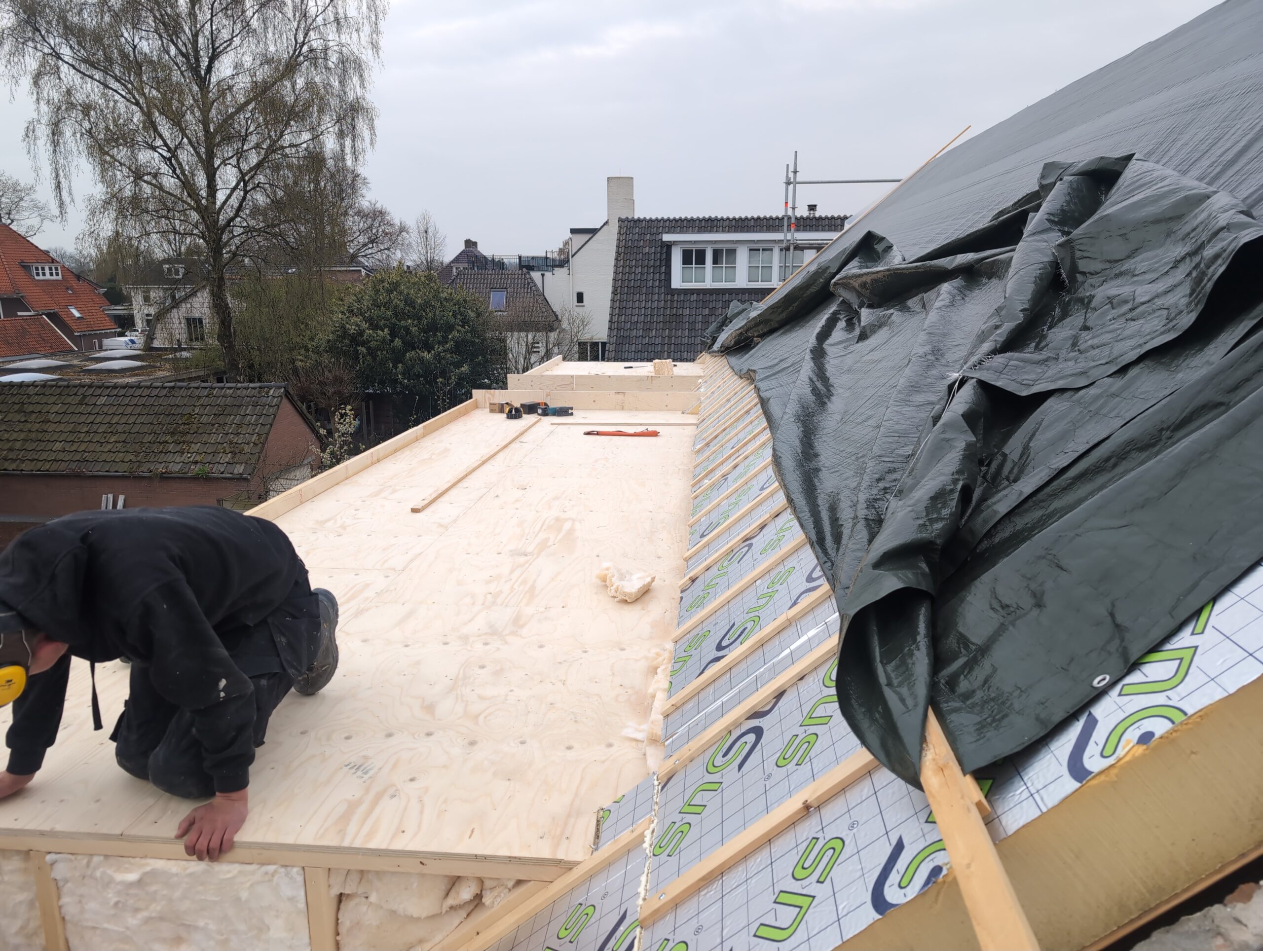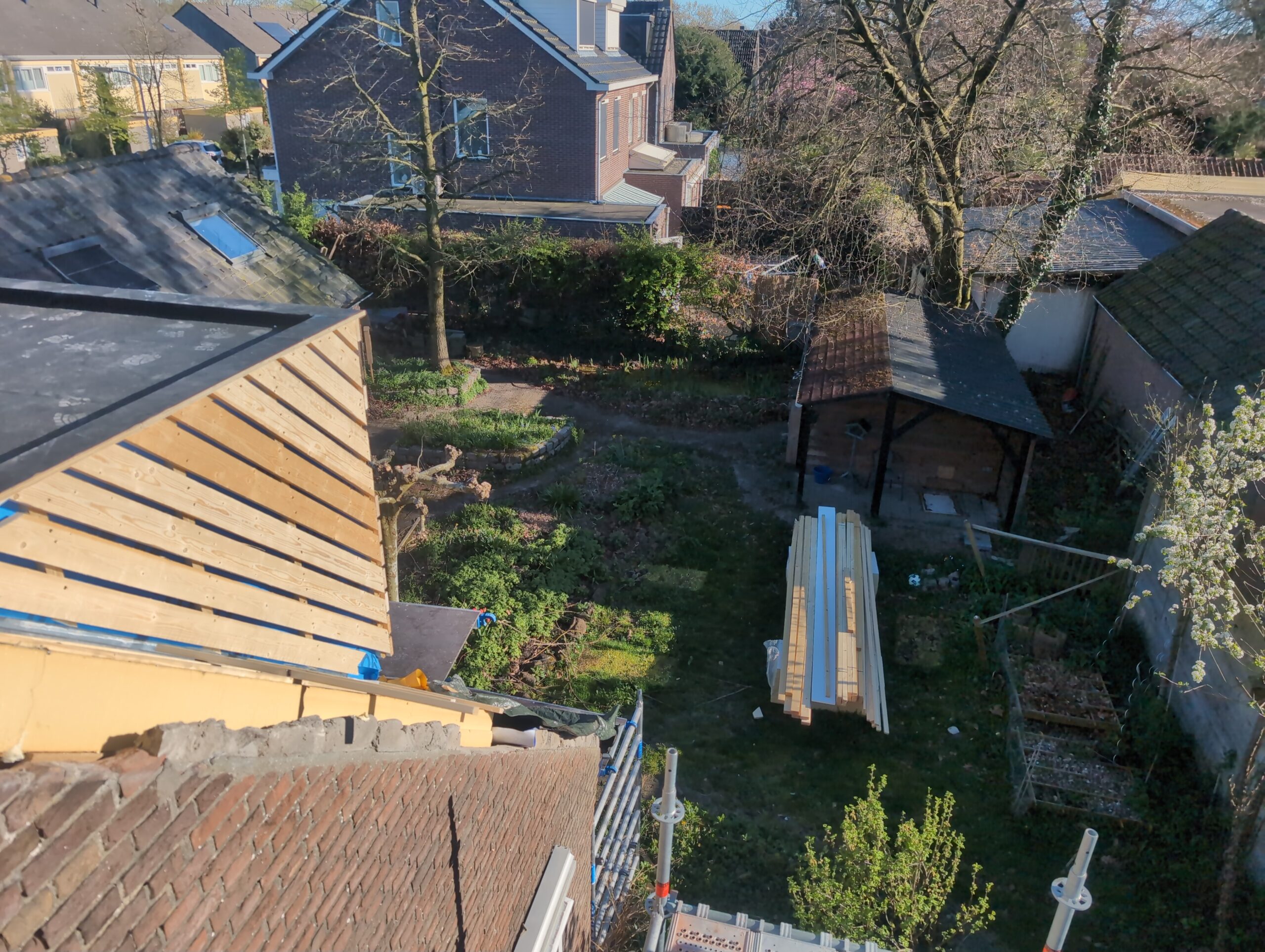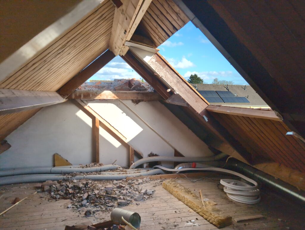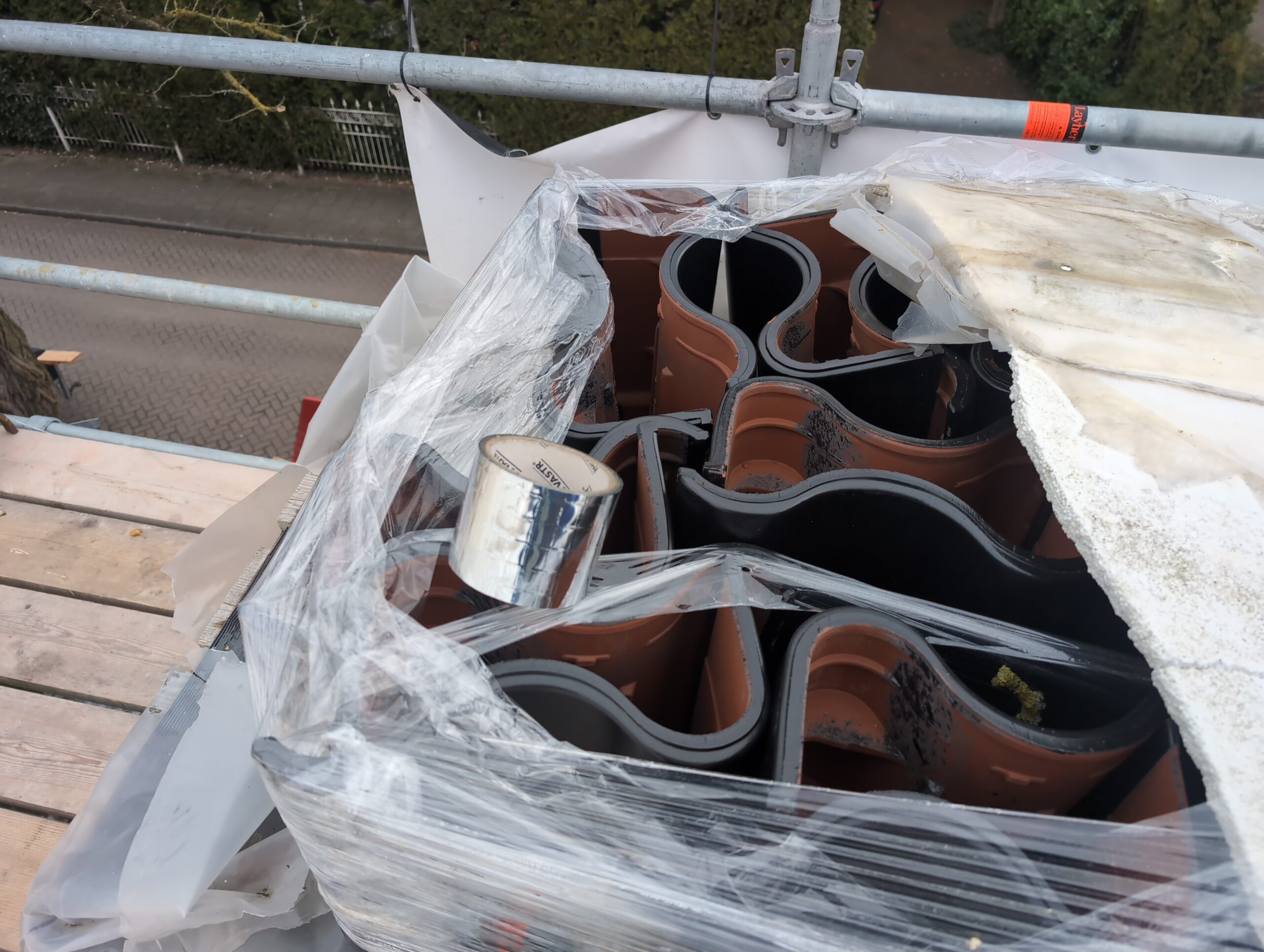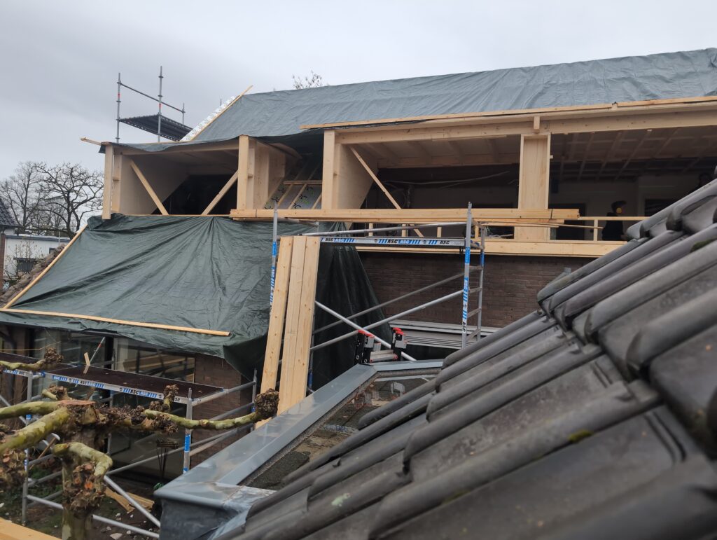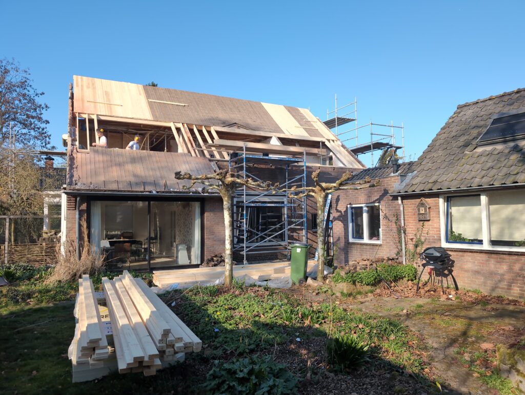 Gelukkig was er al vrij snel niets meer van het water te zien, ook beneden niet (anders dan wat lichte sporen in het plafond). Daarnaast is er van alles gebeurd: Er is een beter zeil gespannen over het dak, een kant van de zolder is dichtgemetseld, de eerste waterleidingen zijn aangelegd (wasmachine naar badkamer, rioolontluchting naar zolder). Maar ook het dak is verder afgewerkt waarbij er nog wat bussen PUR in alle kieren gespoten zijn, die daarna afgeplakt zijn met tape.