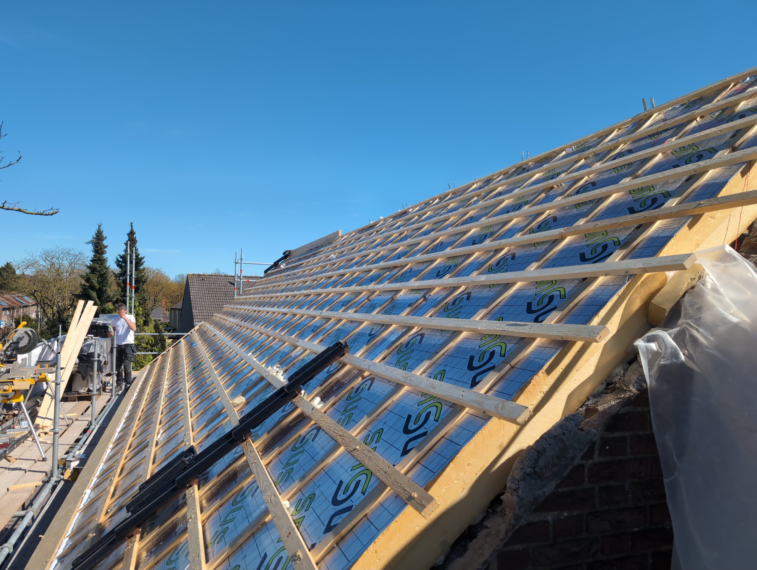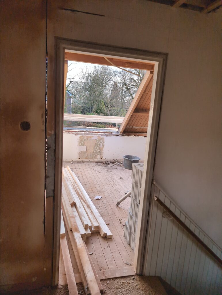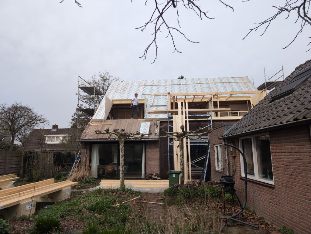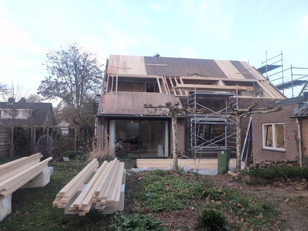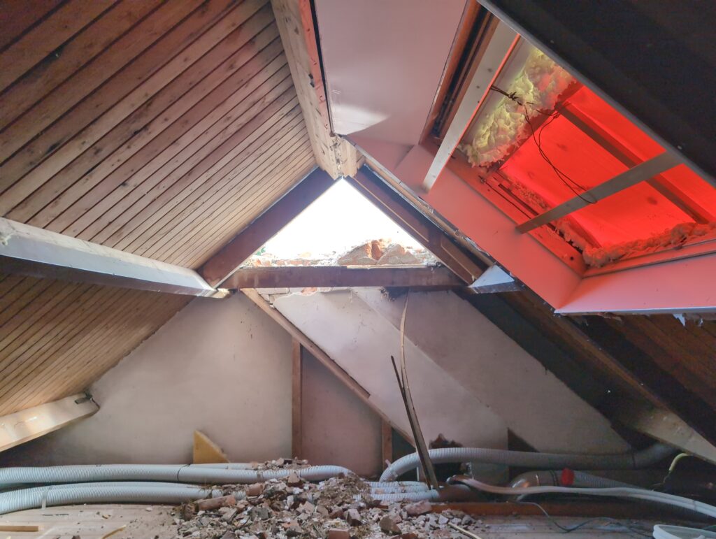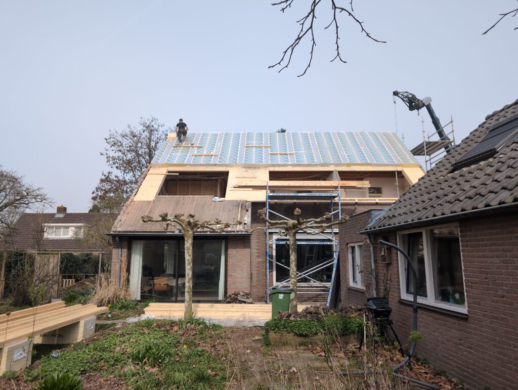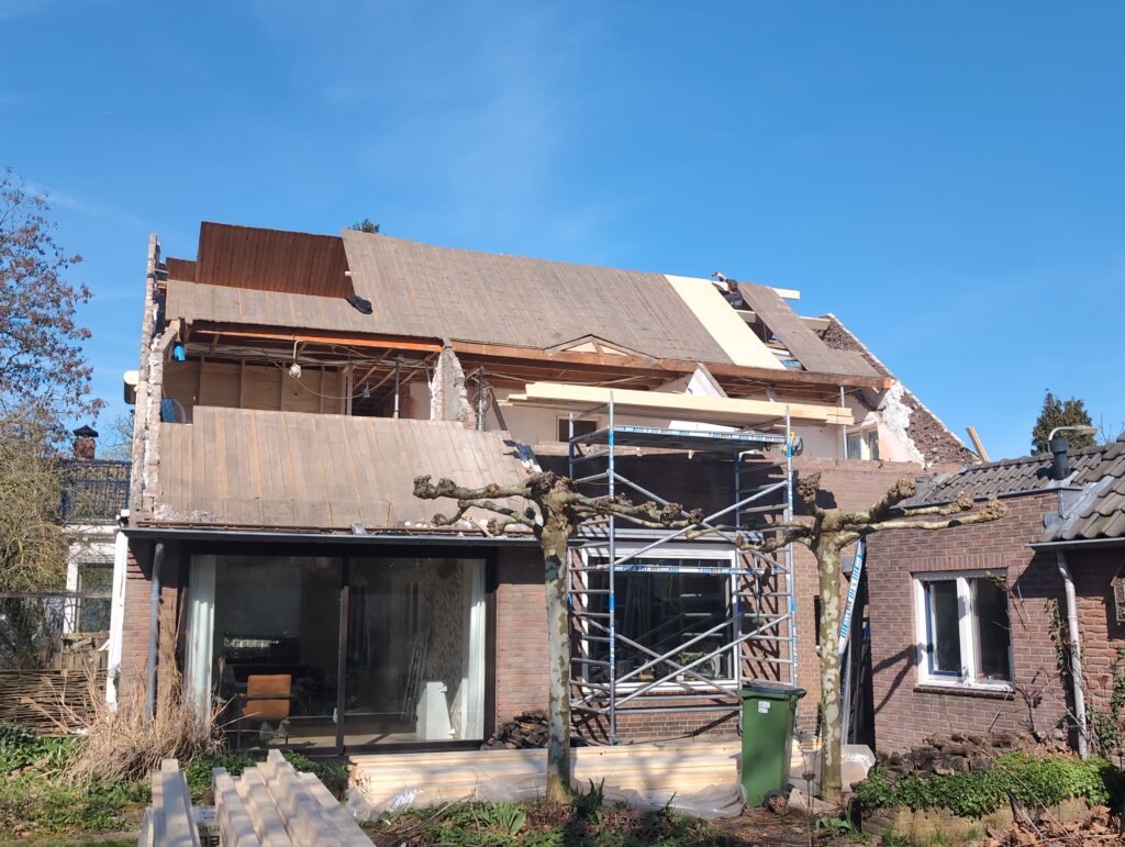 Gelukkig was er al vrij snel niets meer van het water te zien, ook beneden niet (anders dan wat lichte sporen in het plafond). Daarnaast is er van alles gebeurd: Er is een beter zeil gespannen over het dak, een kant van de zolder is dichtgemetseld, de eerste waterleidingen zijn aangelegd (wasmachine naar badkamer, rioolontluchting naar zolder). Maar ook het dak is verder afgewerkt waarbij er nog wat bussen PUR in alle kieren gespoten zijn, die daarna afgeplakt zijn met tape.