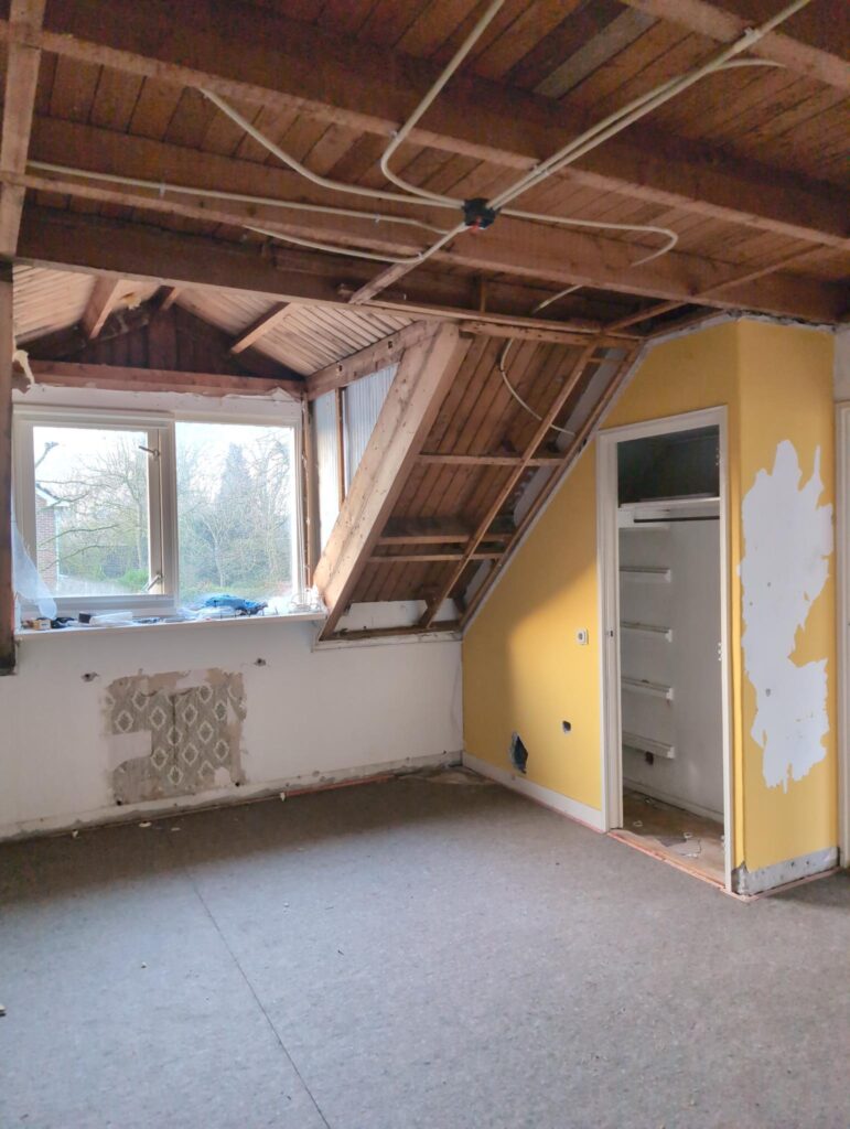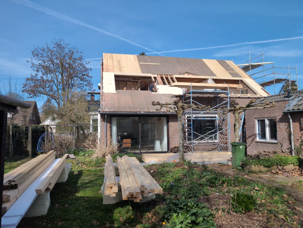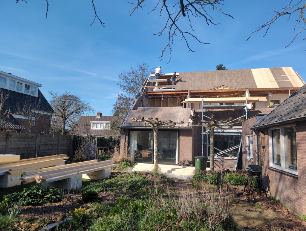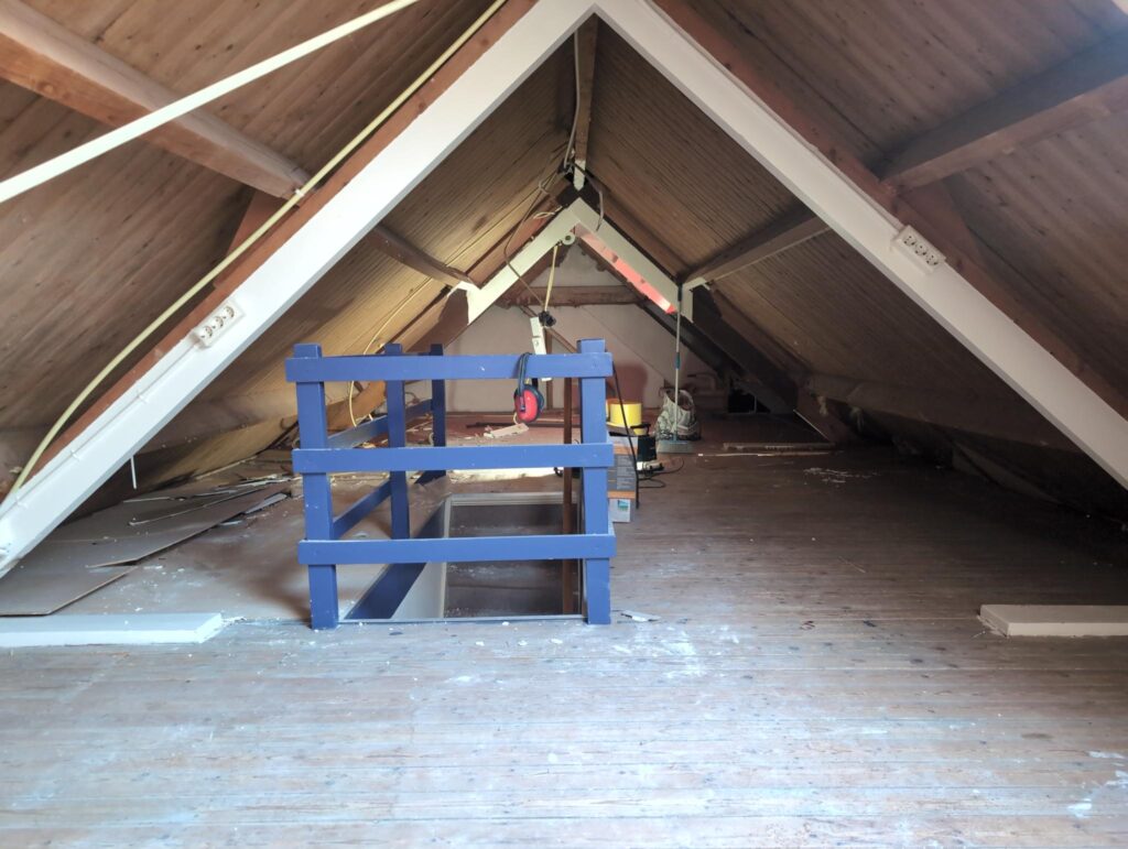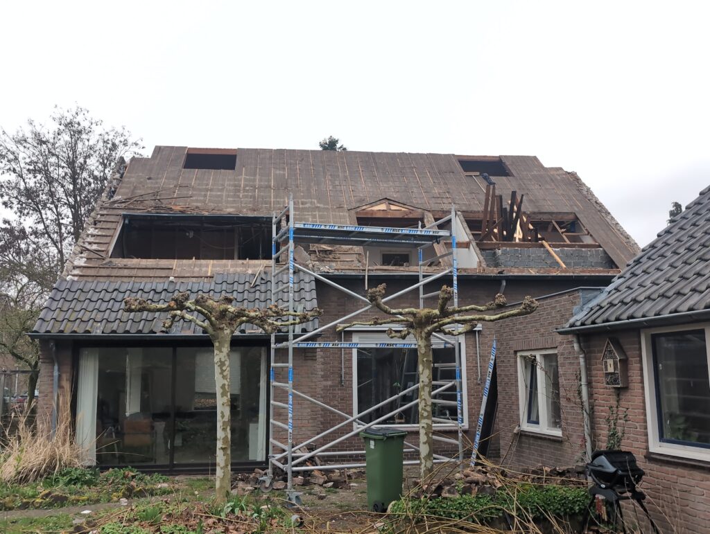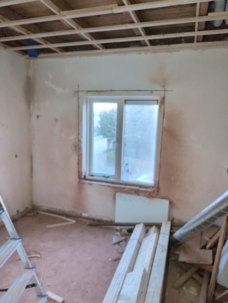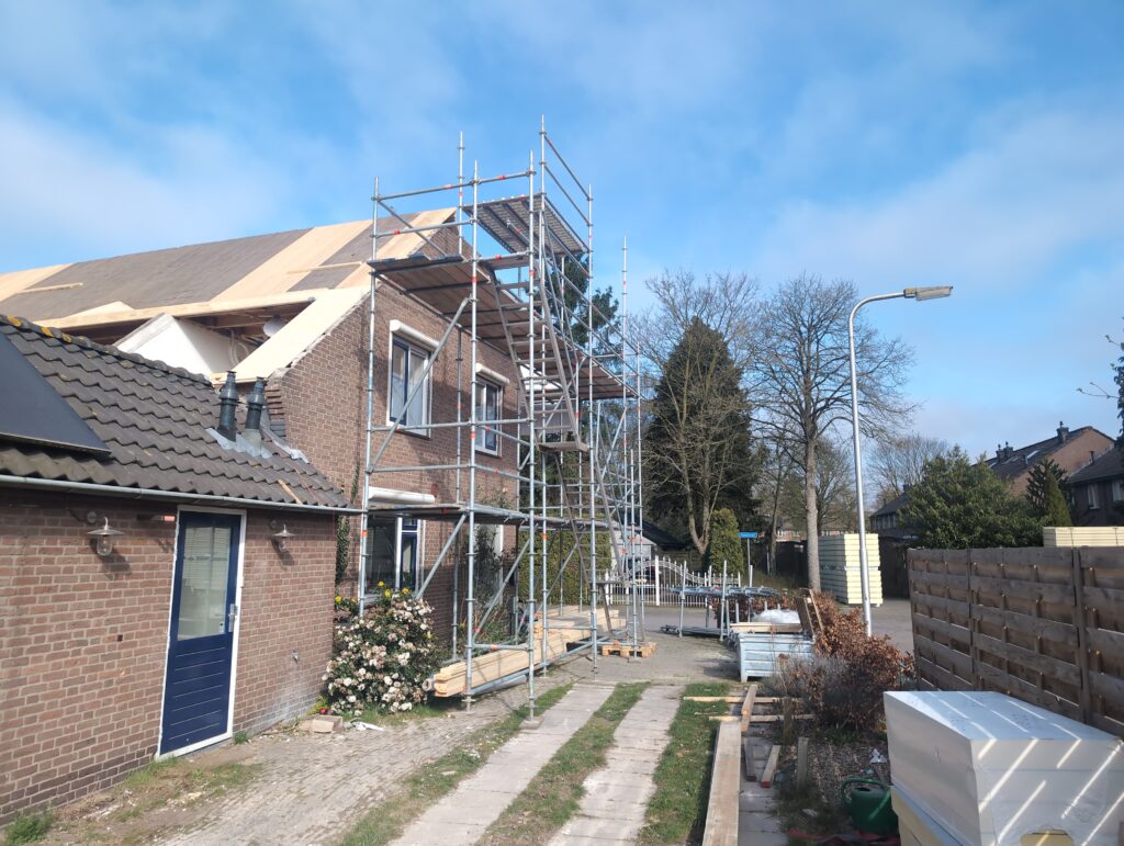 Gelukkig was er al vrij snel niets meer van het water te zien, ook beneden niet (anders dan wat lichte sporen in het plafond). Daarnaast is er van alles gebeurd: Er is een beter zeil gespannen over het dak, een kant van de zolder is dichtgemetseld, de eerste waterleidingen zijn aangelegd (wasmachine naar badkamer, rioolontluchting naar zolder). Maar ook het dak is verder afgewerkt waarbij er nog wat bussen PUR in alle kieren gespoten zijn, die daarna afgeplakt zijn met tape.