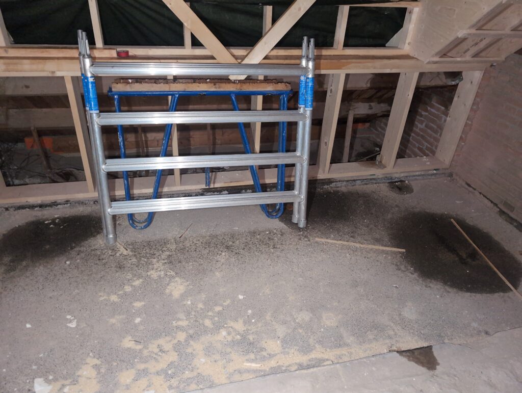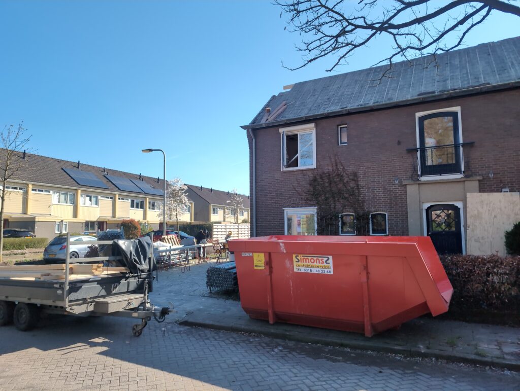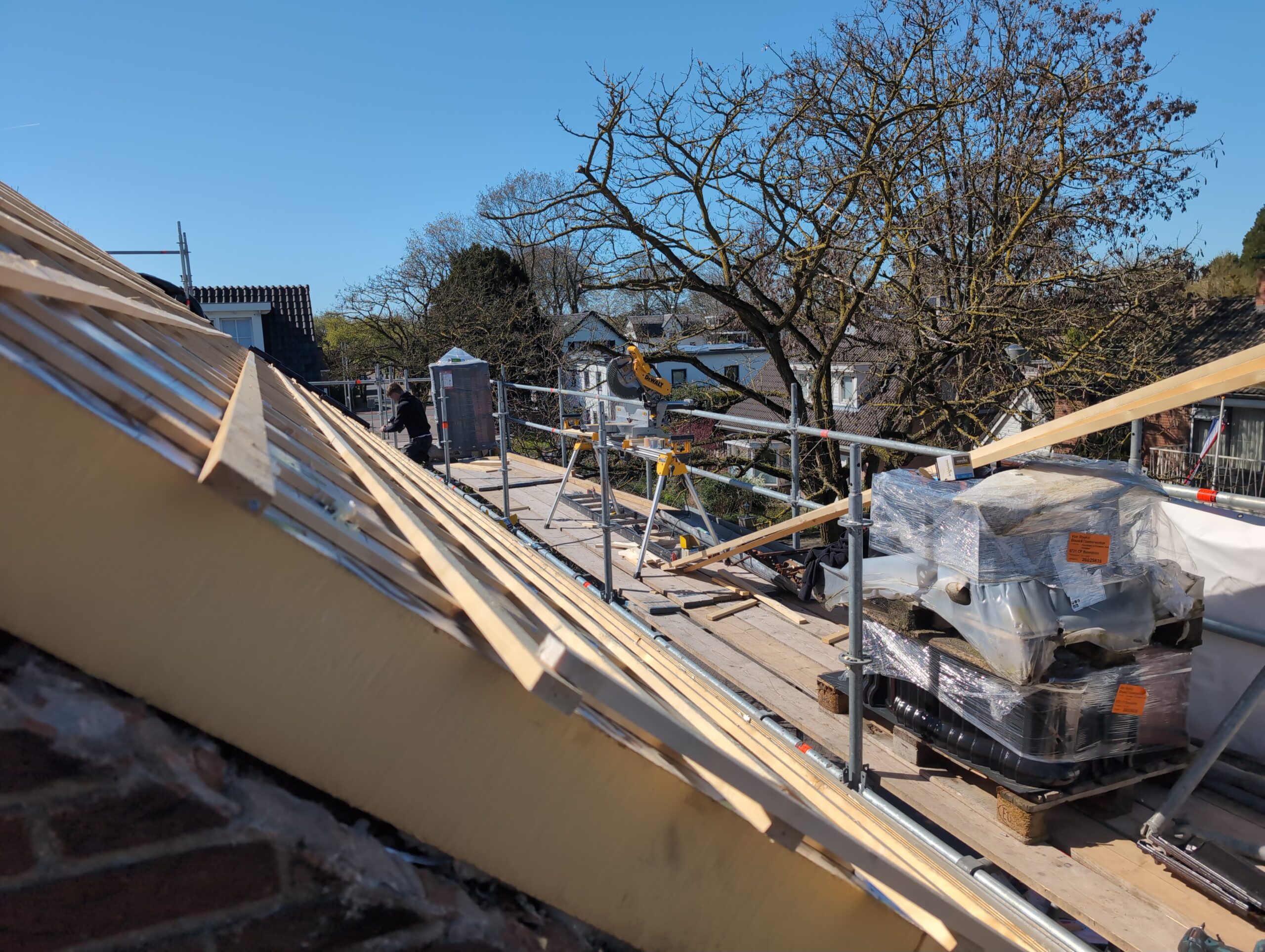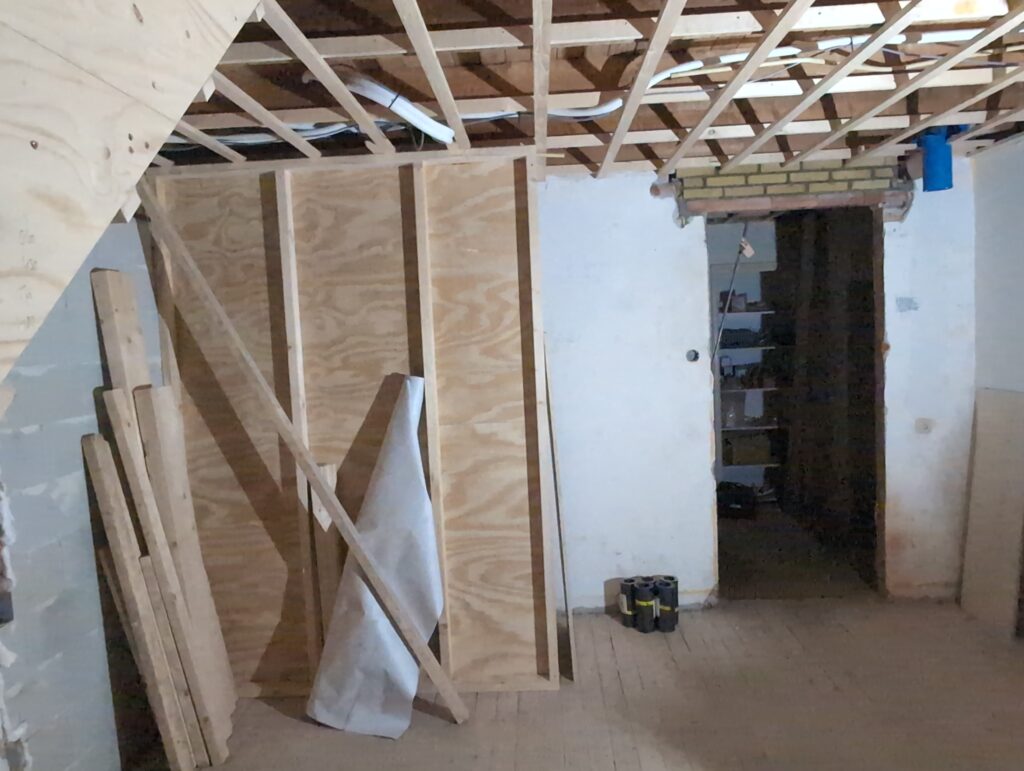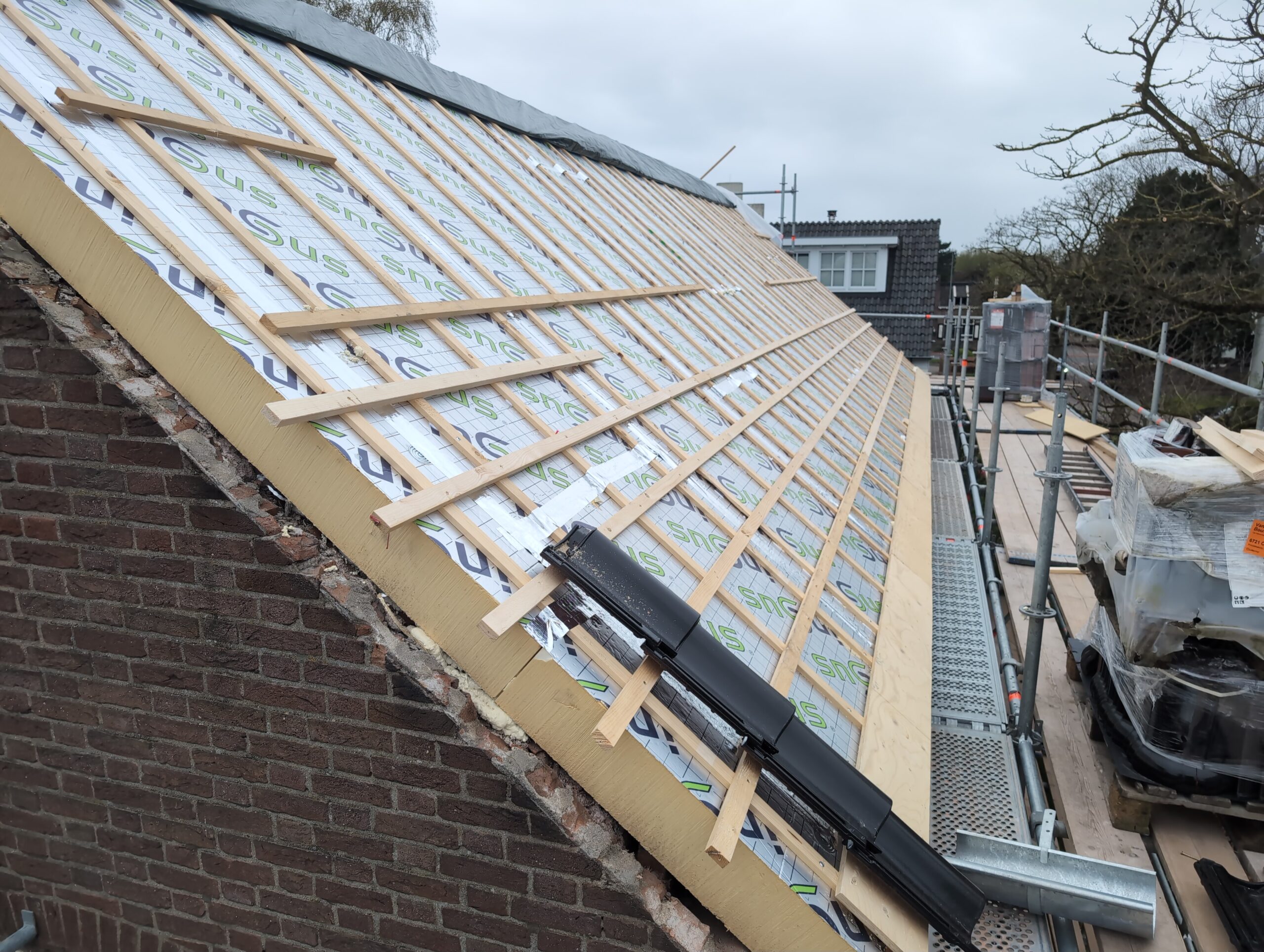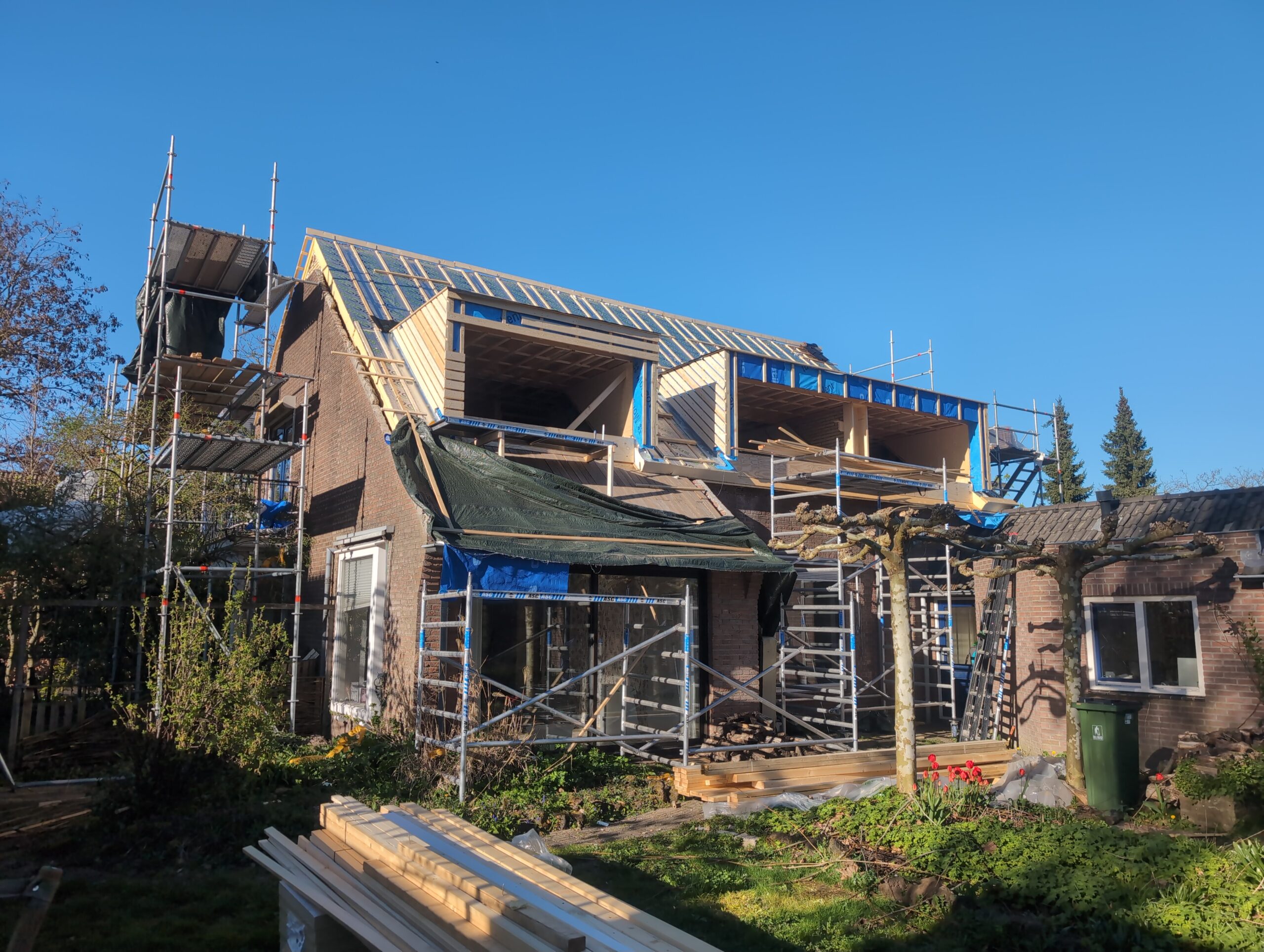 Gelukkig was er al vrij snel niets meer van het water te zien, ook beneden niet (anders dan wat lichte sporen in het plafond). Daarnaast is er van alles gebeurd: Er is een beter zeil gespannen over het dak, een kant van de zolder is dichtgemetseld, de eerste waterleidingen zijn aangelegd (wasmachine naar badkamer, rioolontluchting naar zolder). Maar ook het dak is verder afgewerkt waarbij er nog wat bussen PUR in alle kieren gespoten zijn, die daarna afgeplakt zijn met tape.