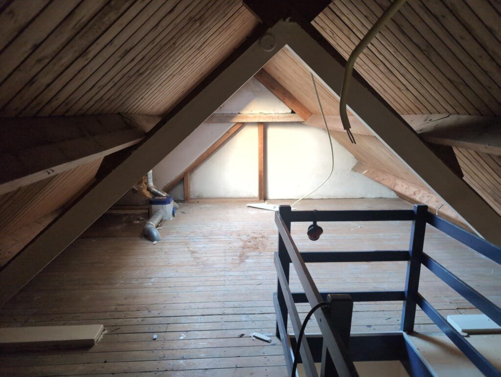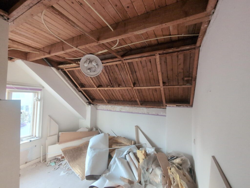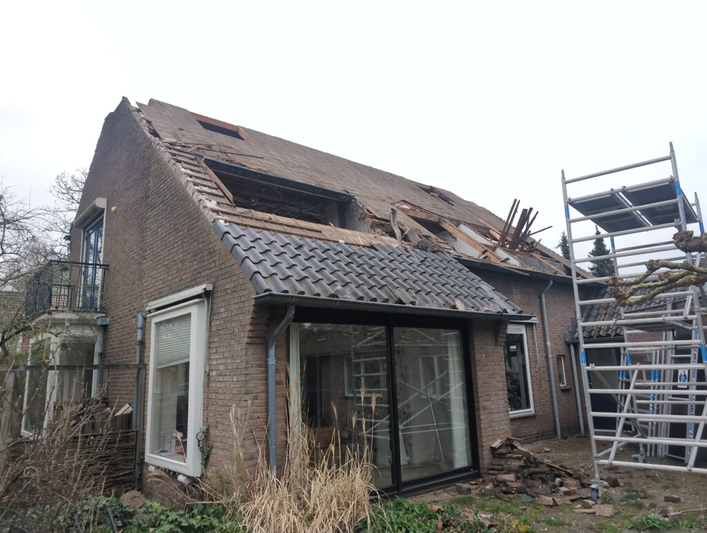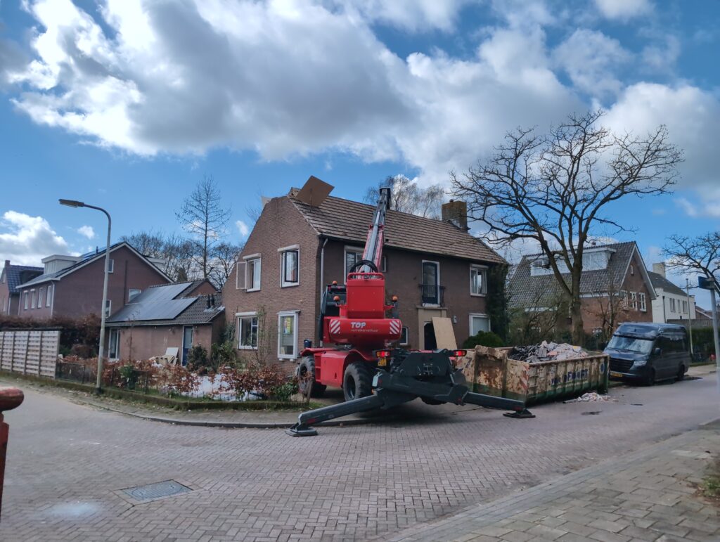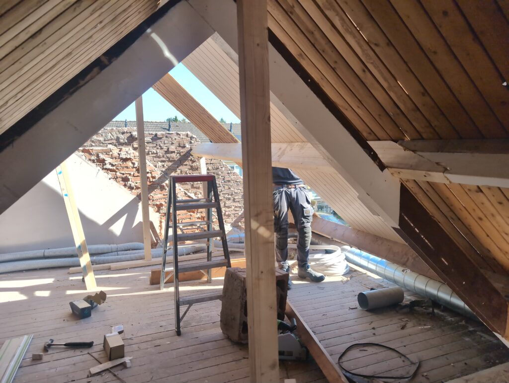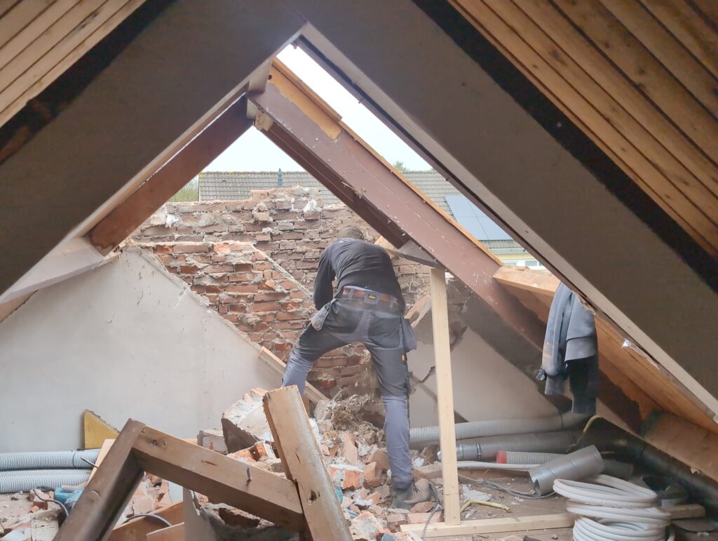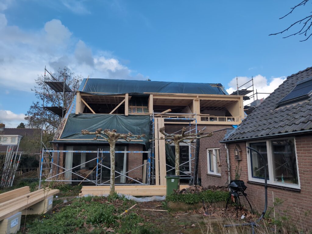 Gelukkig was er al vrij snel niets meer van het water te zien, ook beneden niet (anders dan wat lichte sporen in het plafond). Daarnaast is er van alles gebeurd: Er is een beter zeil gespannen over het dak, een kant van de zolder is dichtgemetseld, de eerste waterleidingen zijn aangelegd (wasmachine naar badkamer, rioolontluchting naar zolder). Maar ook het dak is verder afgewerkt waarbij er nog wat bussen PUR in alle kieren gespoten zijn, die daarna afgeplakt zijn met tape.