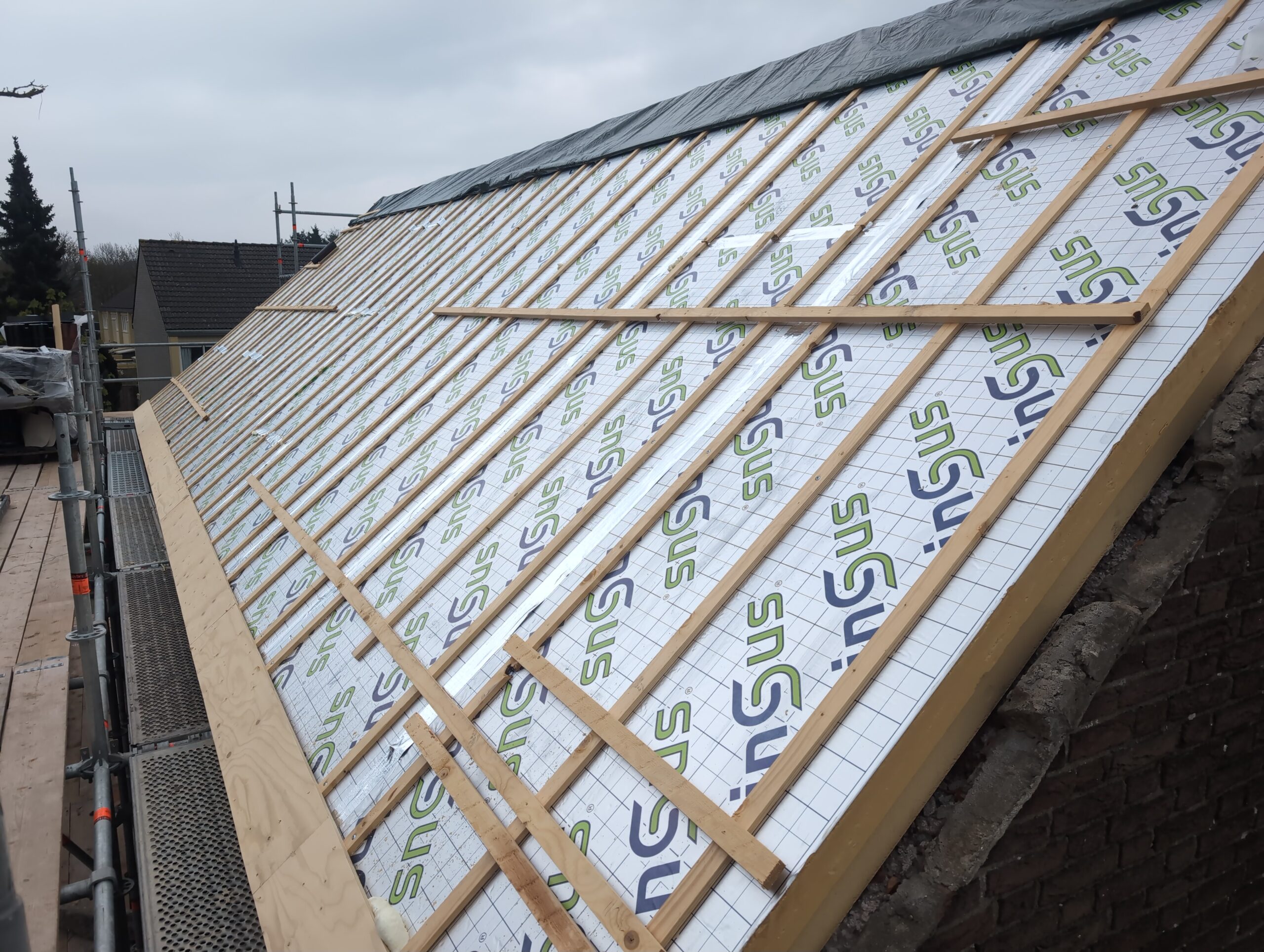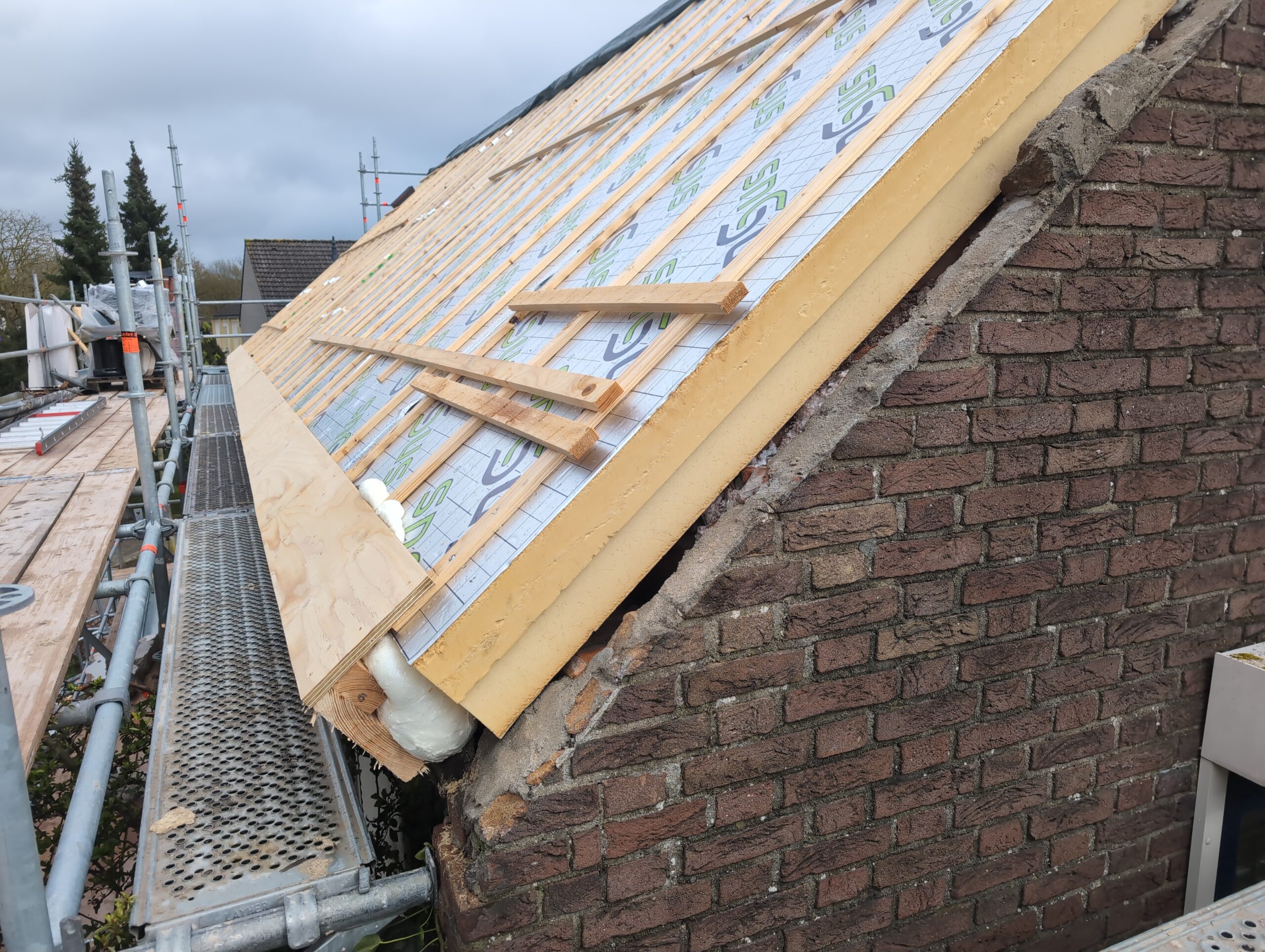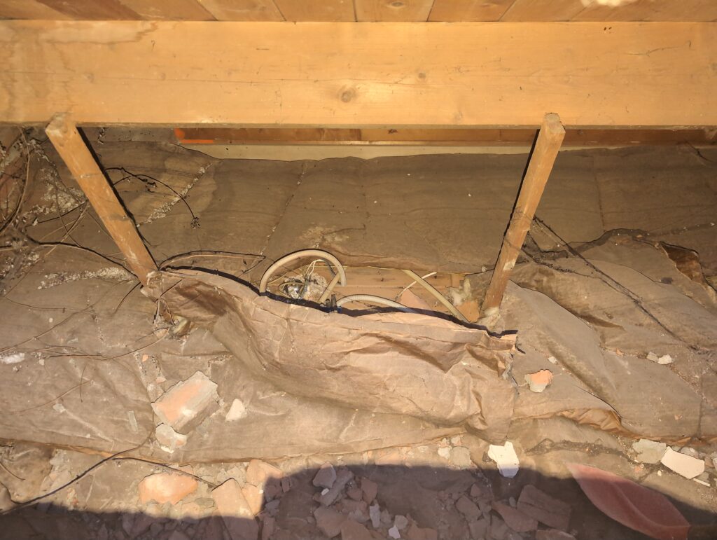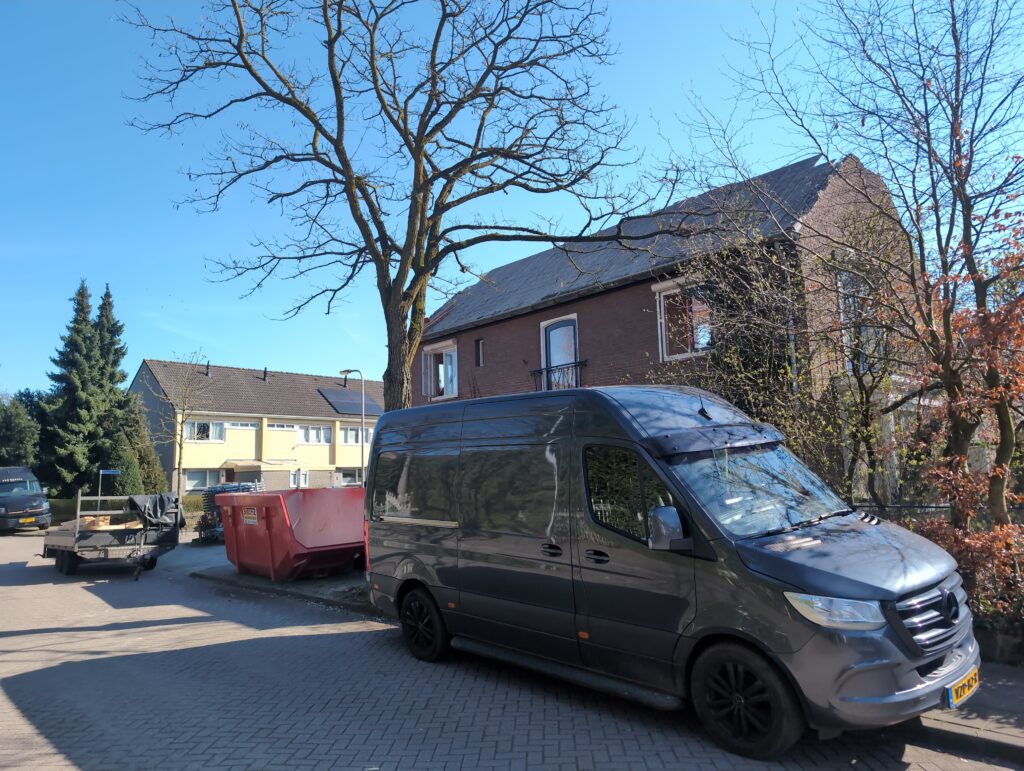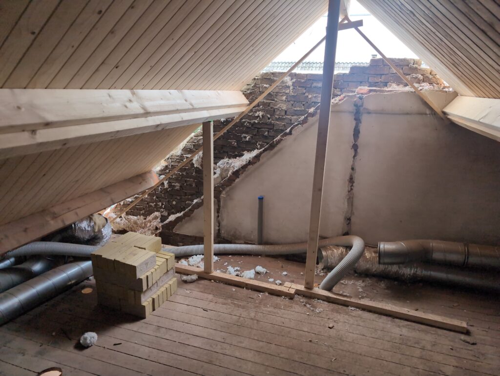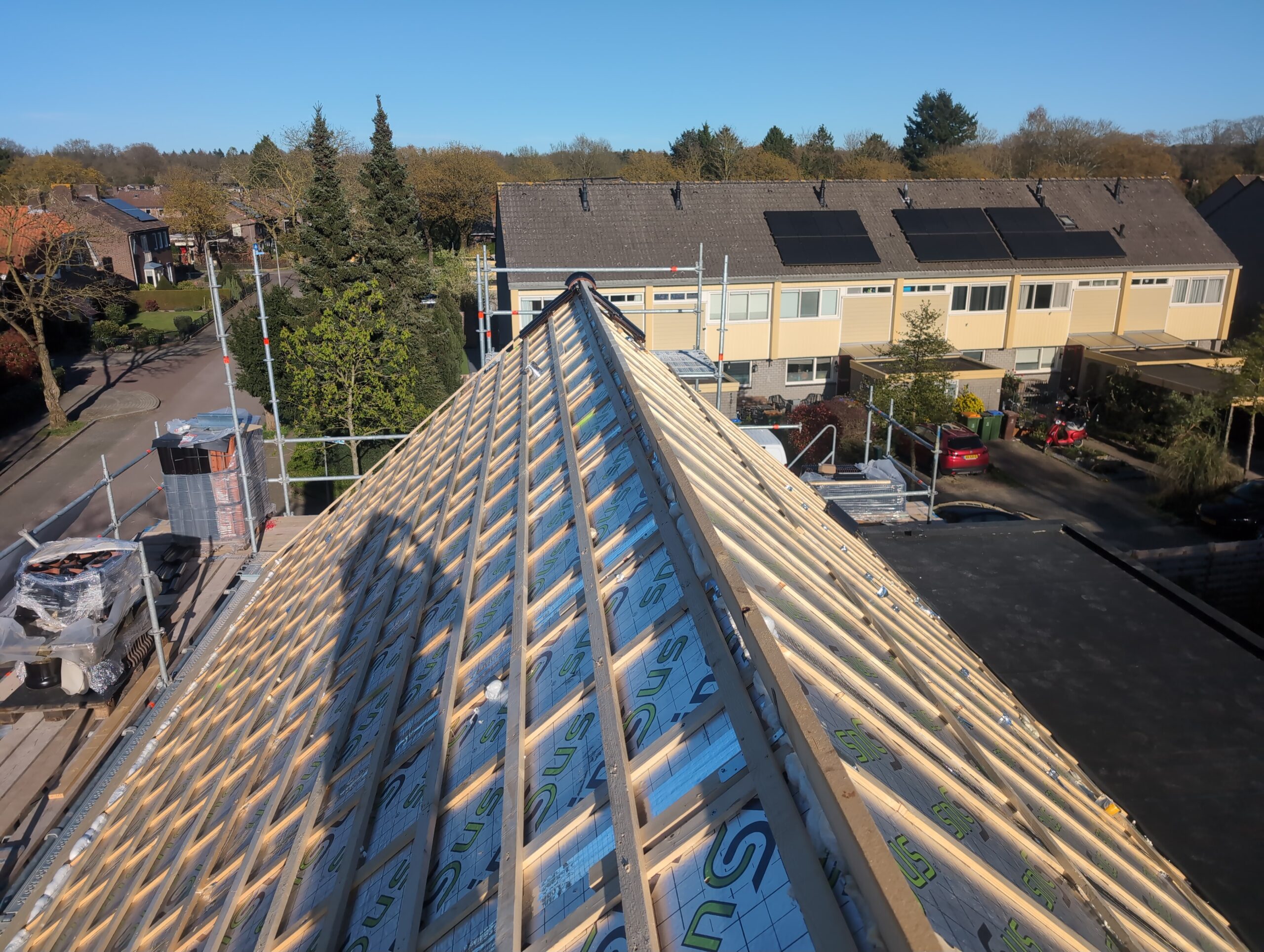 Gelukkig was er al vrij snel niets meer van het water te zien, ook beneden niet (anders dan wat lichte sporen in het plafond). Daarnaast is er van alles gebeurd: Er is een beter zeil gespannen over het dak, een kant van de zolder is dichtgemetseld, de eerste waterleidingen zijn aangelegd (wasmachine naar badkamer, rioolontluchting naar zolder). Maar ook het dak is verder afgewerkt waarbij er nog wat bussen PUR in alle kieren gespoten zijn, die daarna afgeplakt zijn met tape.