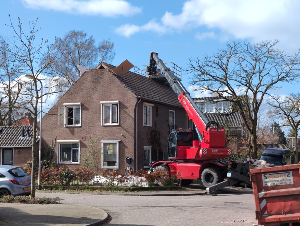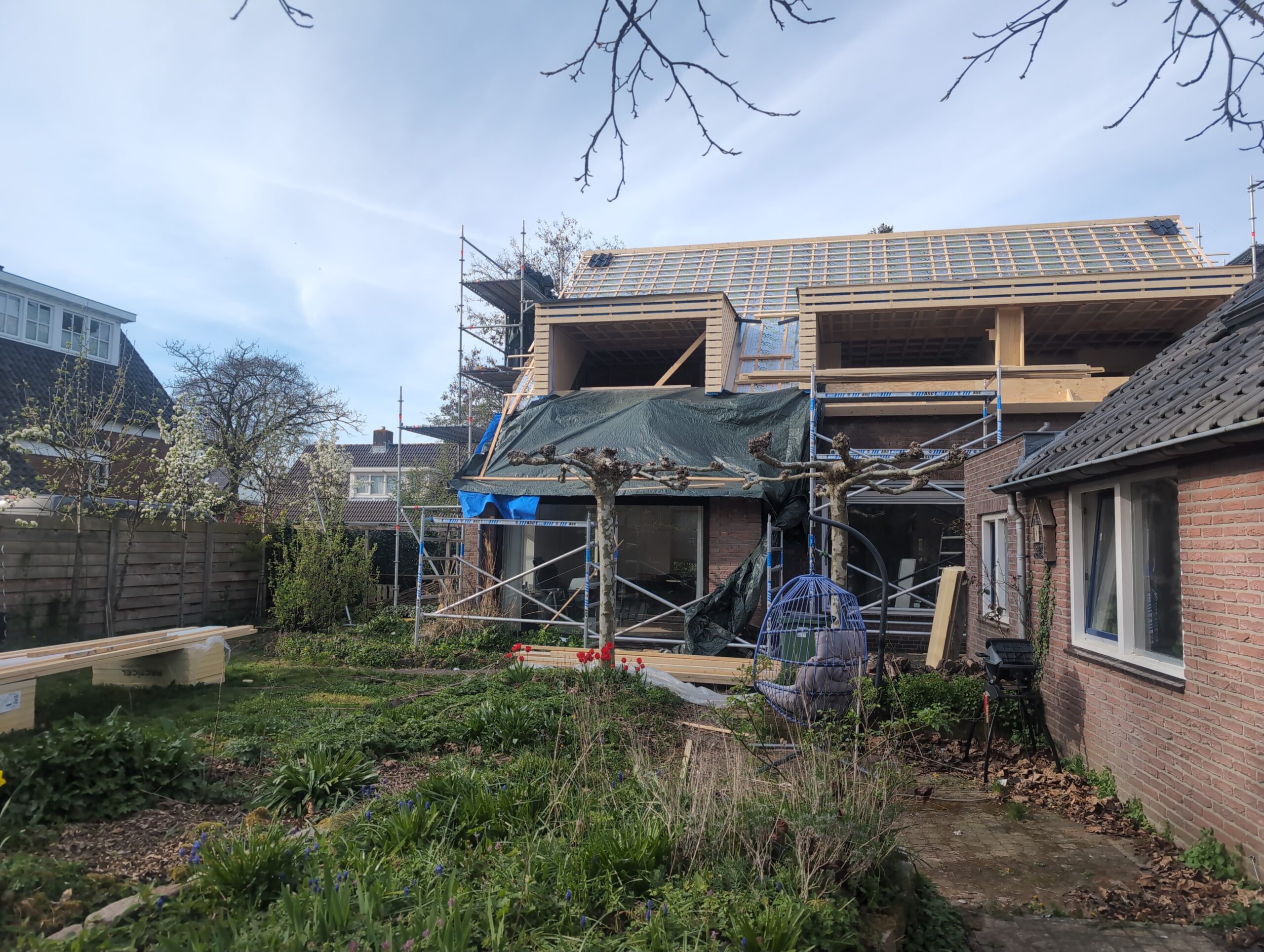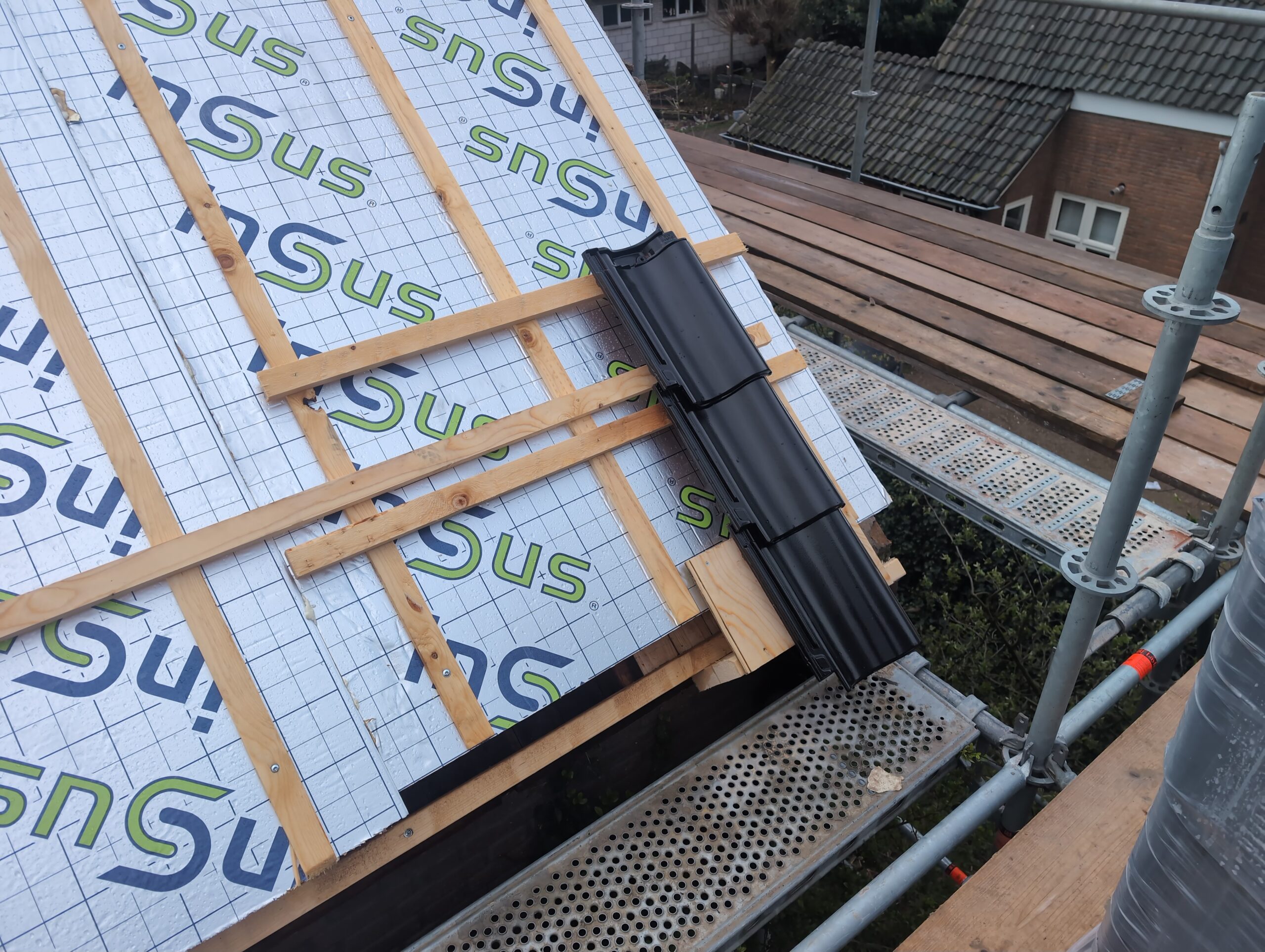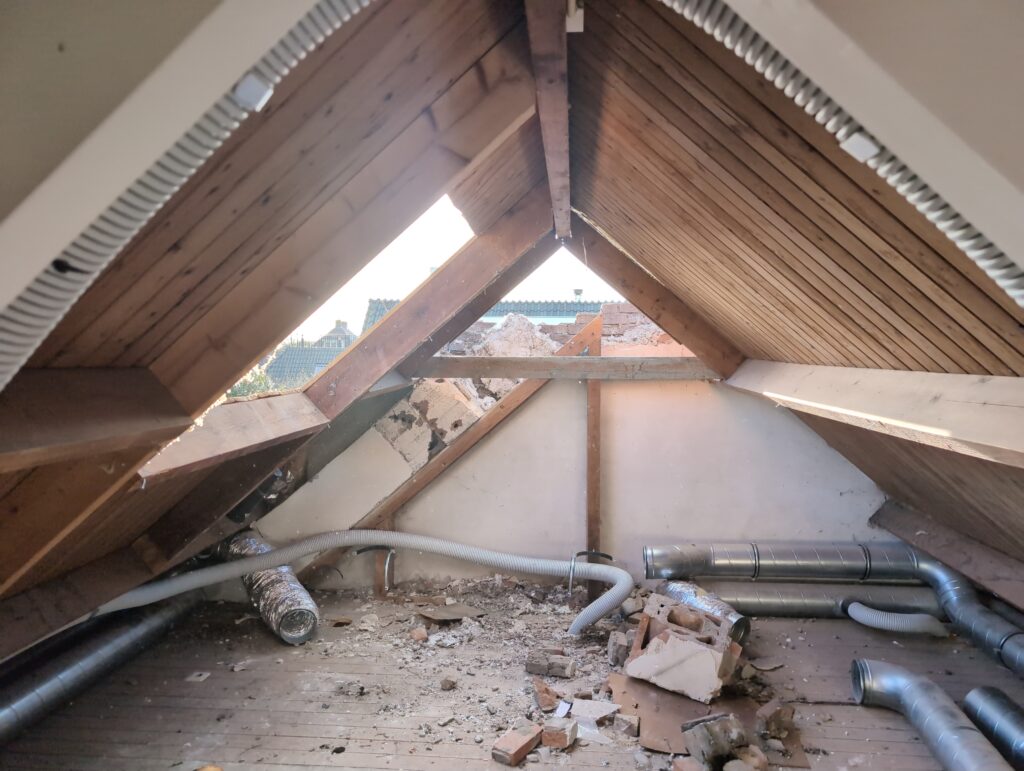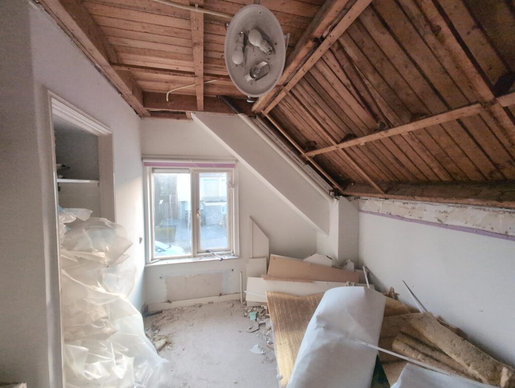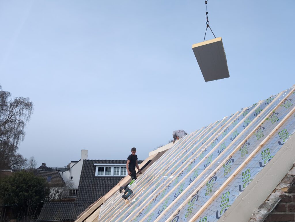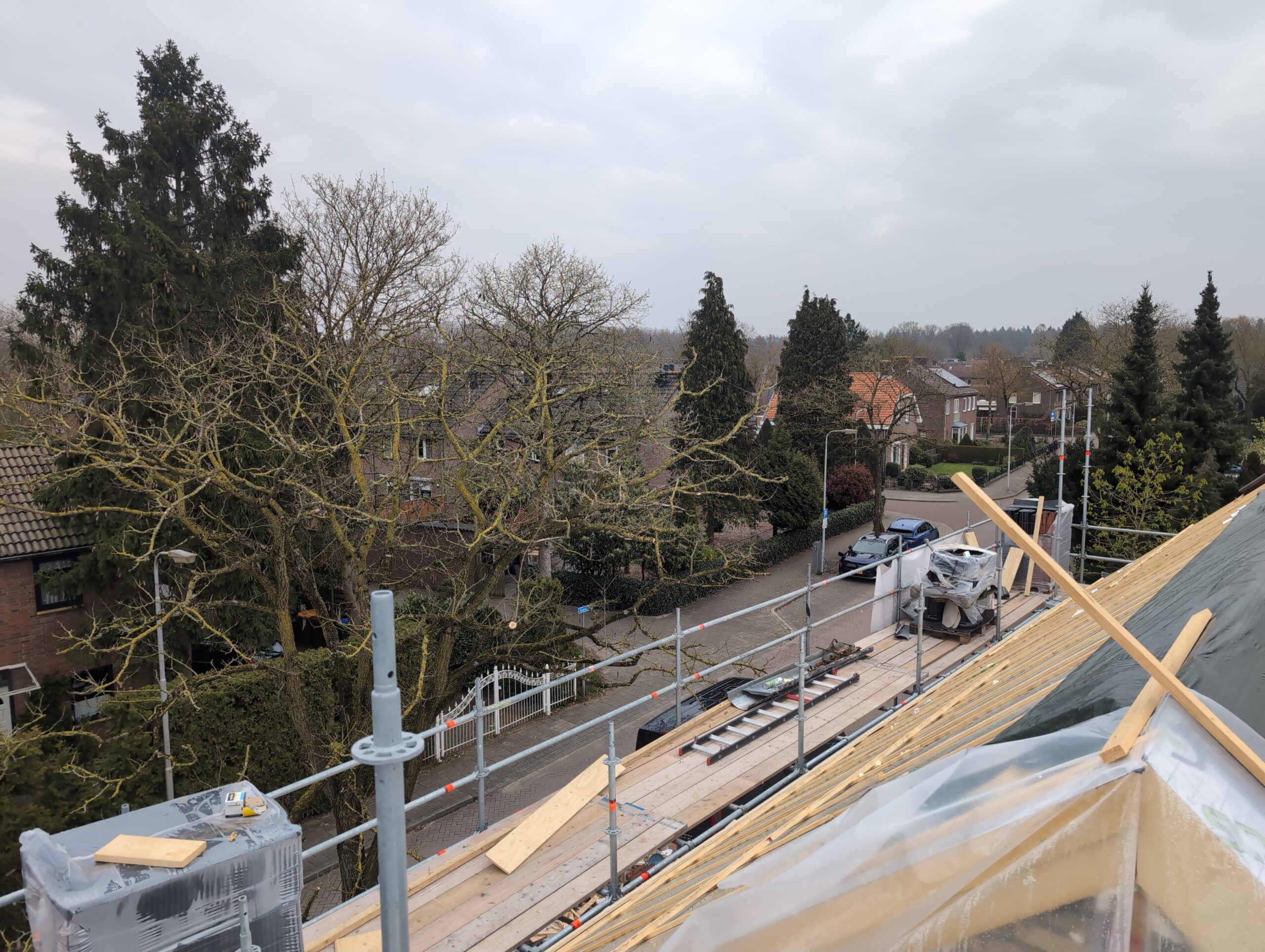 Gelukkig was er al vrij snel niets meer van het water te zien, ook beneden niet (anders dan wat lichte sporen in het plafond). Daarnaast is er van alles gebeurd: Er is een beter zeil gespannen over het dak, een kant van de zolder is dichtgemetseld, de eerste waterleidingen zijn aangelegd (wasmachine naar badkamer, rioolontluchting naar zolder). Maar ook het dak is verder afgewerkt waarbij er nog wat bussen PUR in alle kieren gespoten zijn, die daarna afgeplakt zijn met tape.