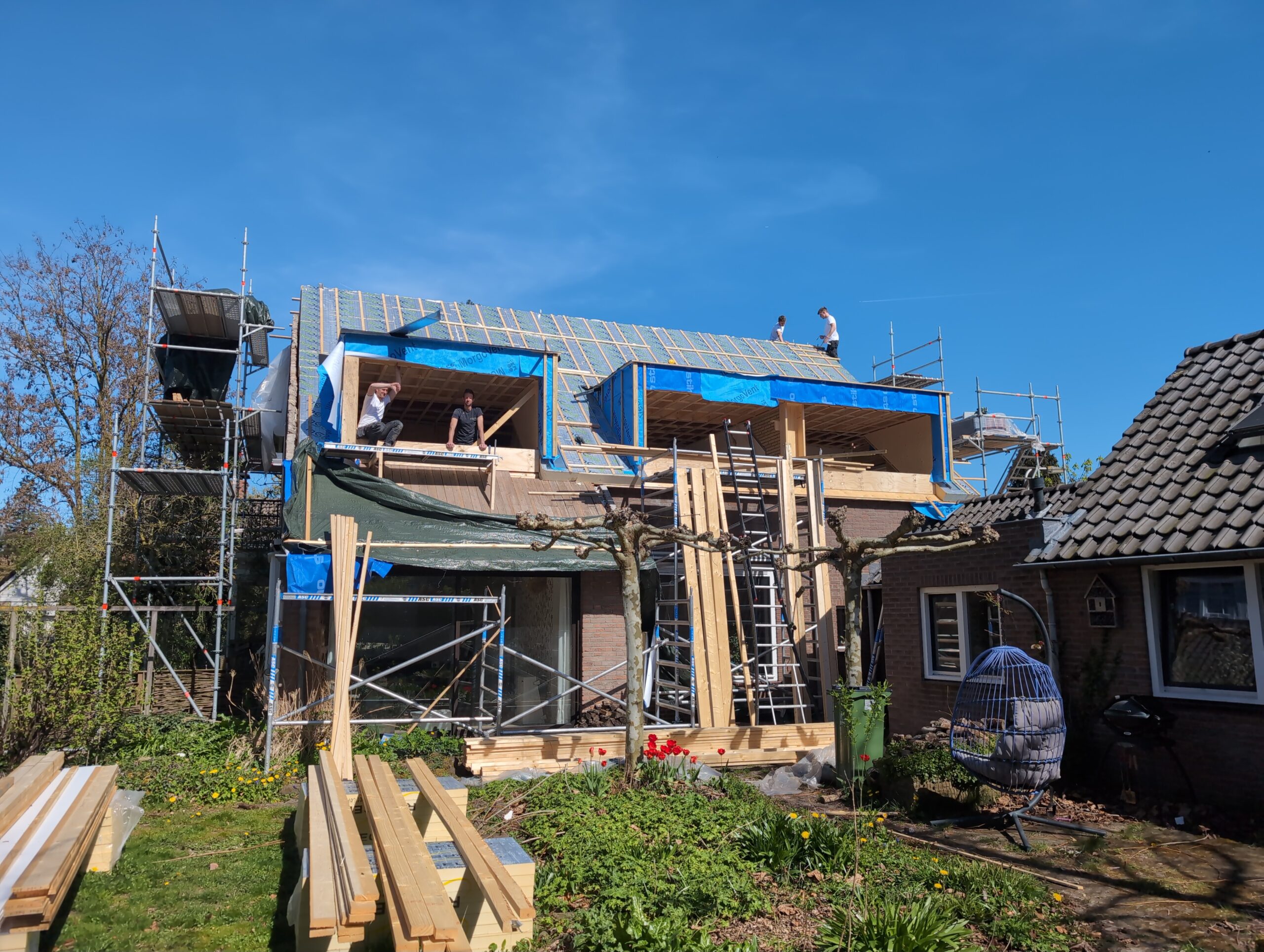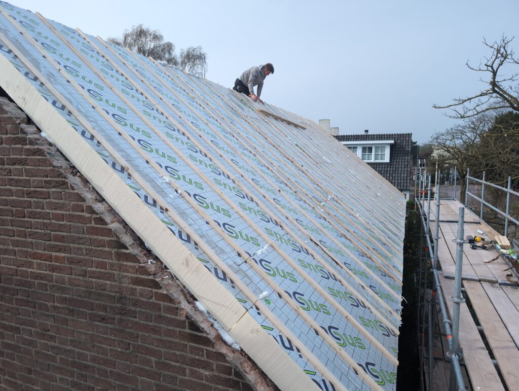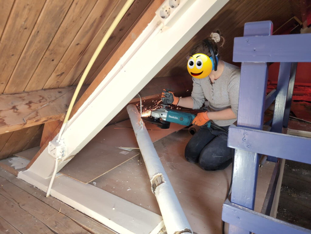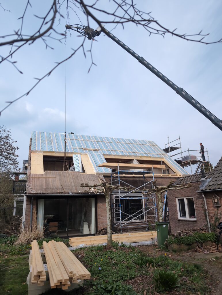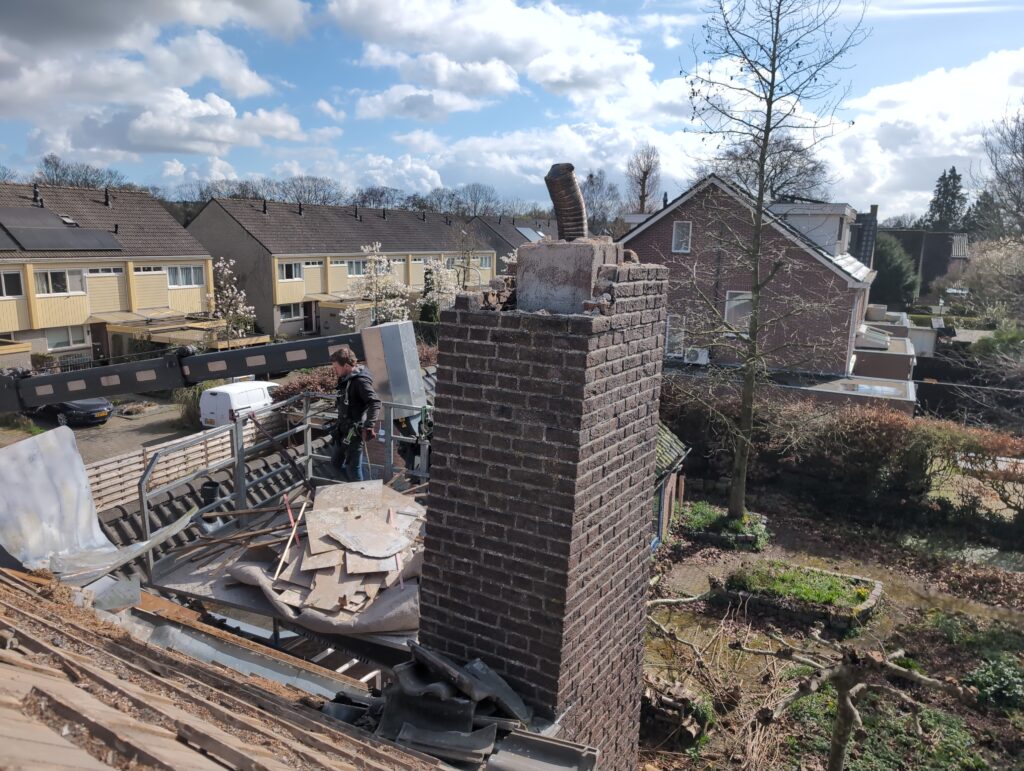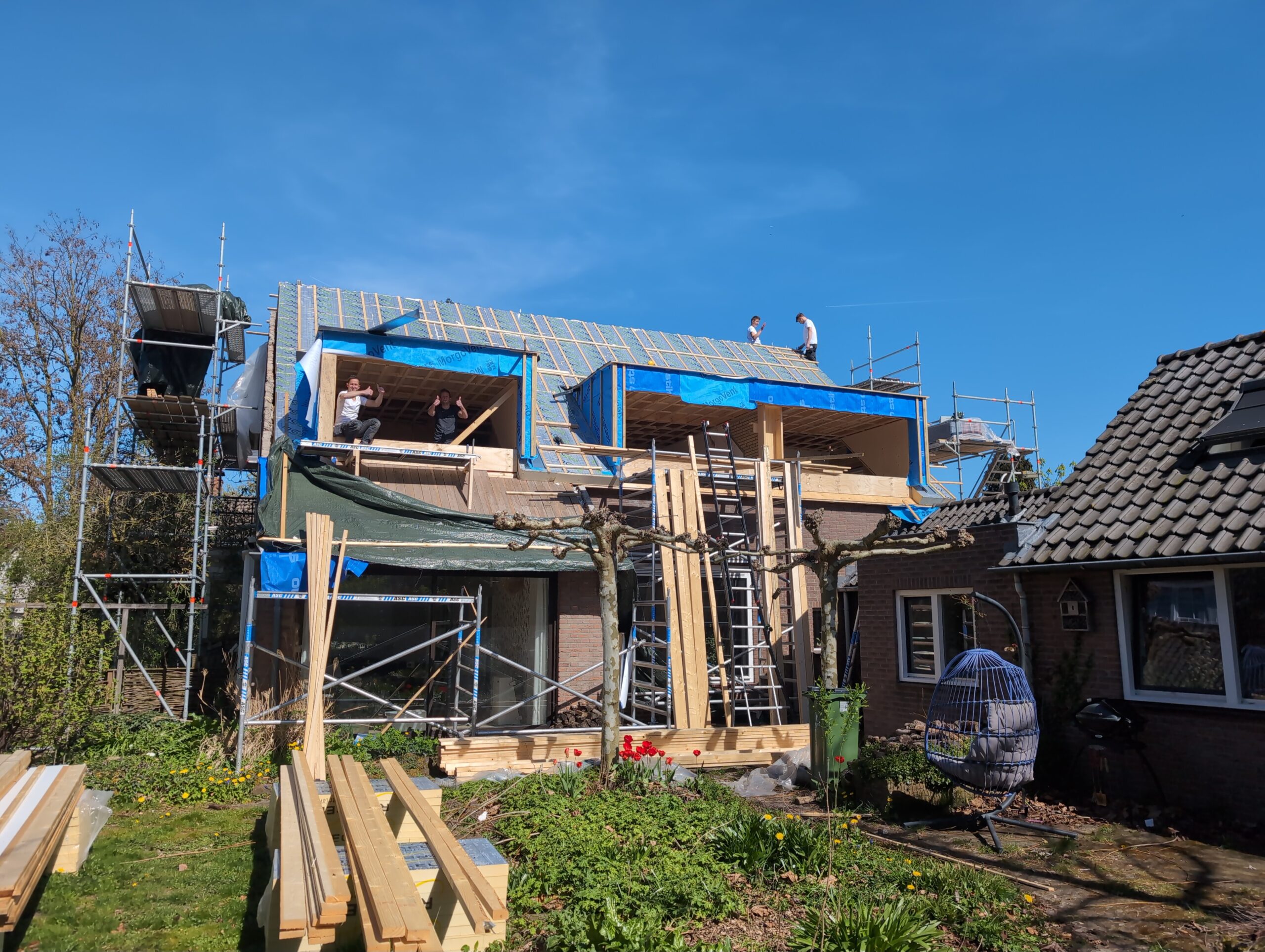Gelukkig was er al vrij snel niets meer van het water te zien, ook beneden niet (anders dan wat lichte sporen in het plafond). Daarnaast is er van alles gebeurd: Er is een beter zeil gespannen over het dak, een kant van de zolder is dichtgemetseld, de eerste waterleidingen zijn aangelegd (wasmachine naar badkamer, rioolontluchting naar zolder). Maar ook het dak is verder afgewerkt waarbij er nog wat bussen PUR in alle kieren gespoten zijn, die daarna afgeplakt zijn met tape.