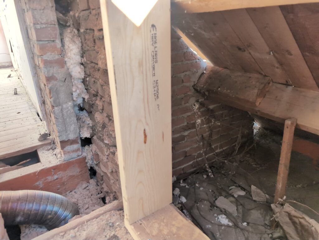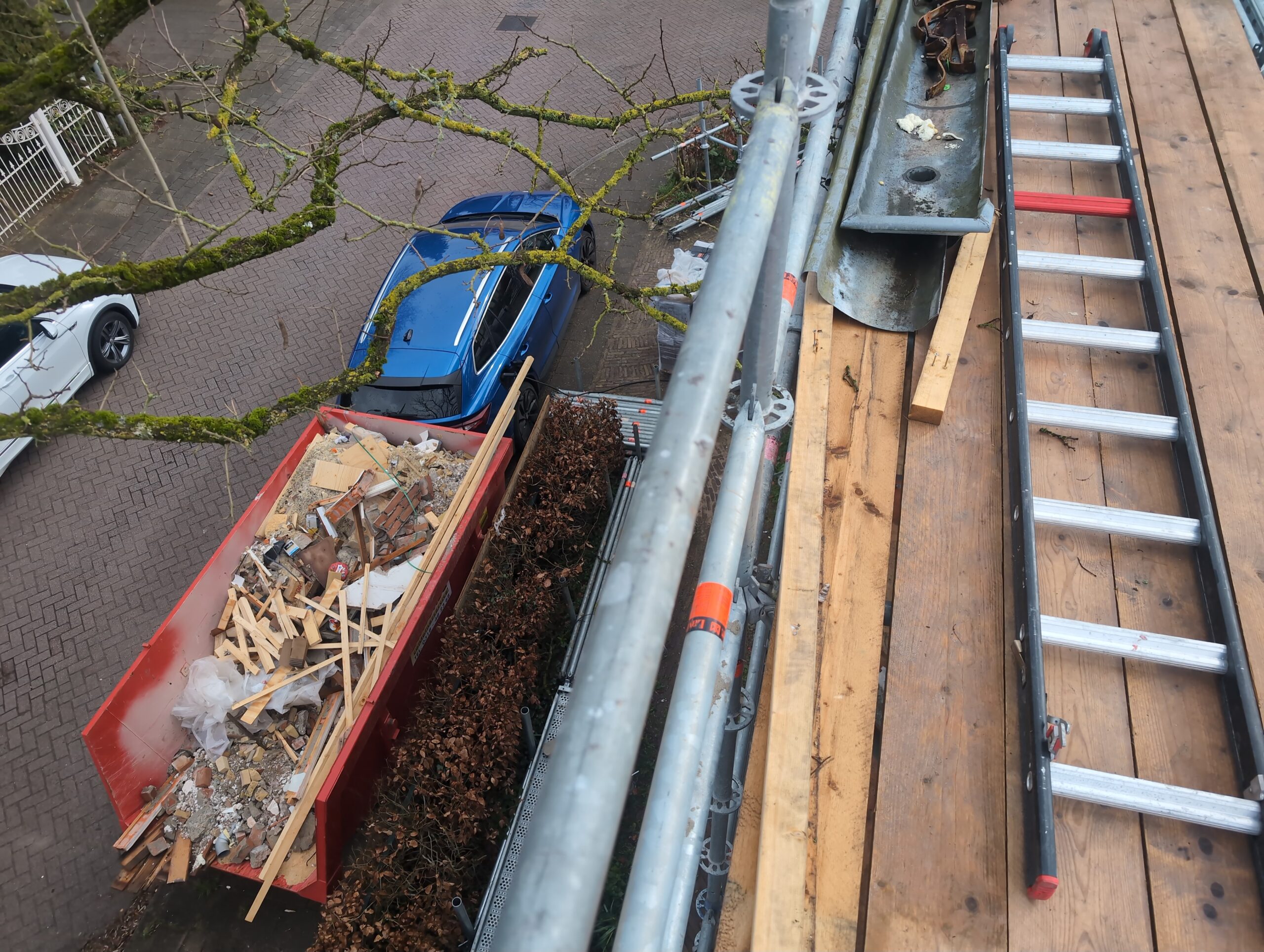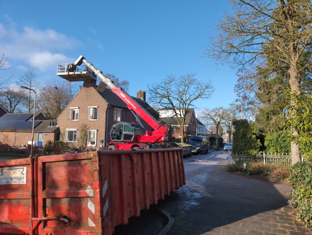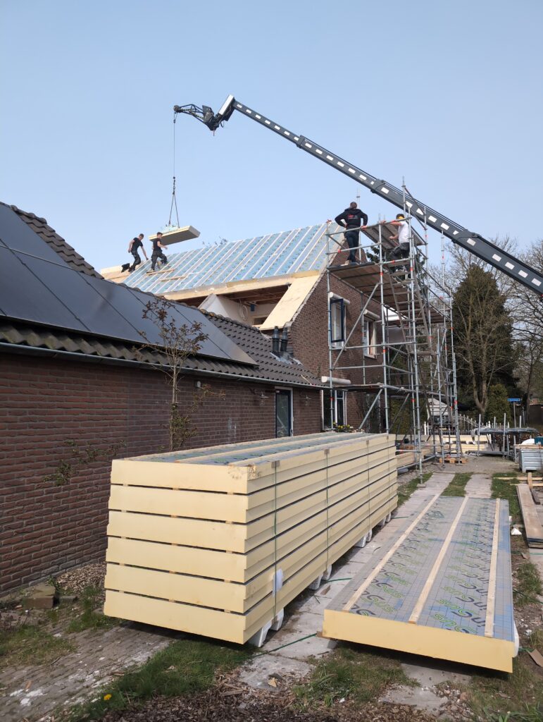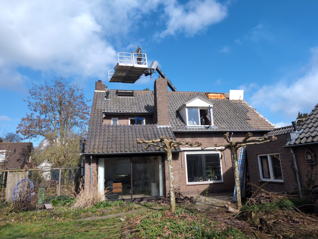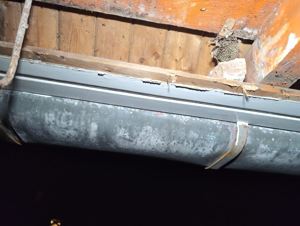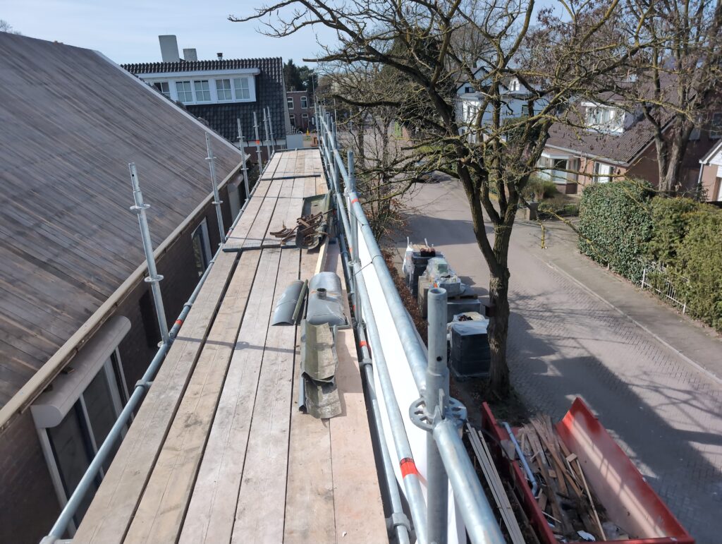 Gelukkig was er al vrij snel niets meer van het water te zien, ook beneden niet (anders dan wat lichte sporen in het plafond). Daarnaast is er van alles gebeurd: Er is een beter zeil gespannen over het dak, een kant van de zolder is dichtgemetseld, de eerste waterleidingen zijn aangelegd (wasmachine naar badkamer, rioolontluchting naar zolder). Maar ook het dak is verder afgewerkt waarbij er nog wat bussen PUR in alle kieren gespoten zijn, die daarna afgeplakt zijn met tape.