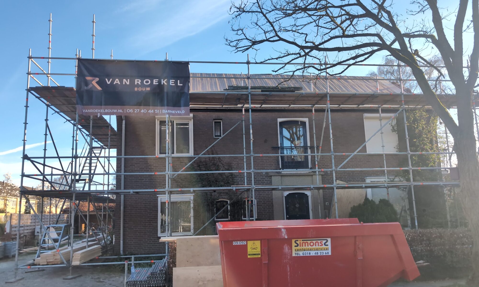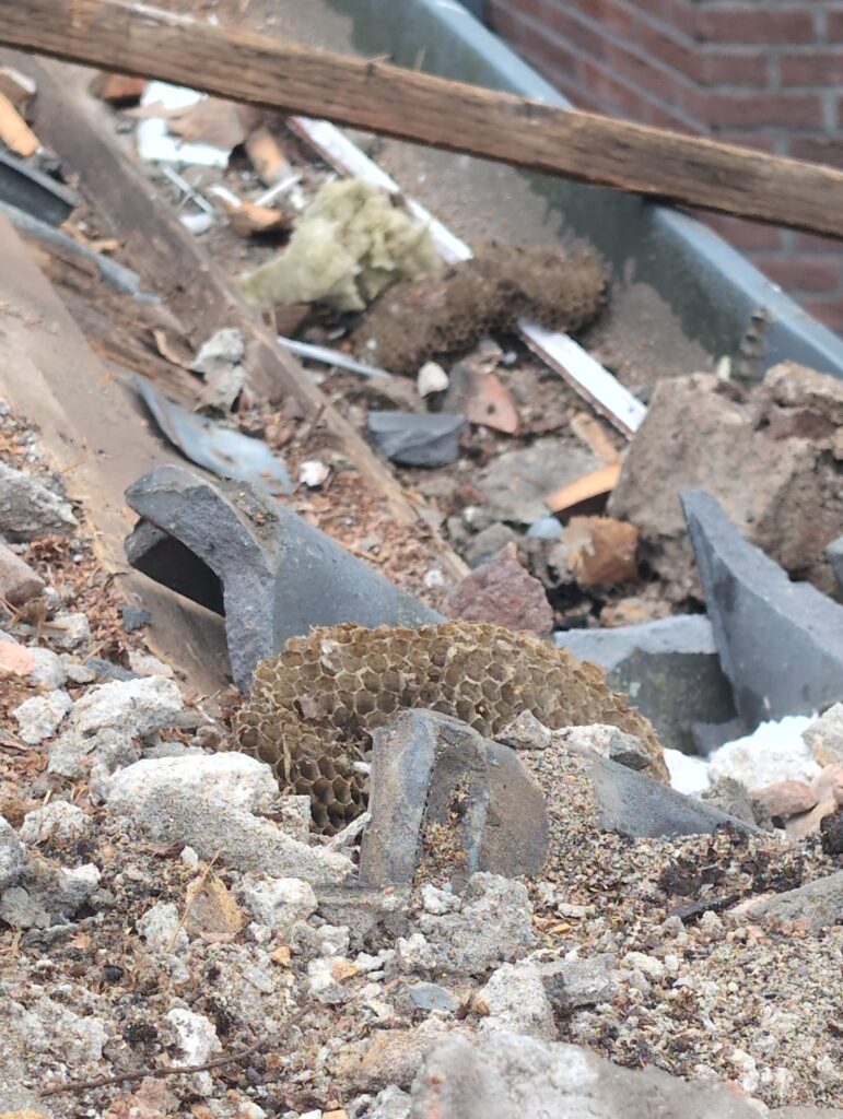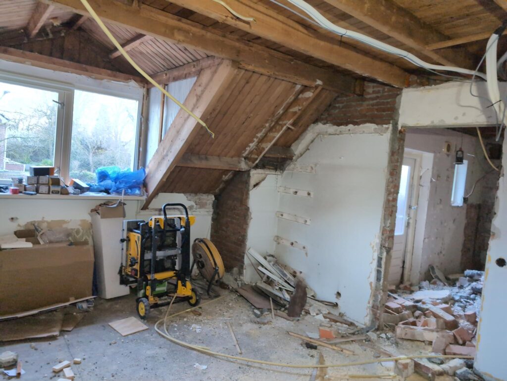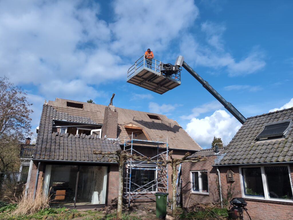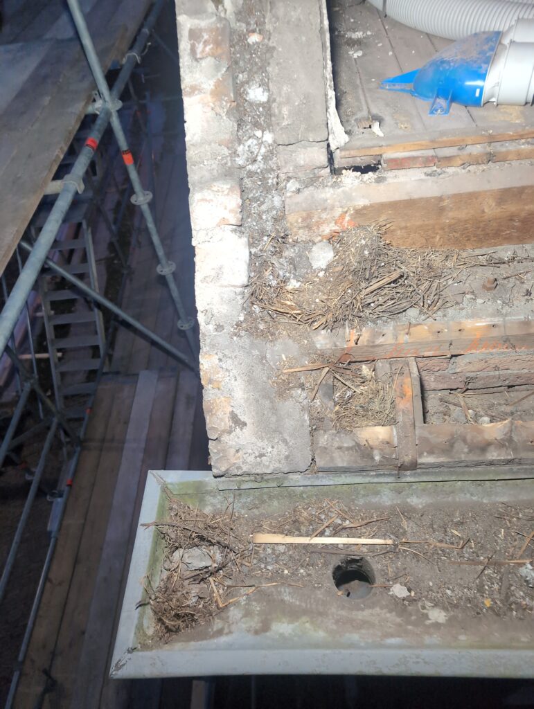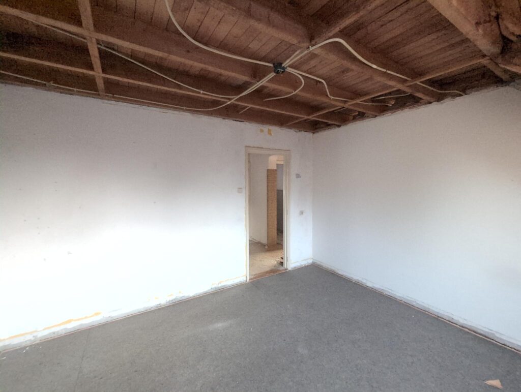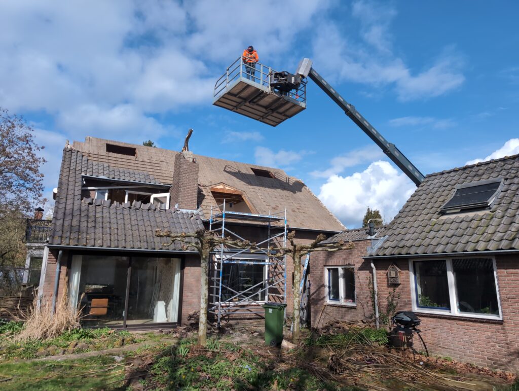 Gelukkig was er al vrij snel niets meer van het water te zien, ook beneden niet (anders dan wat lichte sporen in het plafond). Daarnaast is er van alles gebeurd: Er is een beter zeil gespannen over het dak, een kant van de zolder is dichtgemetseld, de eerste waterleidingen zijn aangelegd (wasmachine naar badkamer, rioolontluchting naar zolder). Maar ook het dak is verder afgewerkt waarbij er nog wat bussen PUR in alle kieren gespoten zijn, die daarna afgeplakt zijn met tape.