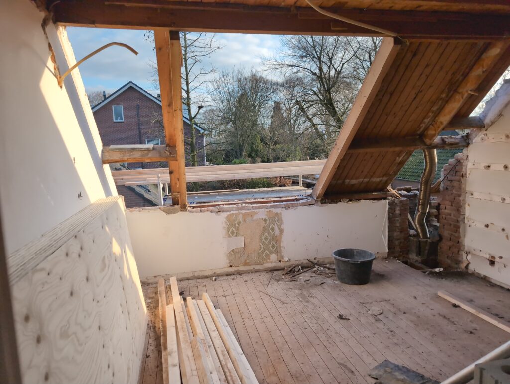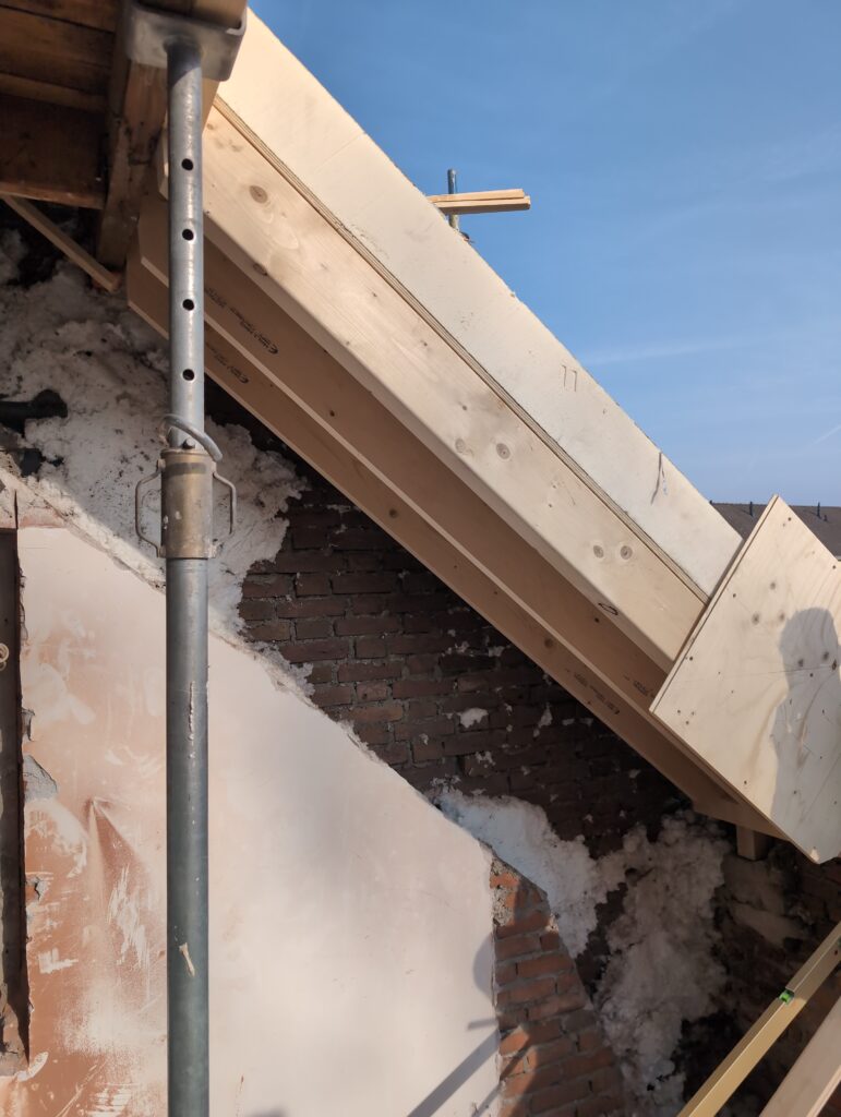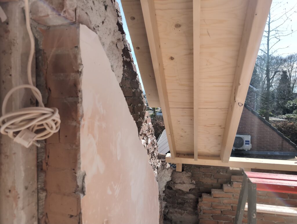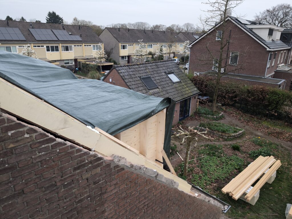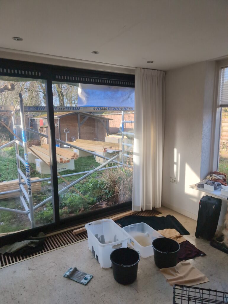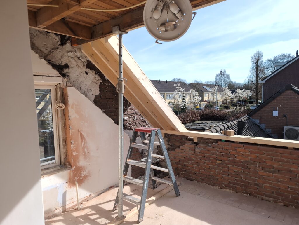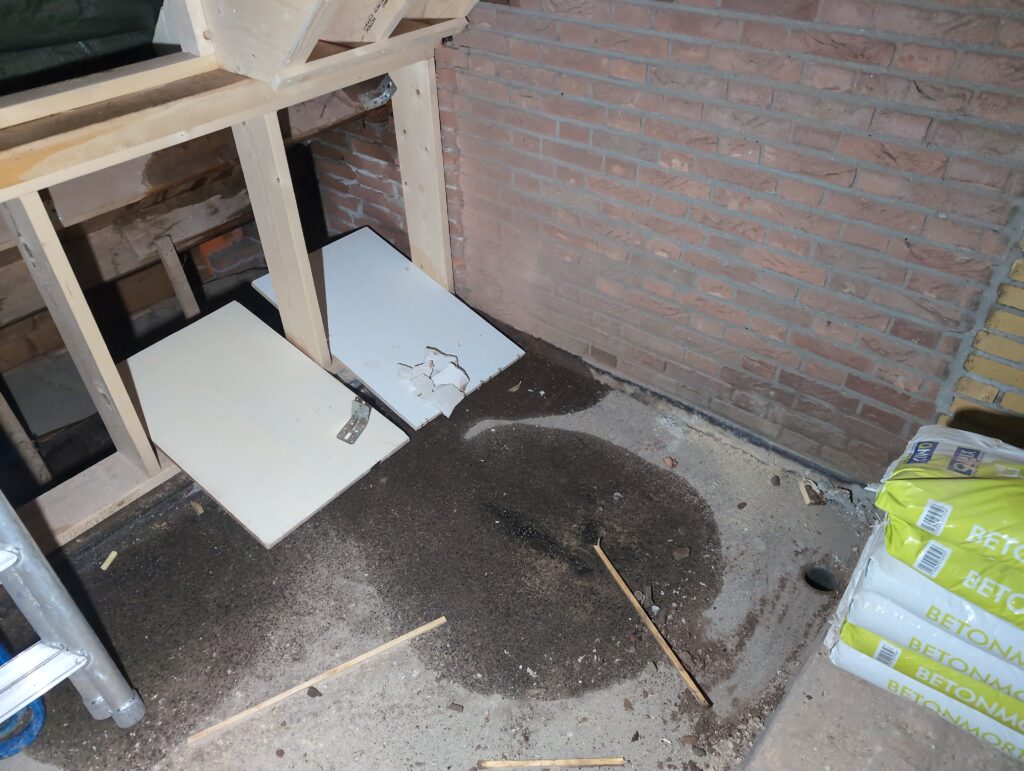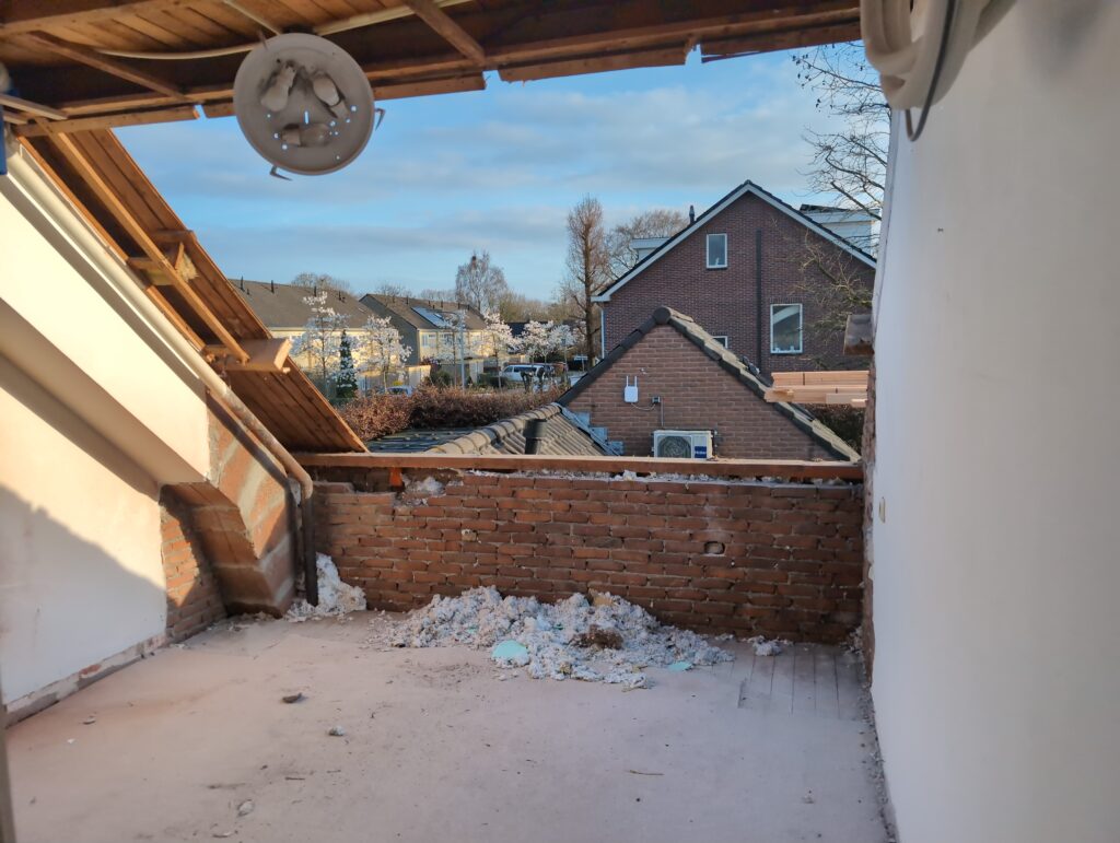 Vorig weekend regende (& waaide) het een nachtje. Dat is prima, maar helaas was er ondanks het zeil wel wat ruimte voor het water om via de spouw naar binnen te komen. Dit sijpelde vervolgens via een draagbalk op het plafond van de woonkamer waarna het vrolijk de woonkamer in droop. Met wat planken hebben we even wat geimproviseerd dat het meeste extra water omgeleid werd naar de vloer die voormalig het balkon was. Die kan gelukkig wel wat water hebben.