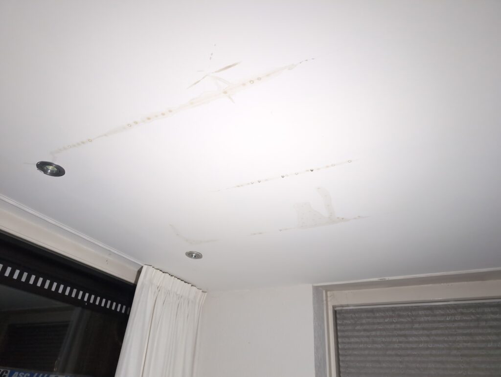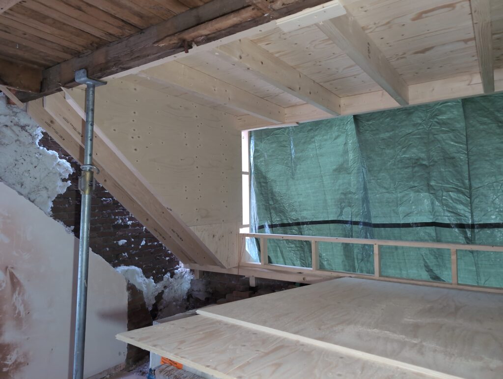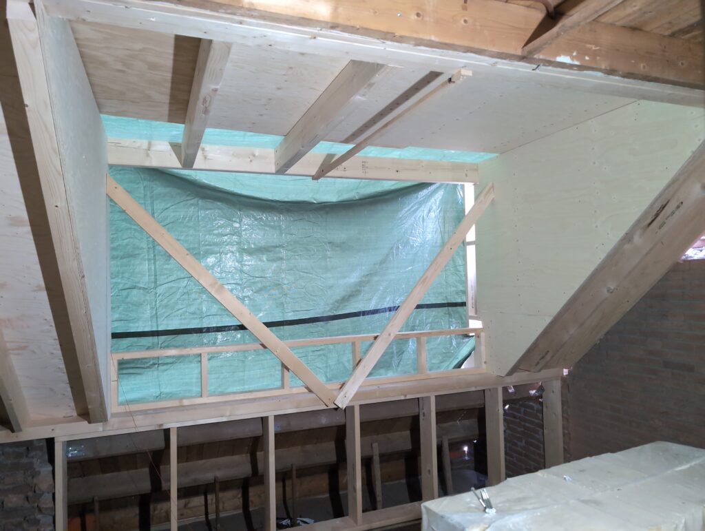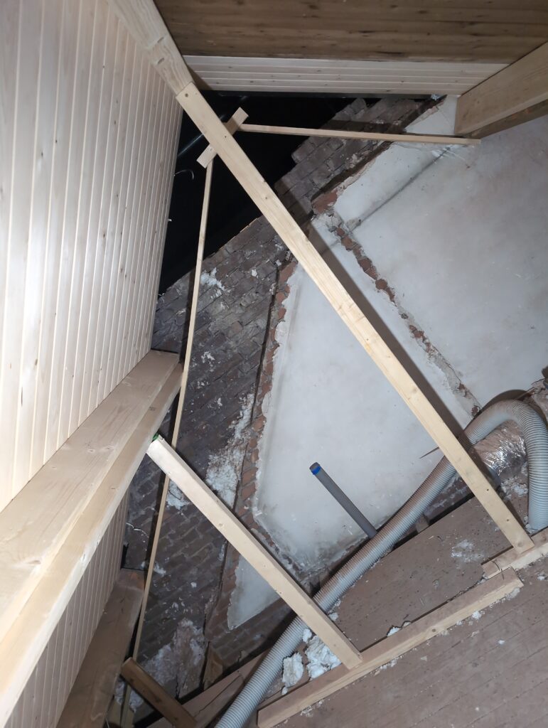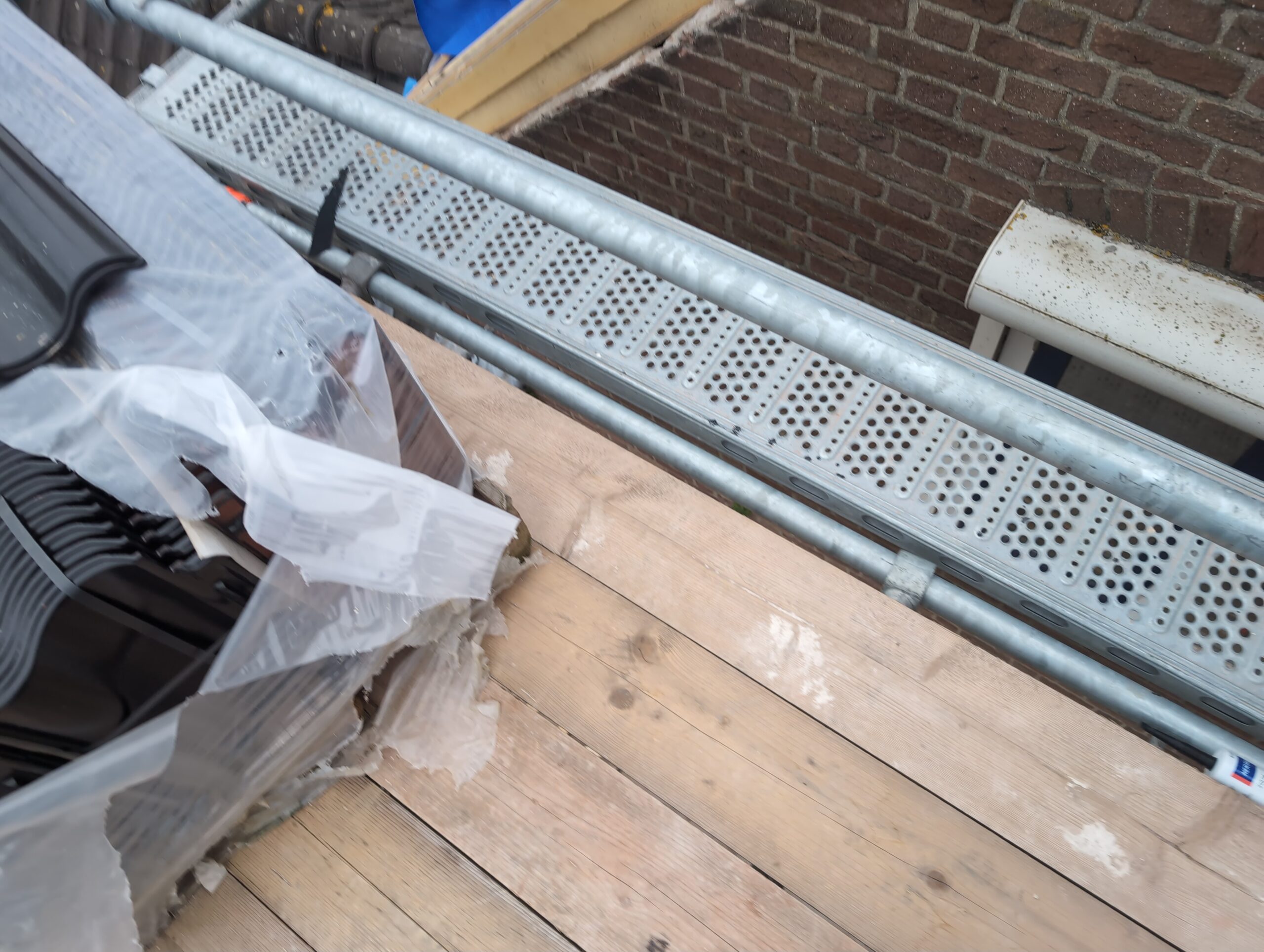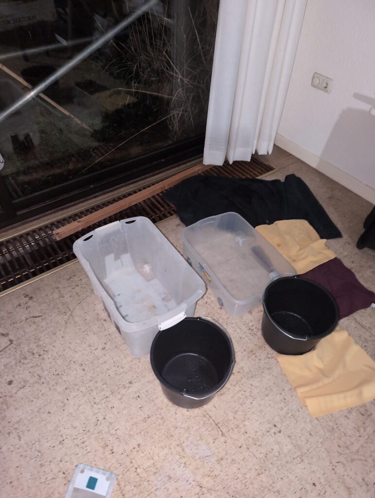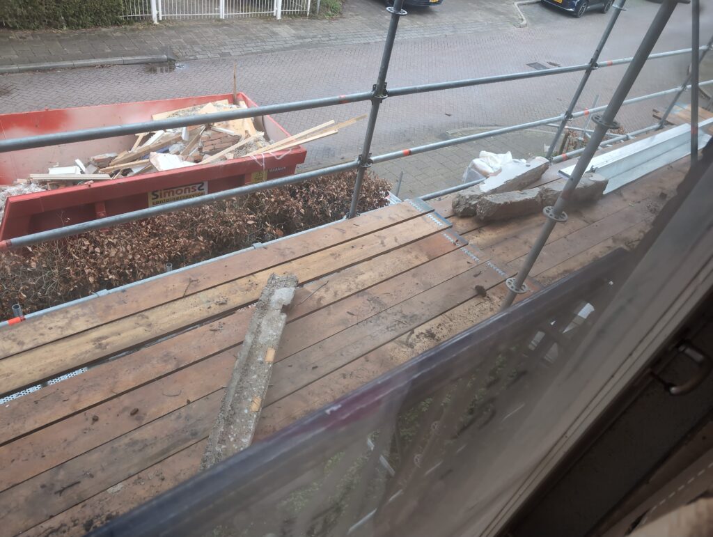 Vorig weekend regende (& waaide) het een nachtje. Dat is prima, maar helaas was er ondanks het zeil wel wat ruimte voor het water om via de spouw naar binnen te komen. Dit sijpelde vervolgens via een draagbalk op het plafond van de woonkamer waarna het vrolijk de woonkamer in droop. Met wat planken hebben we even wat geimproviseerd dat het meeste extra water omgeleid werd naar de vloer die voormalig het balkon was. Die kan gelukkig wel wat water hebben.