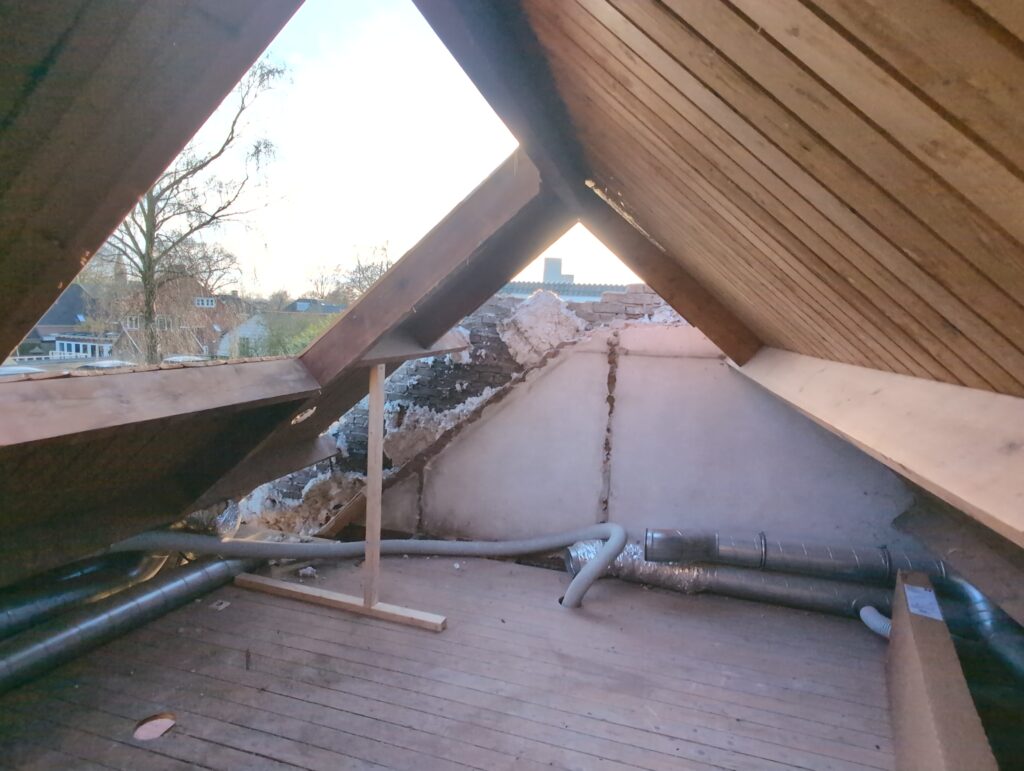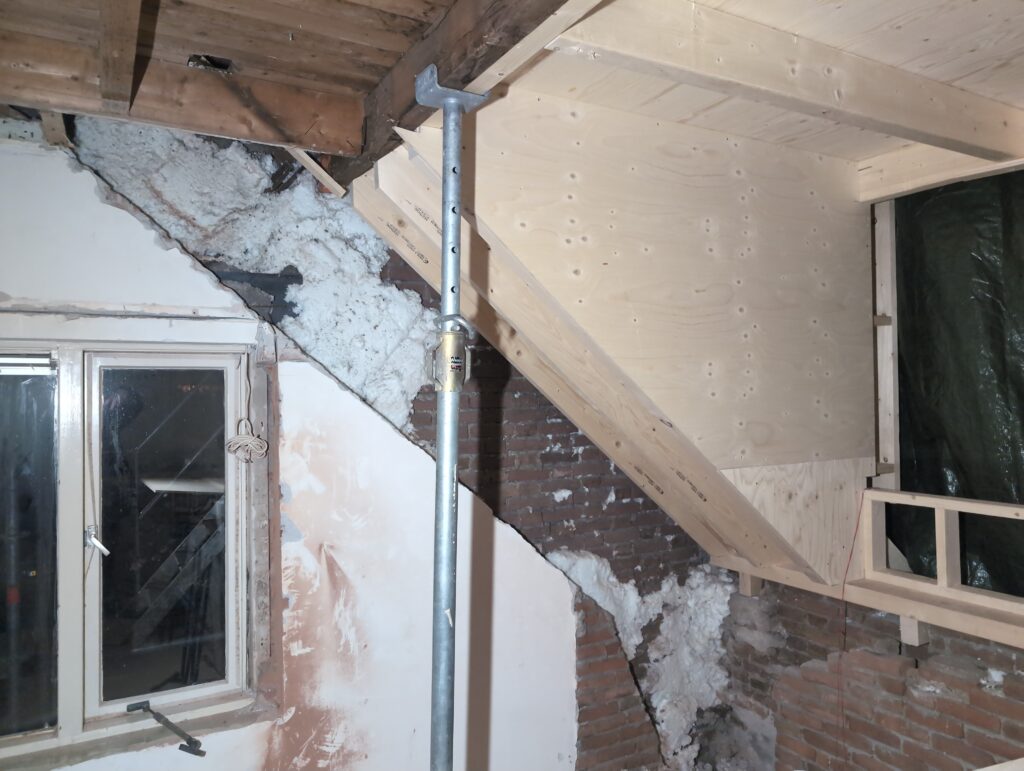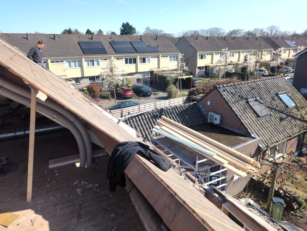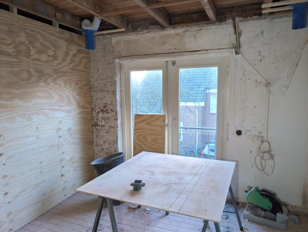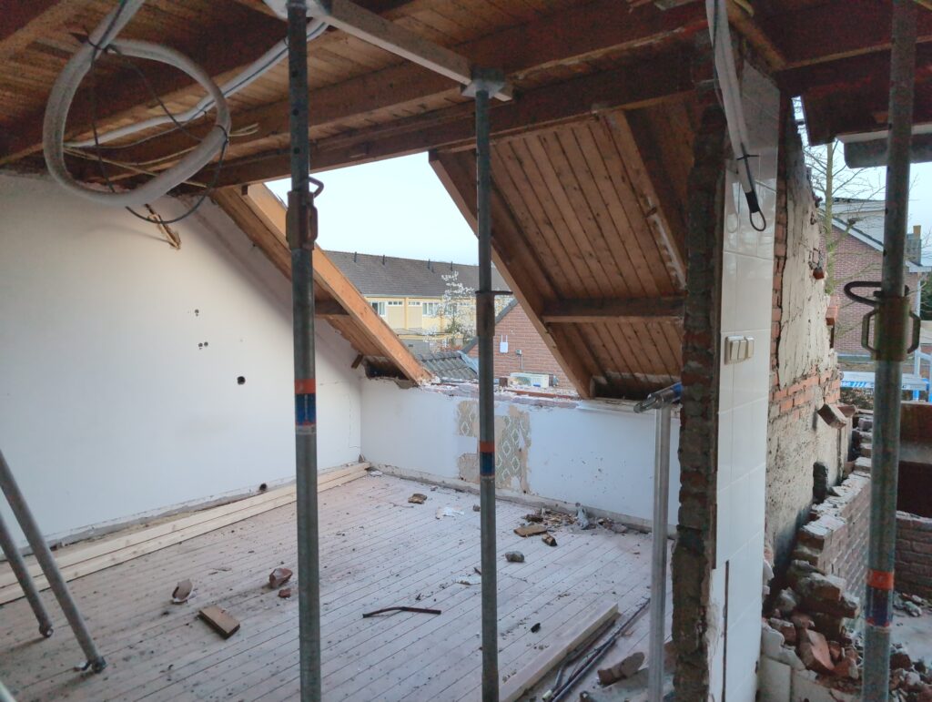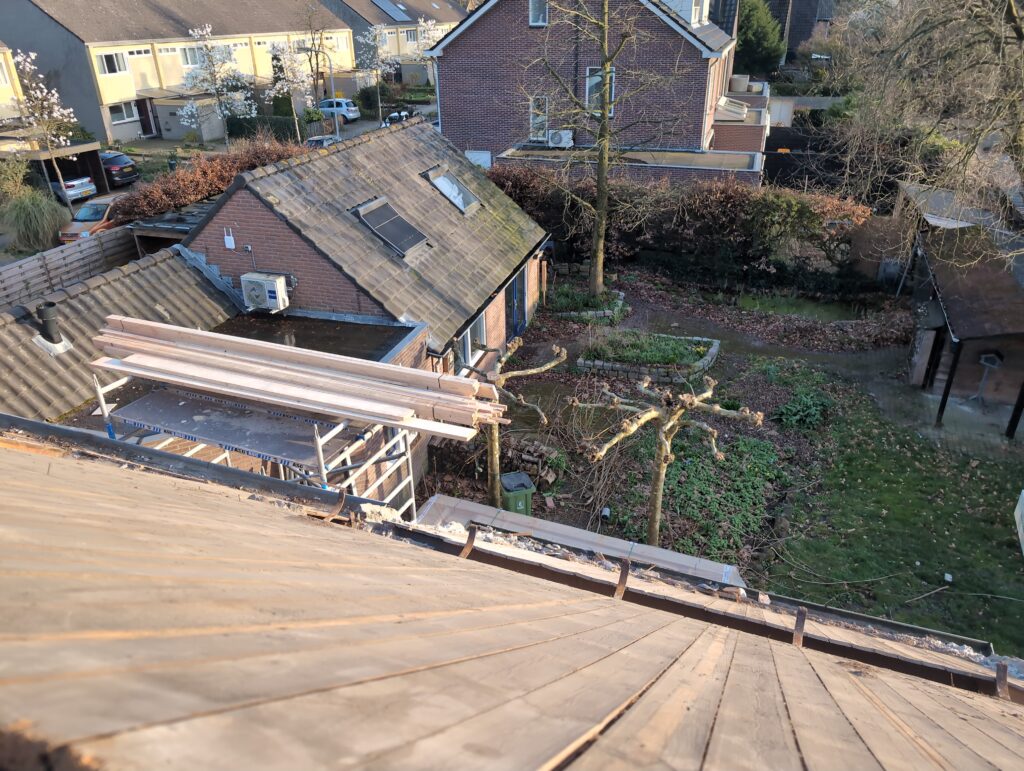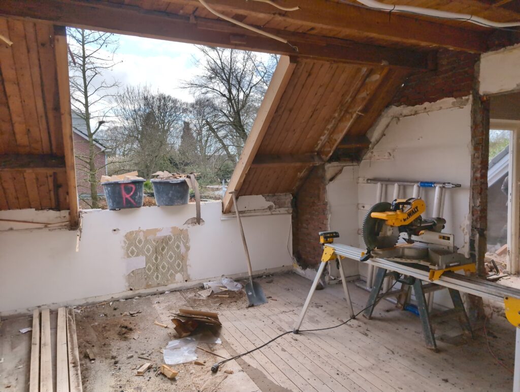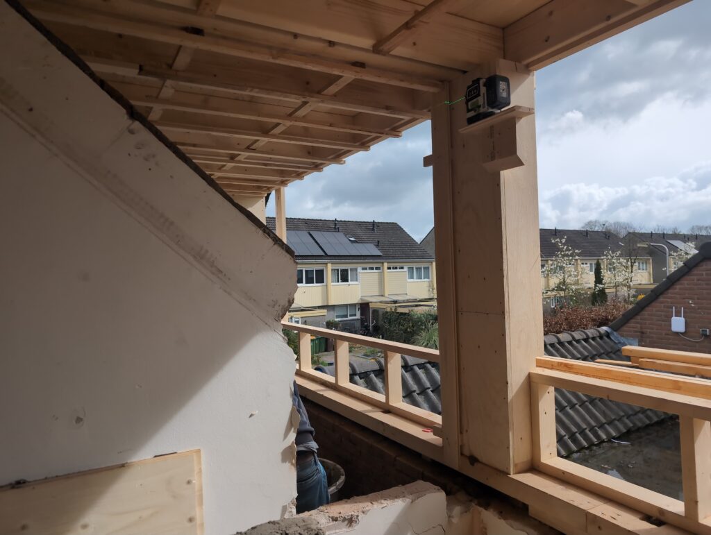 Vorig weekend regende (& waaide) het een nachtje. Dat is prima, maar helaas was er ondanks het zeil wel wat ruimte voor het water om via de spouw naar binnen te komen. Dit sijpelde vervolgens via een draagbalk op het plafond van de woonkamer waarna het vrolijk de woonkamer in droop. Met wat planken hebben we even wat geimproviseerd dat het meeste extra water omgeleid werd naar de vloer die voormalig het balkon was. Die kan gelukkig wel wat water hebben.