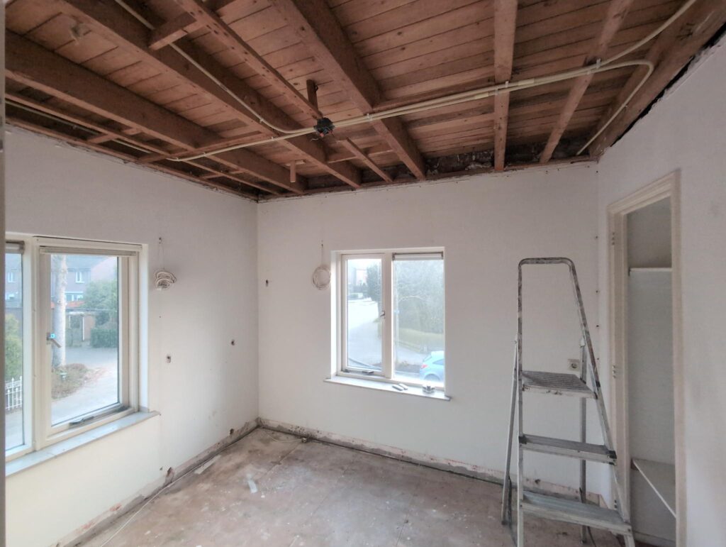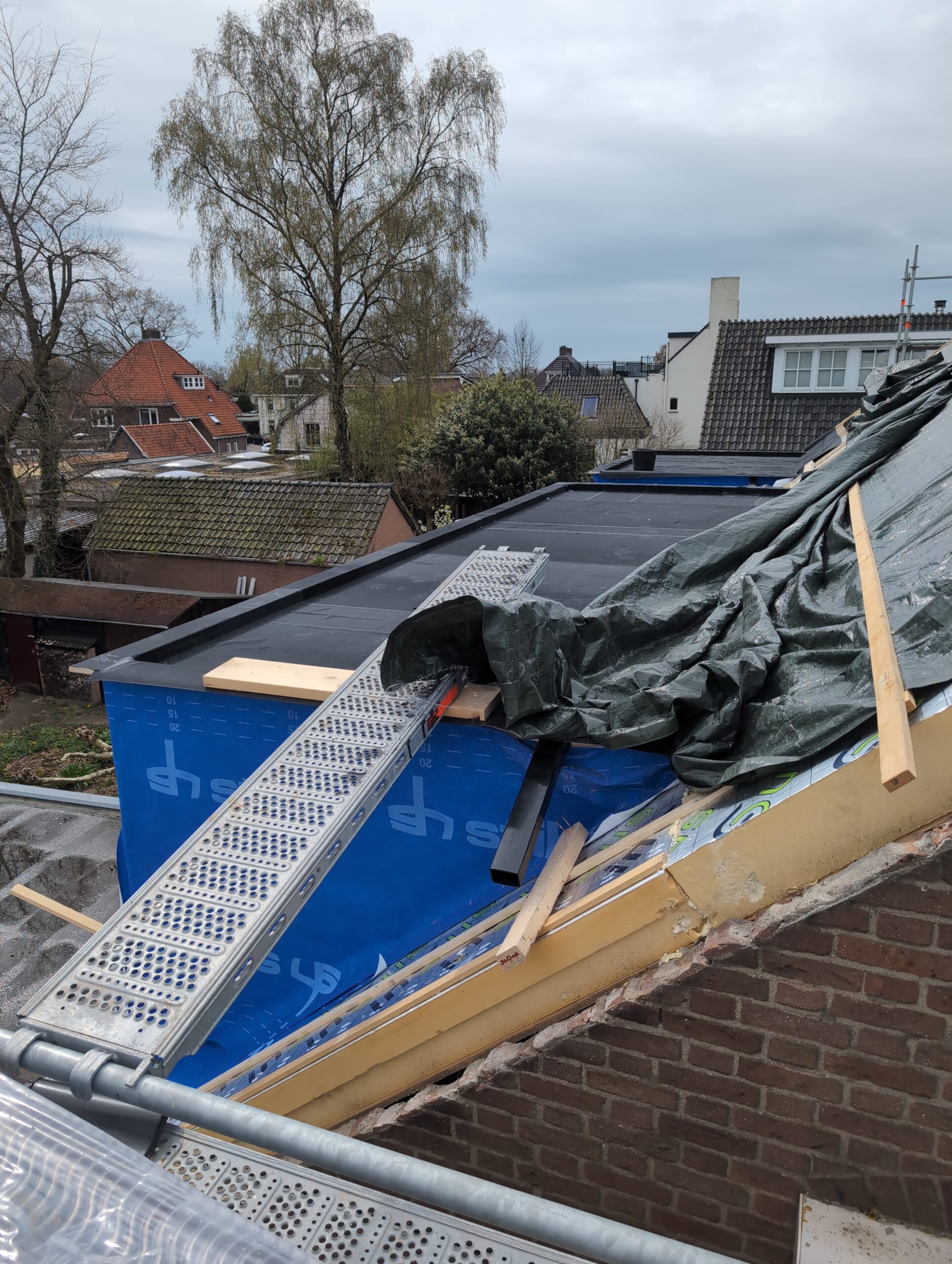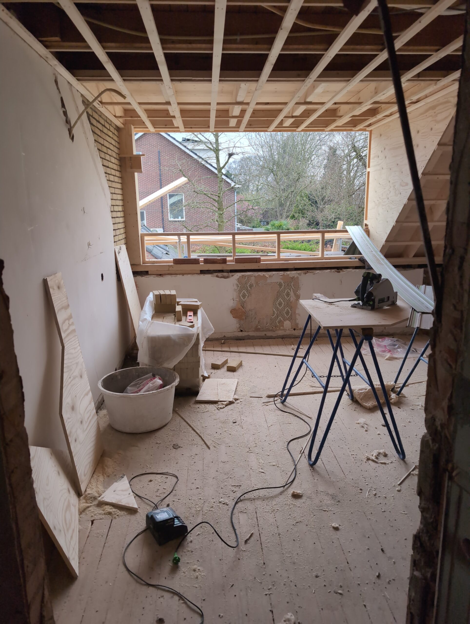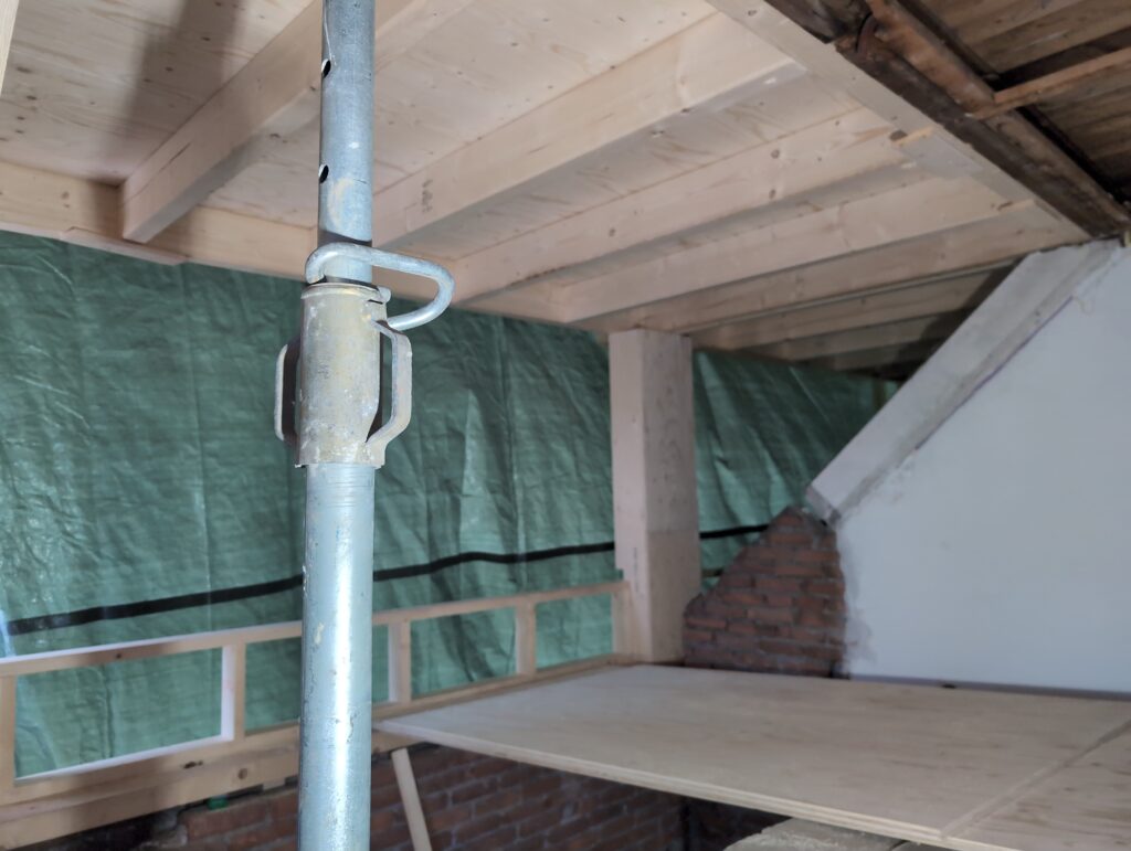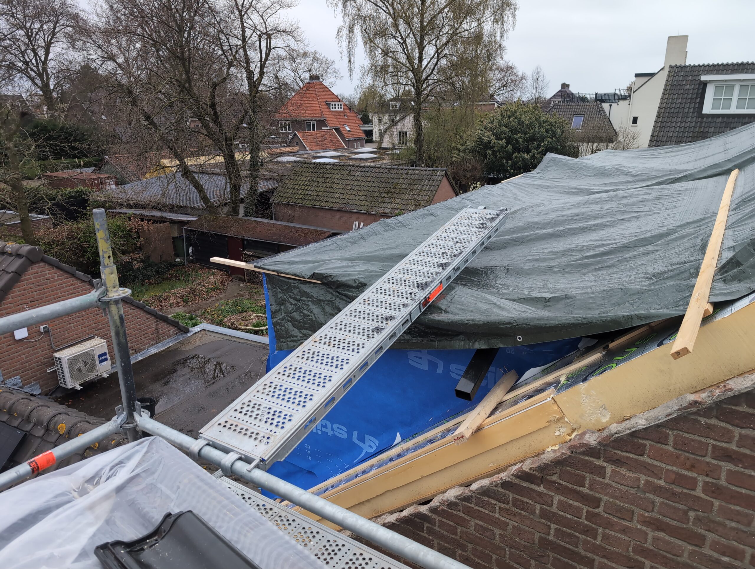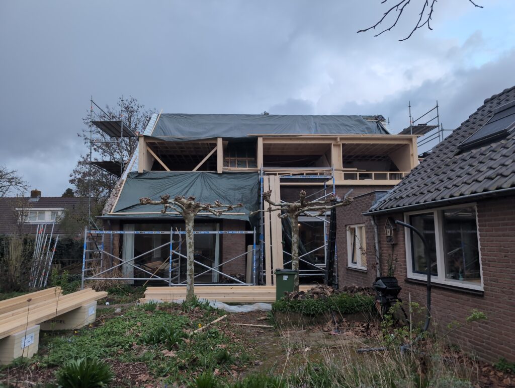 Vorig weekend regende (& waaide) het een nachtje. Dat is prima, maar helaas was er ondanks het zeil wel wat ruimte voor het water om via de spouw naar binnen te komen. Dit sijpelde vervolgens via een draagbalk op het plafond van de woonkamer waarna het vrolijk de woonkamer in droop. Met wat planken hebben we even wat geimproviseerd dat het meeste extra water omgeleid werd naar de vloer die voormalig het balkon was. Die kan gelukkig wel wat water hebben.