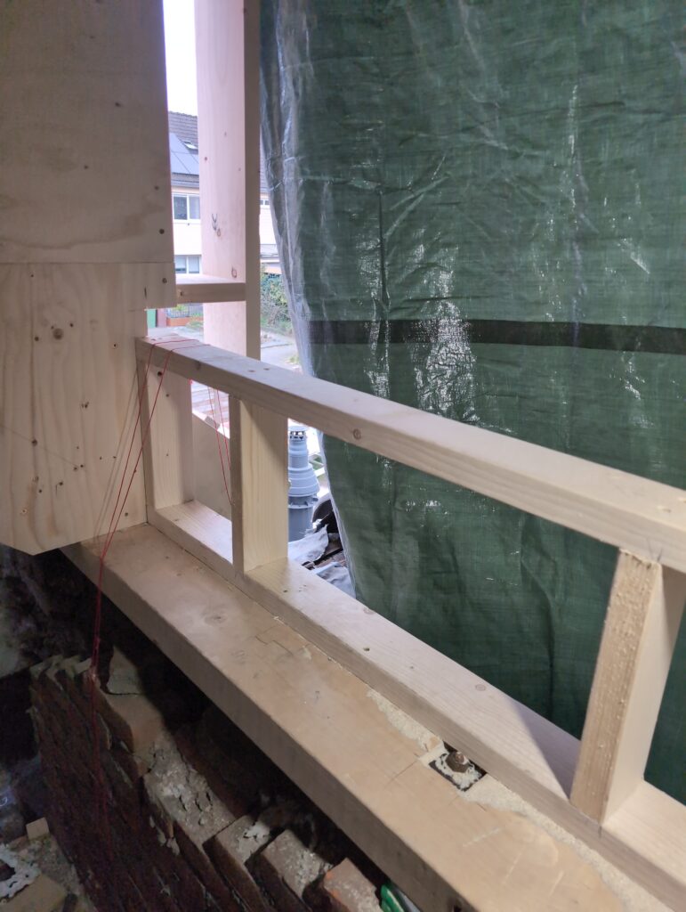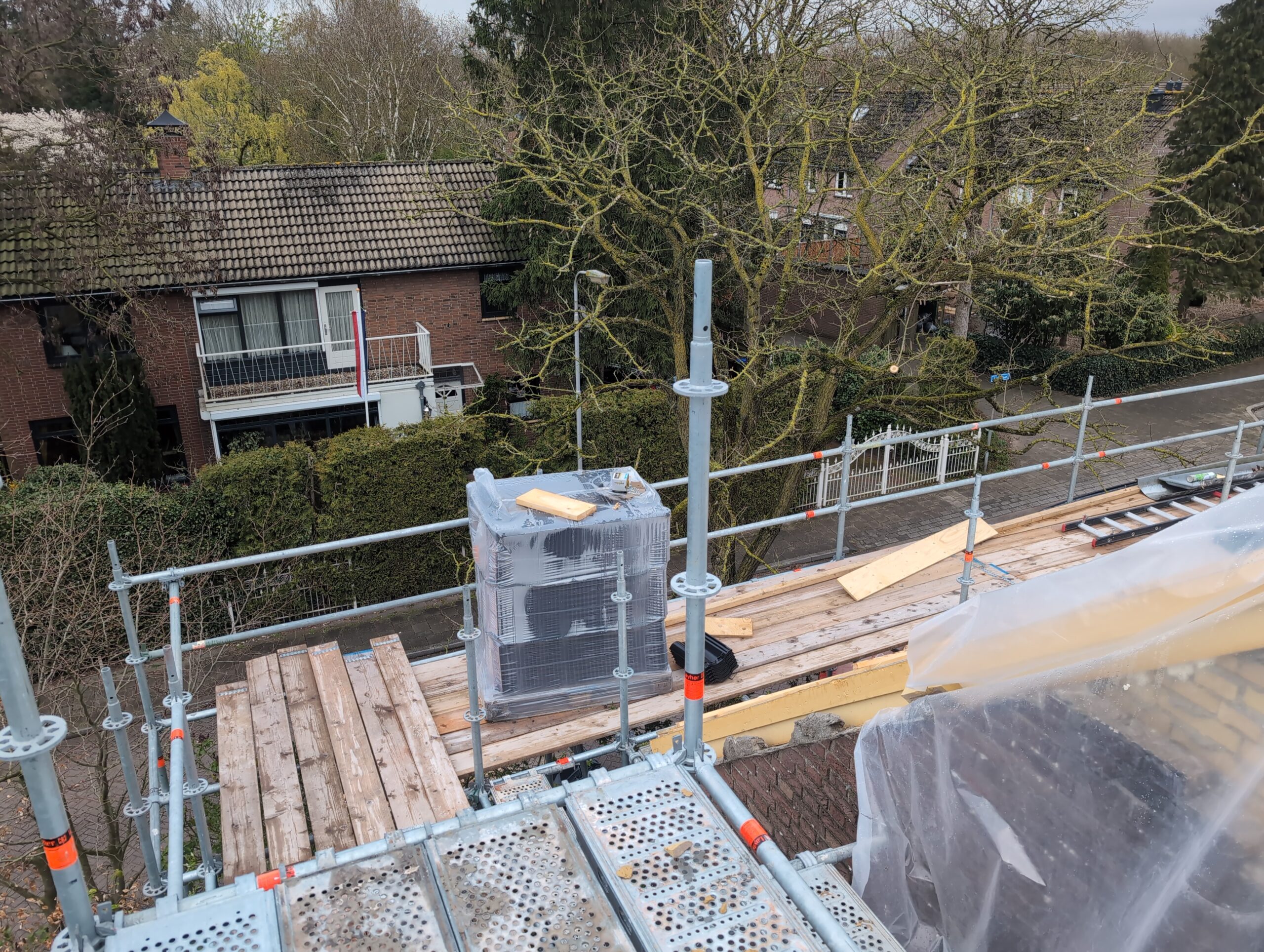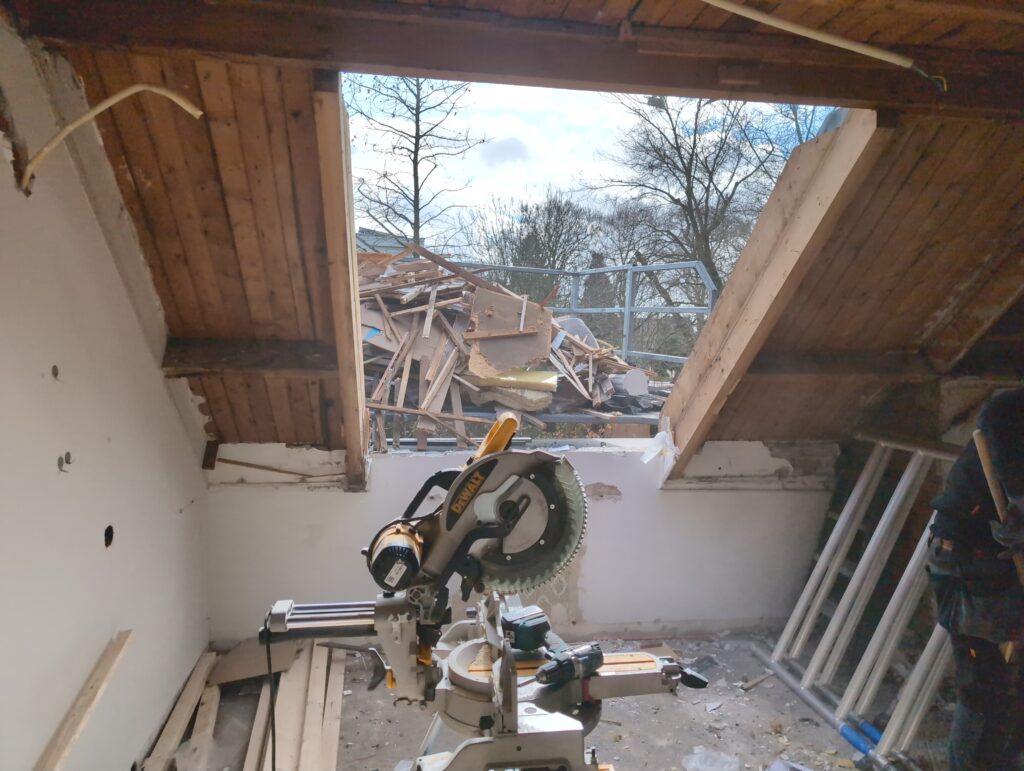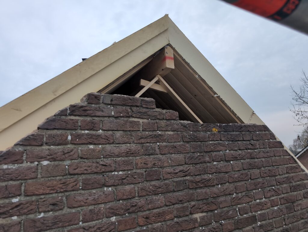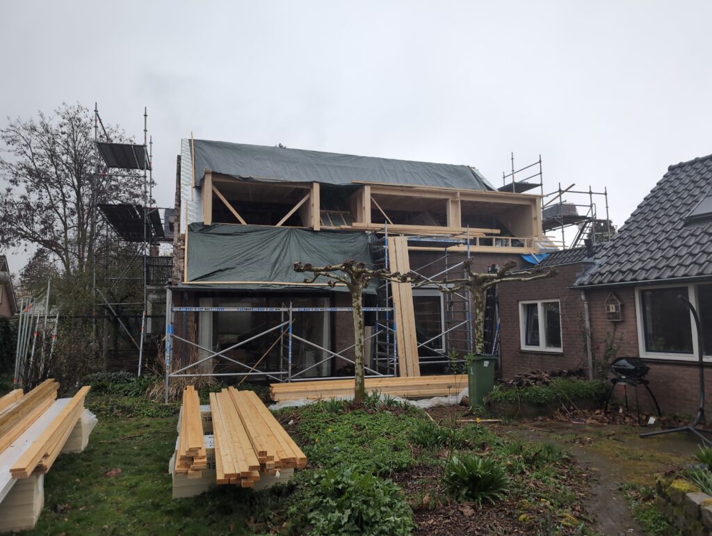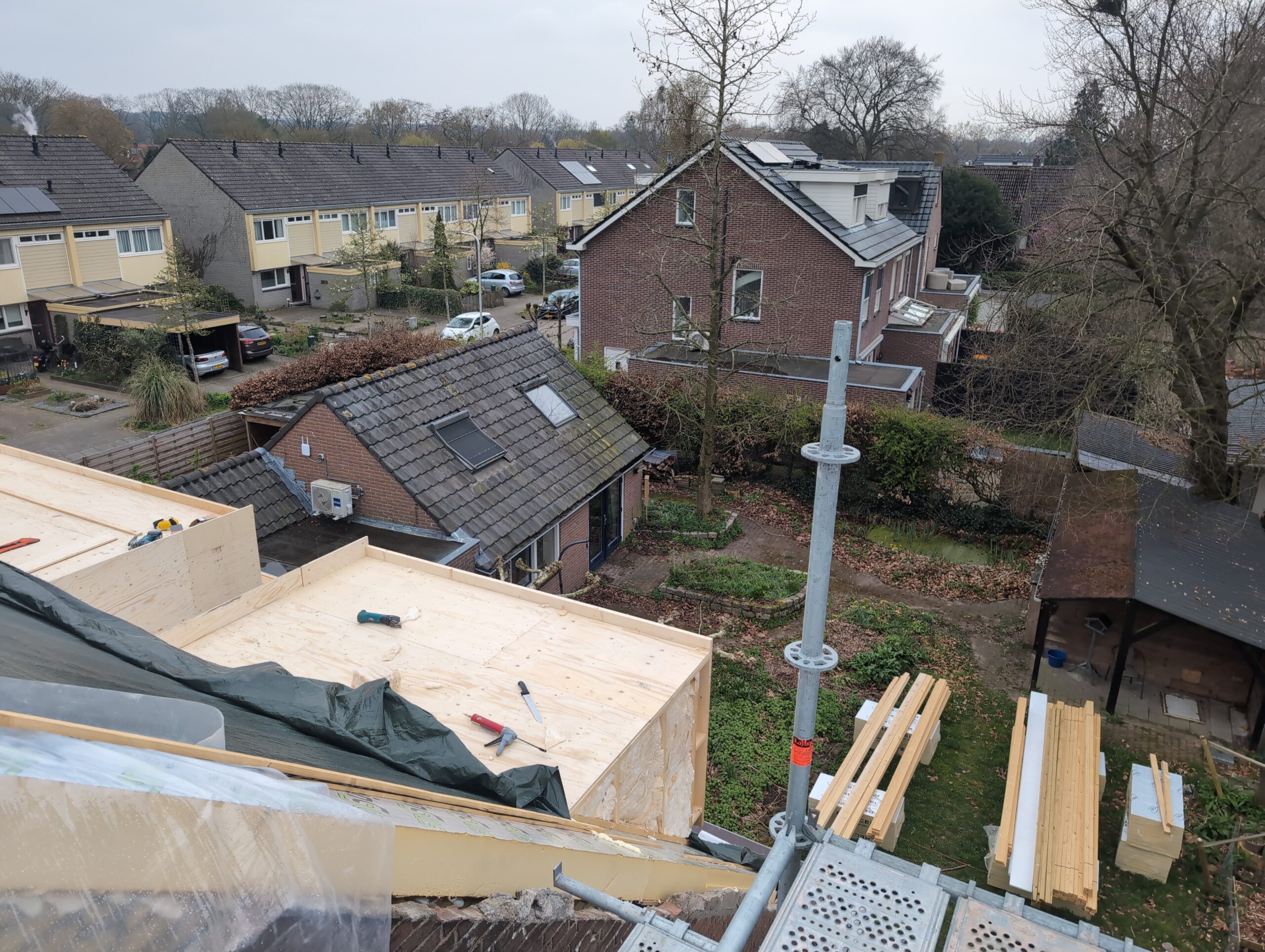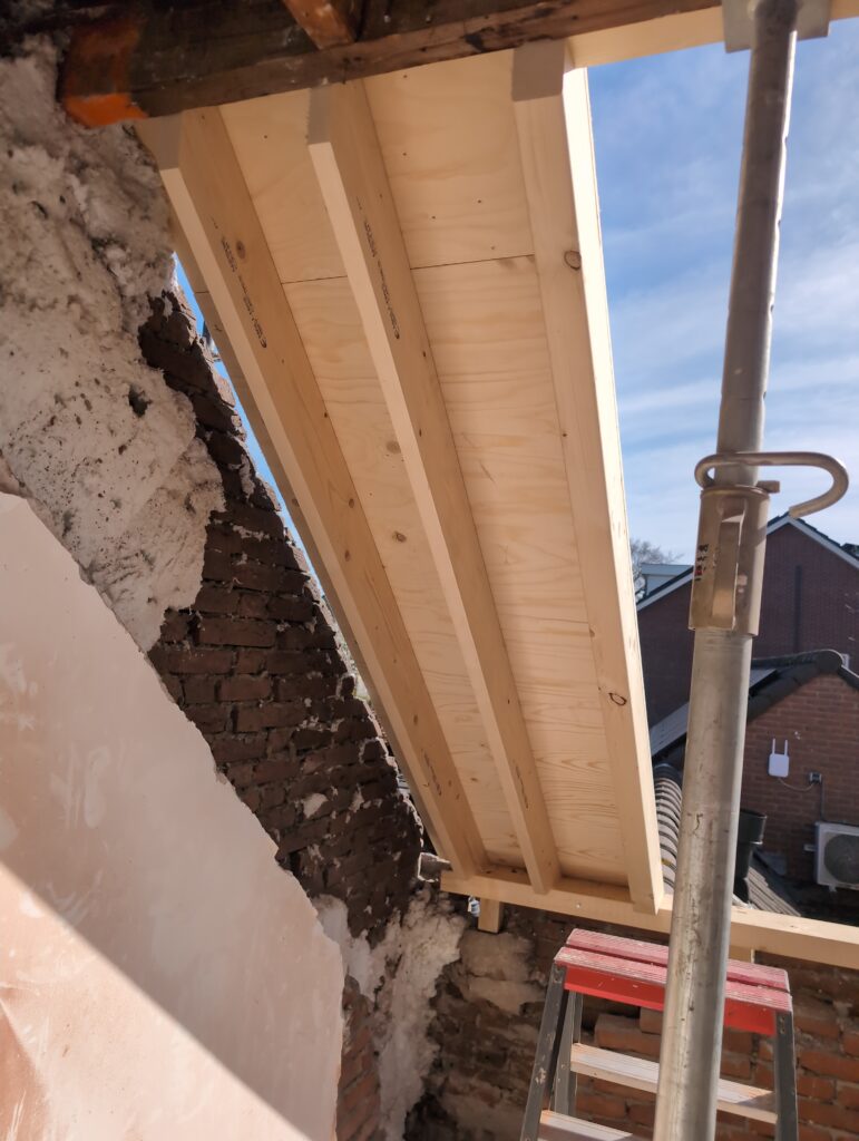Vorig weekend regende (& waaide) het een nachtje. Dat is prima, maar helaas was er ondanks het zeil wel wat ruimte voor het water om via de spouw naar binnen te komen. Dit sijpelde vervolgens via een draagbalk op het plafond van de woonkamer waarna het vrolijk de woonkamer in droop. Met wat planken hebben we even wat geimproviseerd dat het meeste extra water omgeleid werd naar de vloer die voormalig het balkon was. Die kan gelukkig wel wat water hebben.