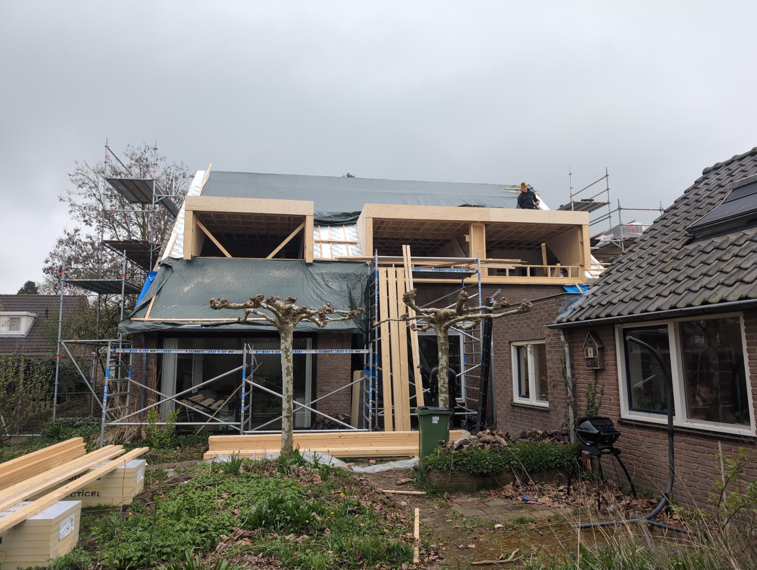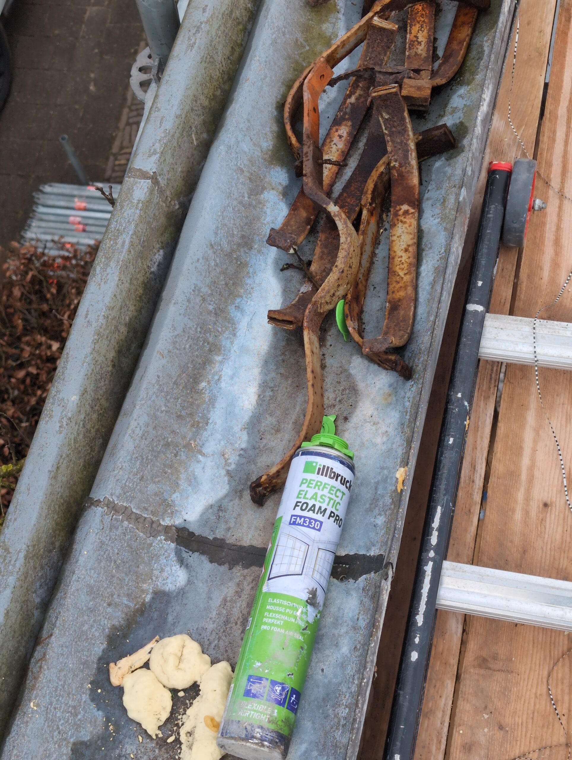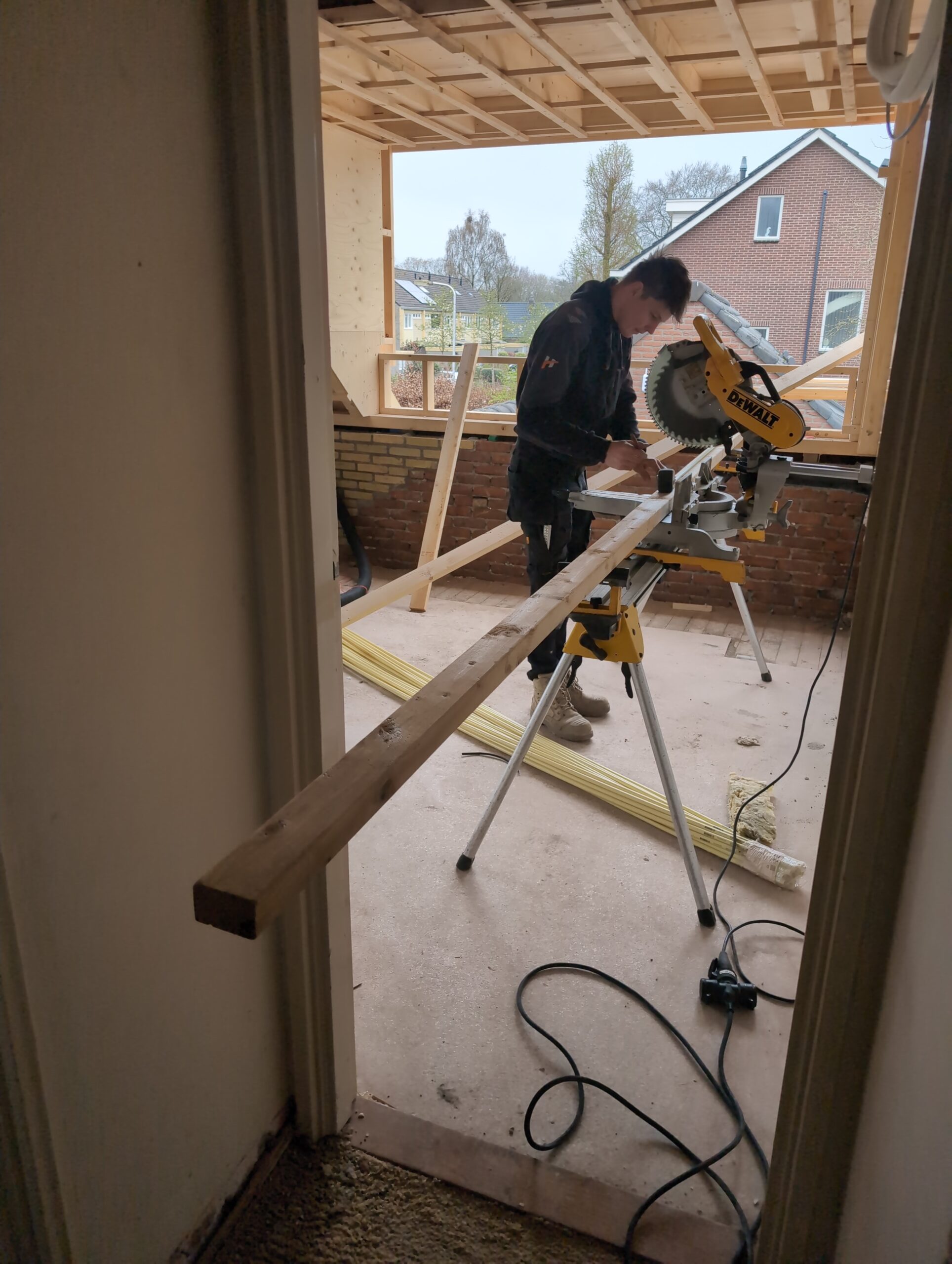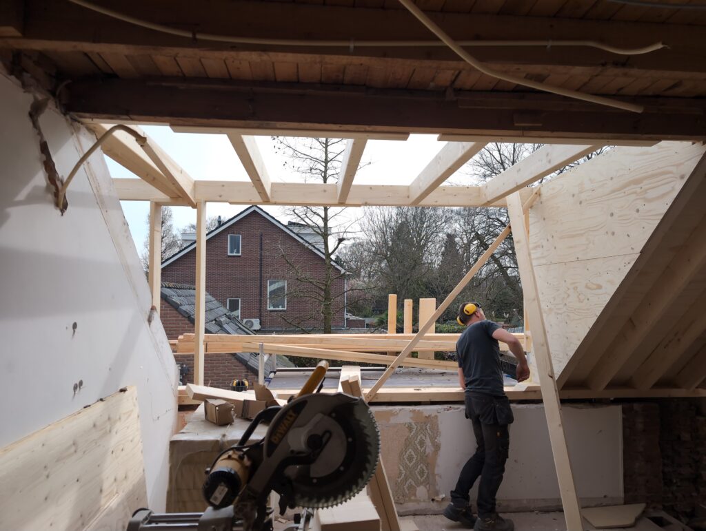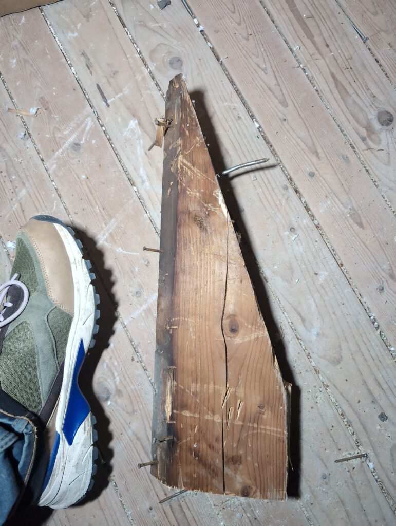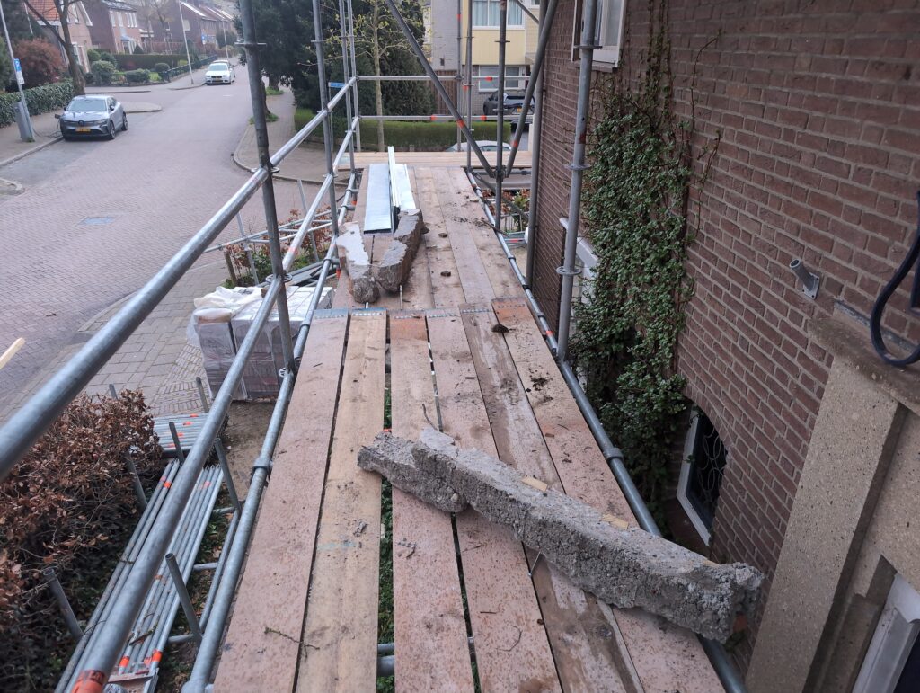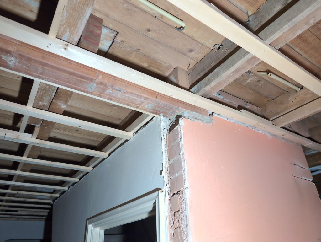 Vorig weekend regende (& waaide) het een nachtje. Dat is prima, maar helaas was er ondanks het zeil wel wat ruimte voor het water om via de spouw naar binnen te komen. Dit sijpelde vervolgens via een draagbalk op het plafond van de woonkamer waarna het vrolijk de woonkamer in droop. Met wat planken hebben we even wat geimproviseerd dat het meeste extra water omgeleid werd naar de vloer die voormalig het balkon was. Die kan gelukkig wel wat water hebben.