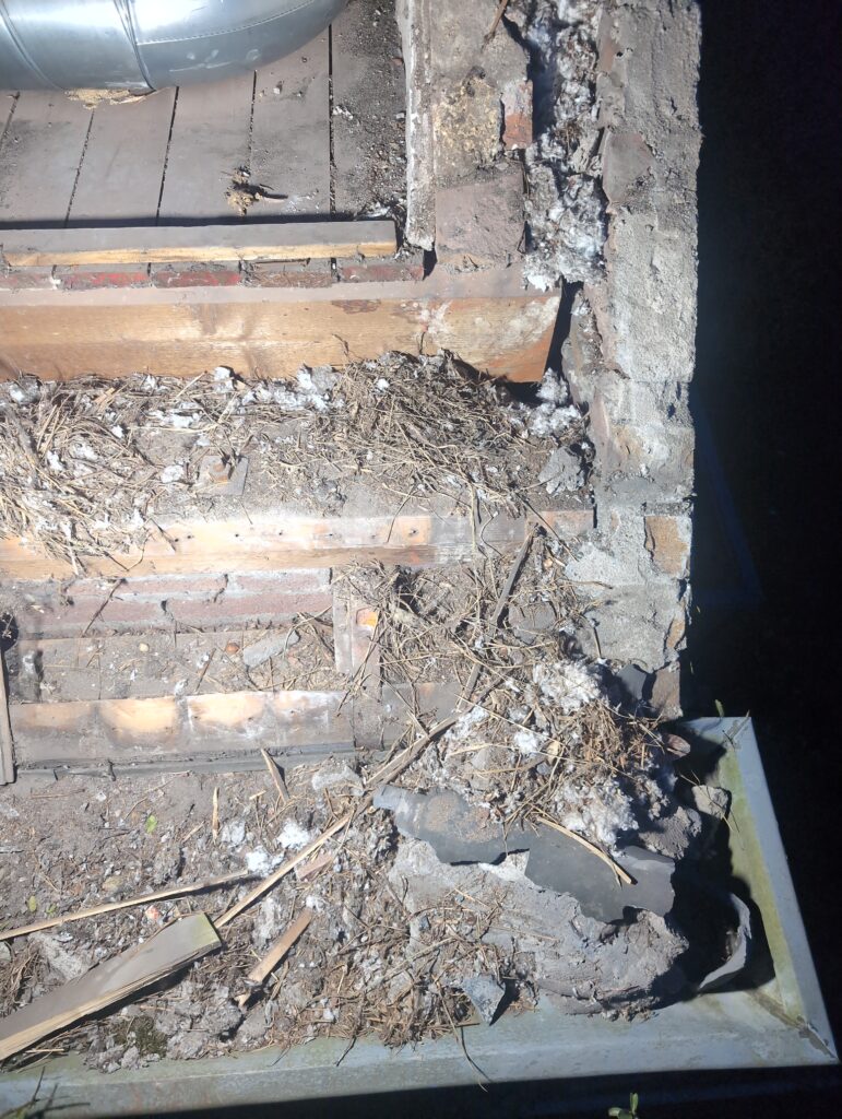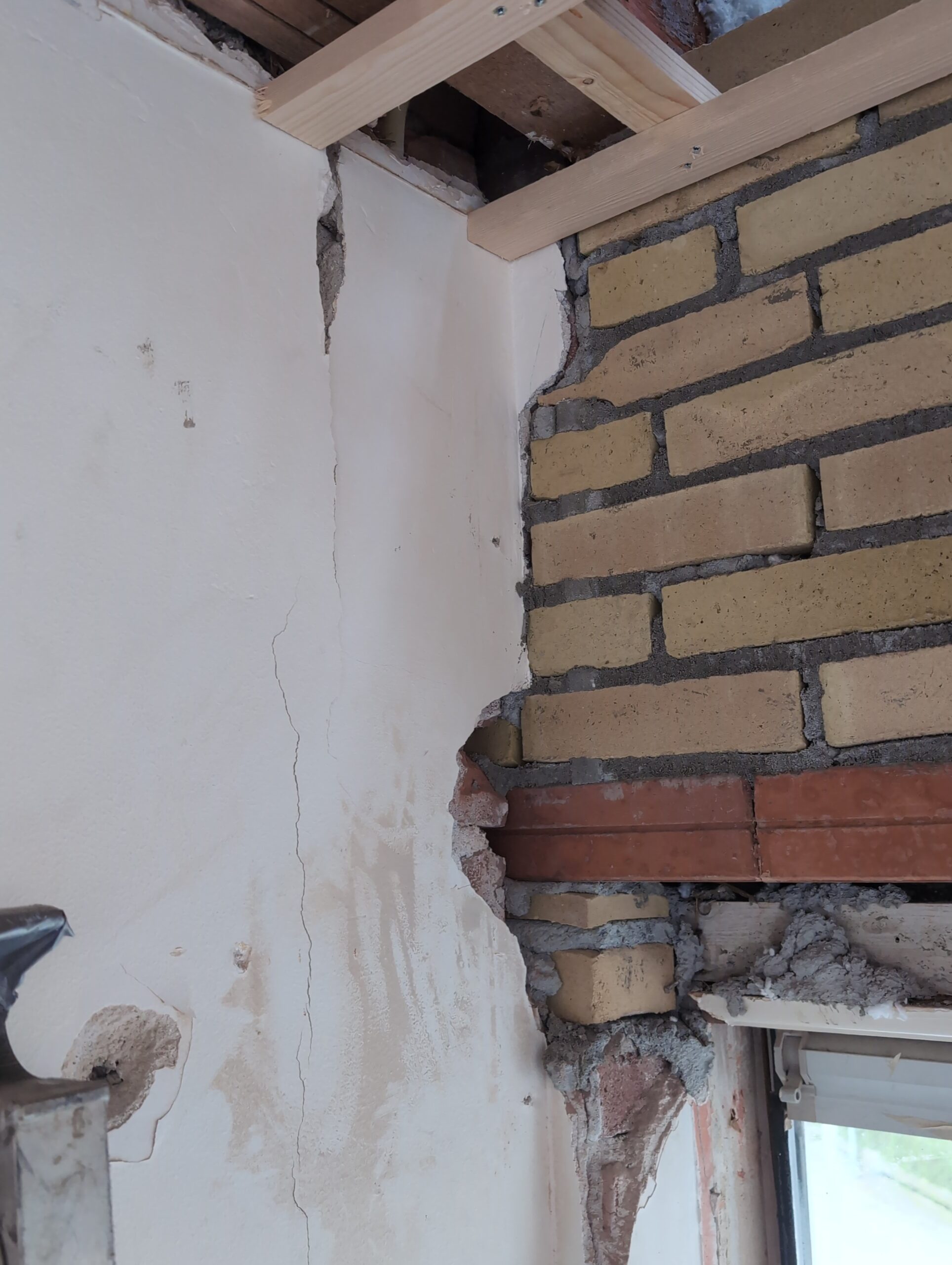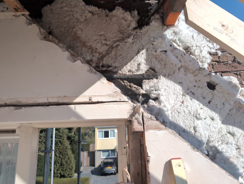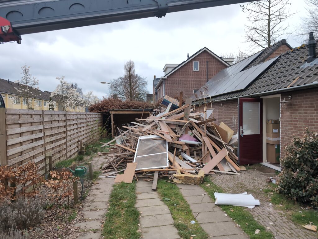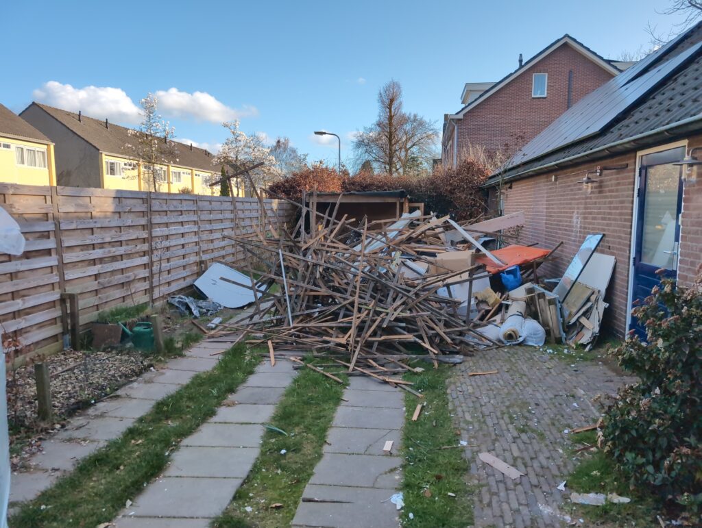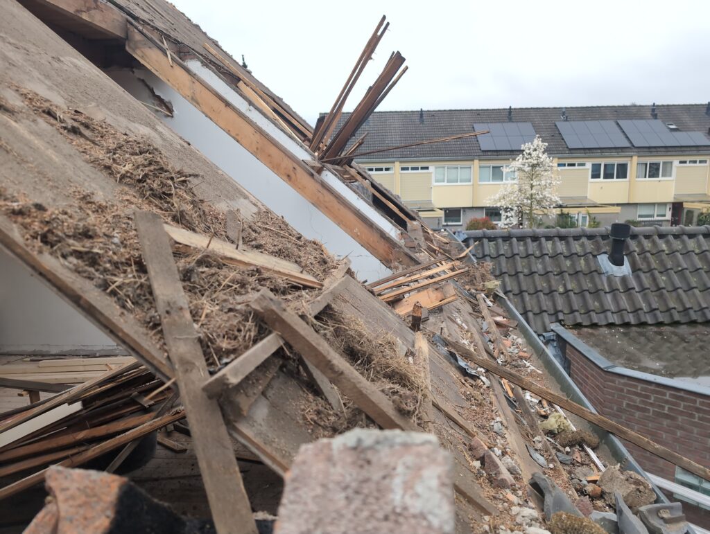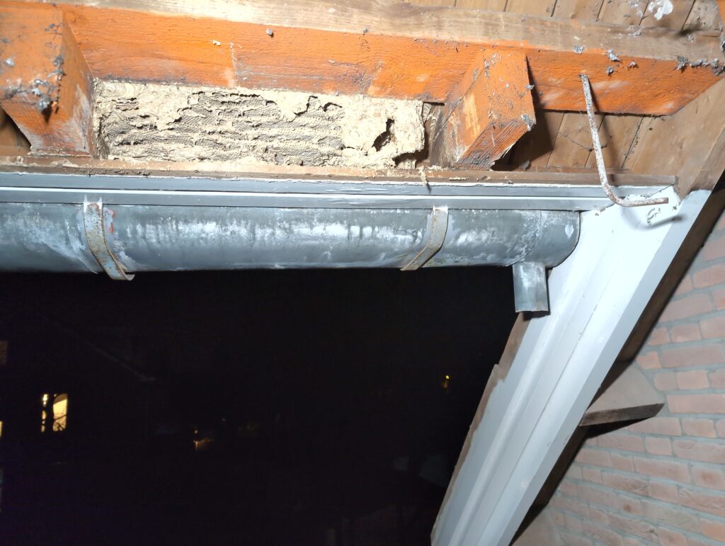 Vorig weekend regende (& waaide) het een nachtje. Dat is prima, maar helaas was er ondanks het zeil wel wat ruimte voor het water om via de spouw naar binnen te komen. Dit sijpelde vervolgens via een draagbalk op het plafond van de woonkamer waarna het vrolijk de woonkamer in droop. Met wat planken hebben we even wat geimproviseerd dat het meeste extra water omgeleid werd naar de vloer die voormalig het balkon was. Die kan gelukkig wel wat water hebben.