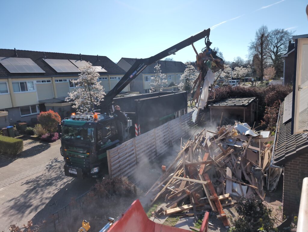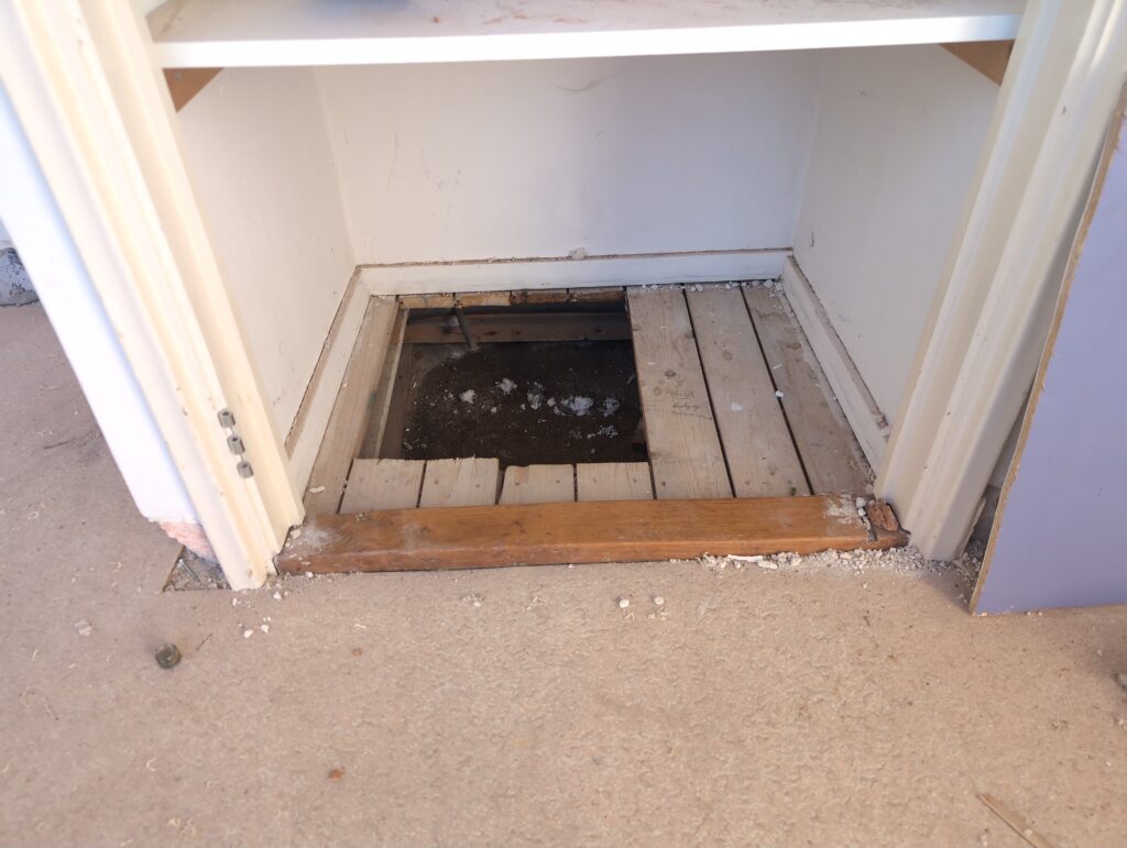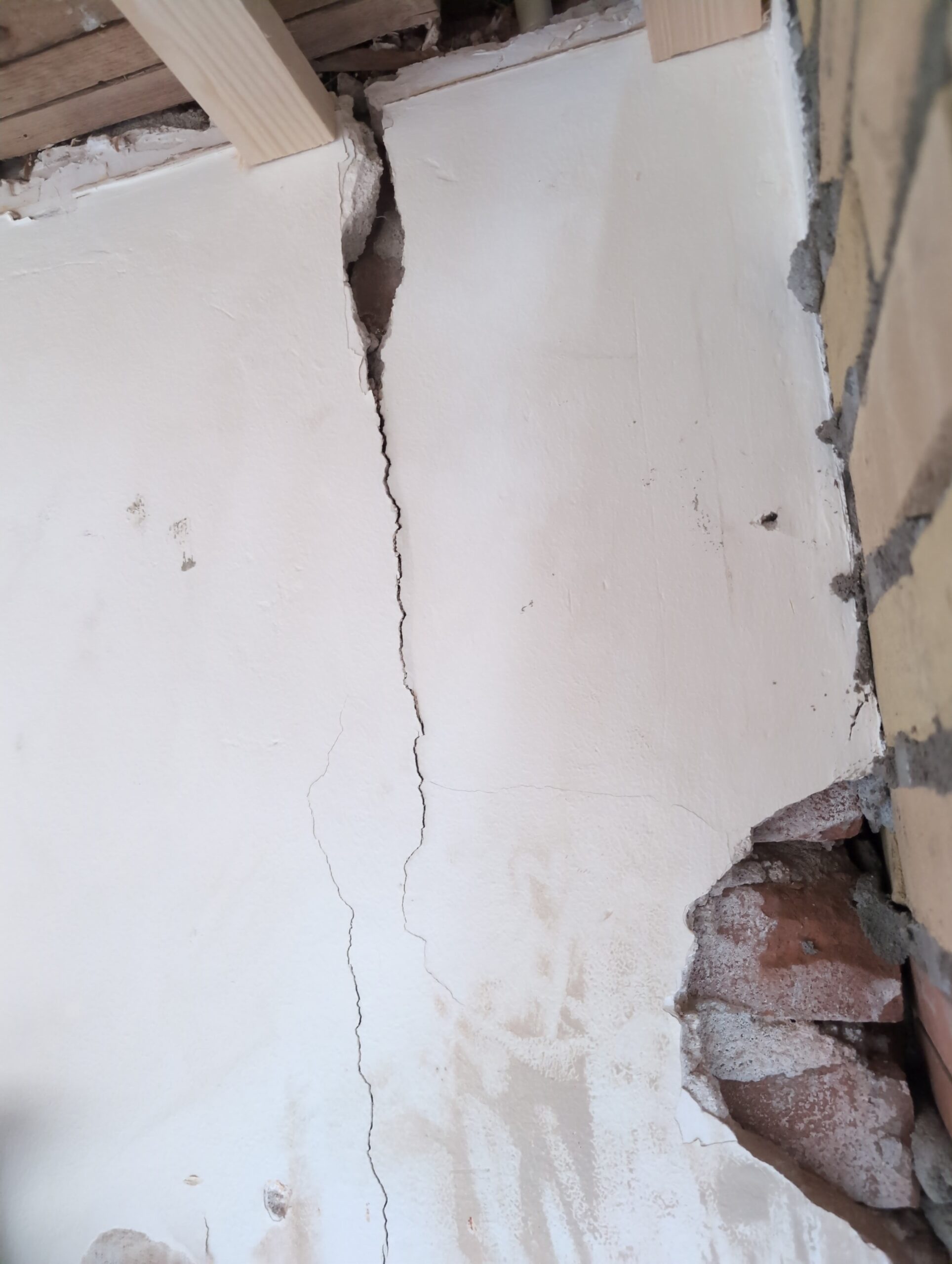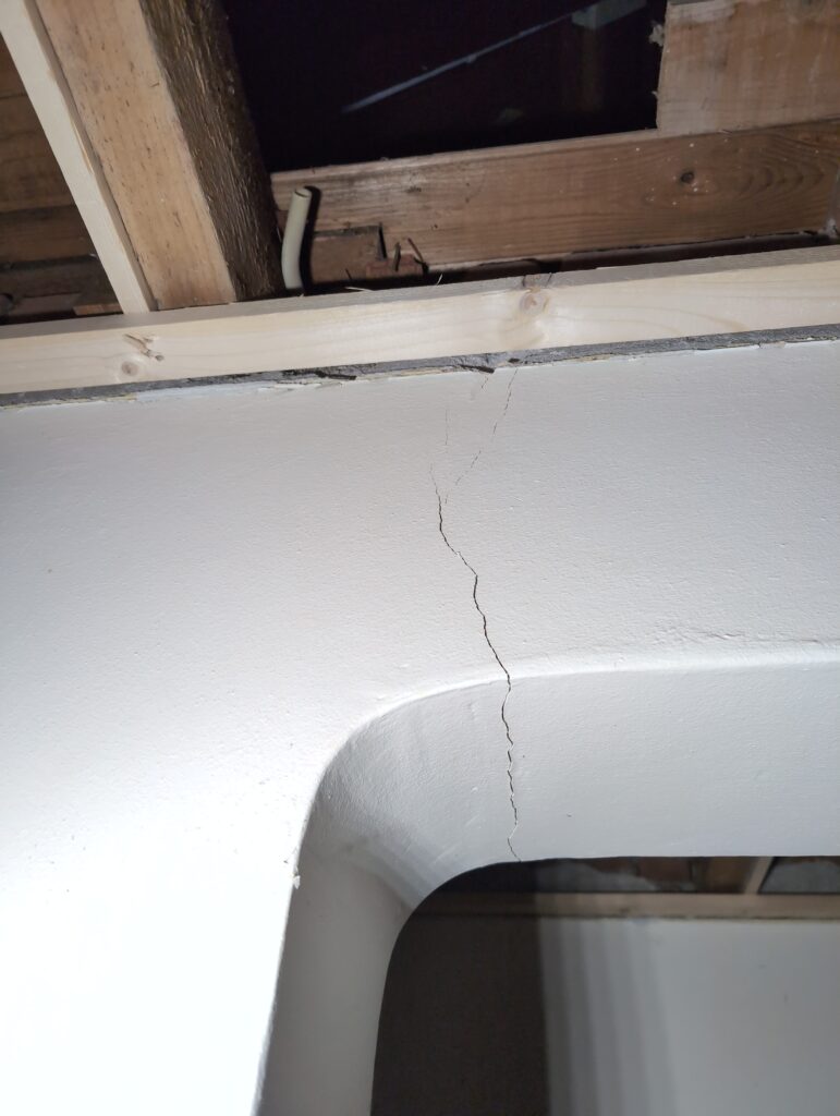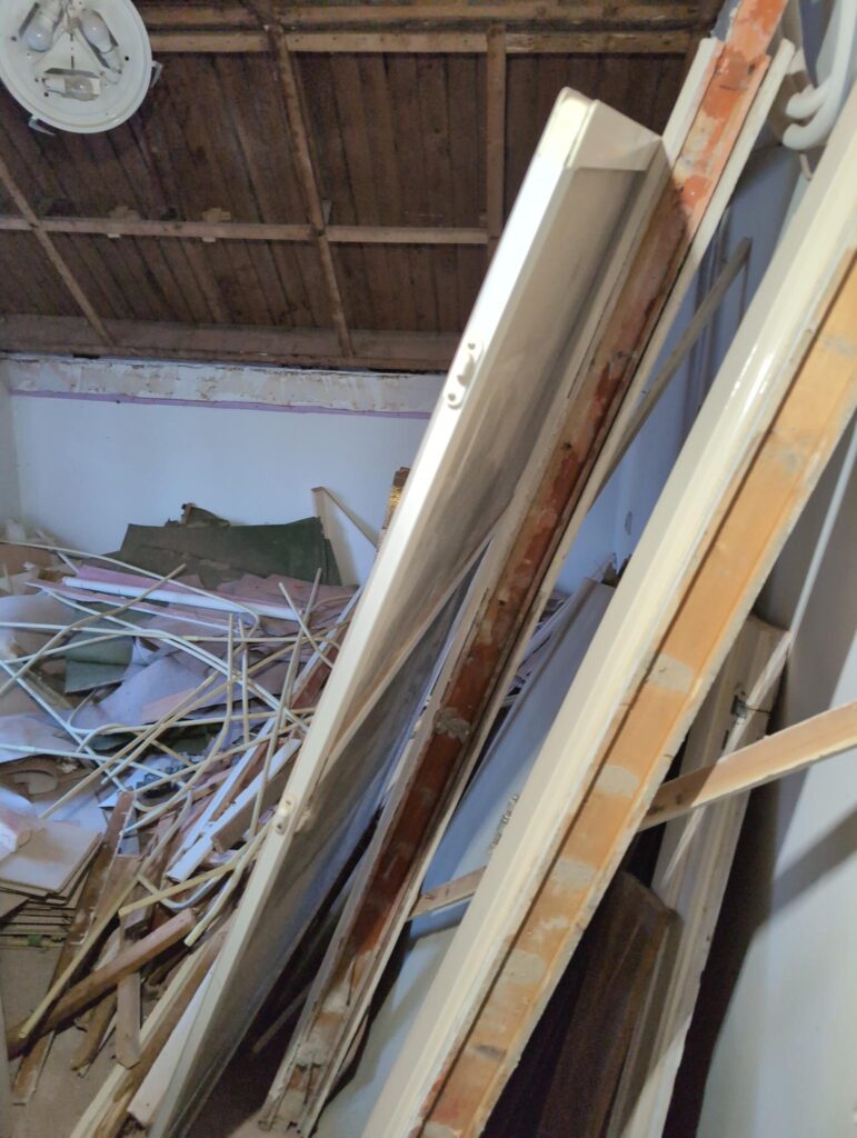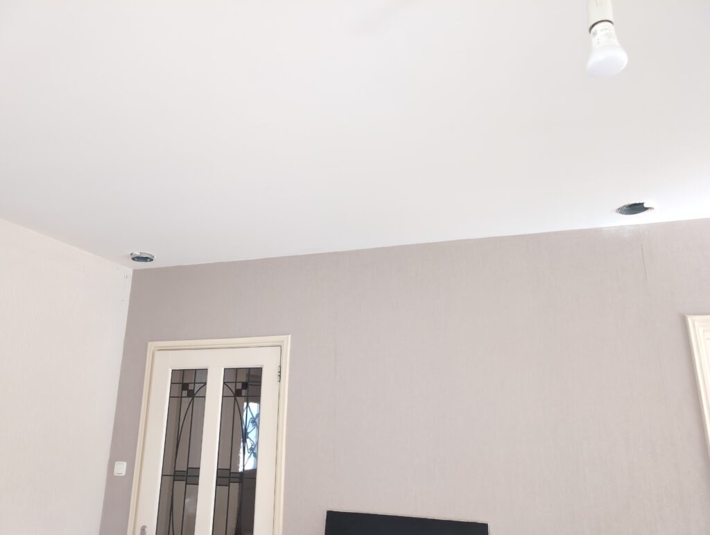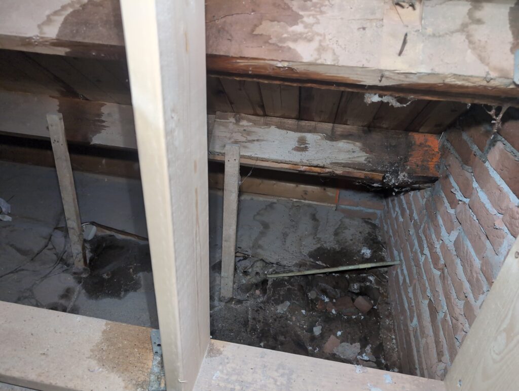 Vorig weekend regende (& waaide) het een nachtje. Dat is prima, maar helaas was er ondanks het zeil wel wat ruimte voor het water om via de spouw naar binnen te komen. Dit sijpelde vervolgens via een draagbalk op het plafond van de woonkamer waarna het vrolijk de woonkamer in droop. Met wat planken hebben we even wat geimproviseerd dat het meeste extra water omgeleid werd naar de vloer die voormalig het balkon was. Die kan gelukkig wel wat water hebben.