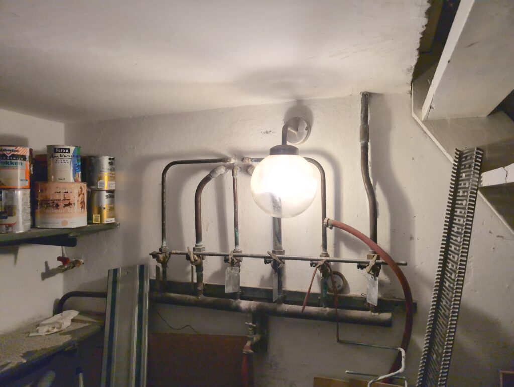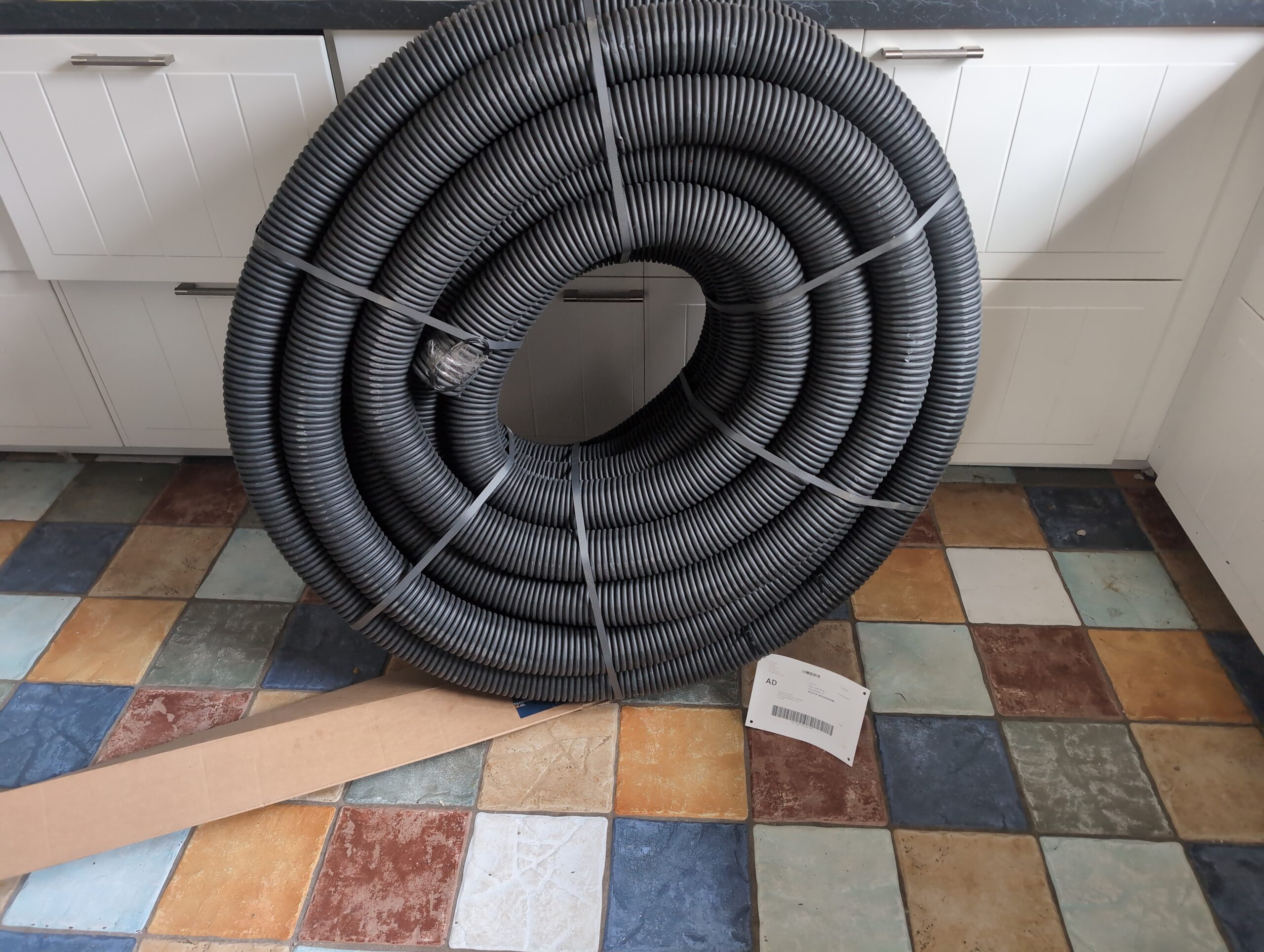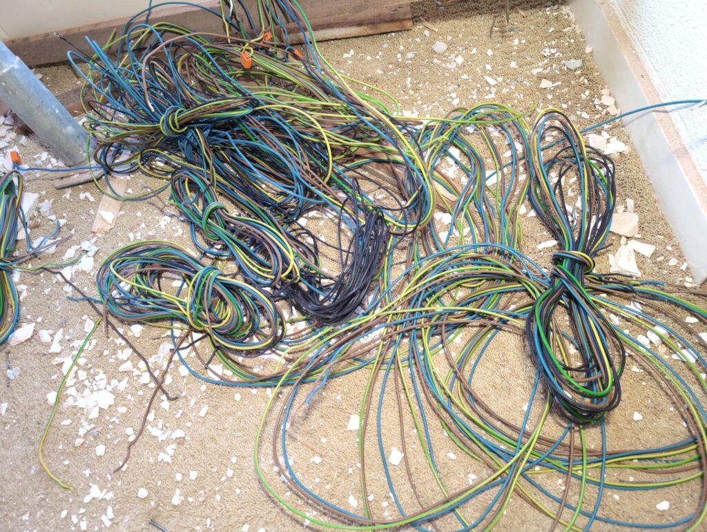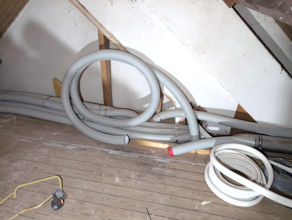 Op onderstaande foto’s zie je ook een zwarte mantelbuis (buitenkant 75mm). Die begint bij de muur van de technische ruimte, en komt uiteindelijk uit bij de onderverdeler van de eerste verdieping.